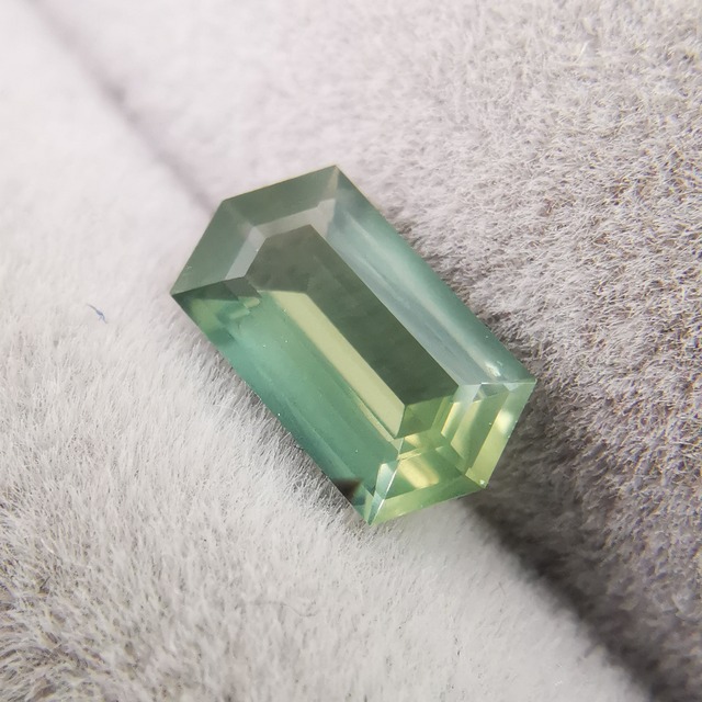 サファイア 0.86ct マダガスカル産 スリランカ人カッターW氏によるリカット ------------------------------------- 灰みの黄みの緑/セージグリーンのサファイアです。 全体に薄く均一にシルキーで、ホワイトシルバーがかった独特の照りにより、とても鮮やかな緑色に発色します。 両端の尖った部分が色溜まりとなり、一石の中で色やきらめきの違いを楽しめます。 浅いカットですが、わずかなシルキーさのおかげで中抜けを感じさせず、かつ暗さのない滑らかなきらめきの一石です。 ガードルの一部に黒っぽいポイントがありますが、インクルージョンではなく部分的に色が入っています。 動画でも滑らかな輝きをご覧ください。 https://youtube.com/shorts/aUhUYQXjDHw 写真1~8 自然光日陰 写真9~10 自然光日向 写真11~15 LED照明