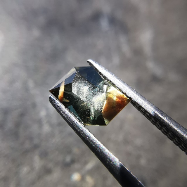 サファイア 0.89ct タンザニア産 肉眼で見えるインクルージョンあり スリランカ人カッターW氏によるリカット ------------------------------------- 薄い緑みの黃/刈安色と、くすんだ緑みの青/錆納戸色のバイカラーに、灰みの黄/灰汁色のシルクが入った、バイカラーどころじゃない、色々見えてるサファイアです。 ペイント弾が当たったみたいにピシャッと入った濃紺と、角にチョンと染める朱色のインクルージョンも見えます。 全ての色が混じりあわずに観賞するために、ポートレイトカットにリカットしました。 見る方向によって主張する色が変わり、新しい発見があり、見飽きることがありません。 インクルージョンがあるためお仕立てには注意が必要です。 写真1~10 自然光日陰 写真11~15 LED照明