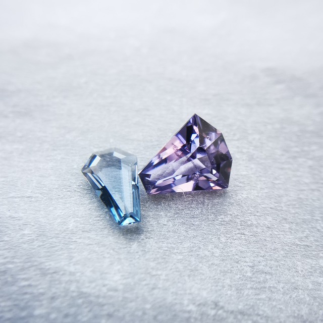 スピネル 0.22ct 0.09ct スリランカ産 わずかに肉眼で見えるインクルージョンあり スリランカ人カッターW氏による -------------------------------------- 灰みの青みの紫/ラベンダー色とくすんだ紫みの青/ヒヤシンス色の、スピネル2点セットです。 同じようなフォルムで、ひとつは通常のカット、ひとつはポートレイトカットなので、きらめきの違いを見比べることがてきます。 スピネルらしい涼し気なカラーが魅力のセットです。 写真1~13 自然光日陰 写真14~17 LED照明