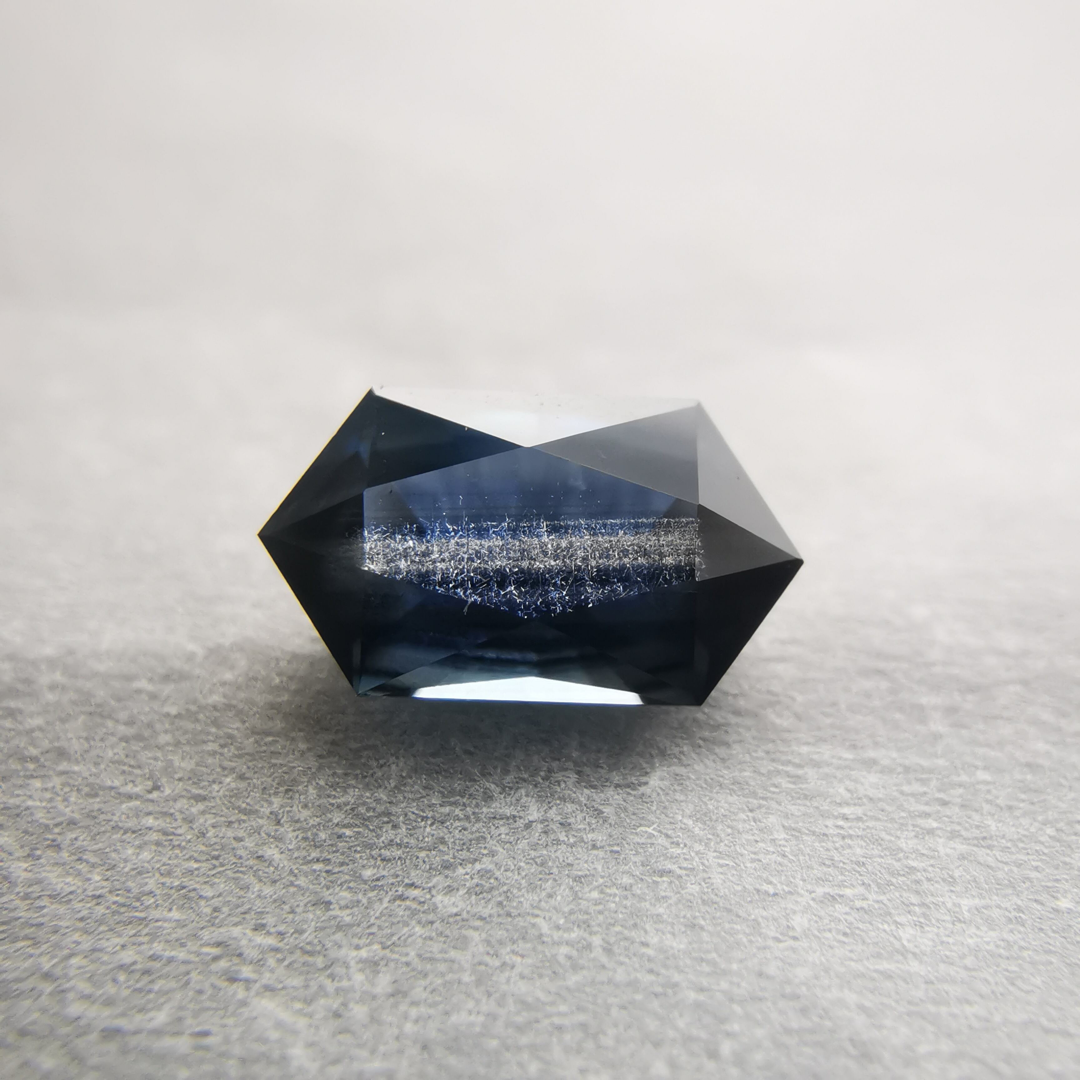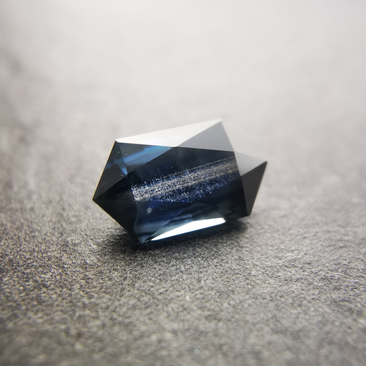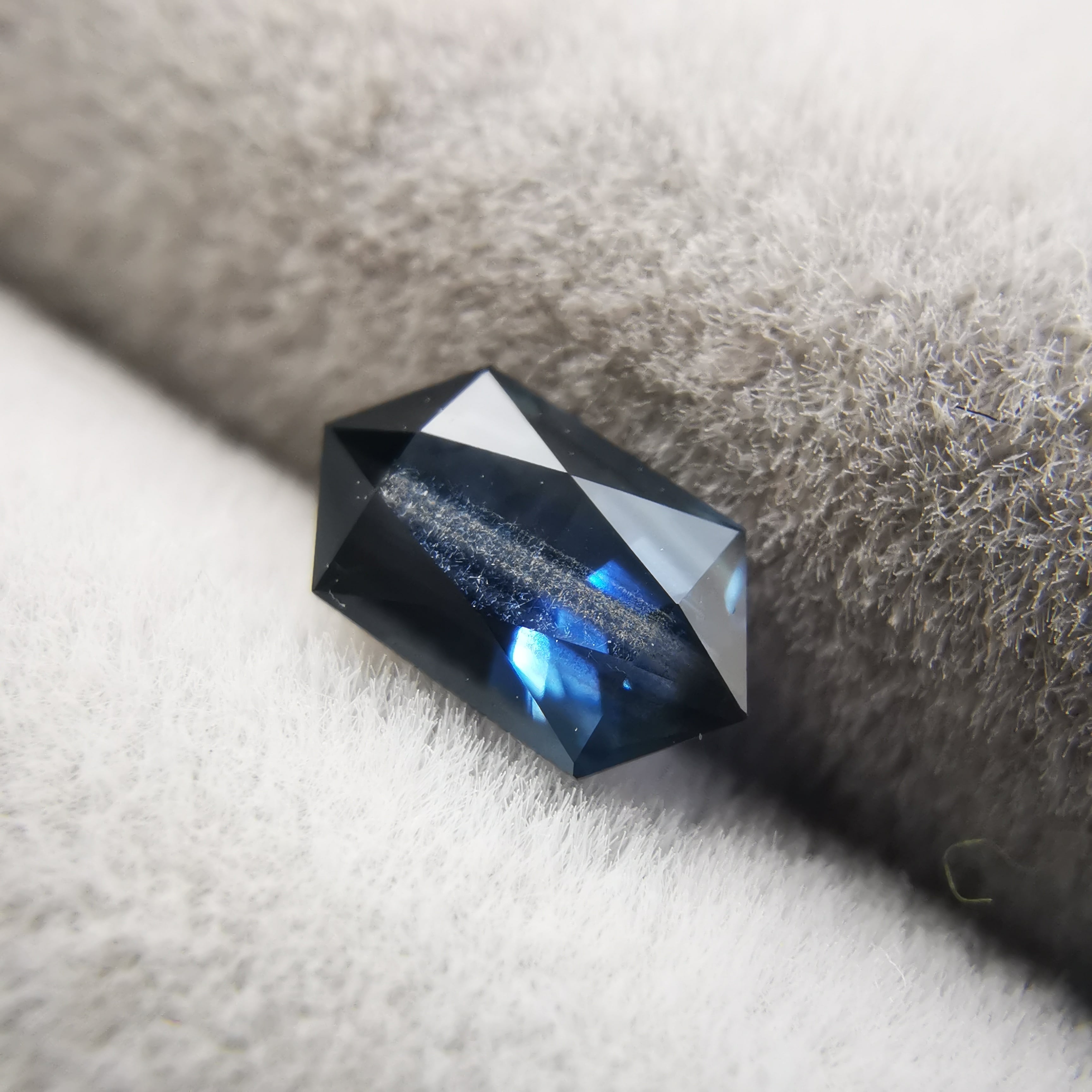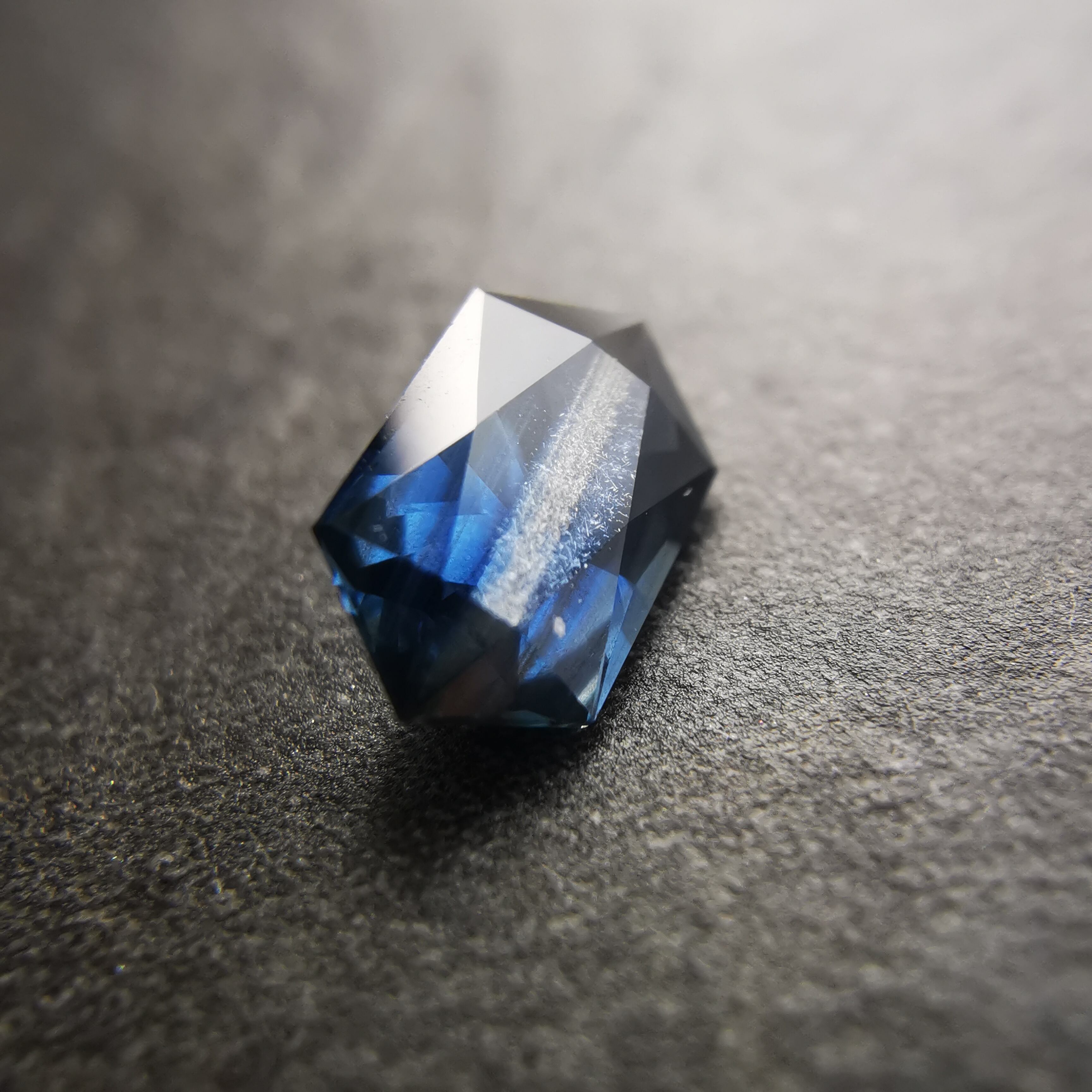 ダークなブルーで、シルバーにきらめくシラーがテーブル面を横切るサファイアです。