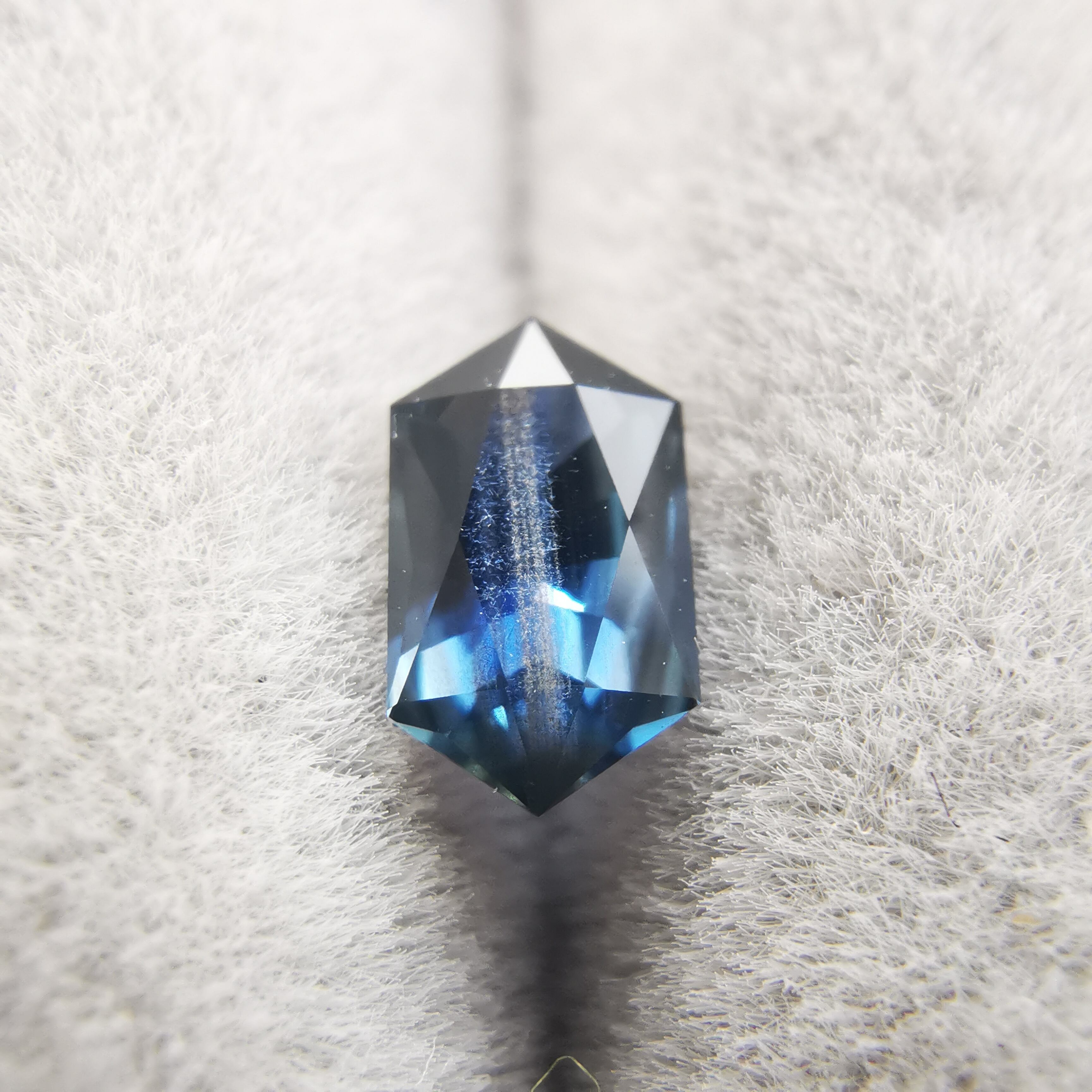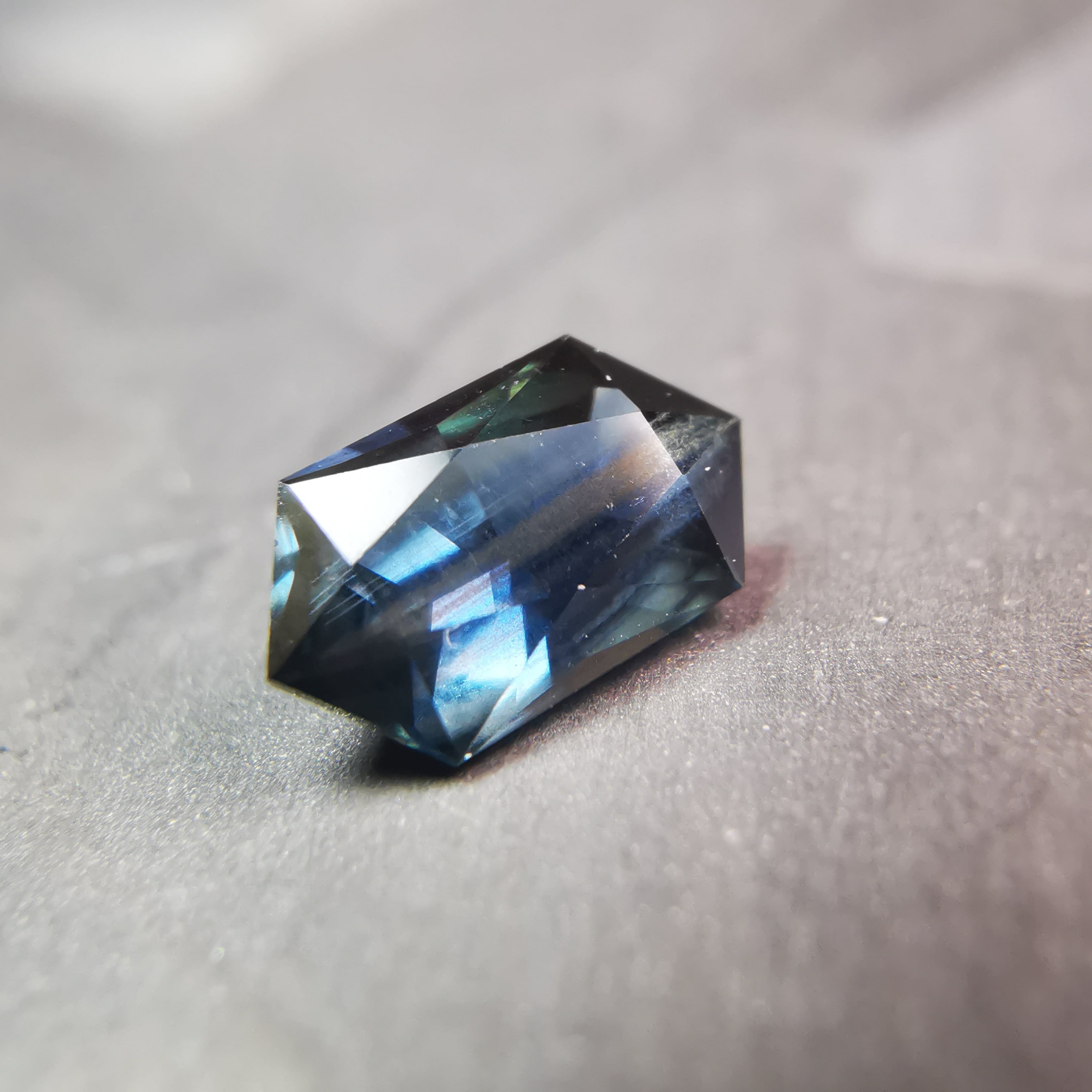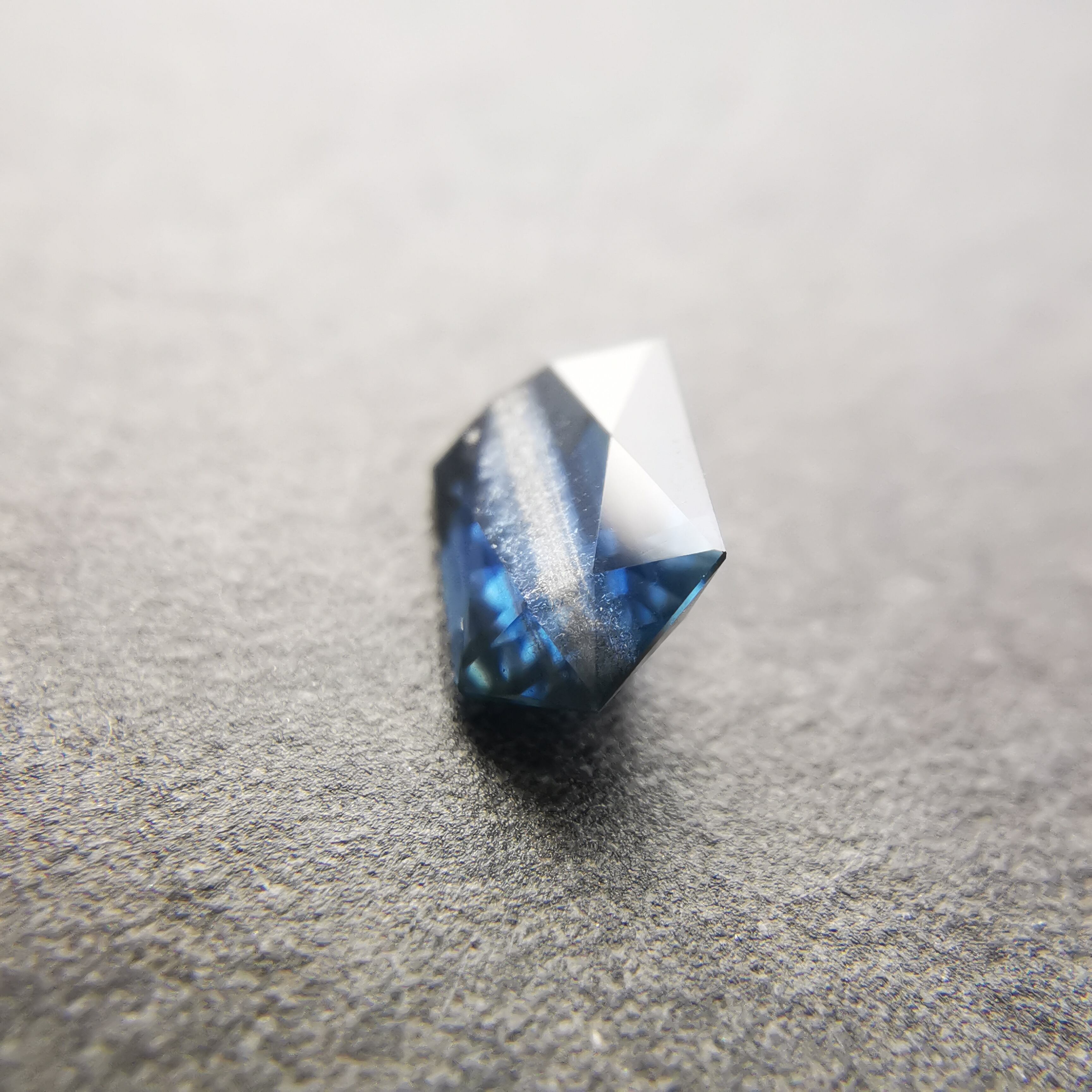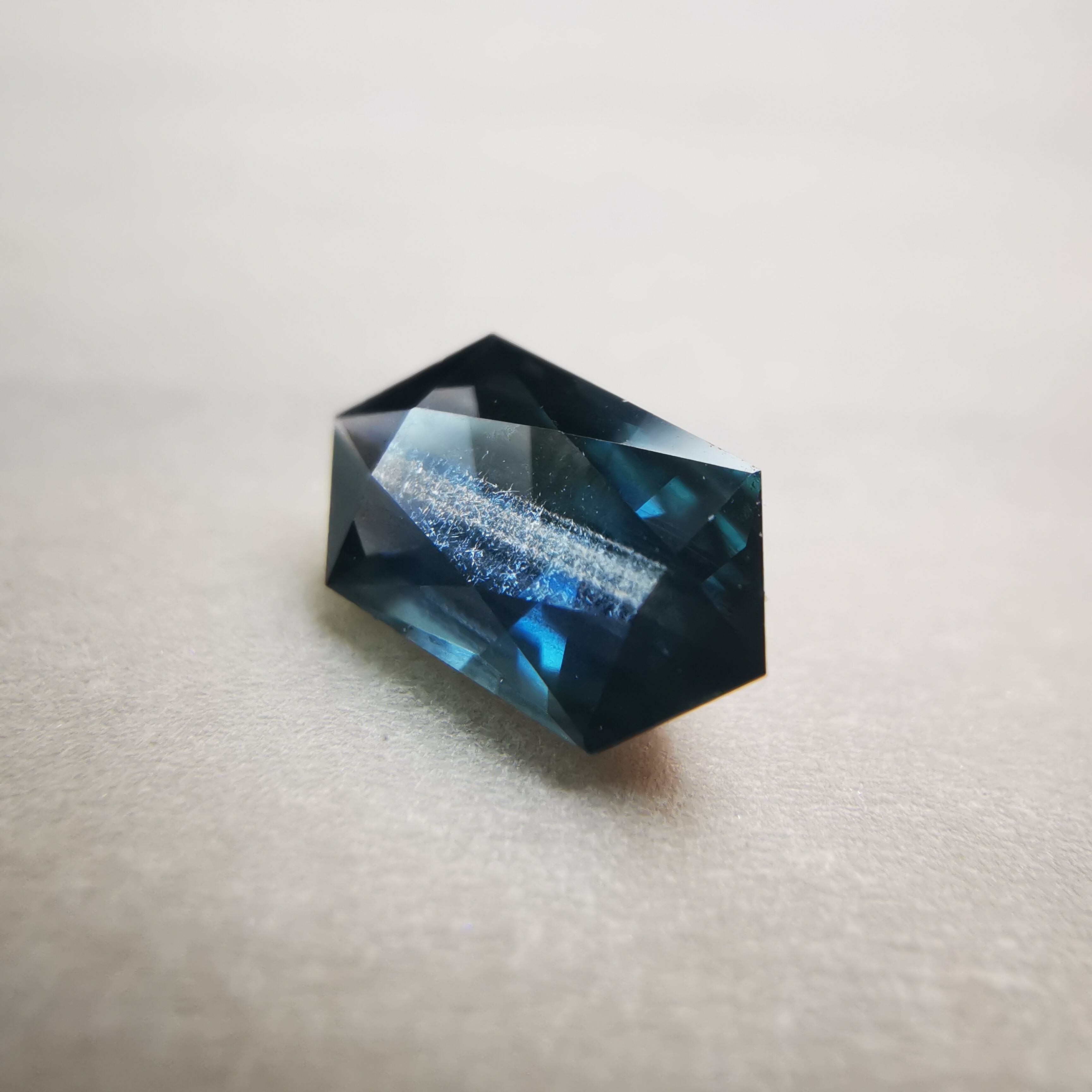ダークなブルーで、シルバーにきらめくシラーがテーブル面を横切るサファイアです。