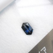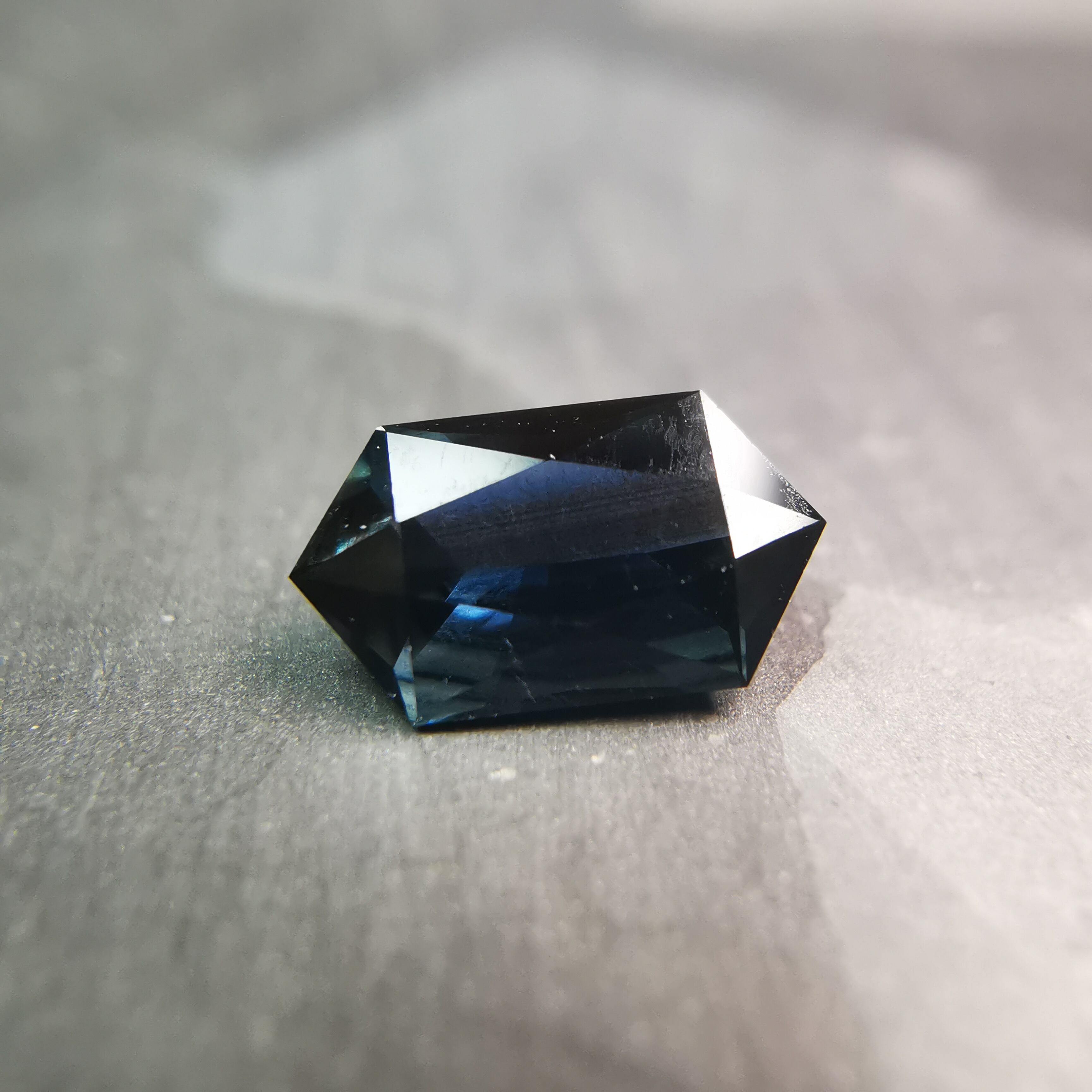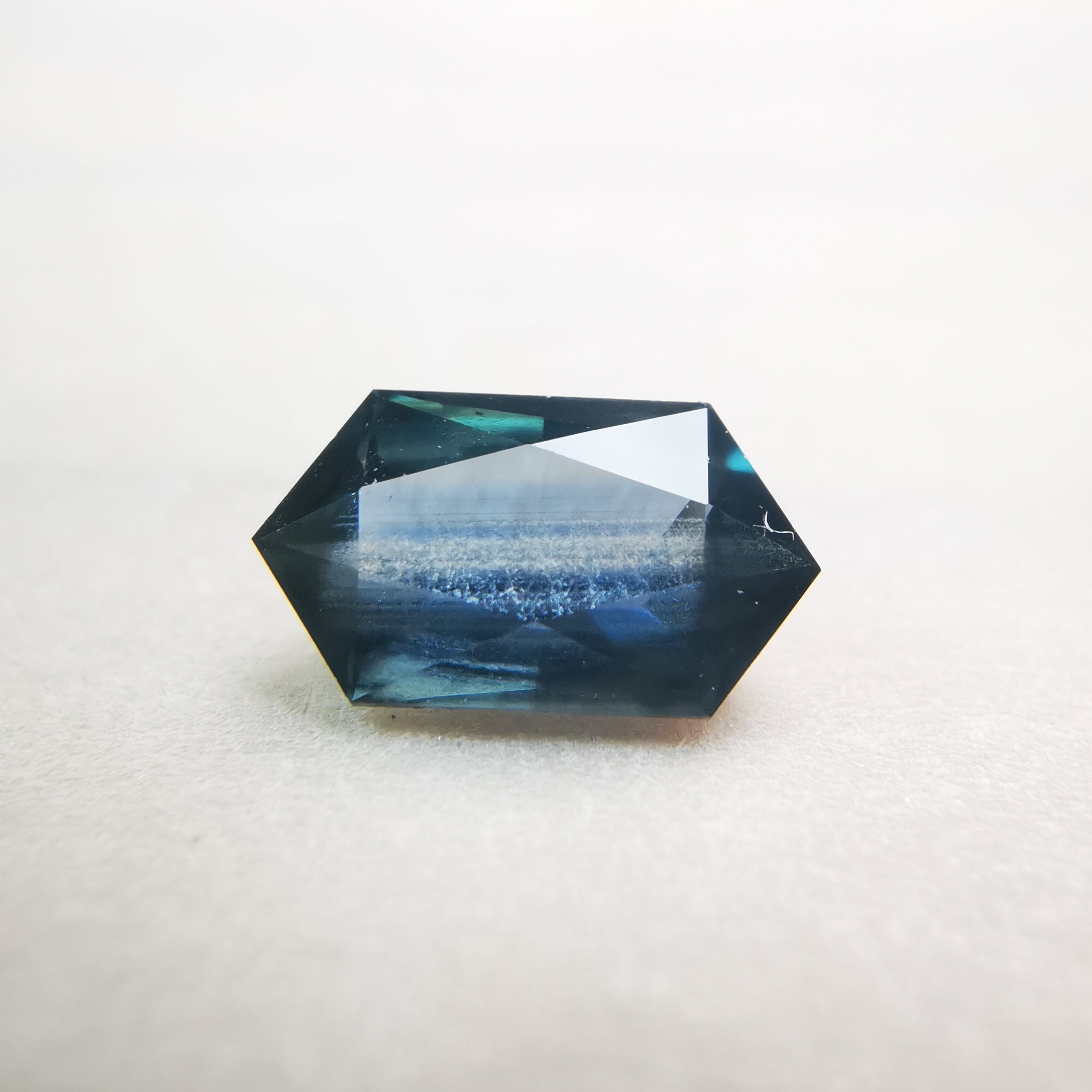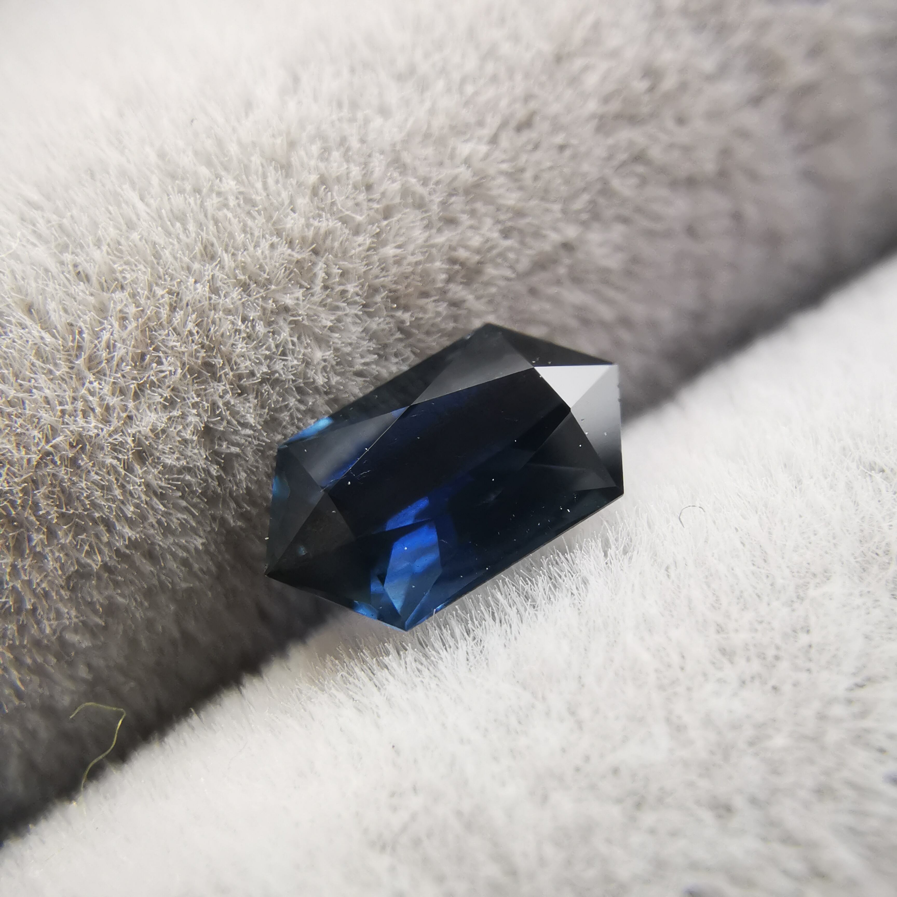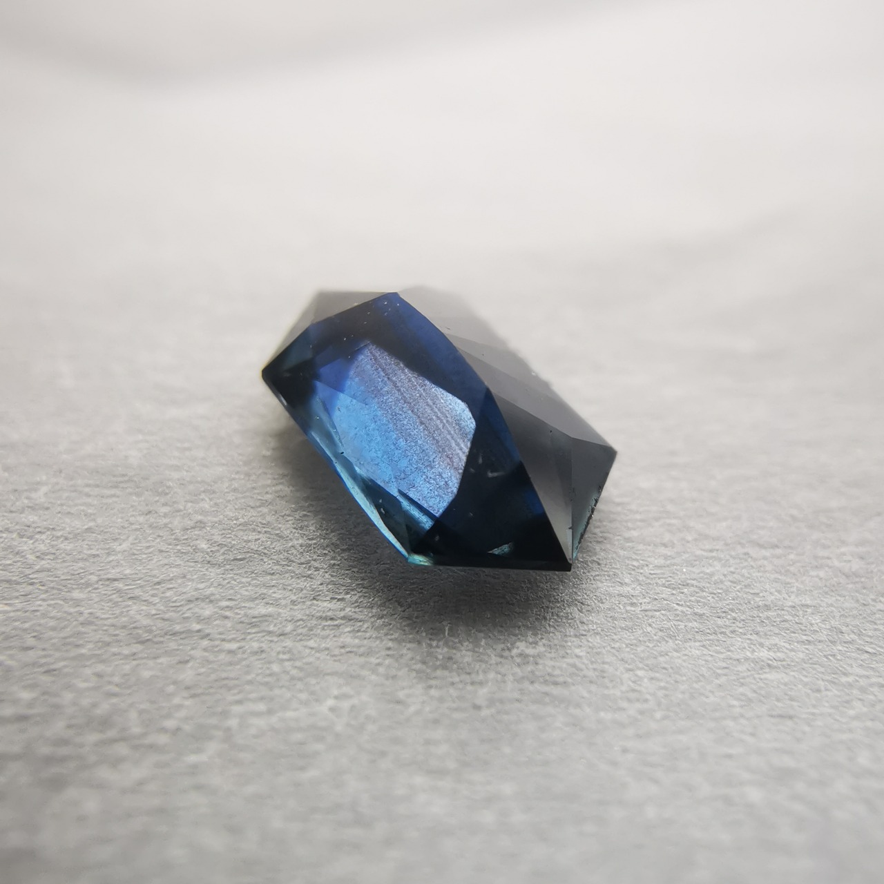 ダークなブルーで、シルバーにきらめくシラーがテーブル面を横切るサファイアです。