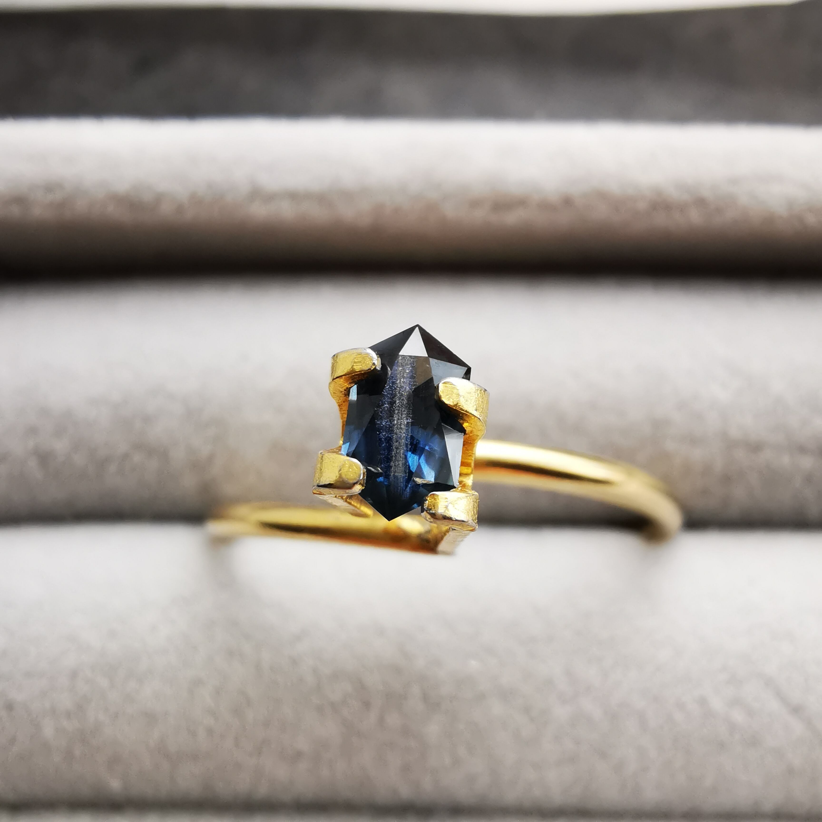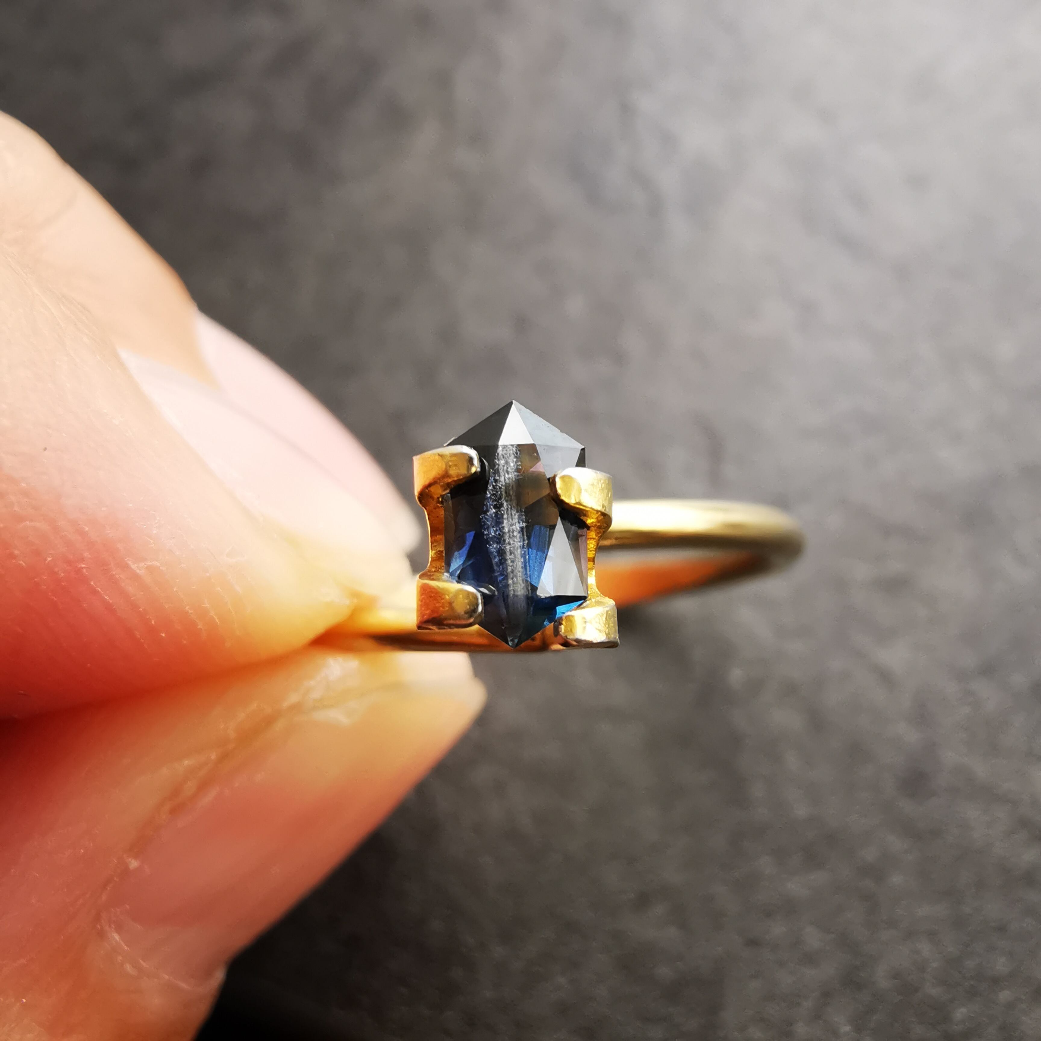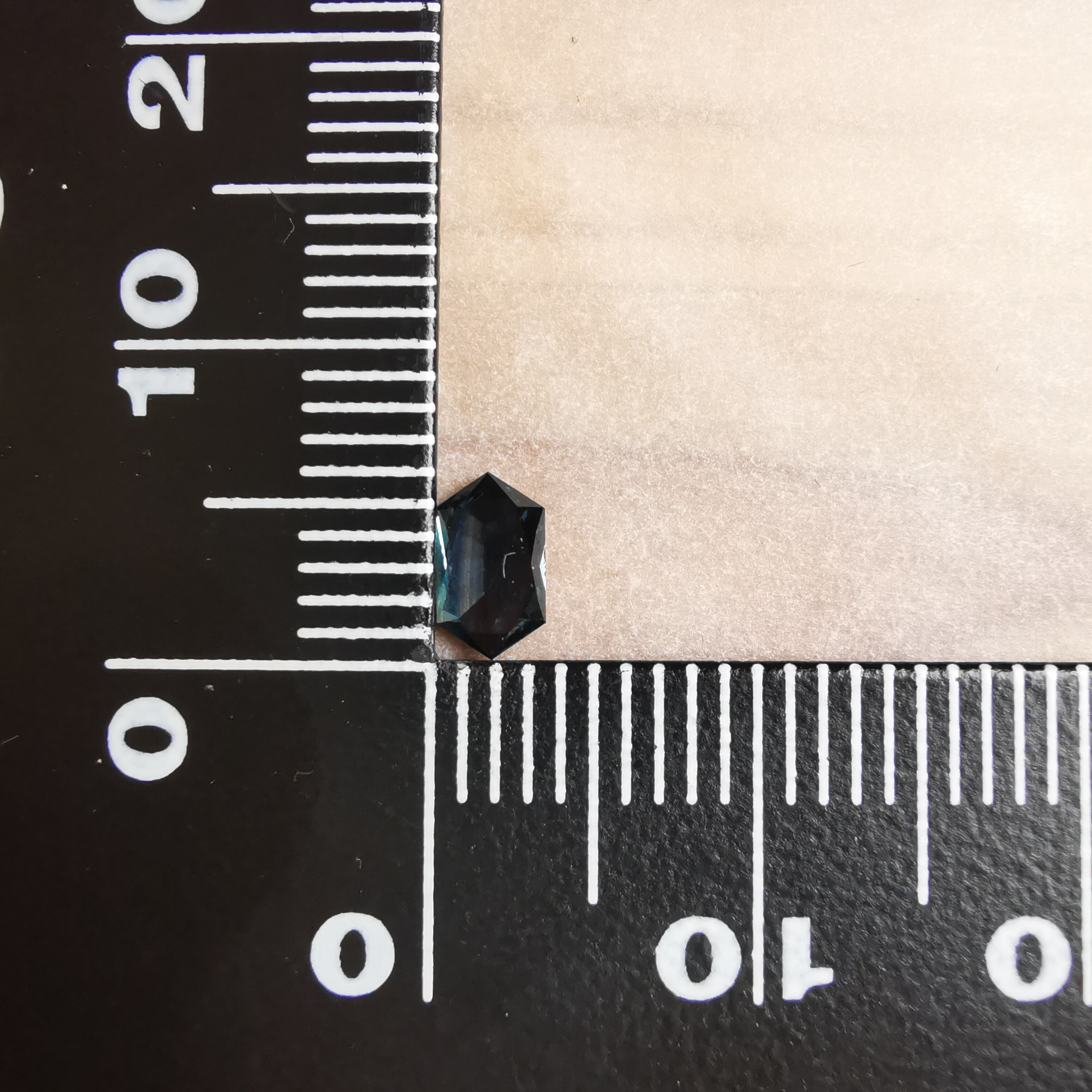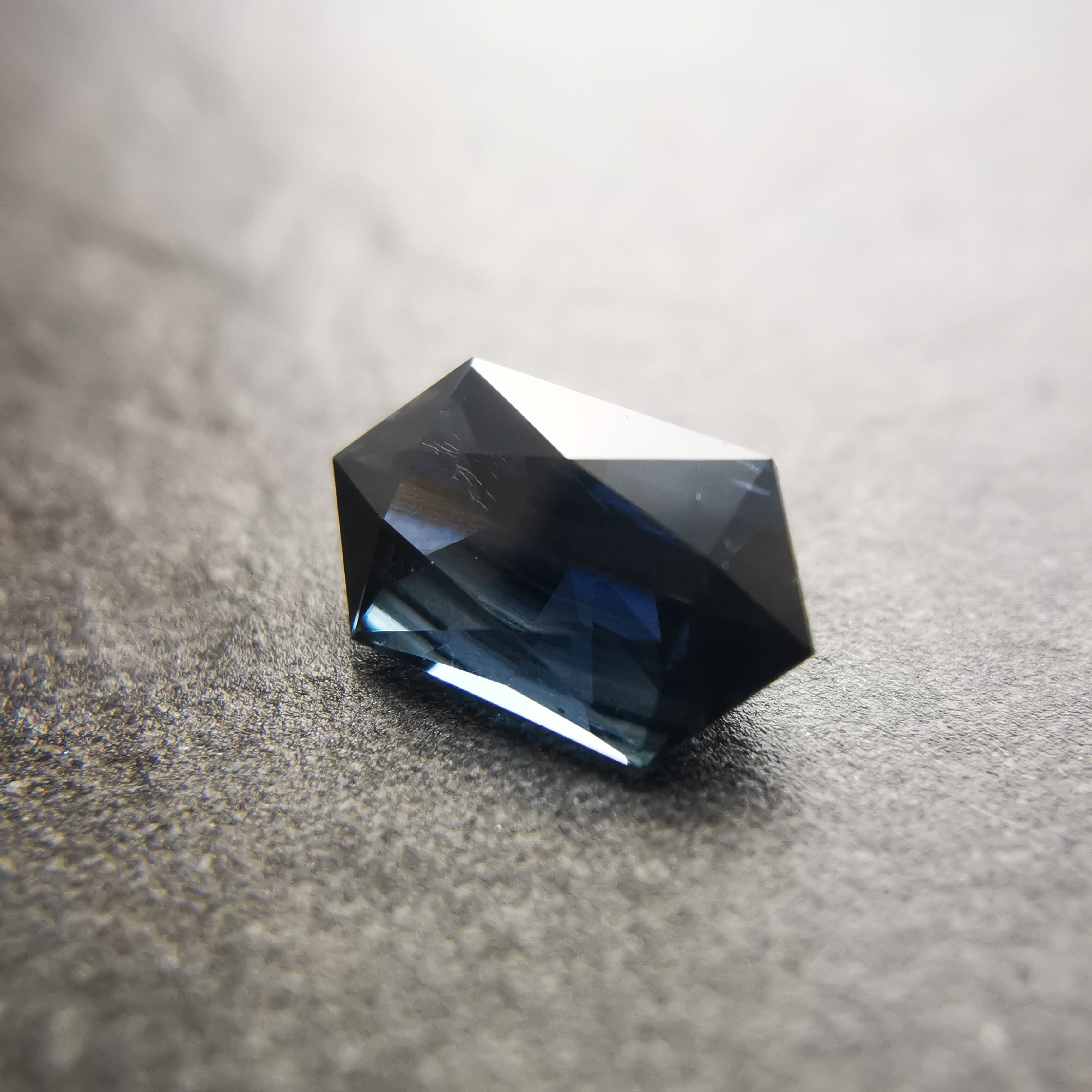 ダークなブルーで、シルバーにきらめくシラーがテーブル面を横切るサファイアです。