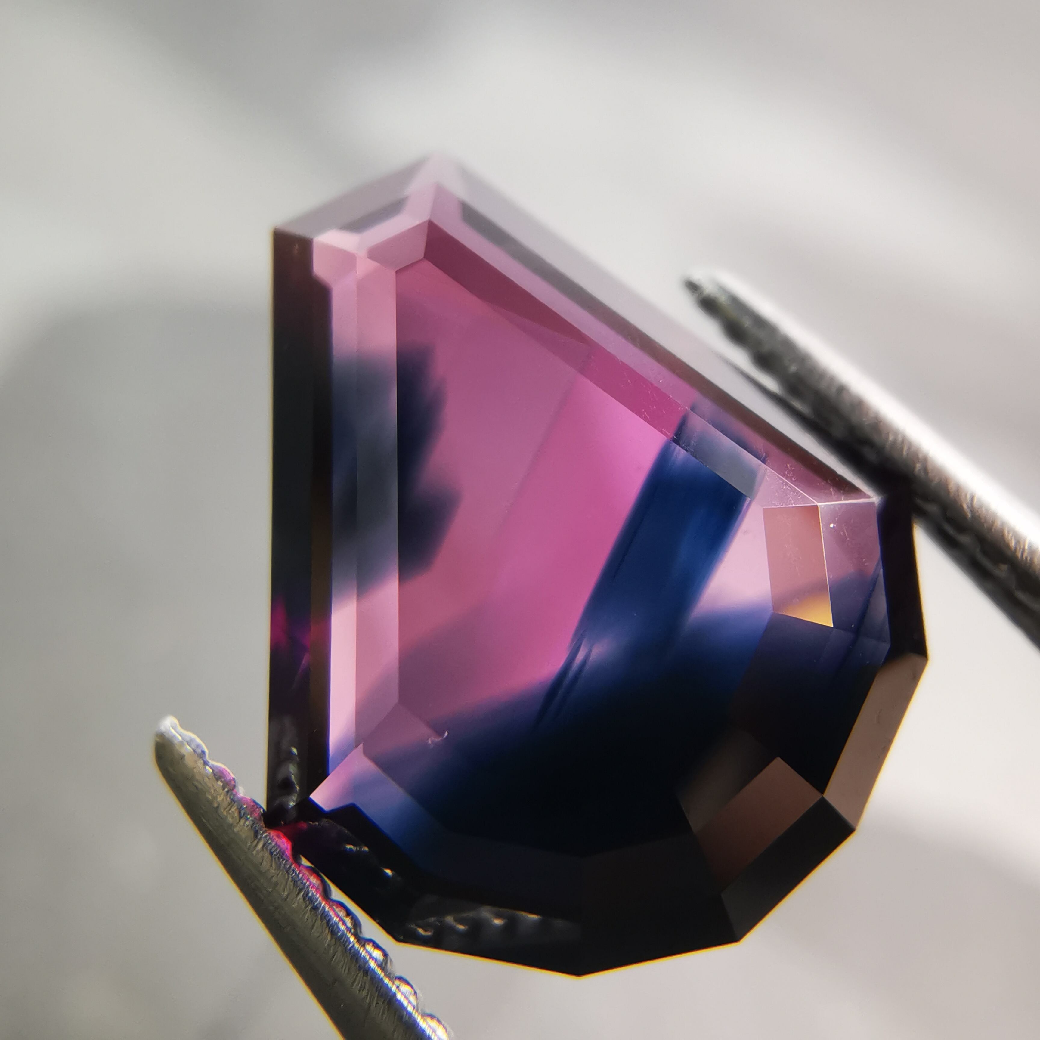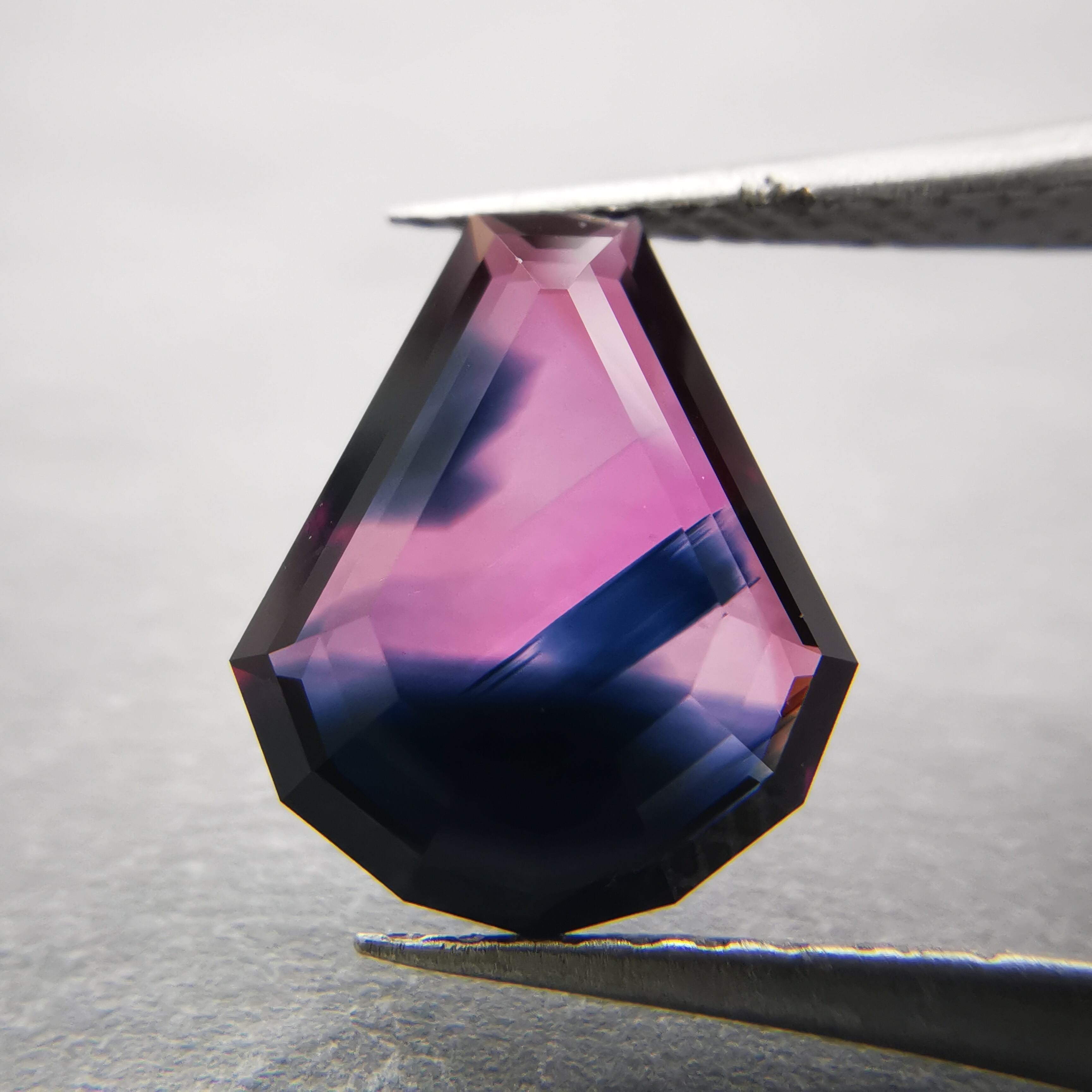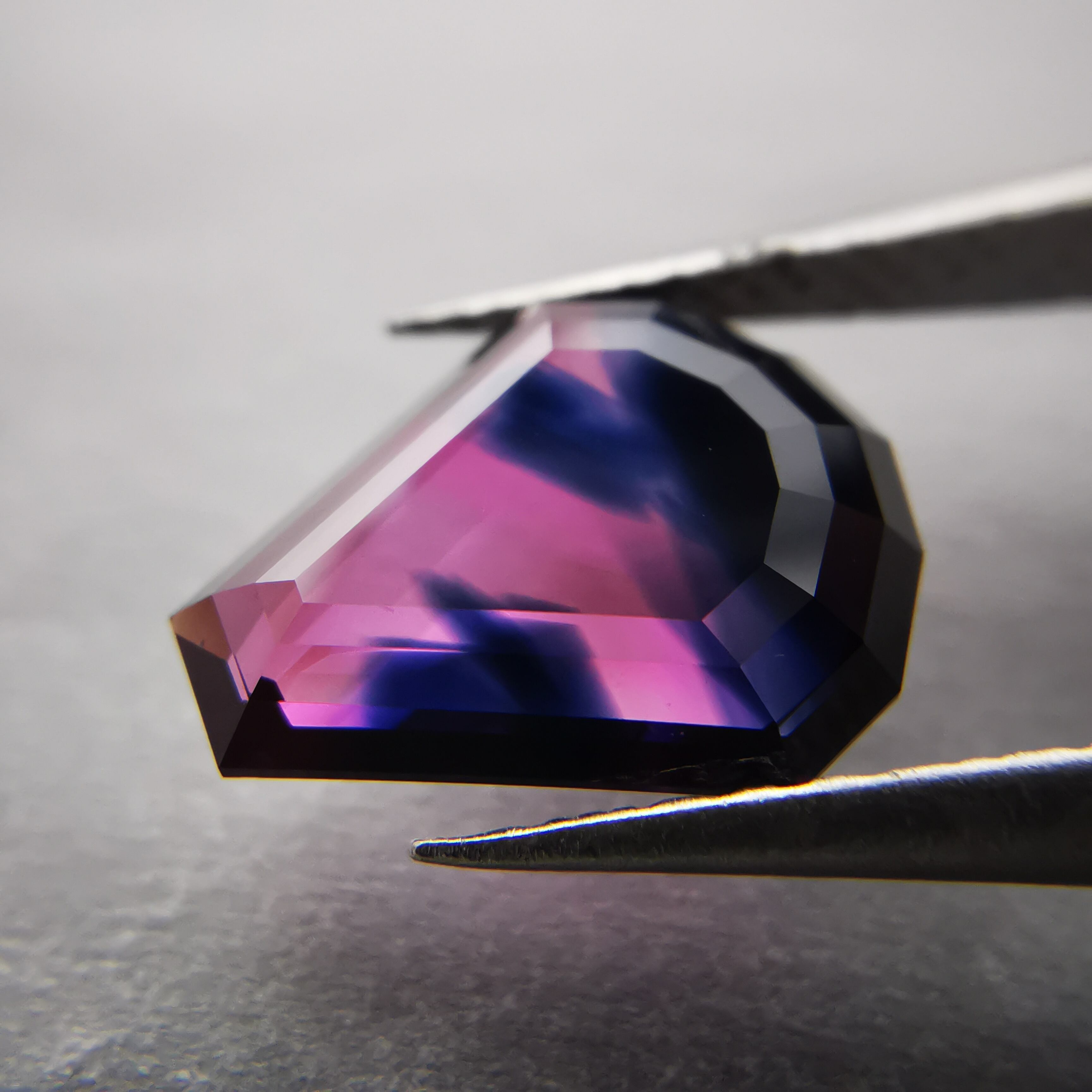 鮮やかな紫みのピンク/フクシアパープルと、暗い紫みの青/ネイビーブルーが劇的にせめぎ合う、バイカラーのサファイアです。