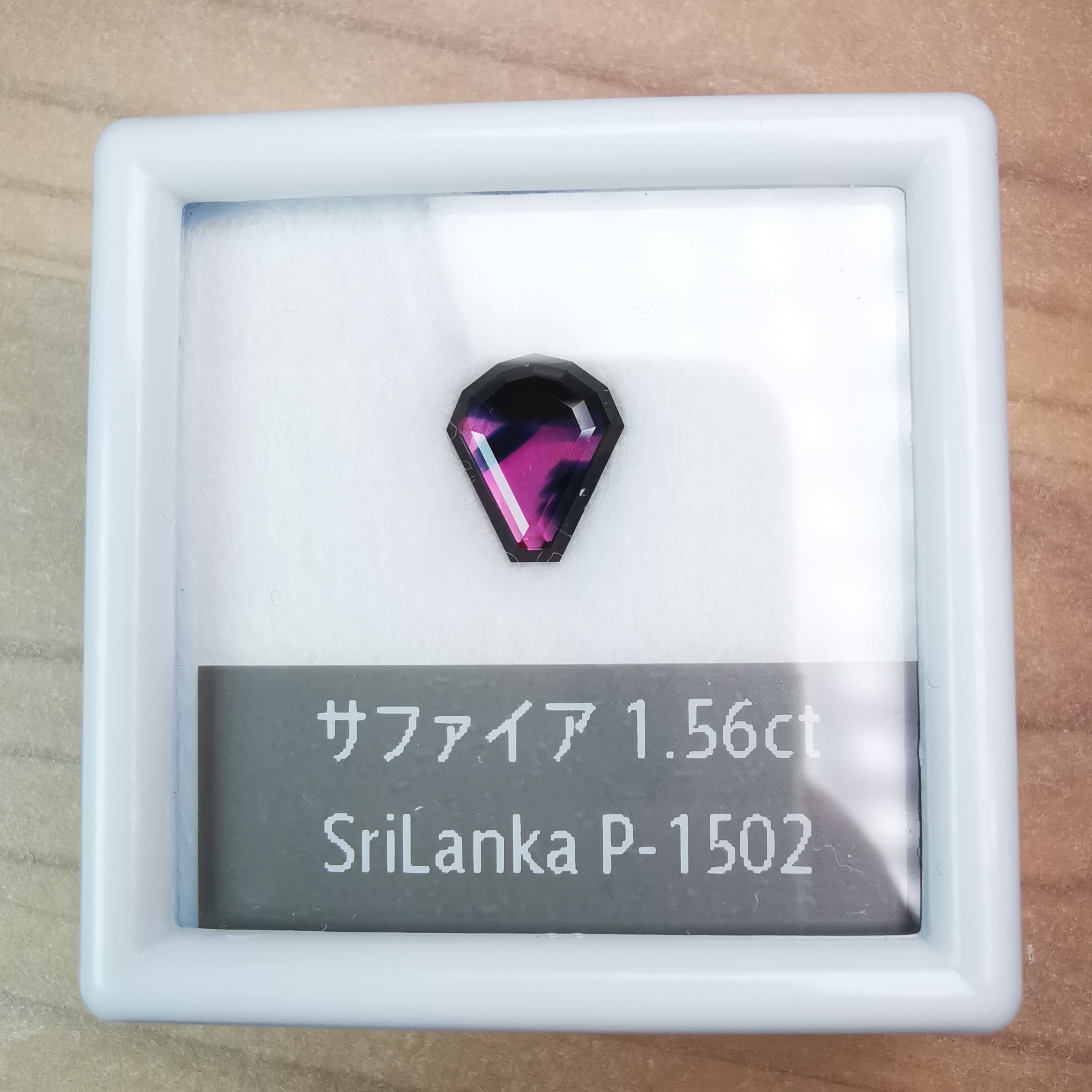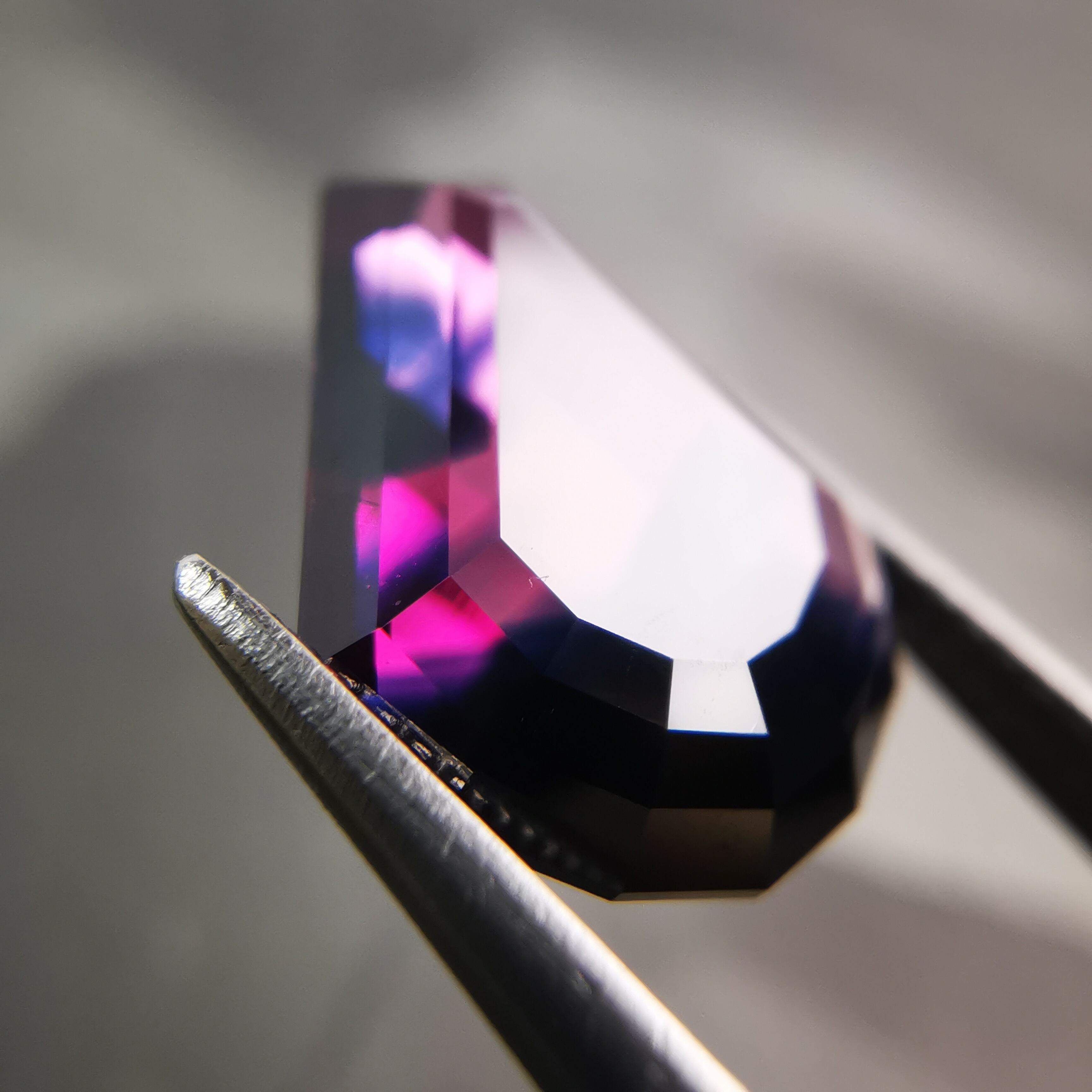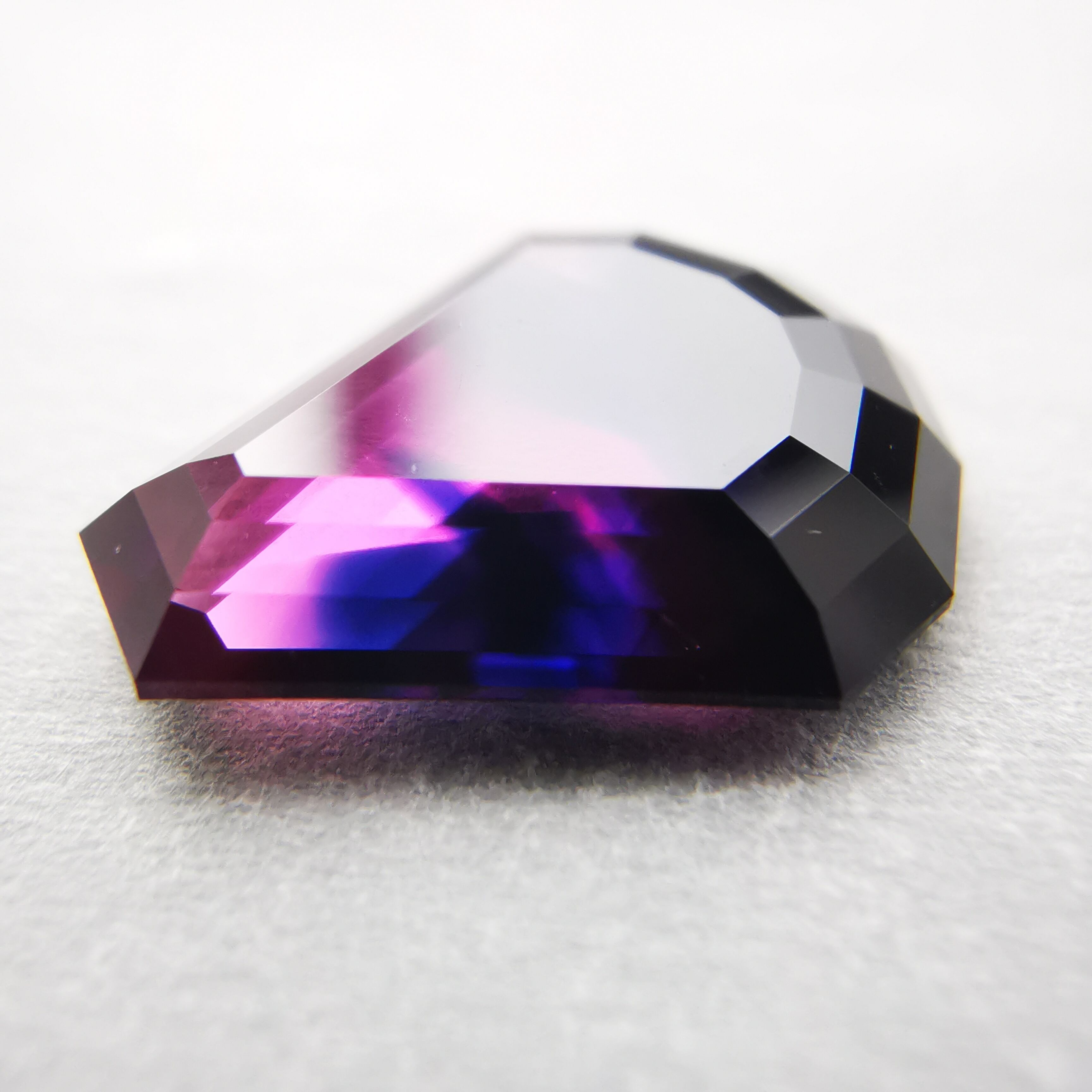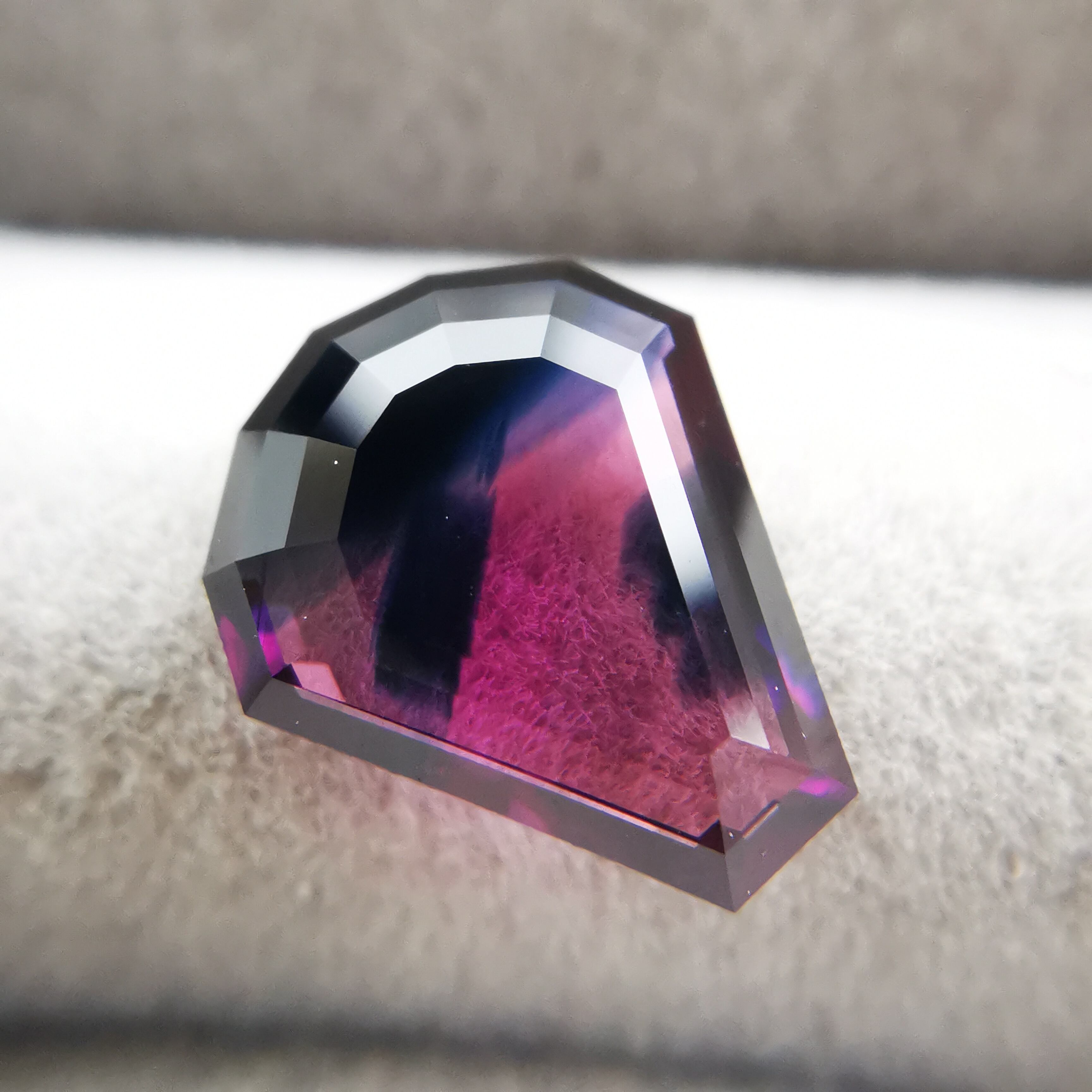 鮮やかな紫みのピンク/フクシアパープルと、暗い紫みの青/ネイビーブルーが劇的にせめぎ合う、バイカラーのサファイアです。