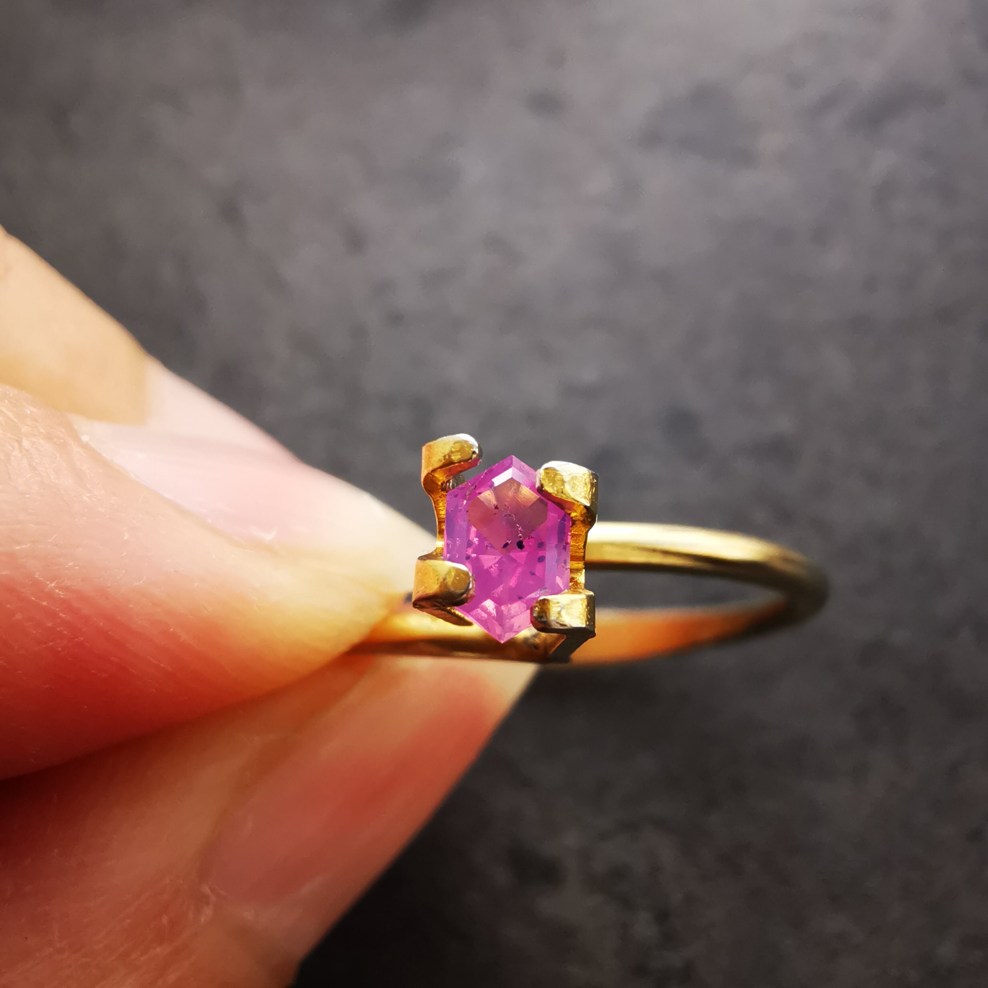 ベトナム産のサファイアはカットが甘いことが多いので、ピンピンのカスタムカットが新鮮な印象です。