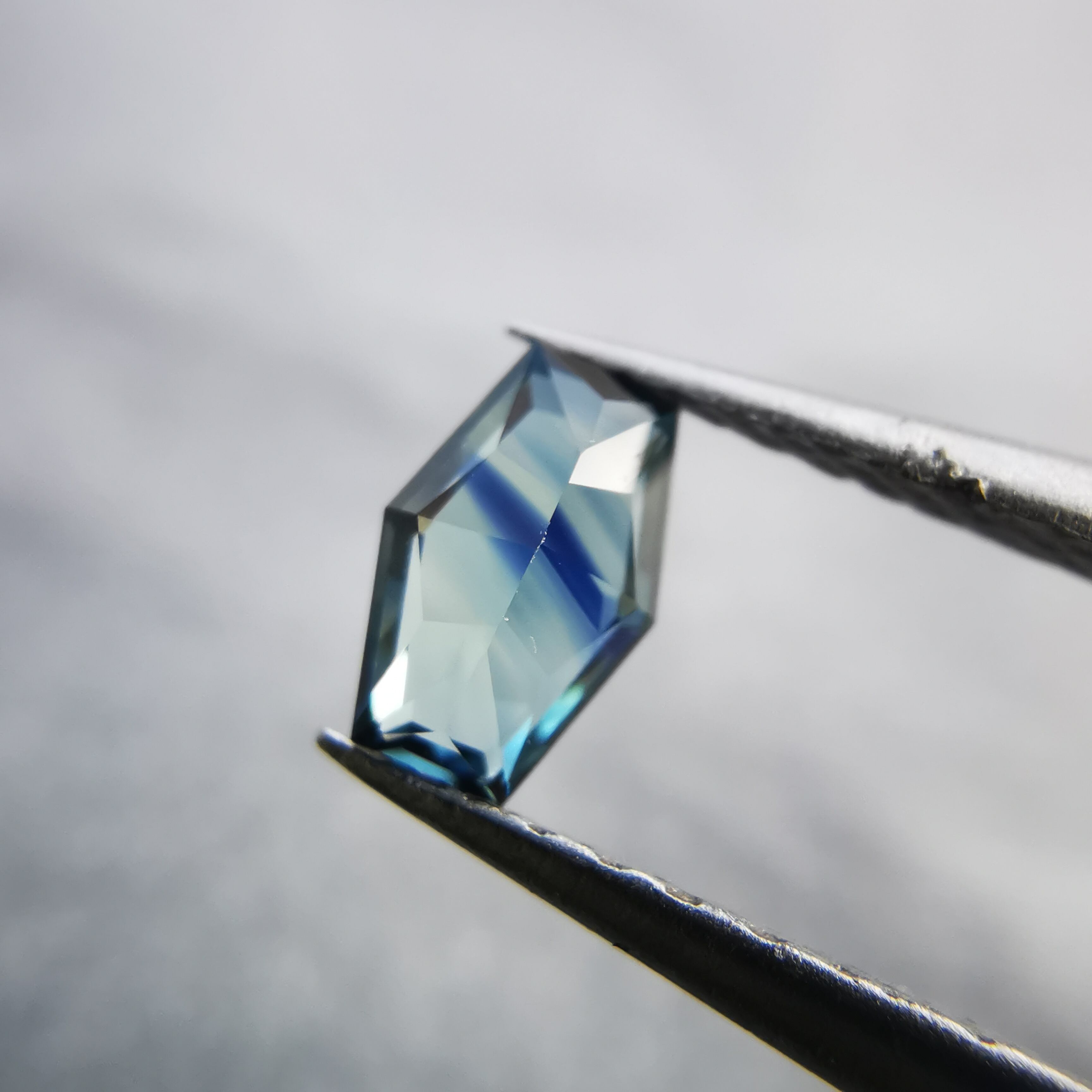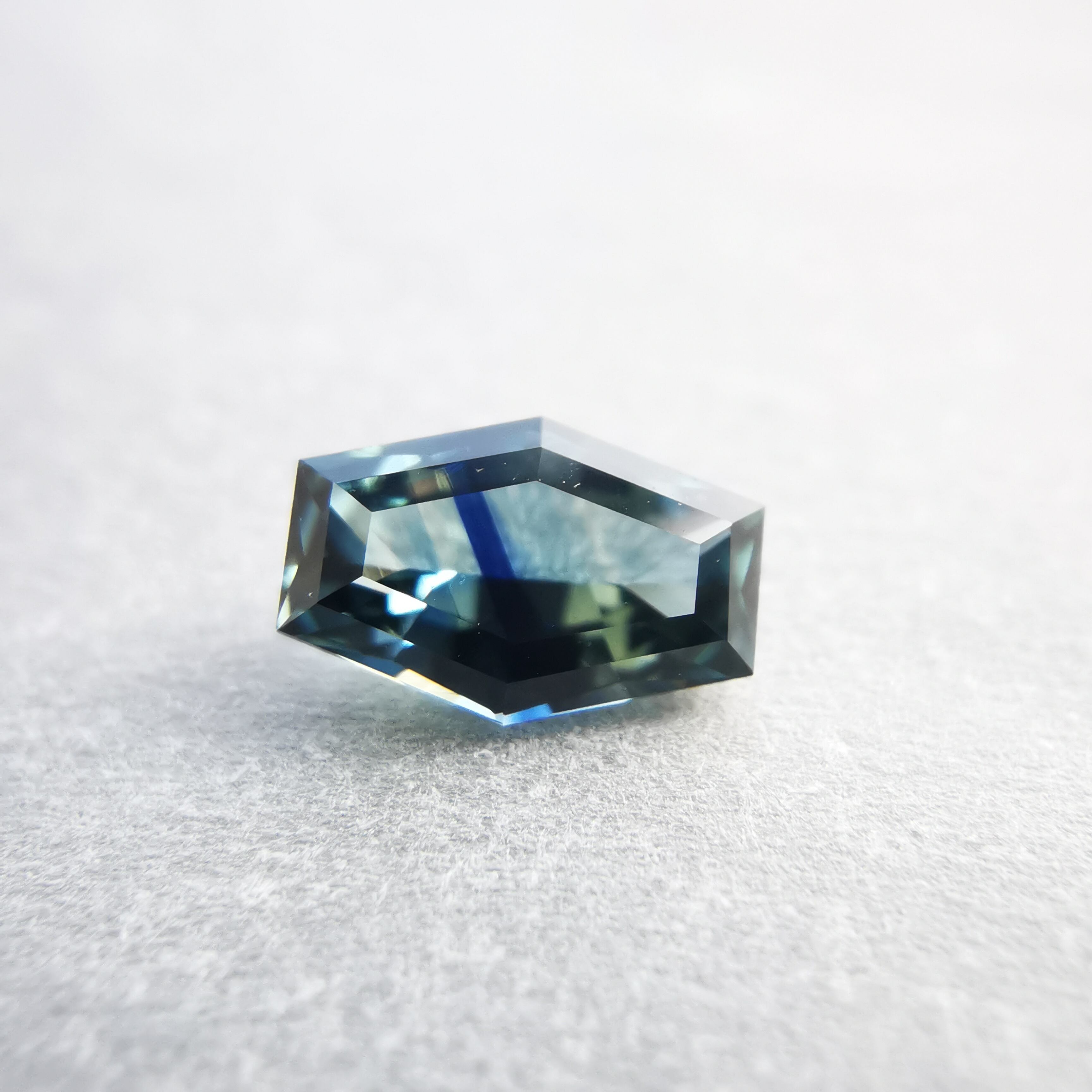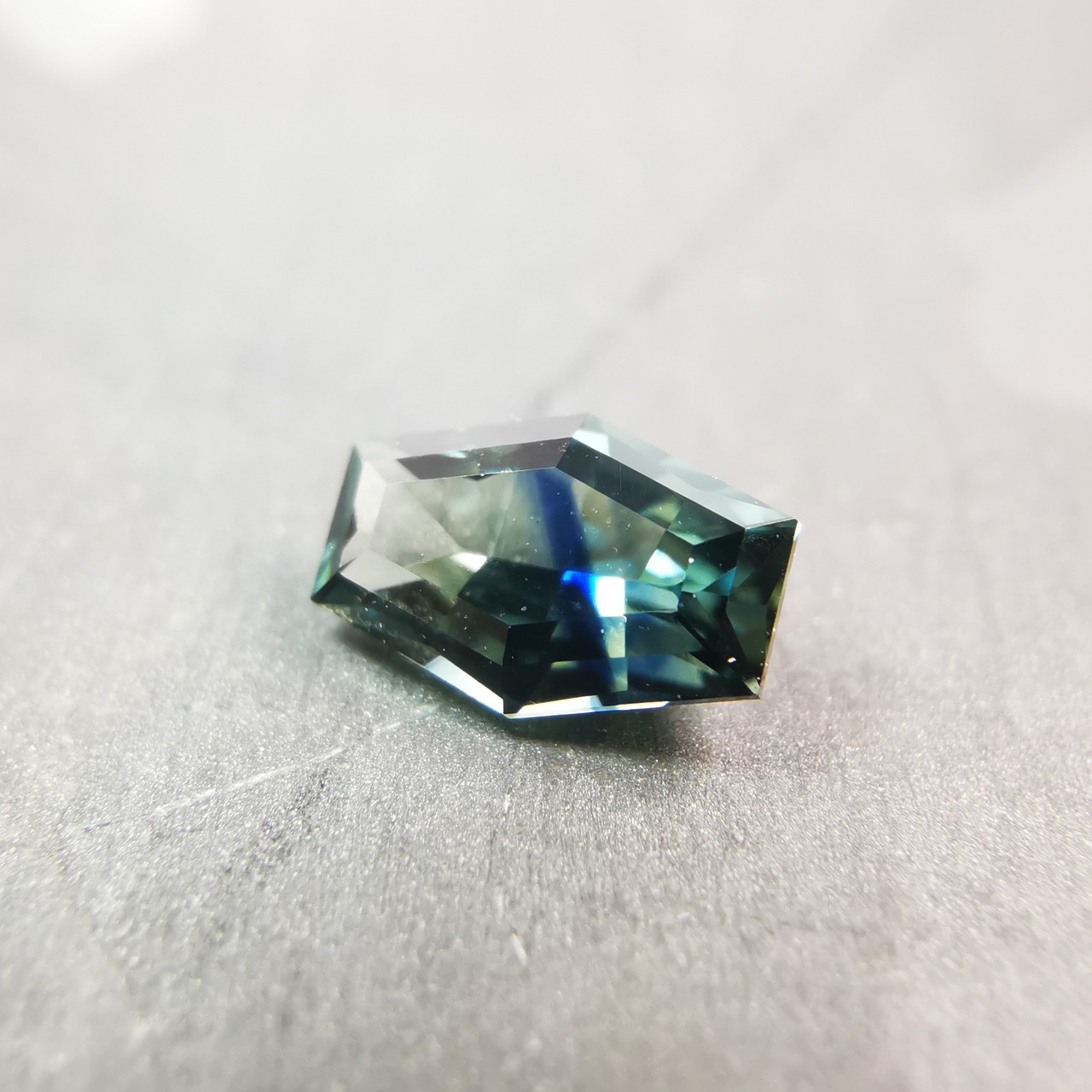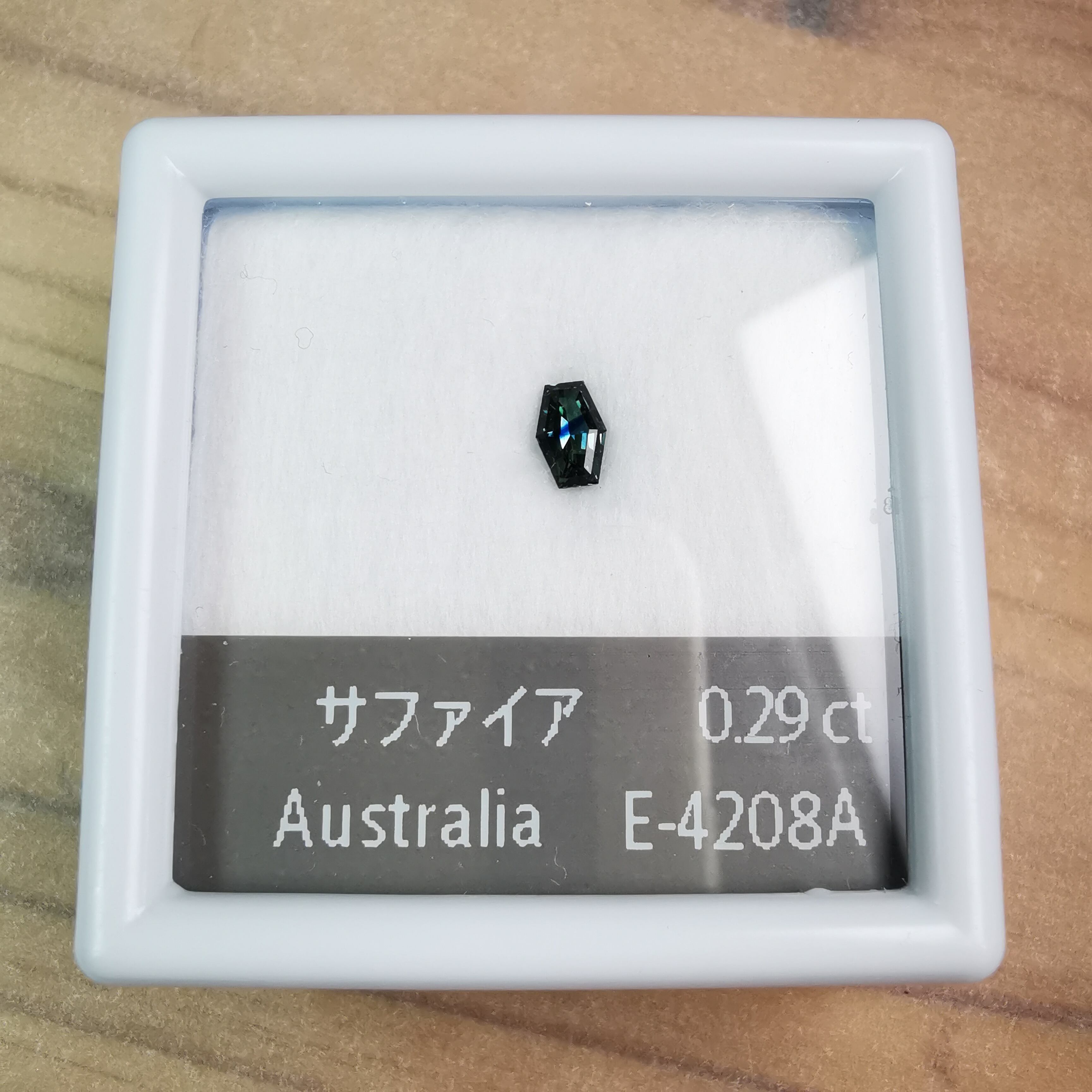 灰みのグリーン系石の中を、紺色のカラーバンドが1本ズバッと横切るサファイアです。