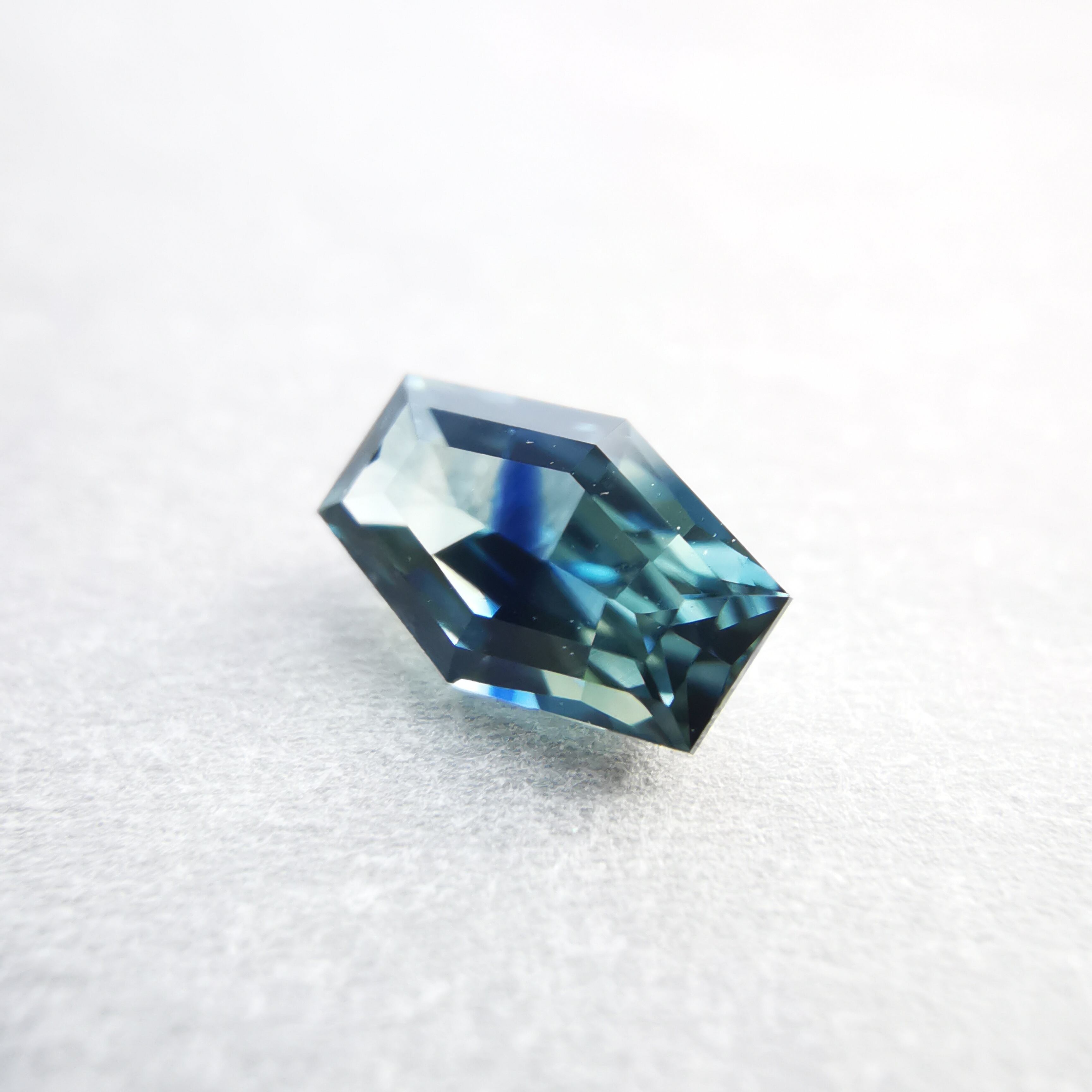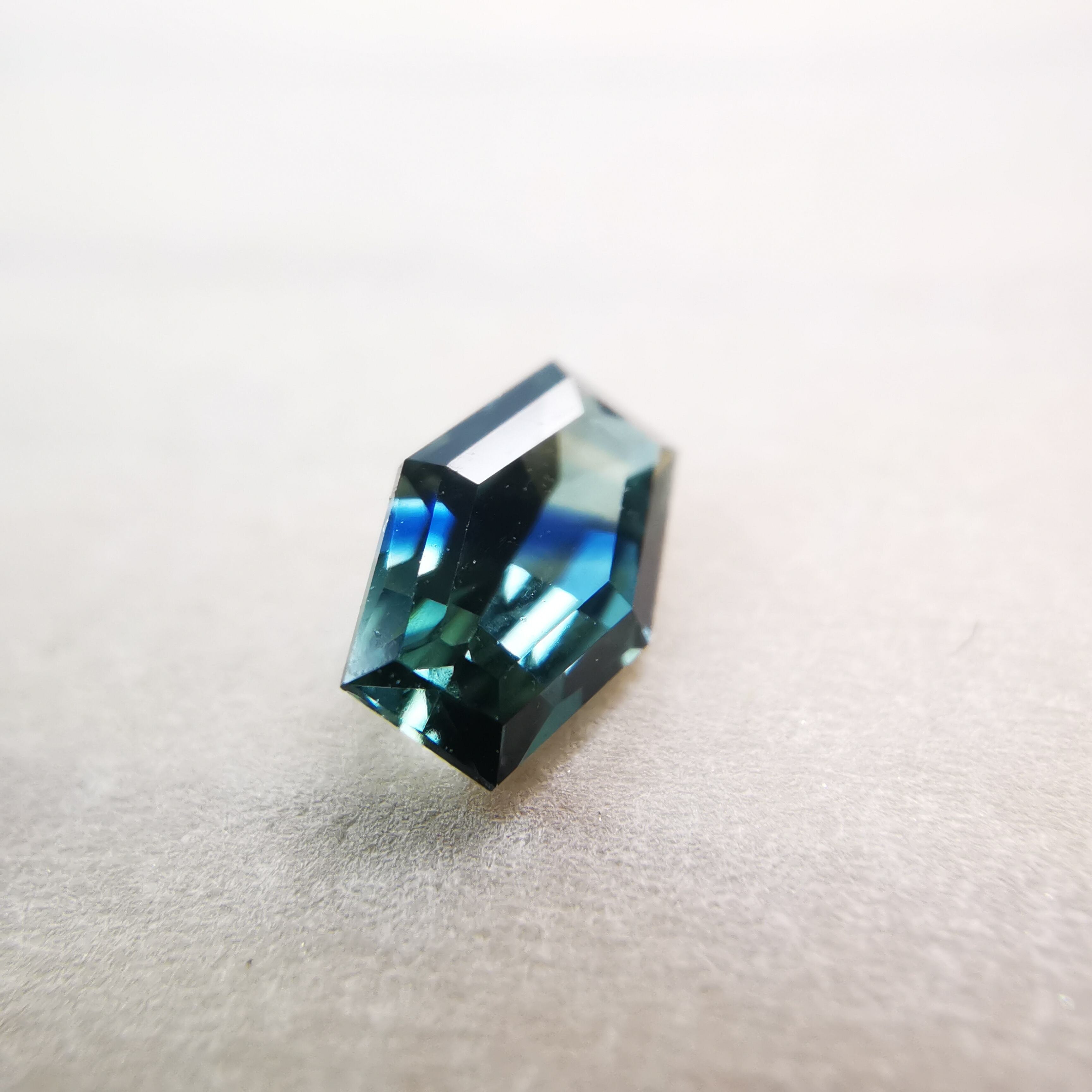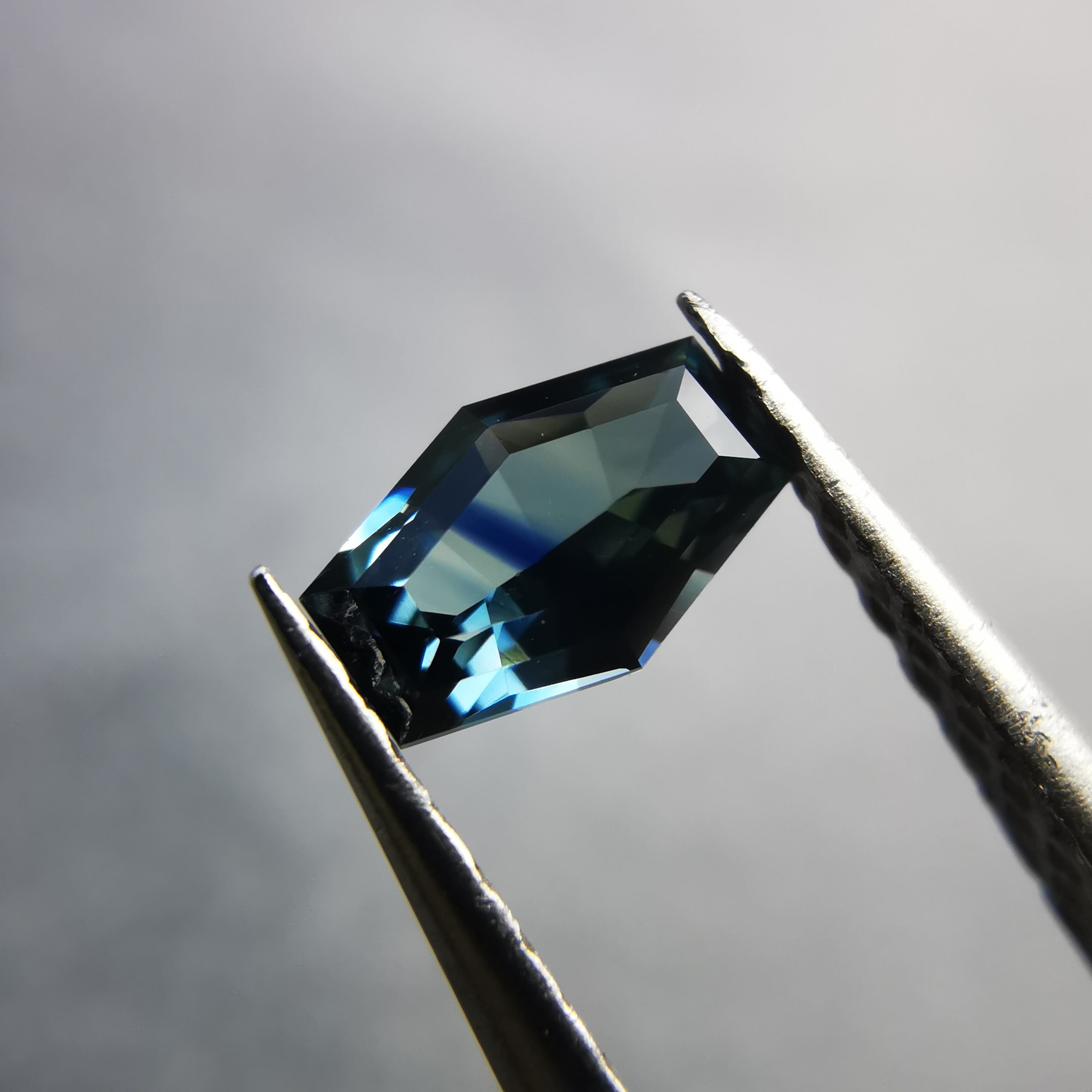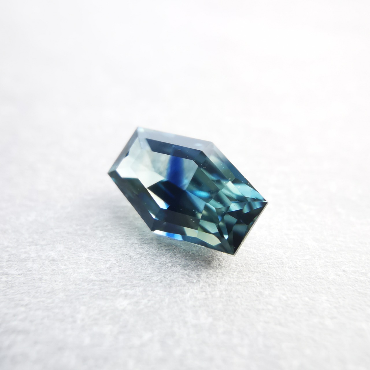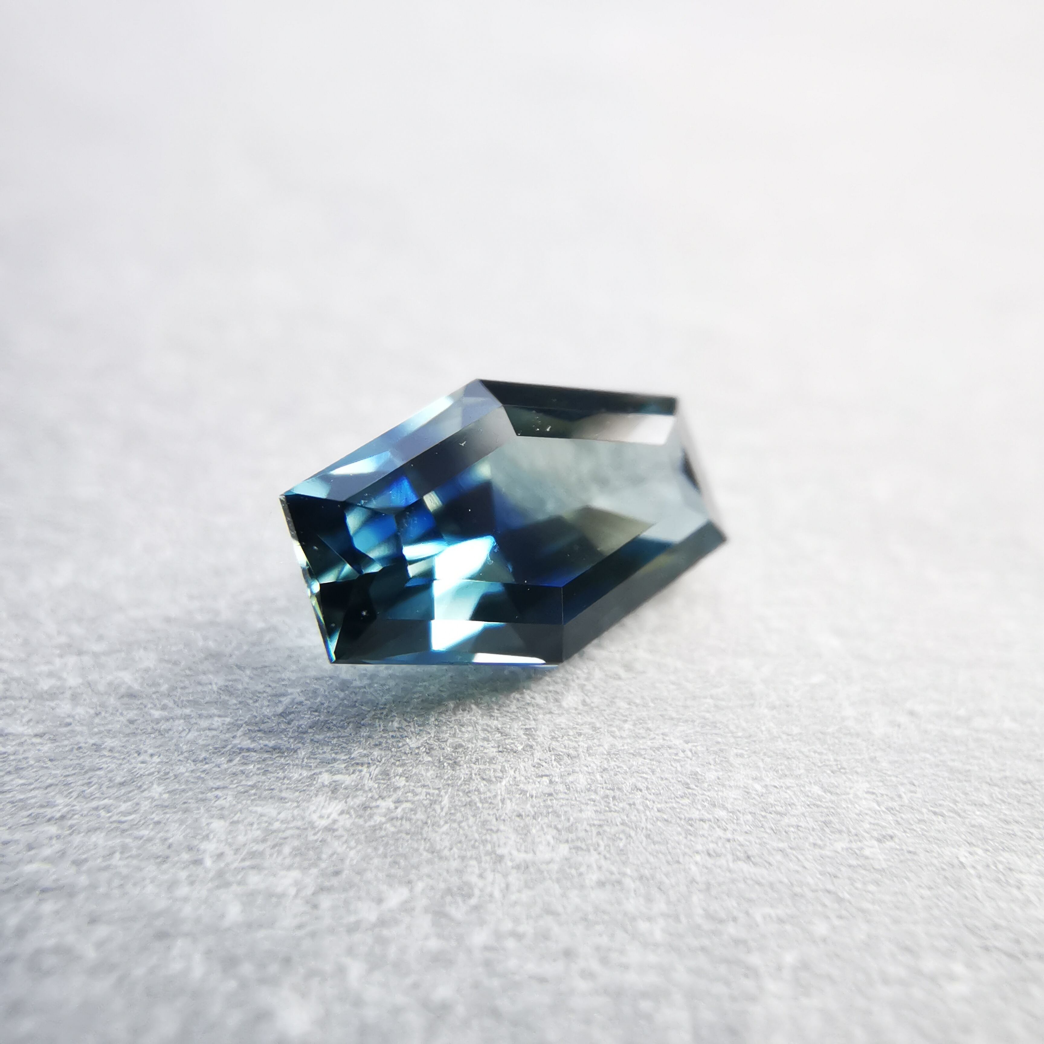 灰みのグリーン系石の中を、紺色のカラーバンドが1本ズバッと横切るサファイアです。