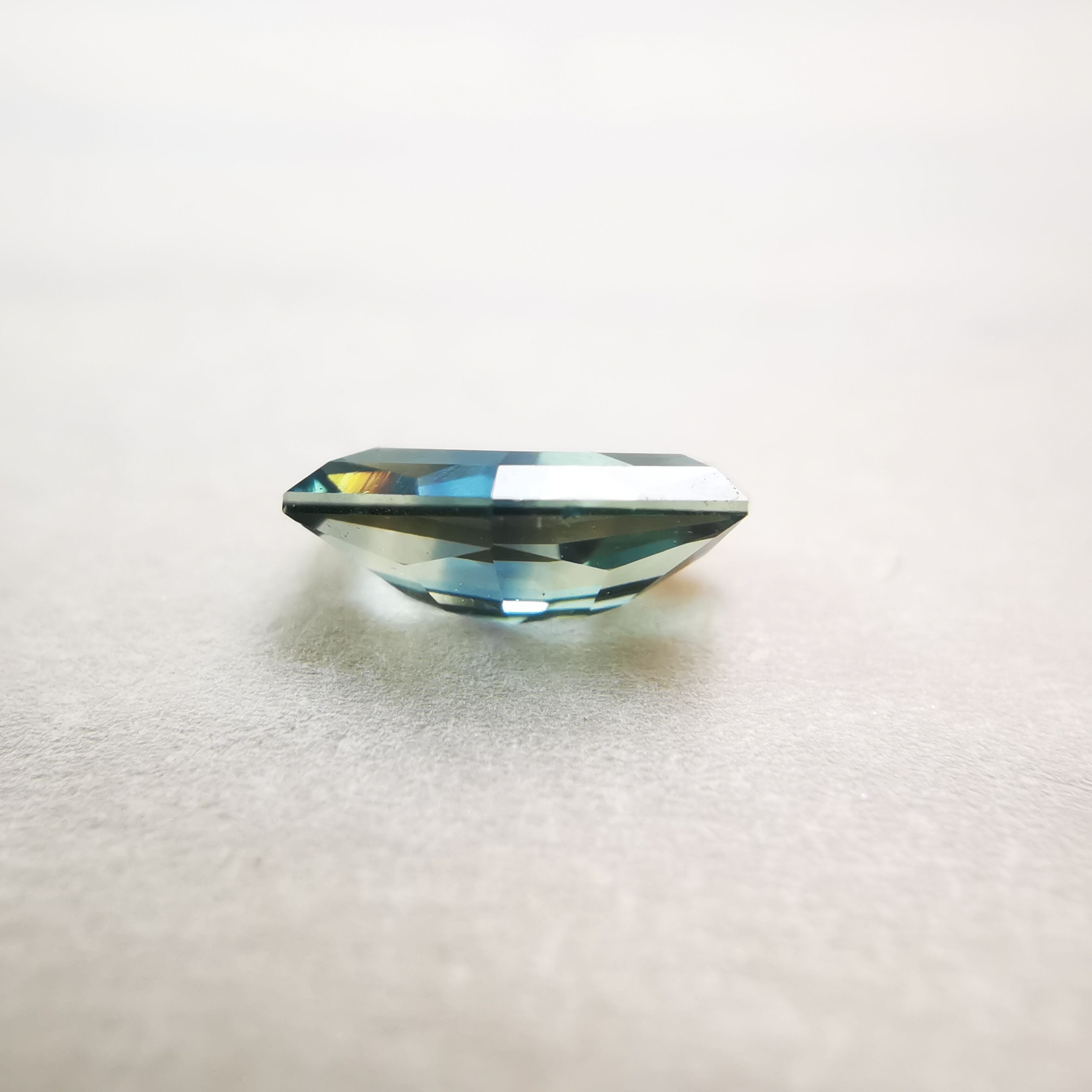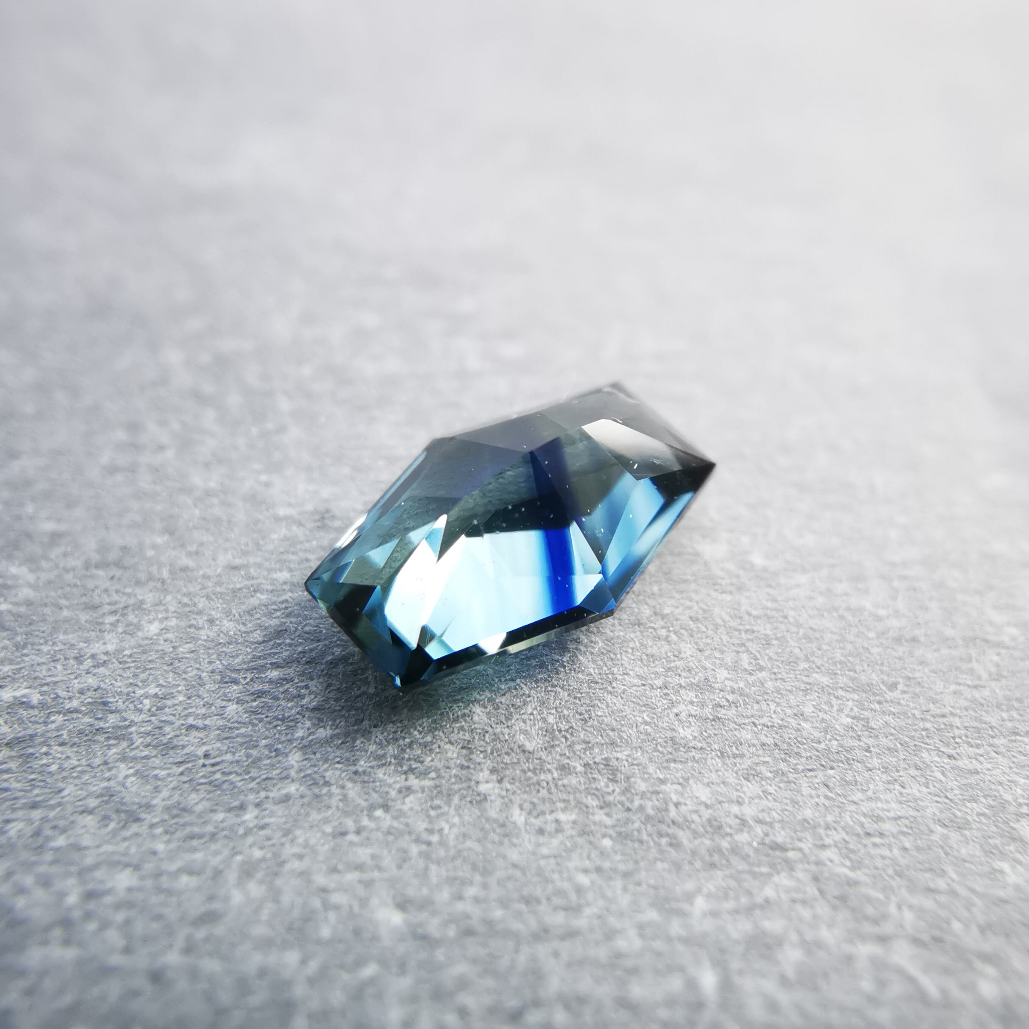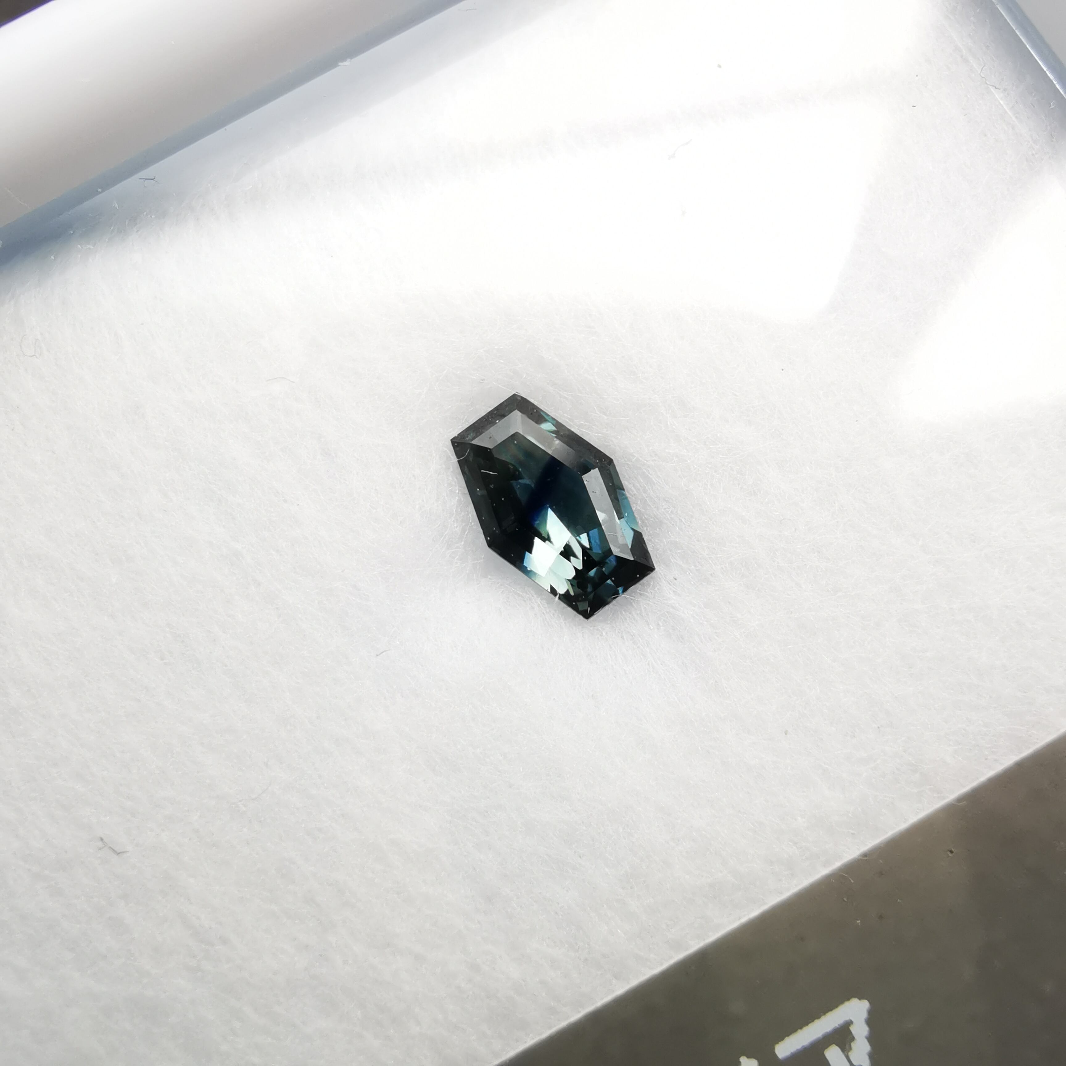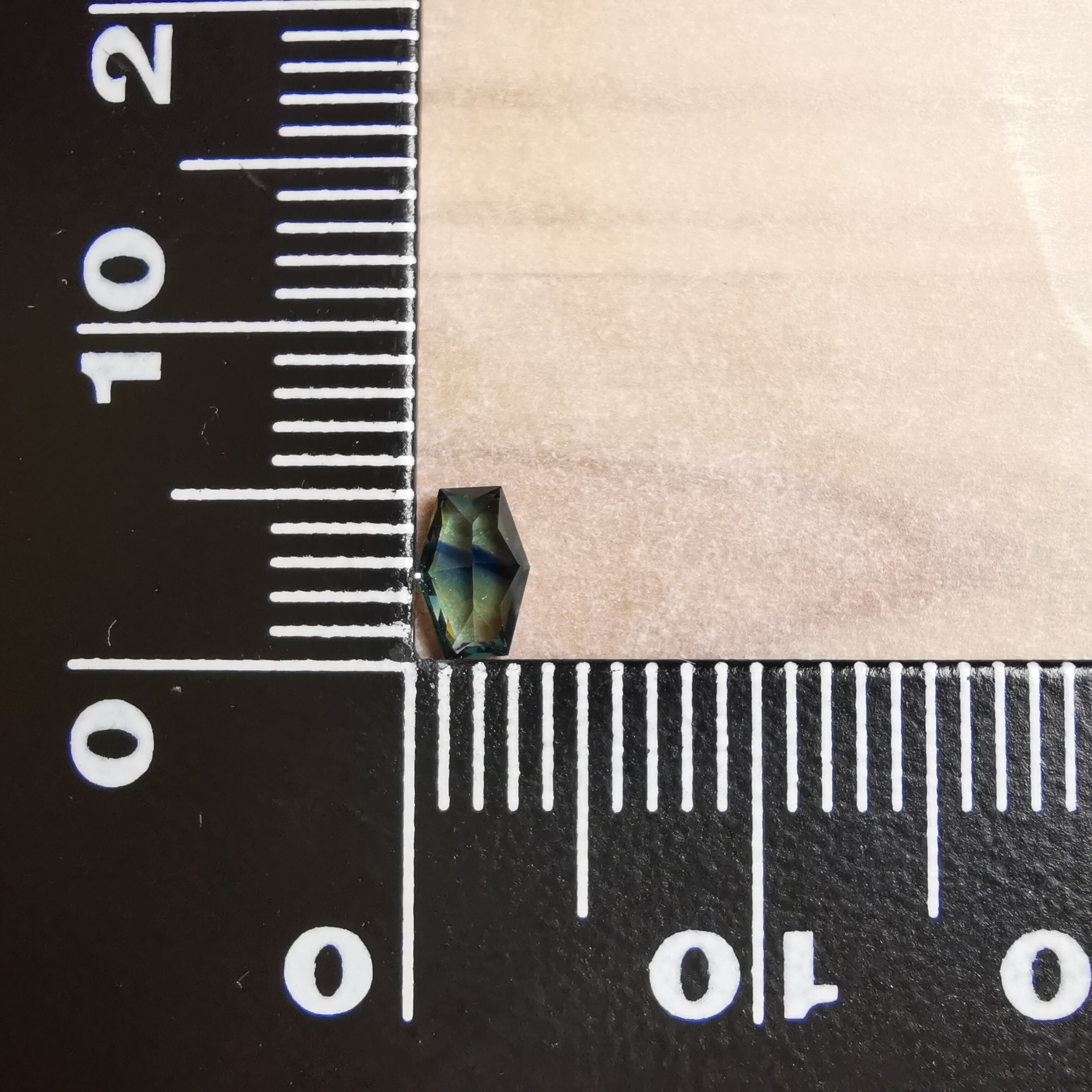 灰みのグリーン系石の中を、紺色のカラーバンドが1本ズバッと横切るサファイアです。