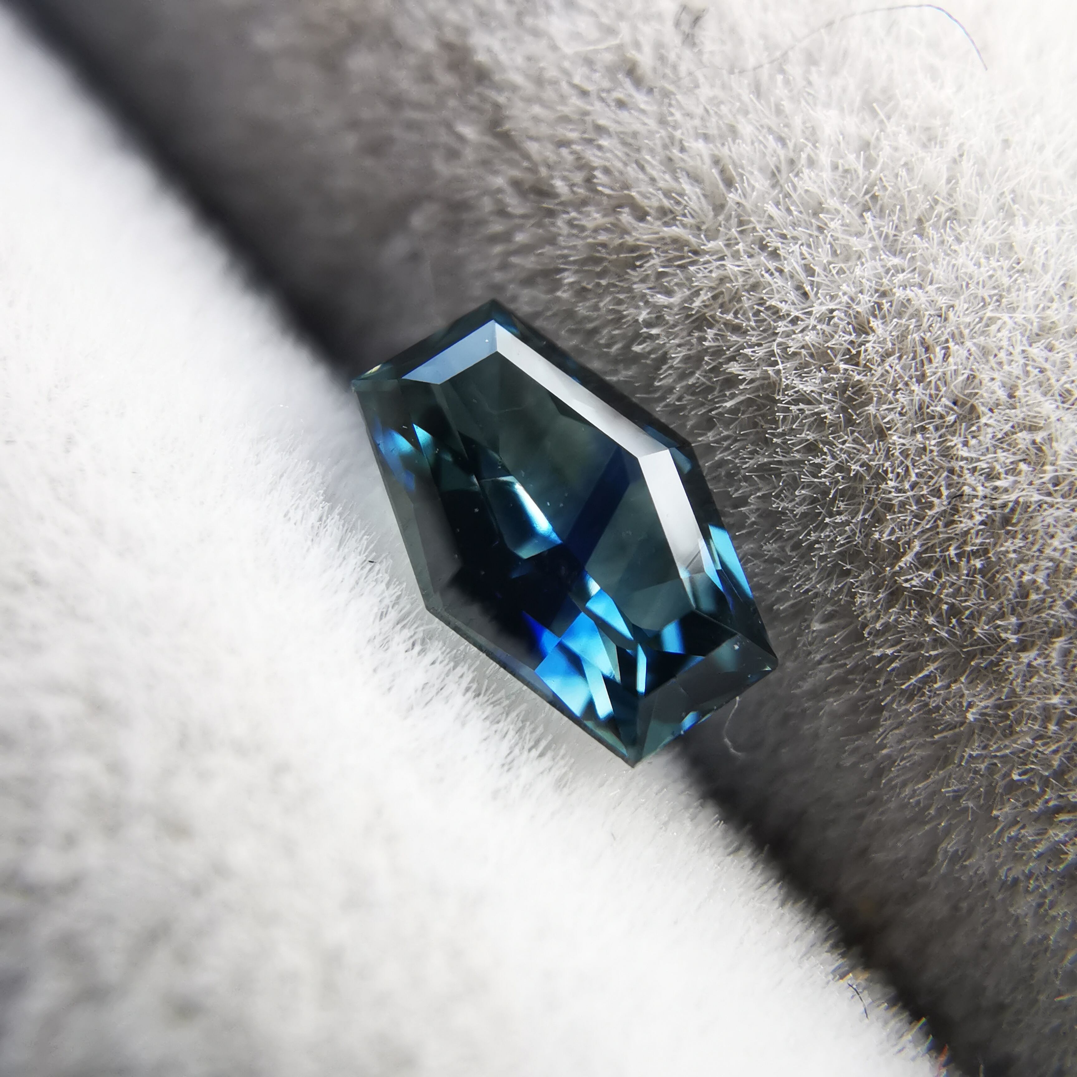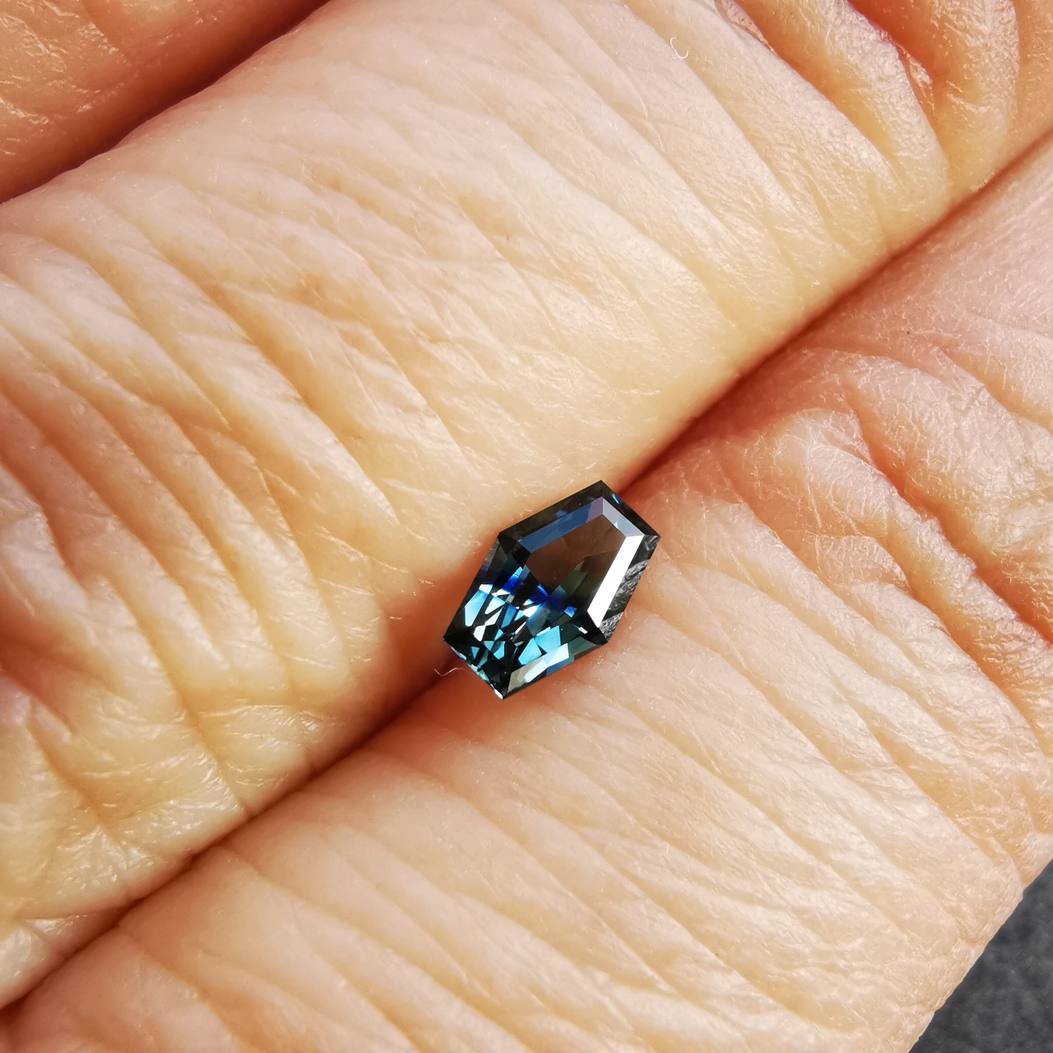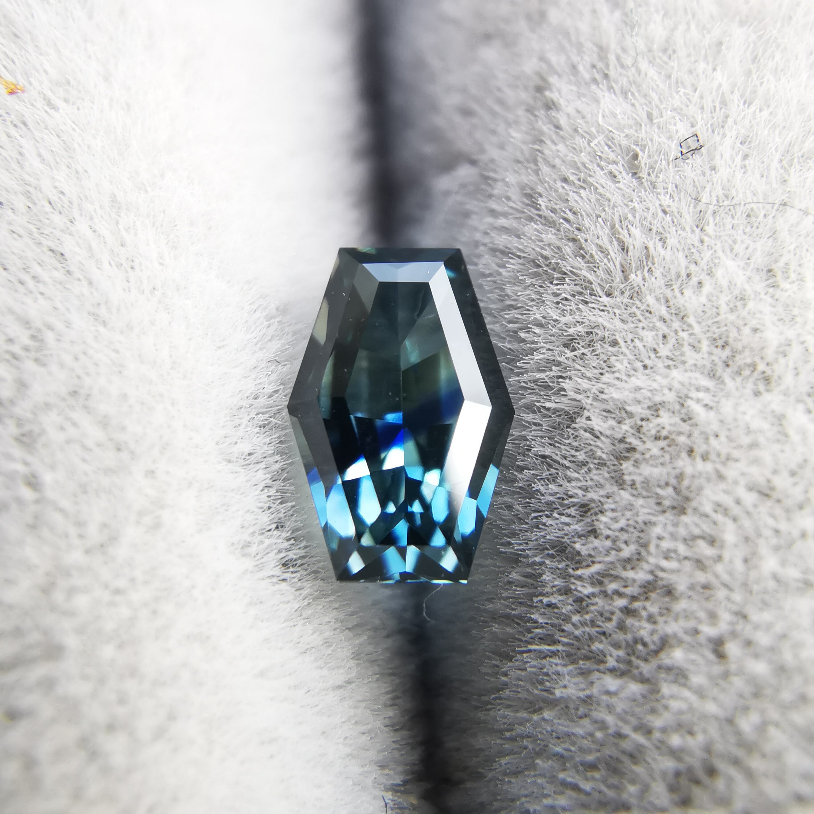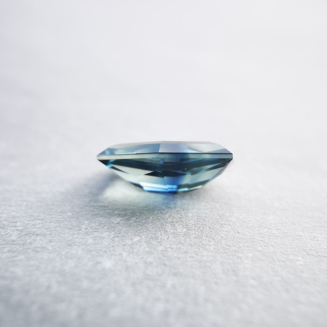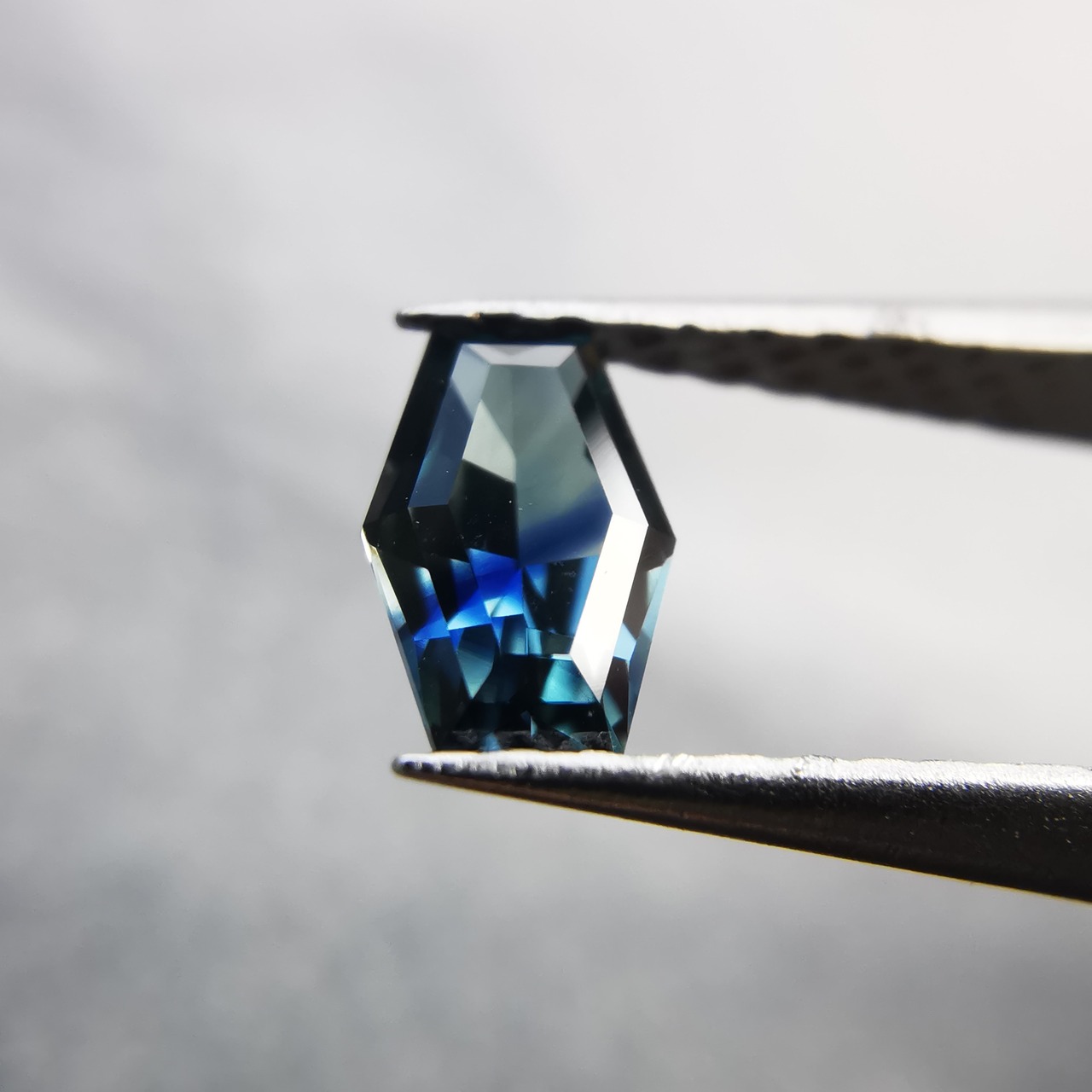 灰みのグリーン系石の中を、紺色のカラーバンドが1本ズバッと横切るサファイアです。