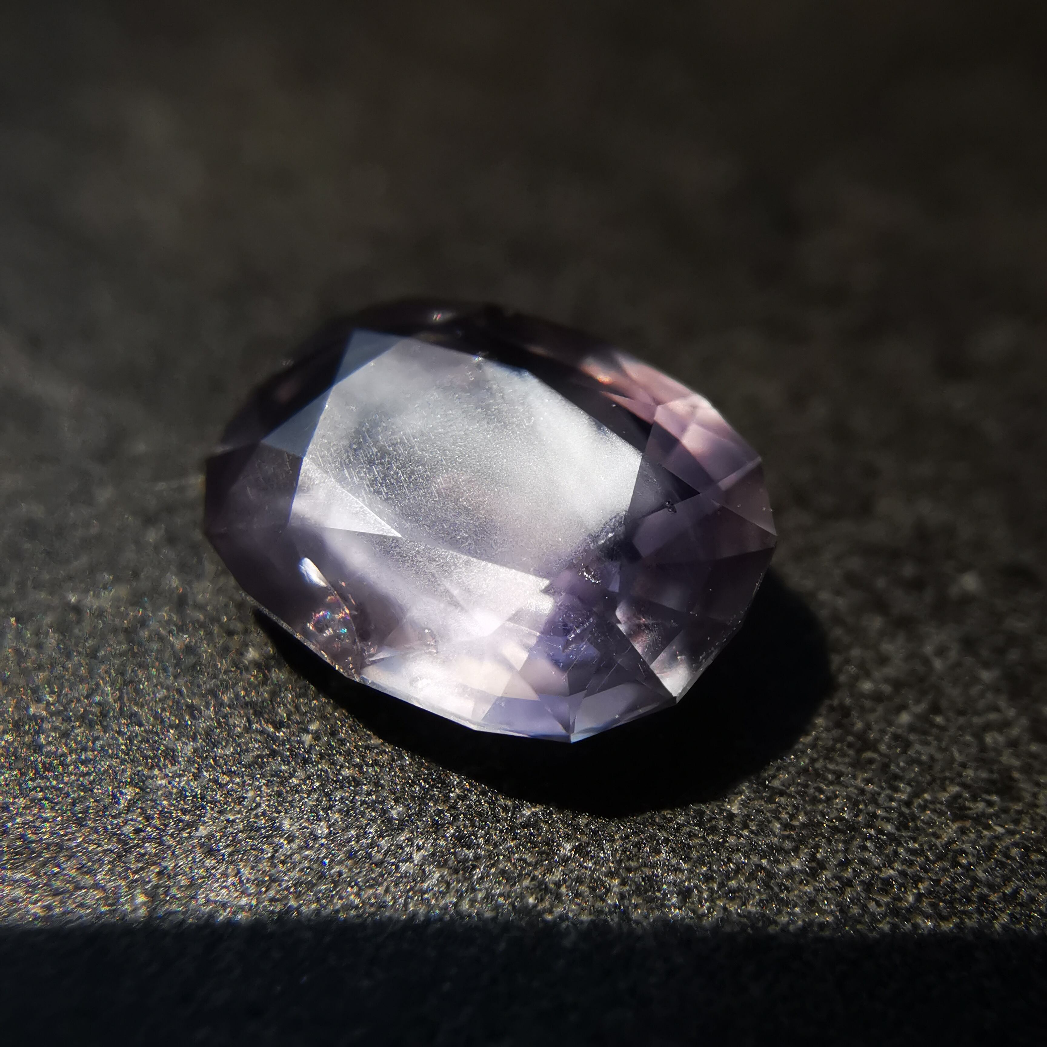 どちらの光源でも、シルクインクルージョンが濃厚にきらめきます。