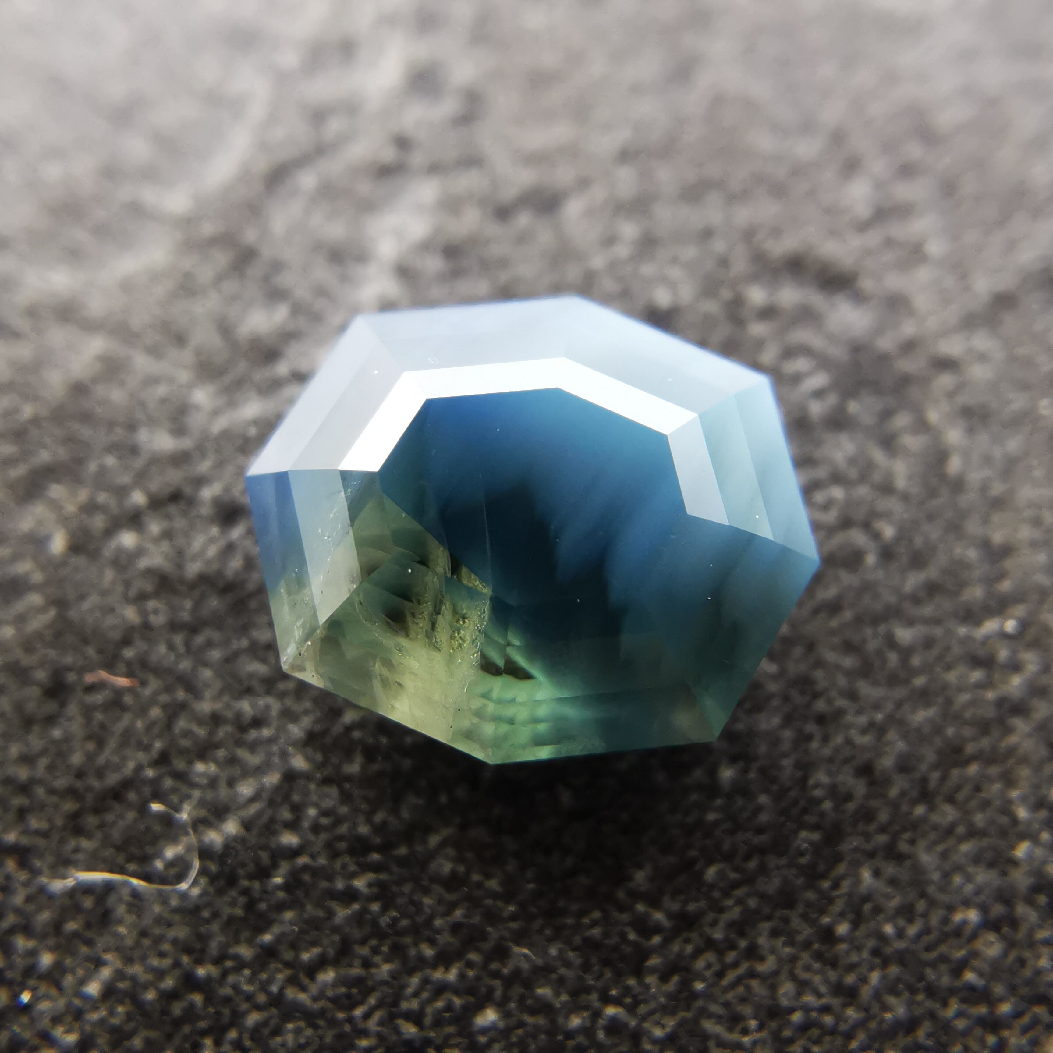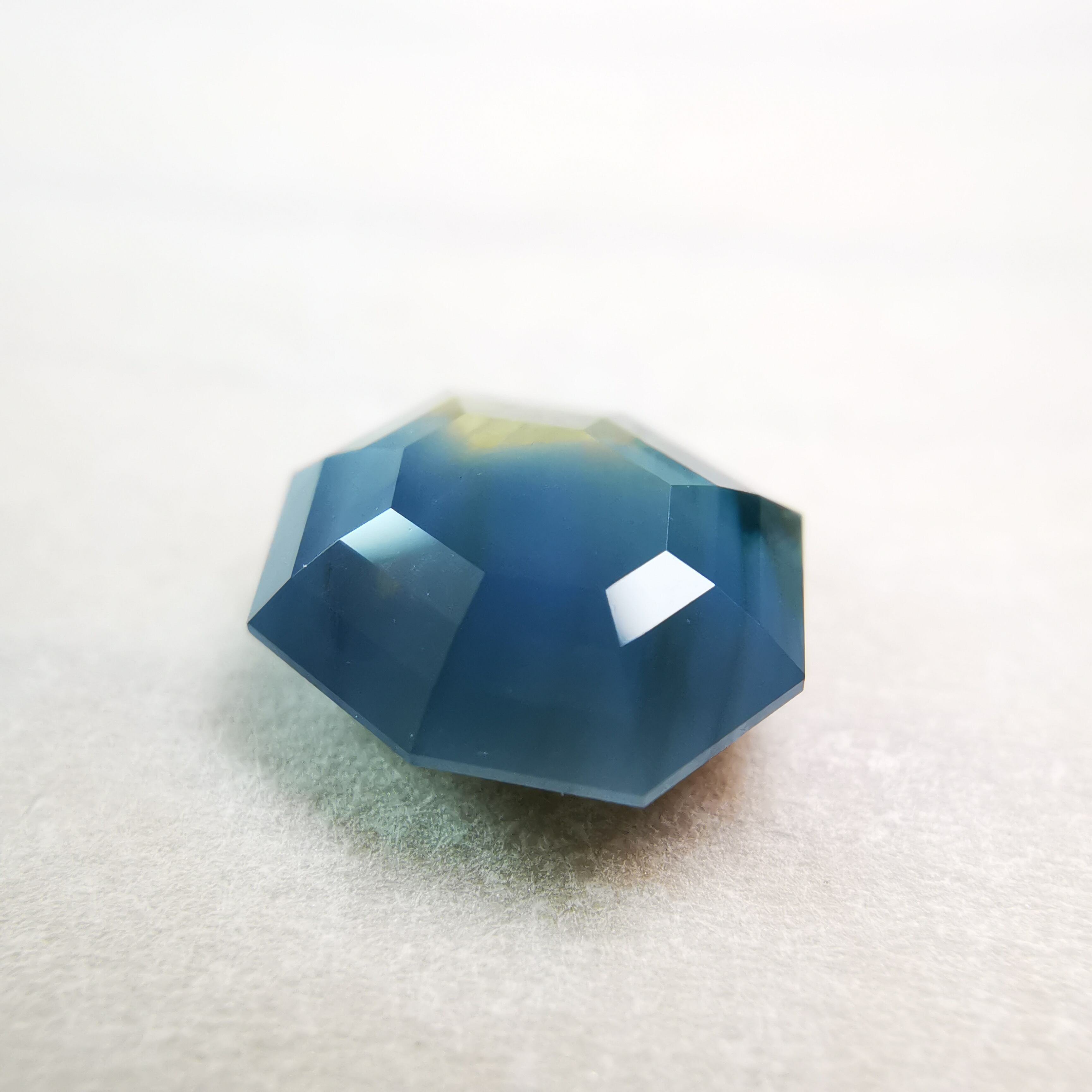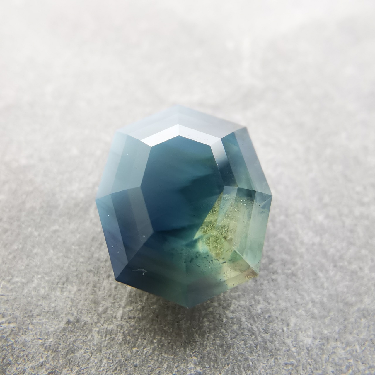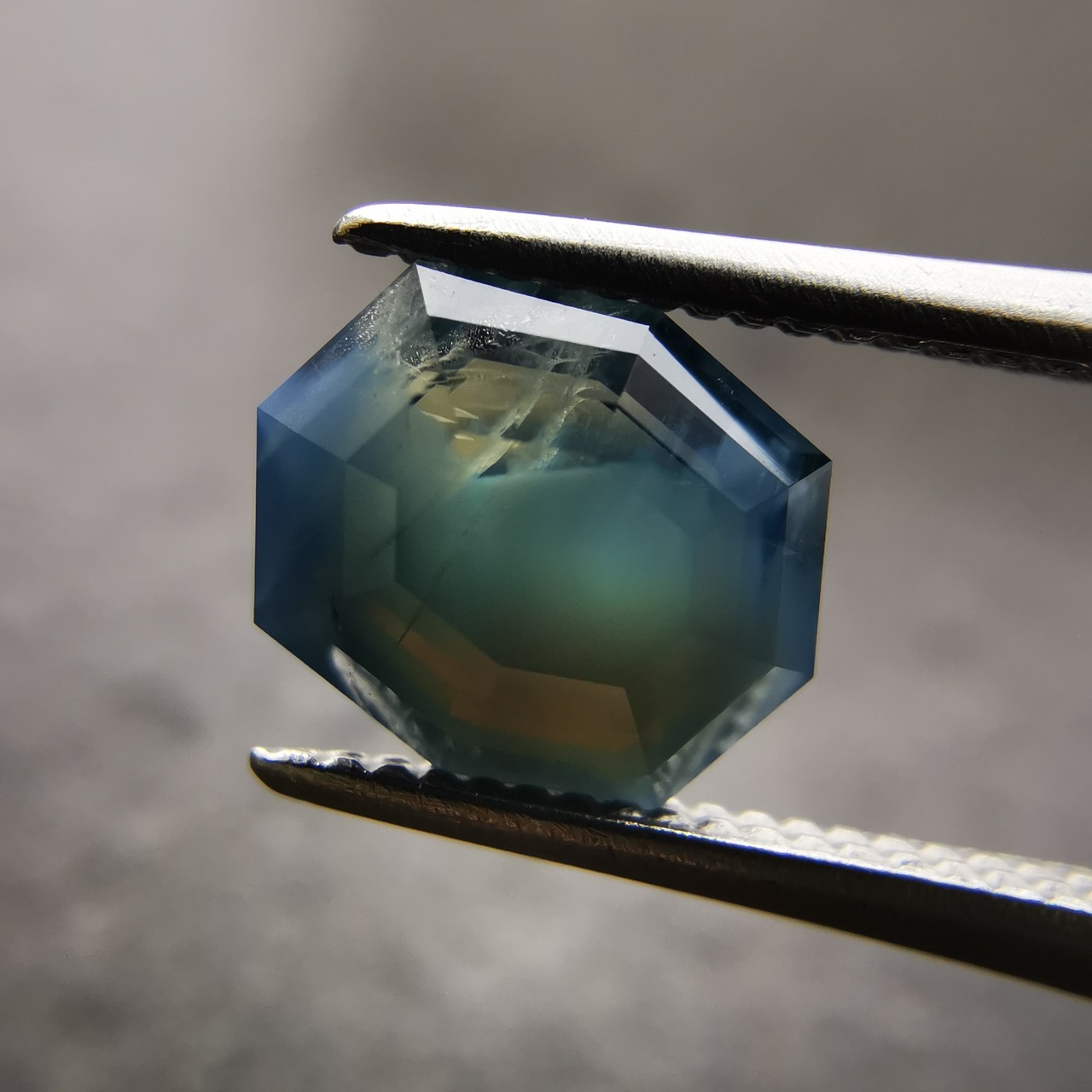 透明なイエローと、不透明な暗い灰みの青/鉄納戸色の、バイカラーサファイアです。