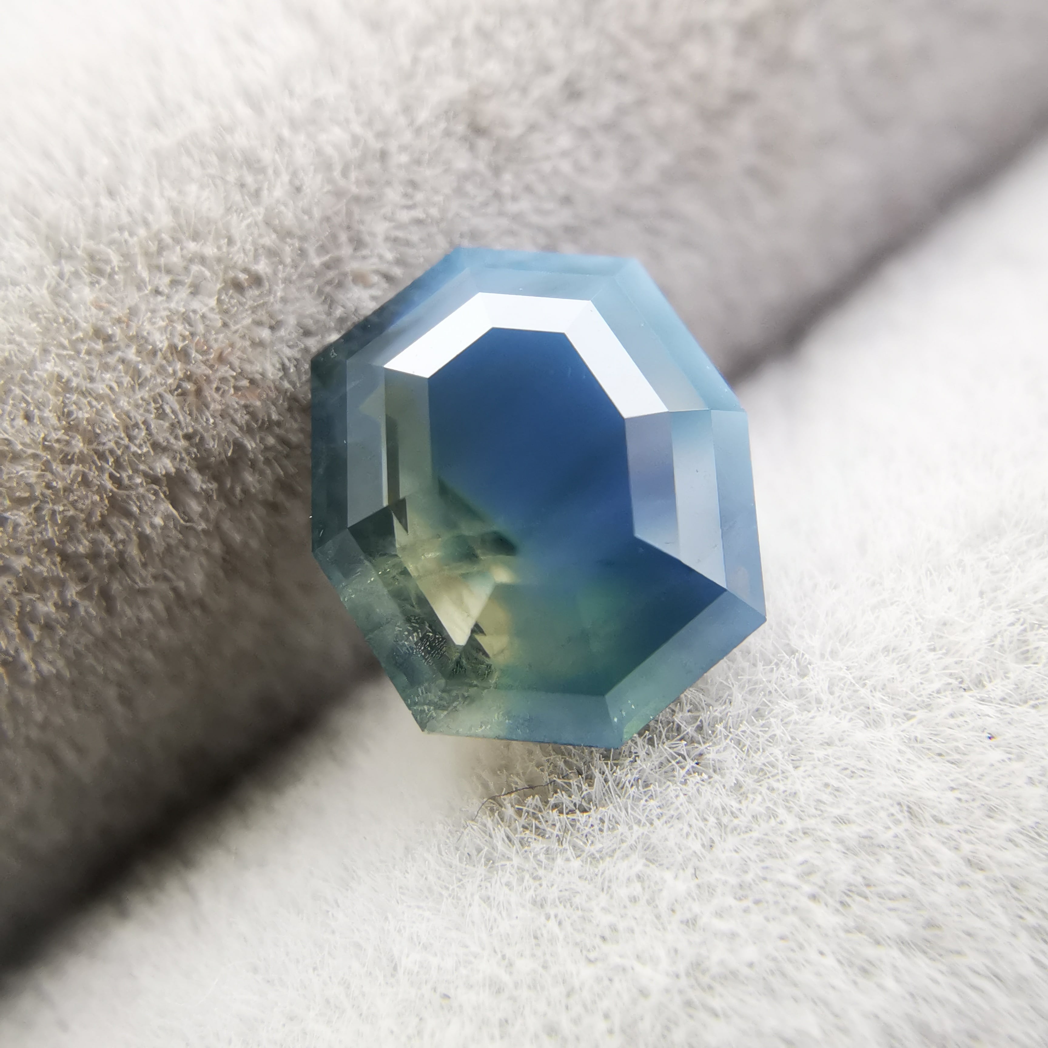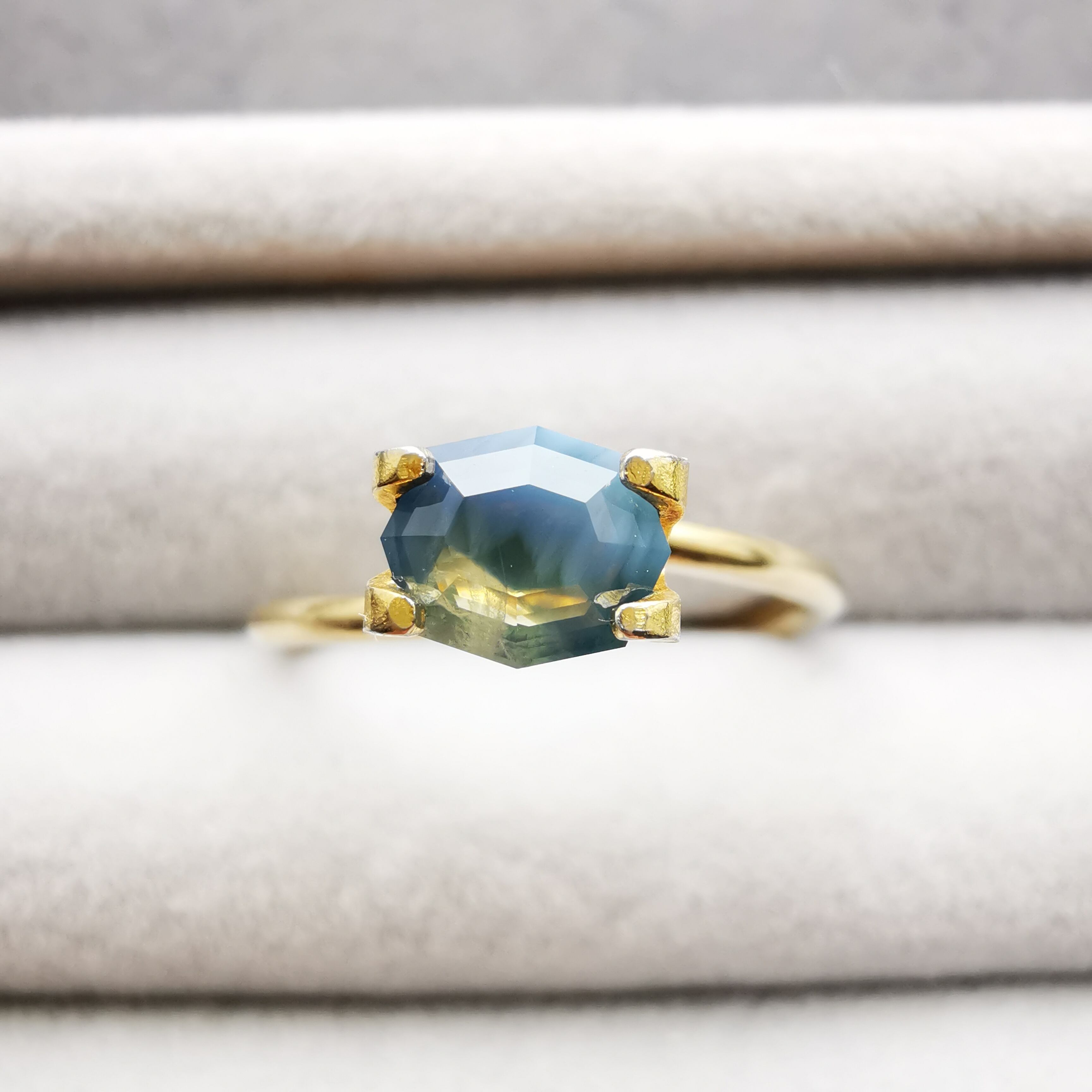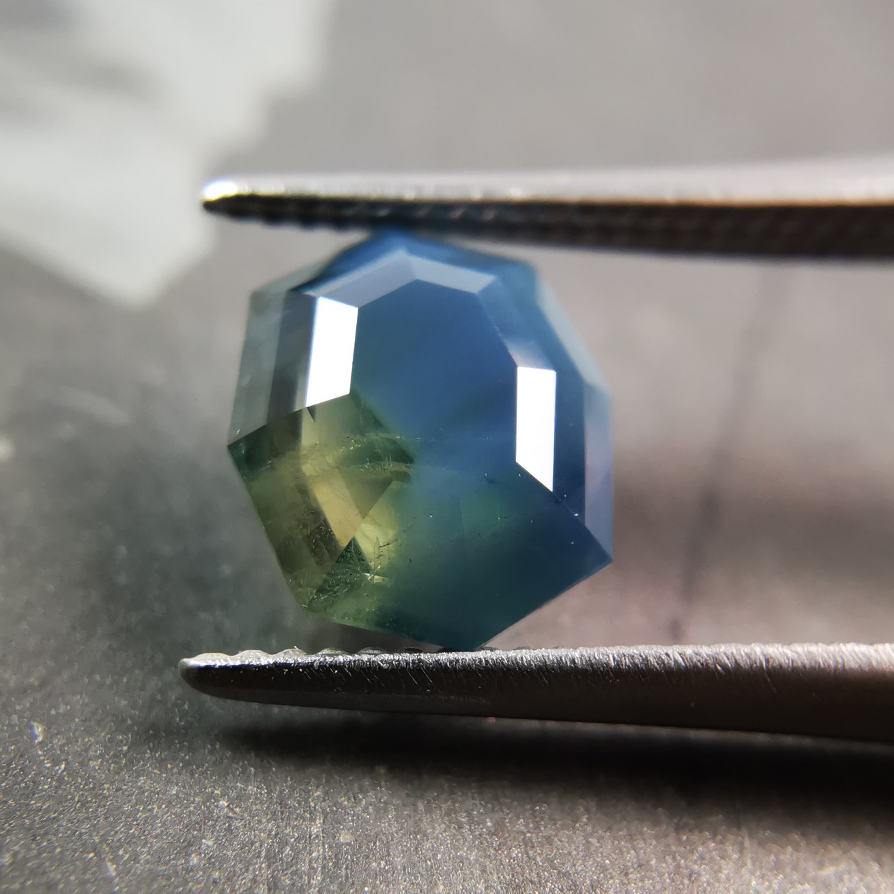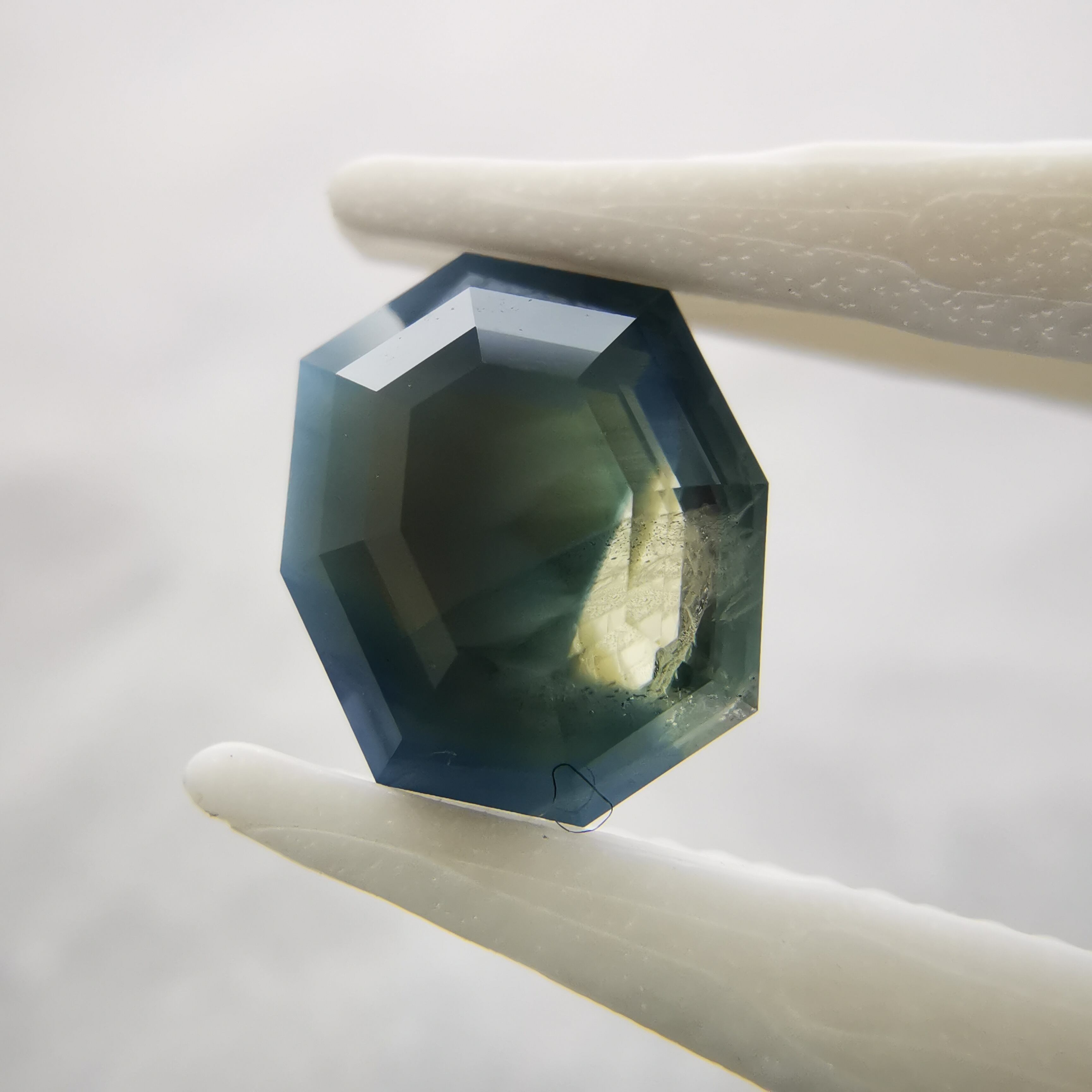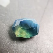 透明なイエローと、不透明な暗い灰みの青/鉄納戸色の、バイカラーサファイアです。