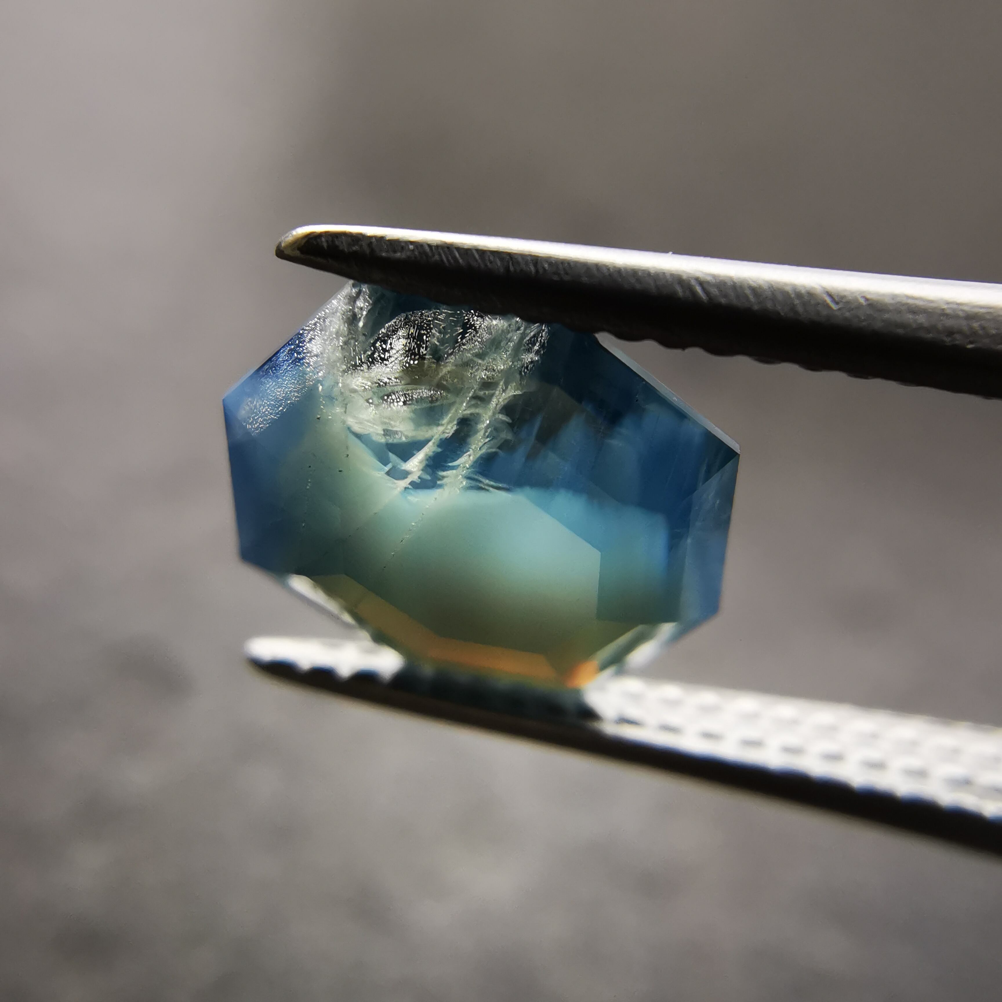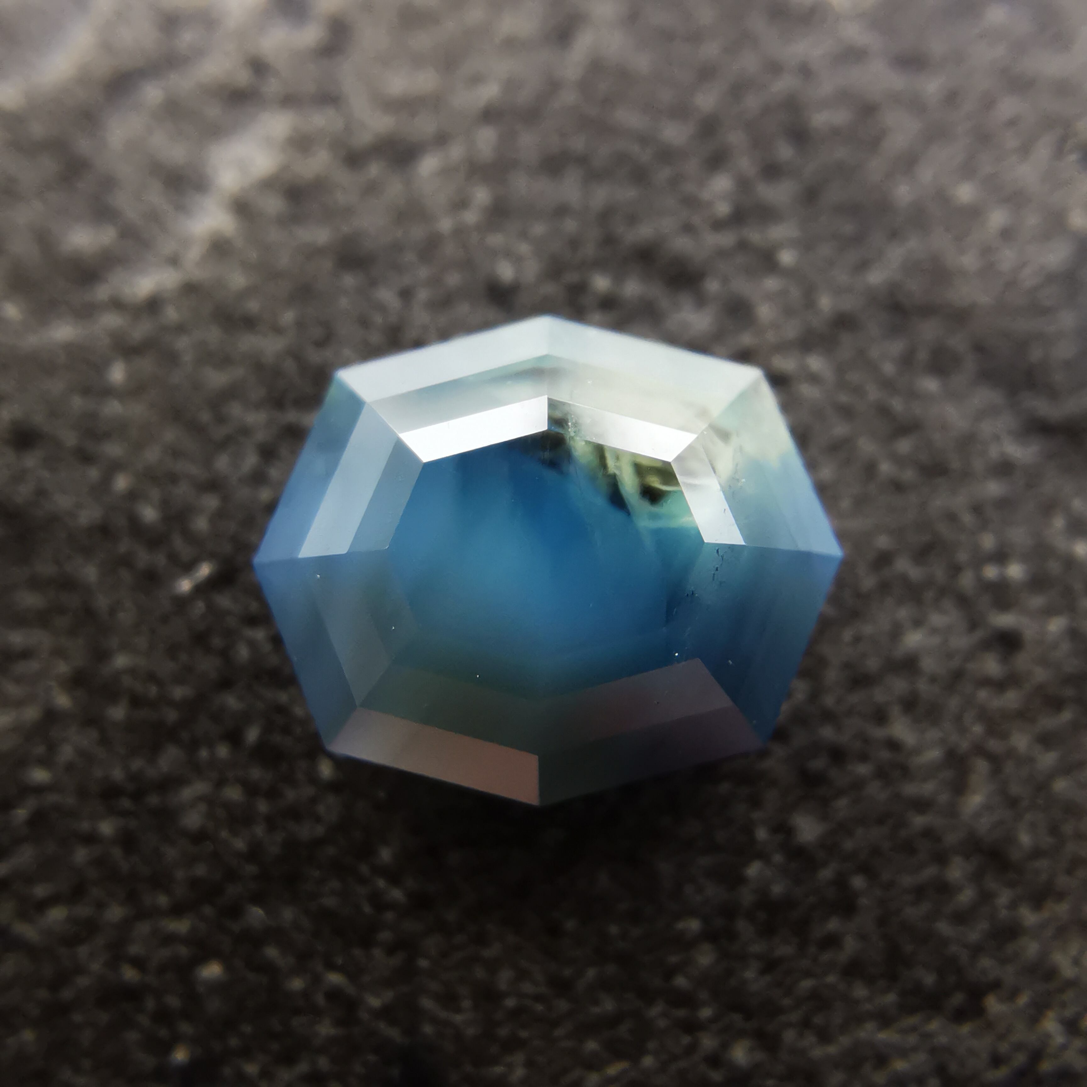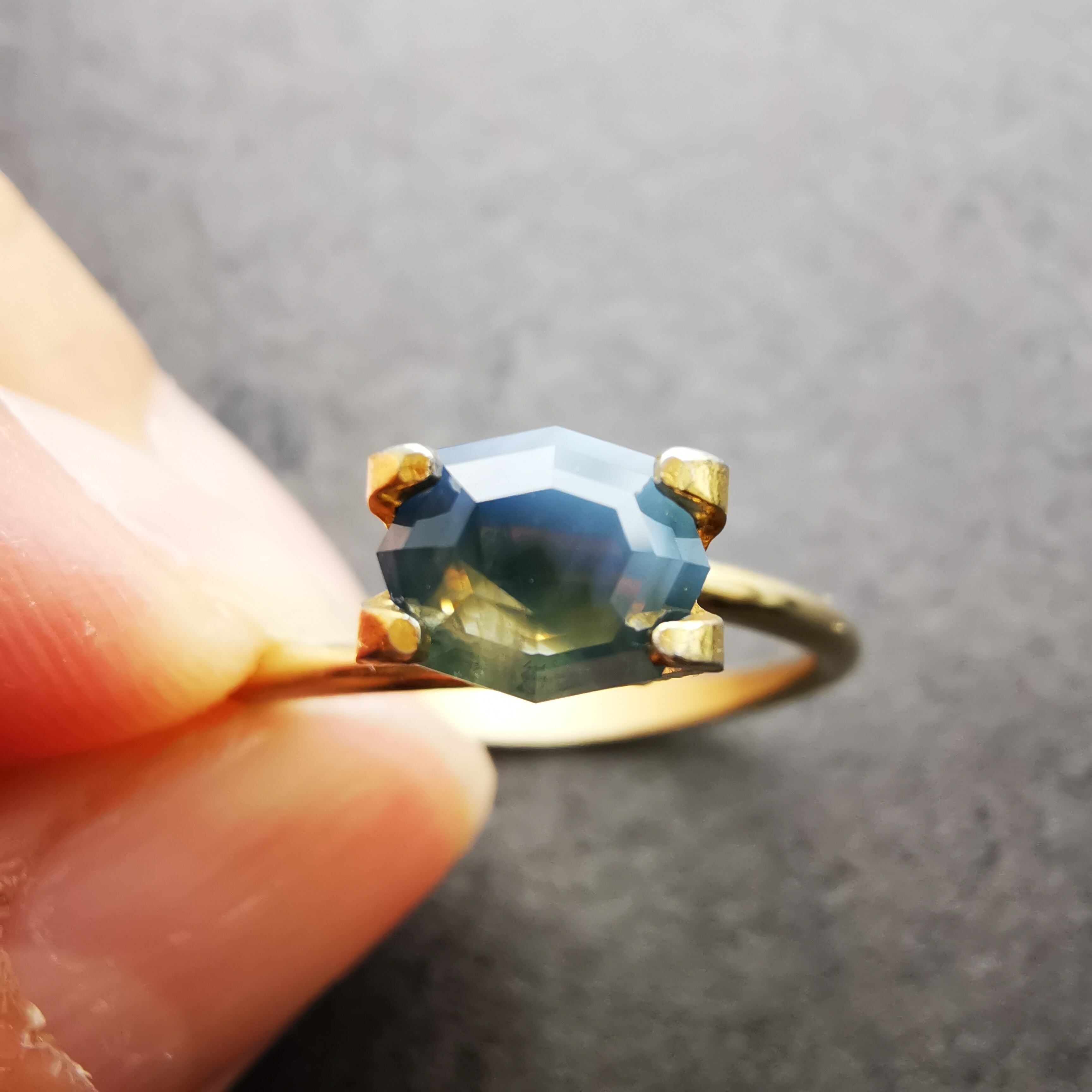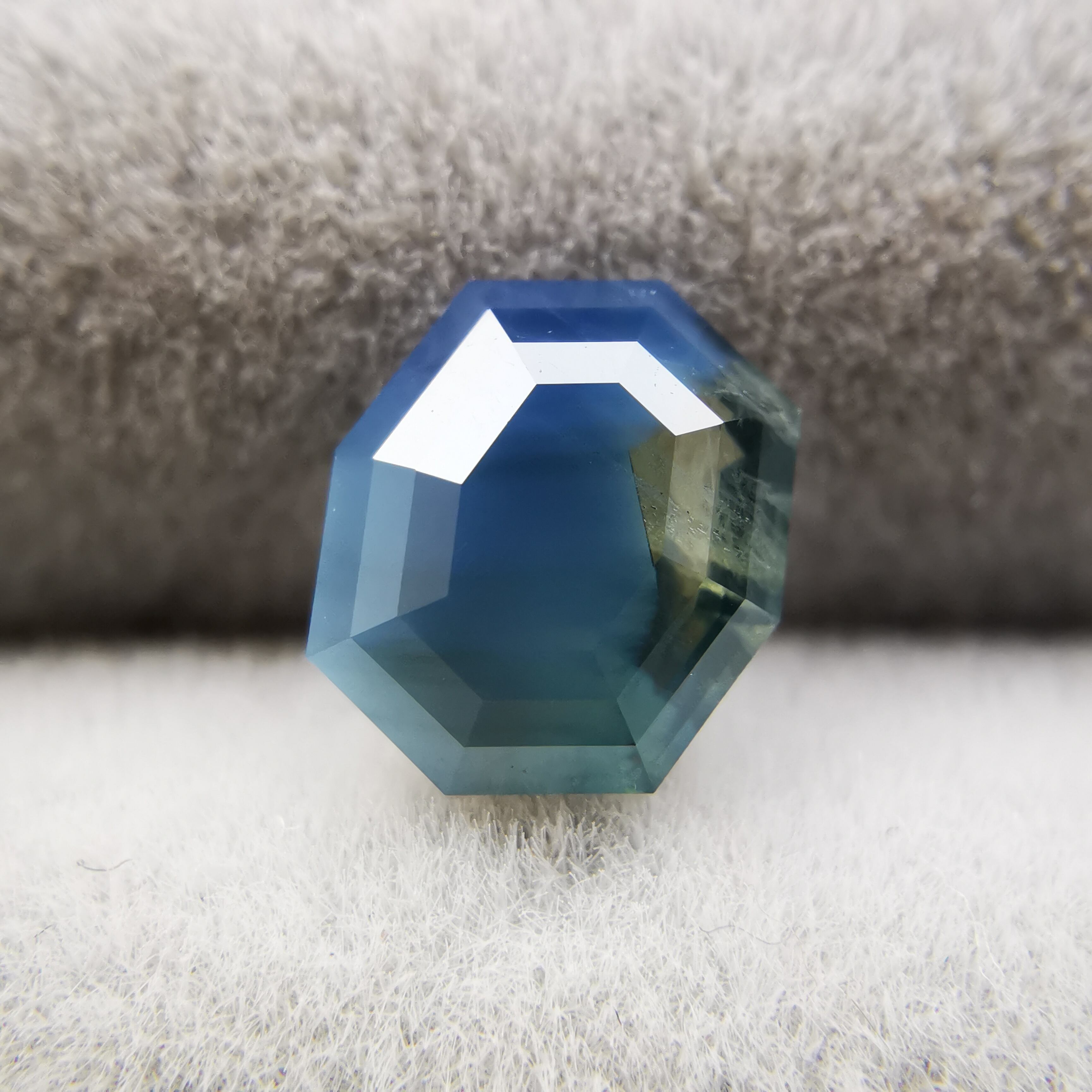 透明なイエローと、不透明な暗い灰みの青/鉄納戸色の、バイカラーサファイアです。