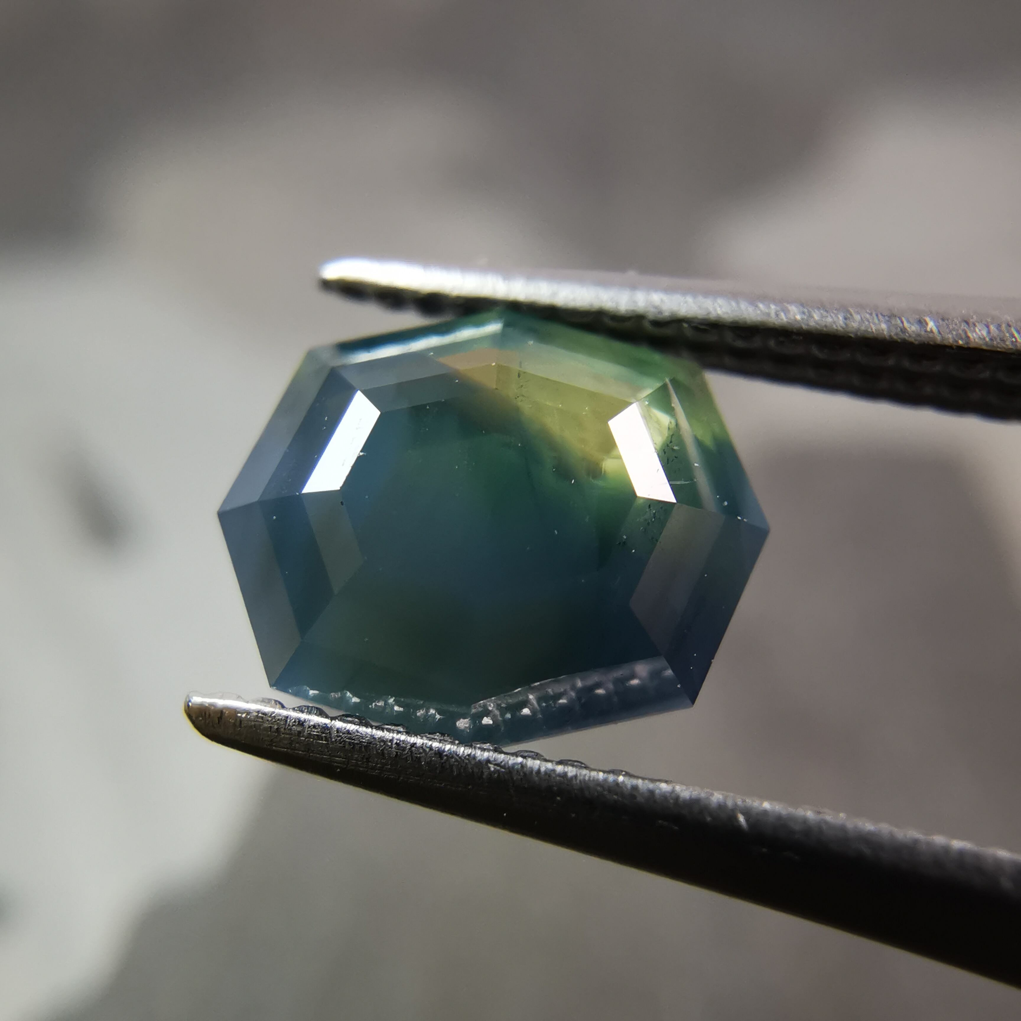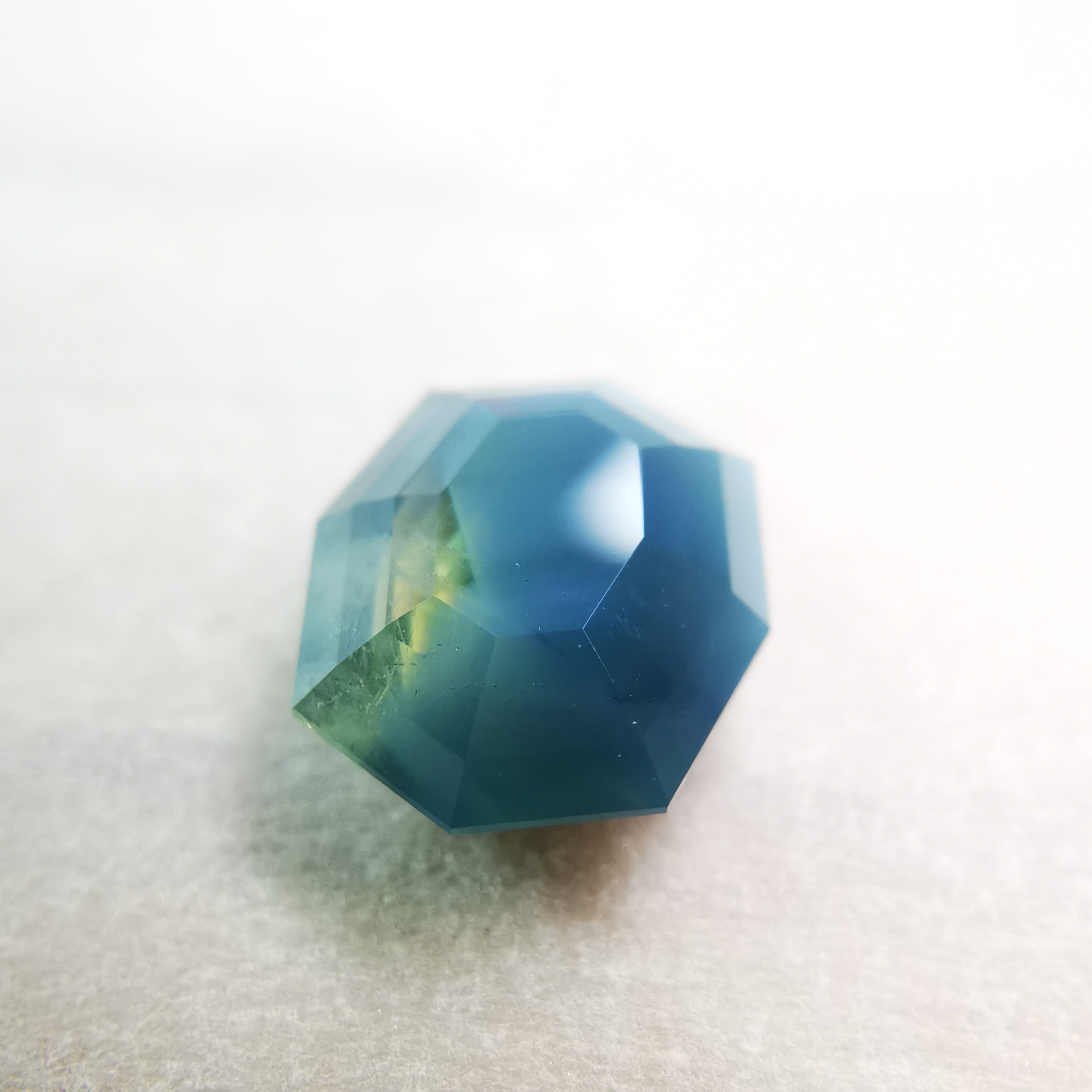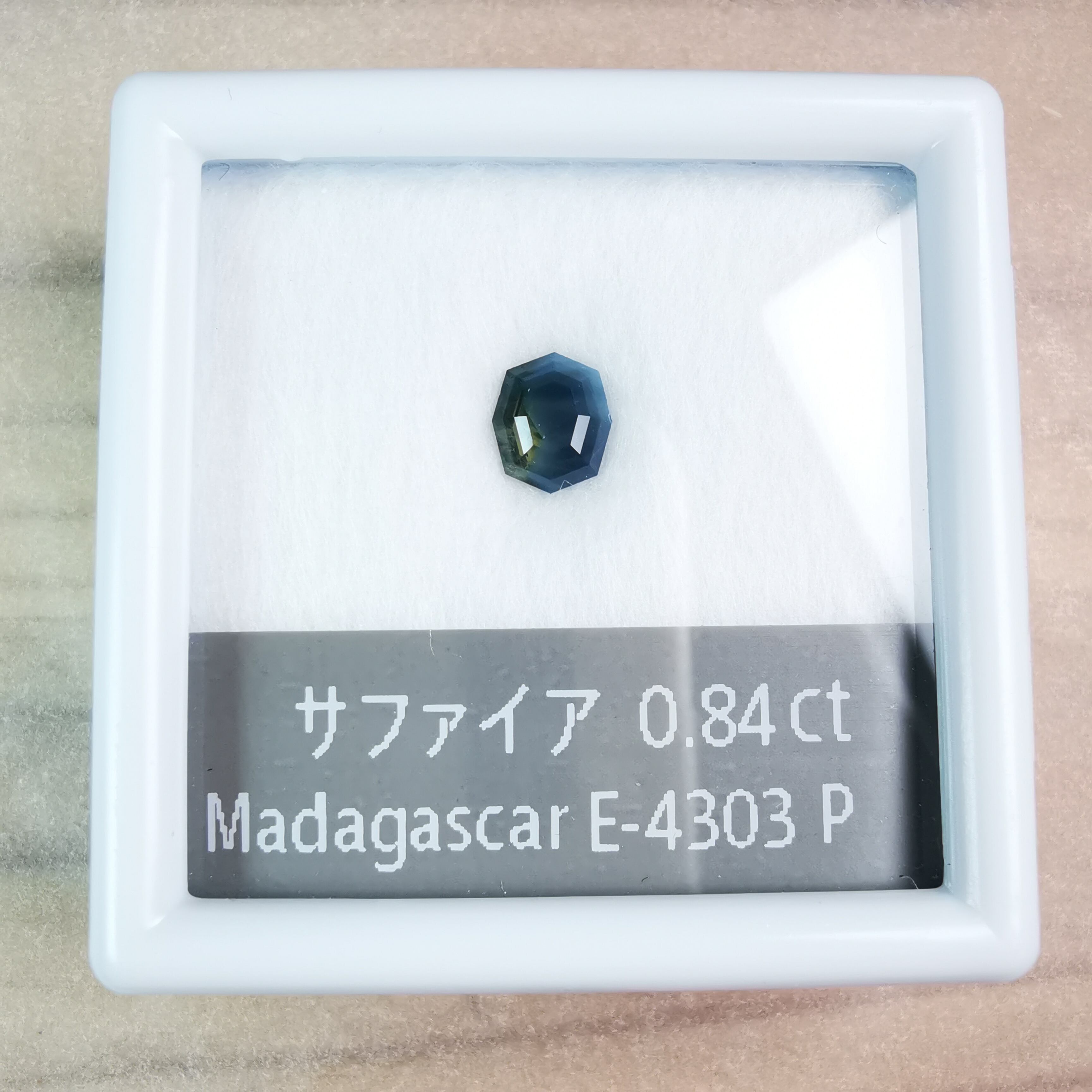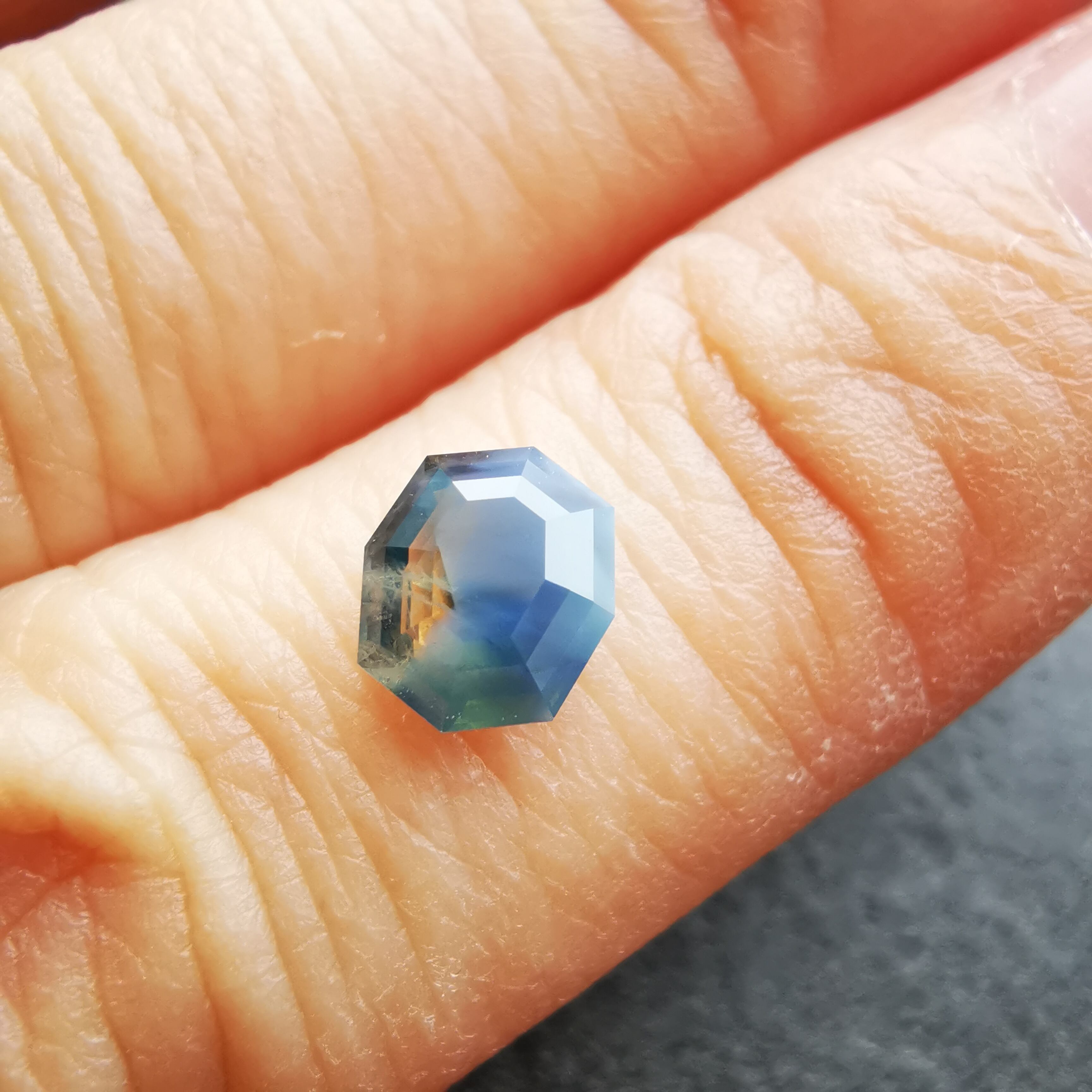 透明なイエローと、不透明な暗い灰みの青/鉄納戸色の、バイカラーサファイアです。