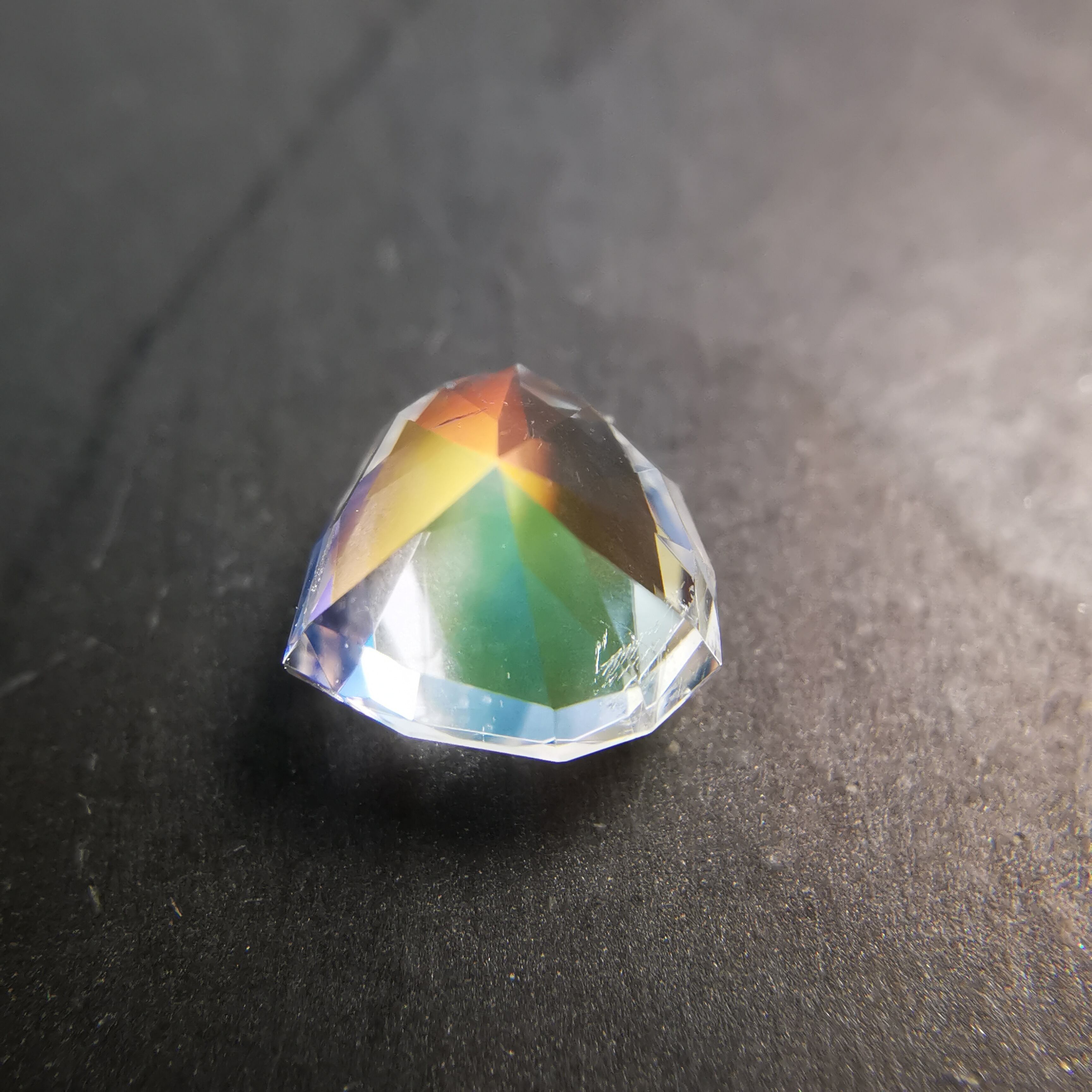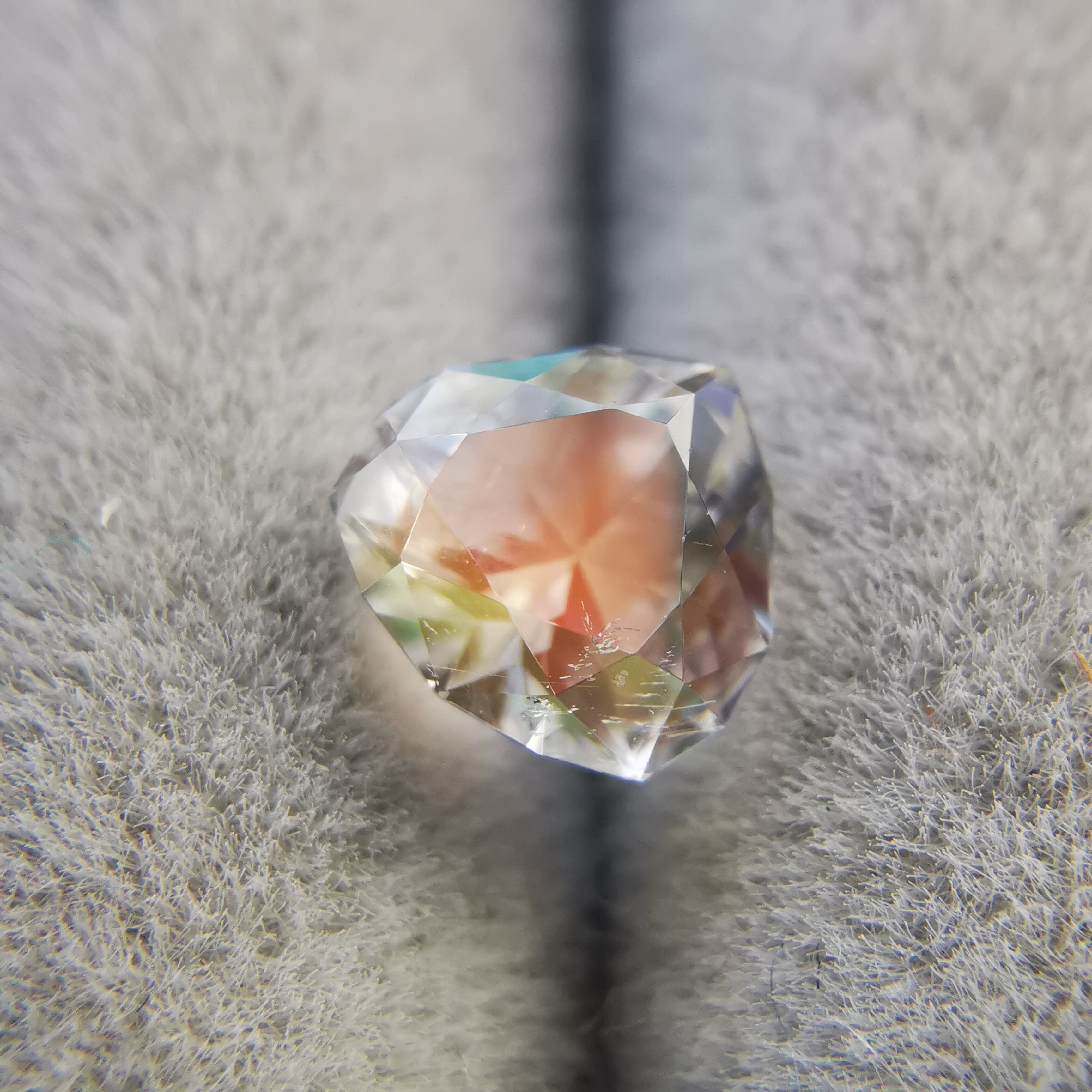 テーブル面はオレンジ系シラー、クラウンはブルーやグリーン系シラーが見えるレインボームーンストーンです。
