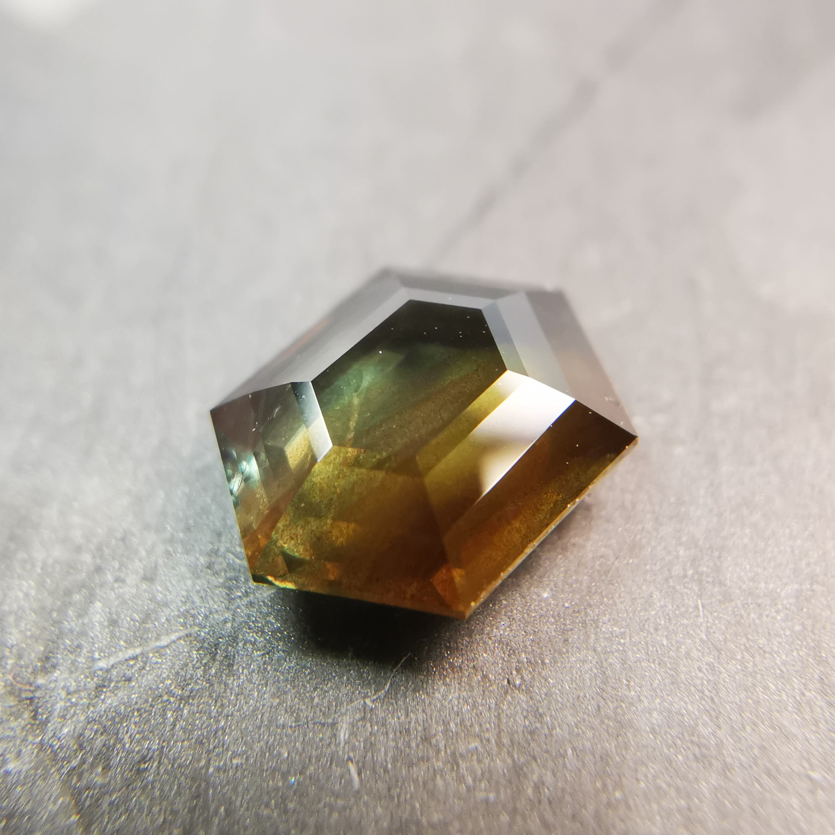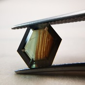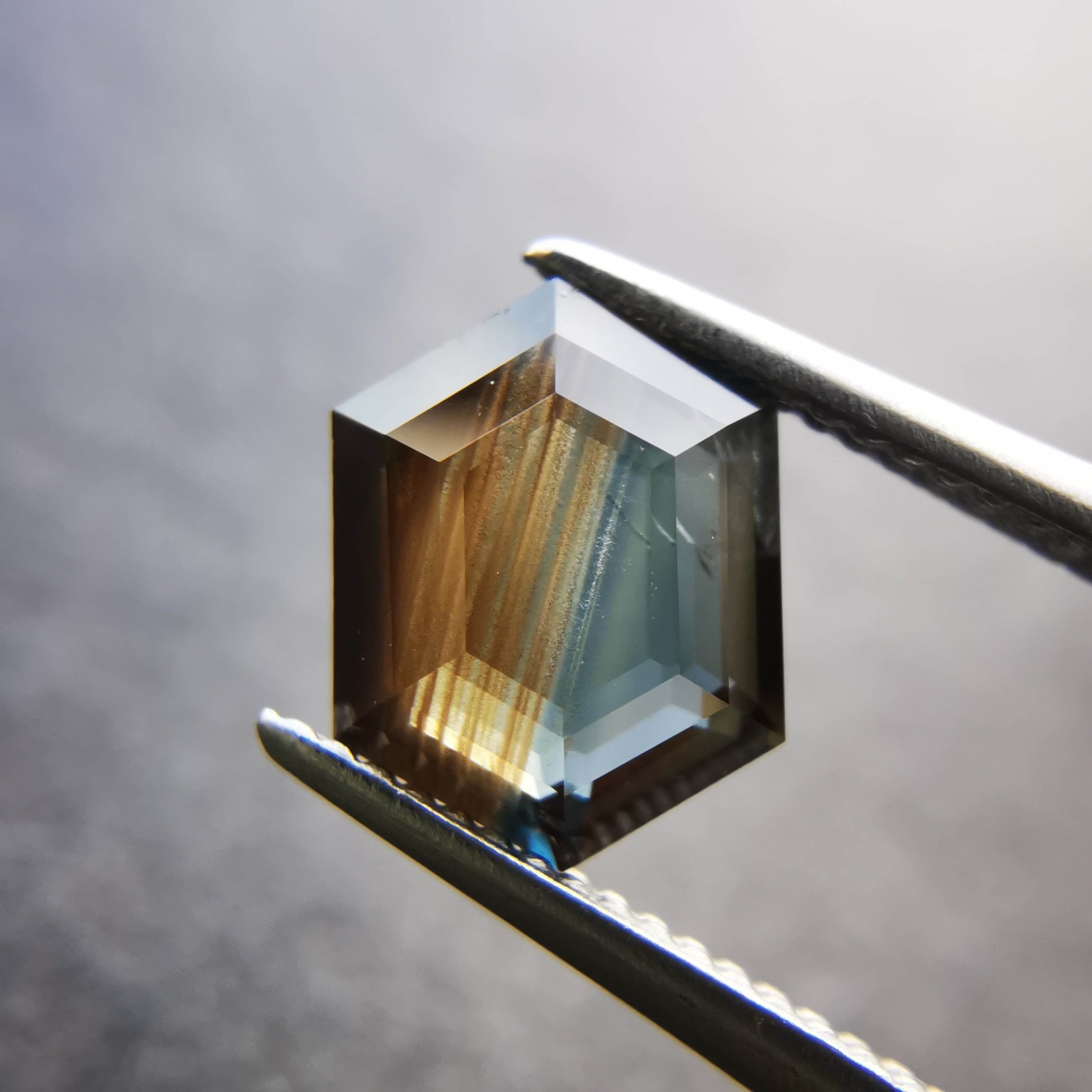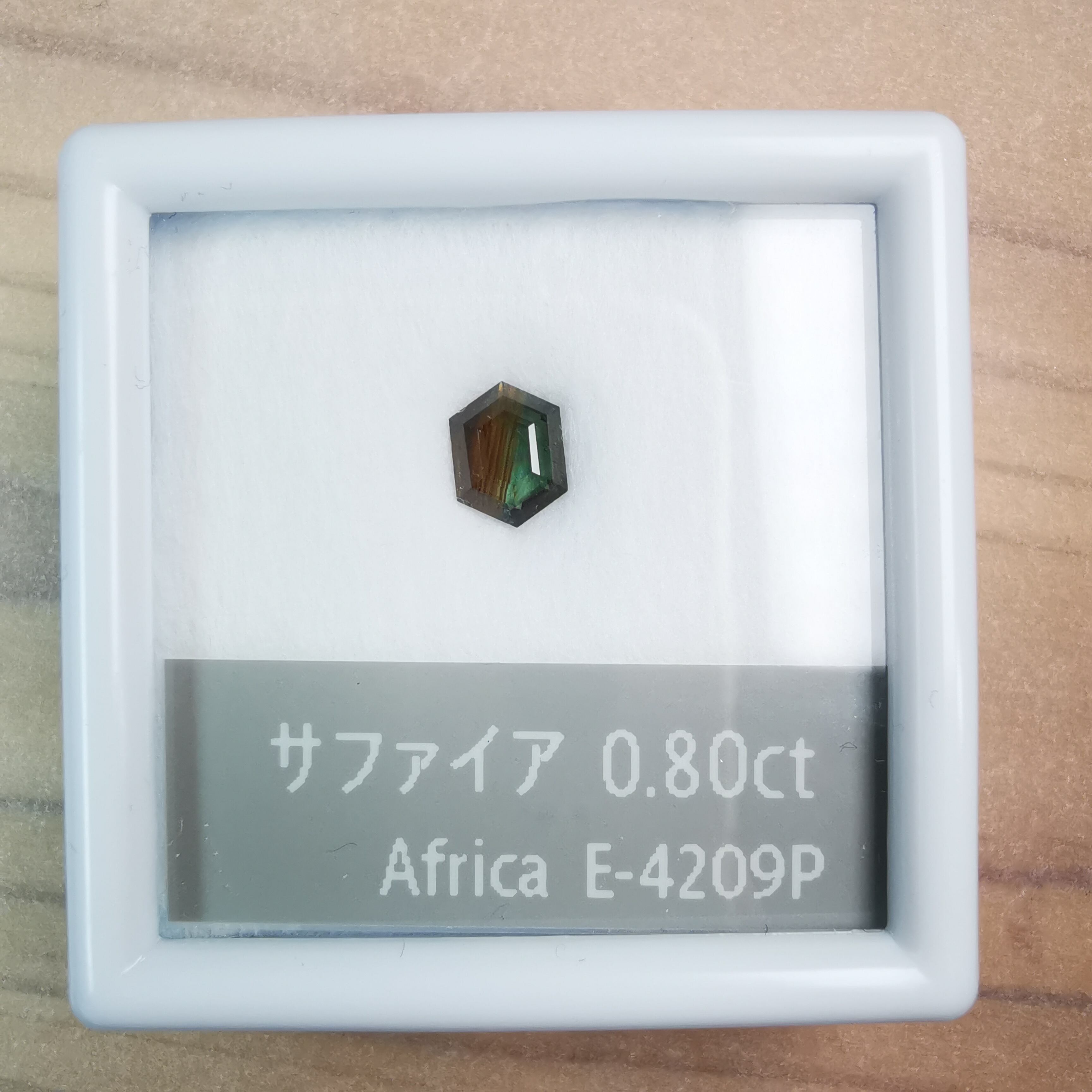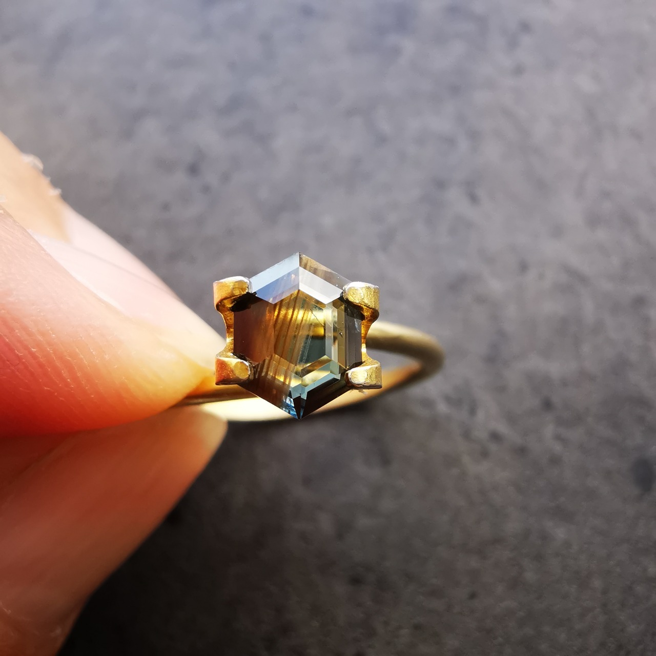 金色のシラーが入った、くすんだ緑みの青/錆納戸色のサファイアです。
