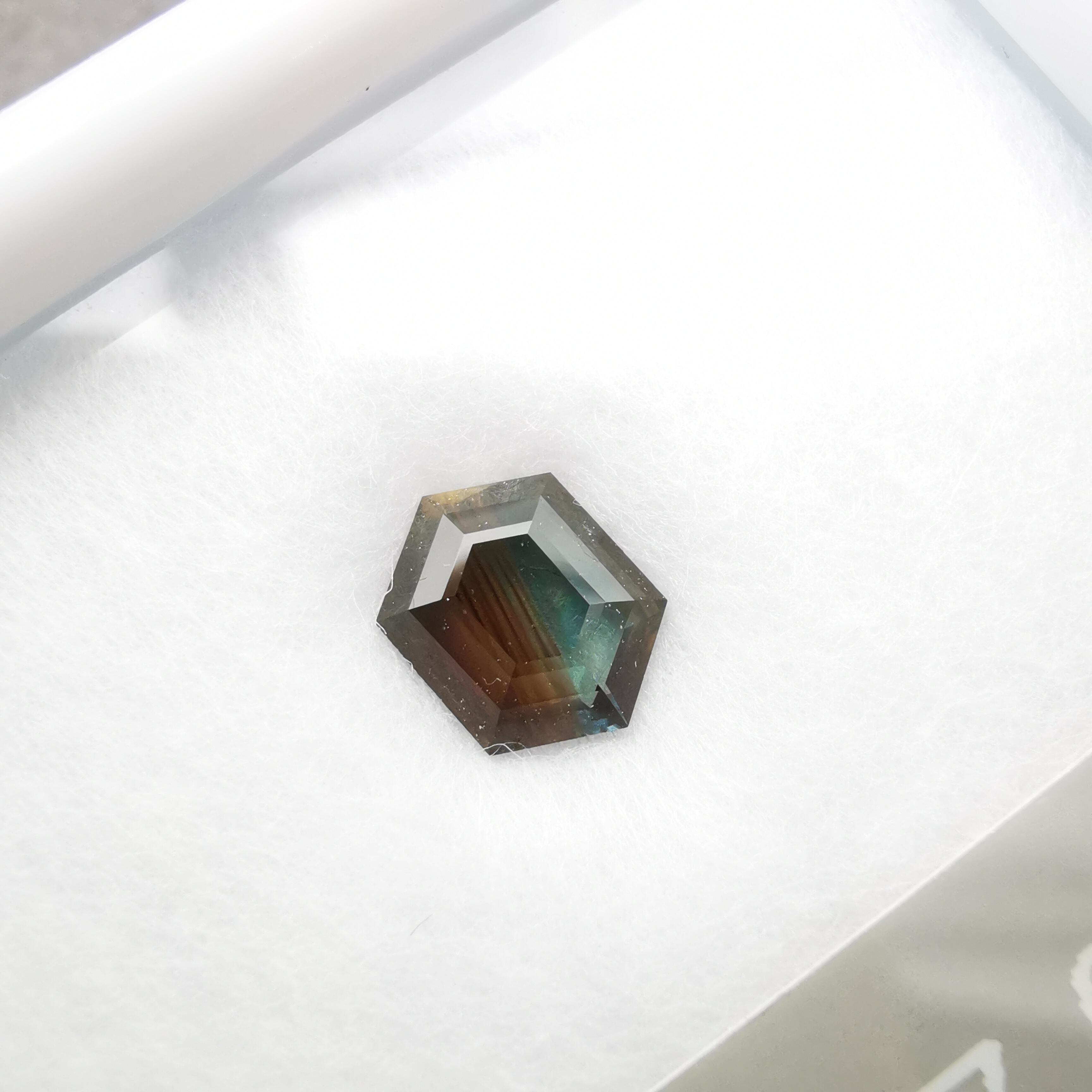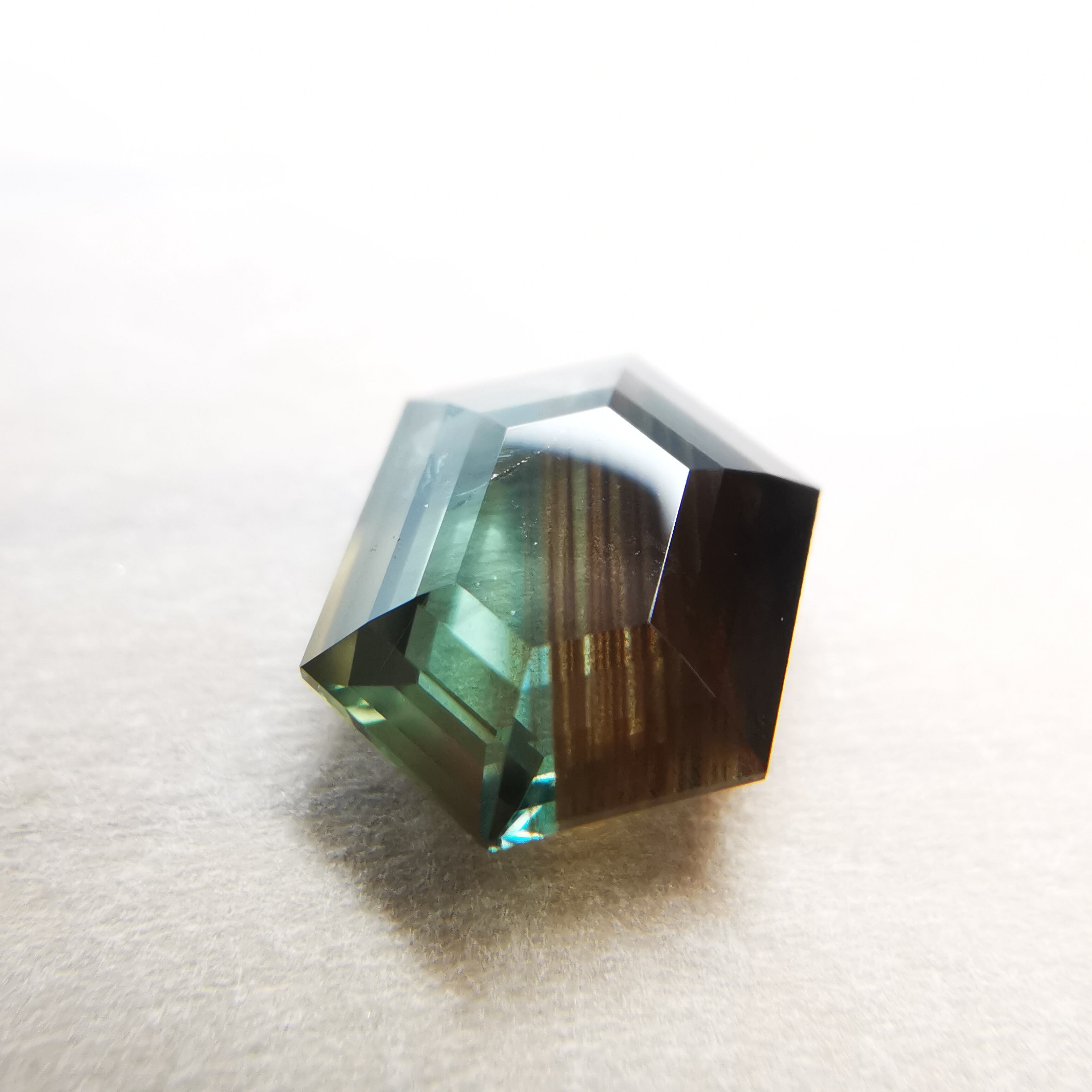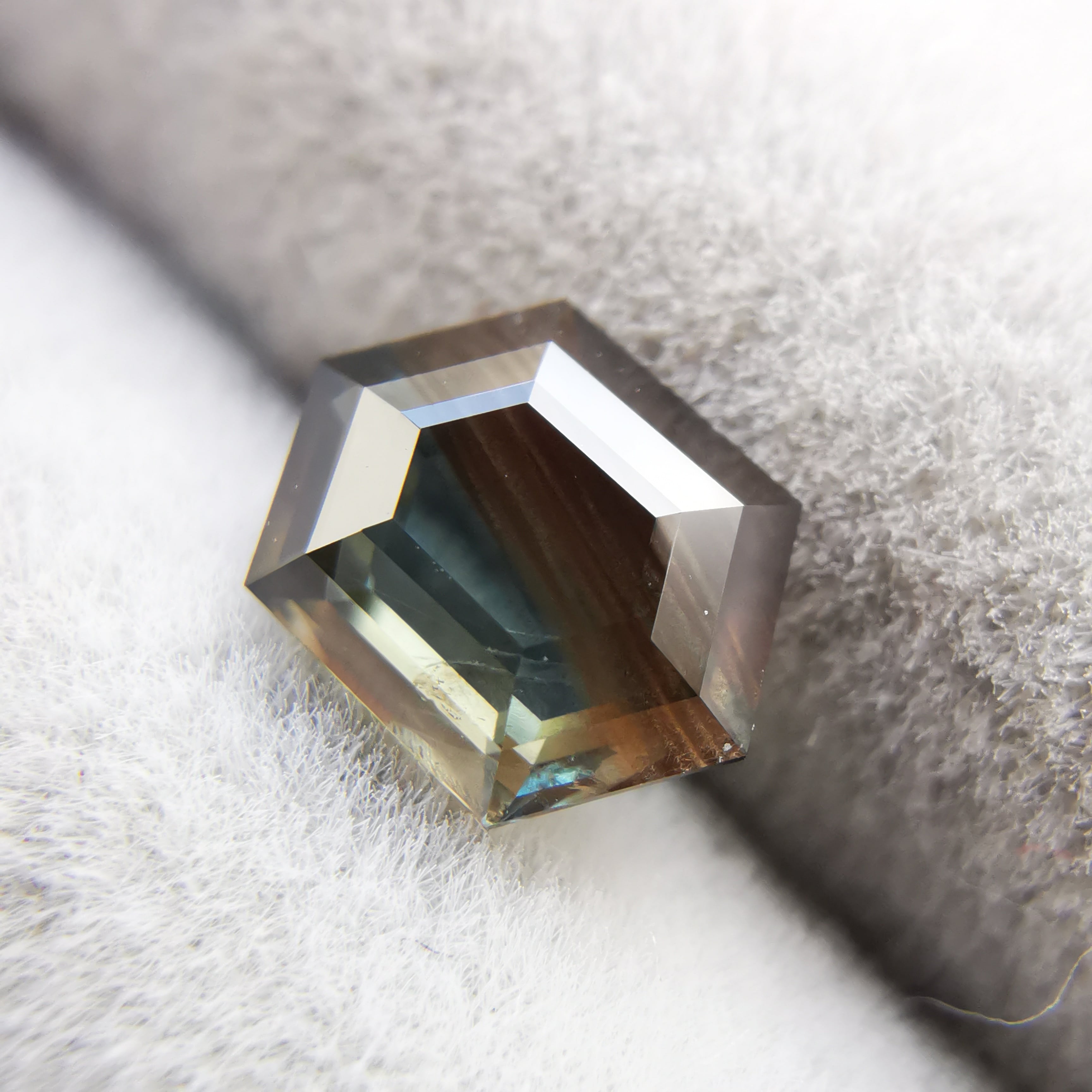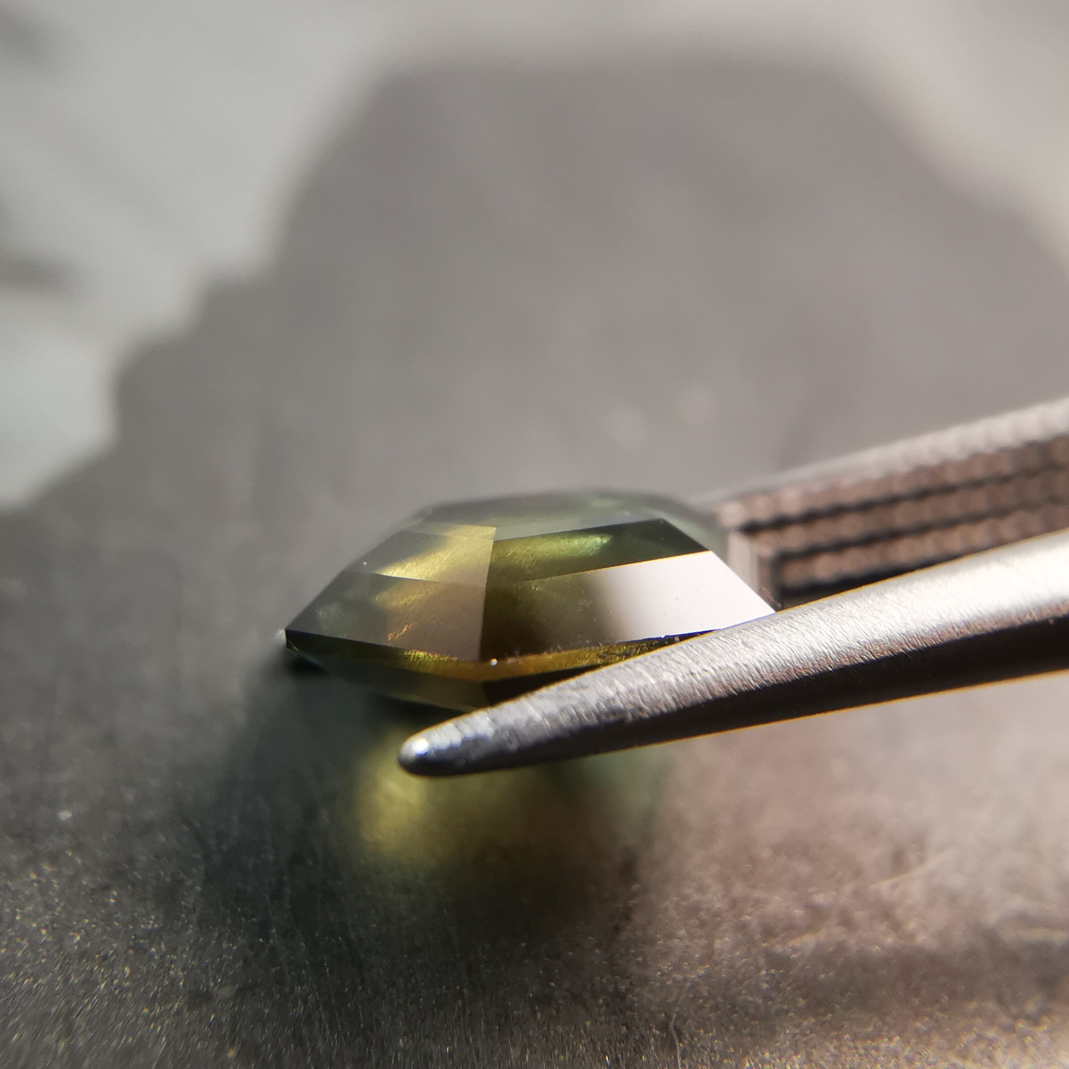 金色のシラーが入った、くすんだ緑みの青/錆納戸色のサファイアです。