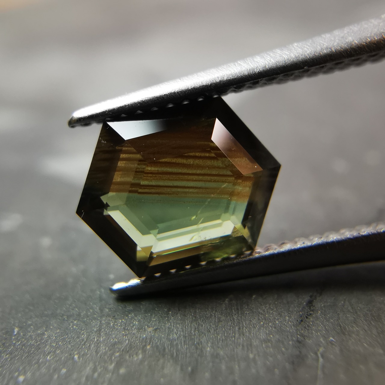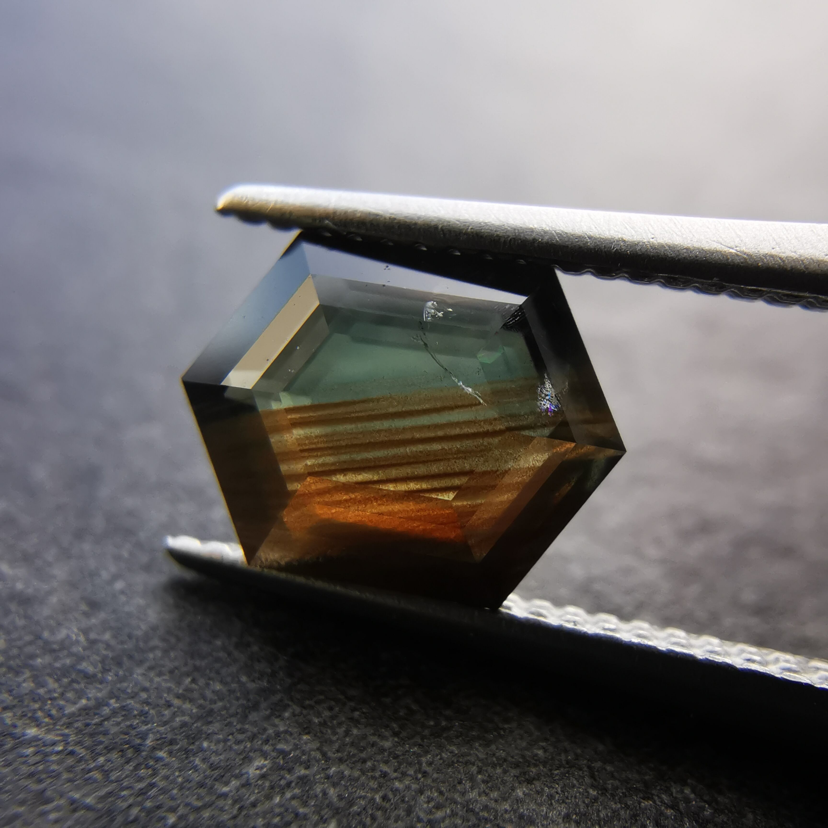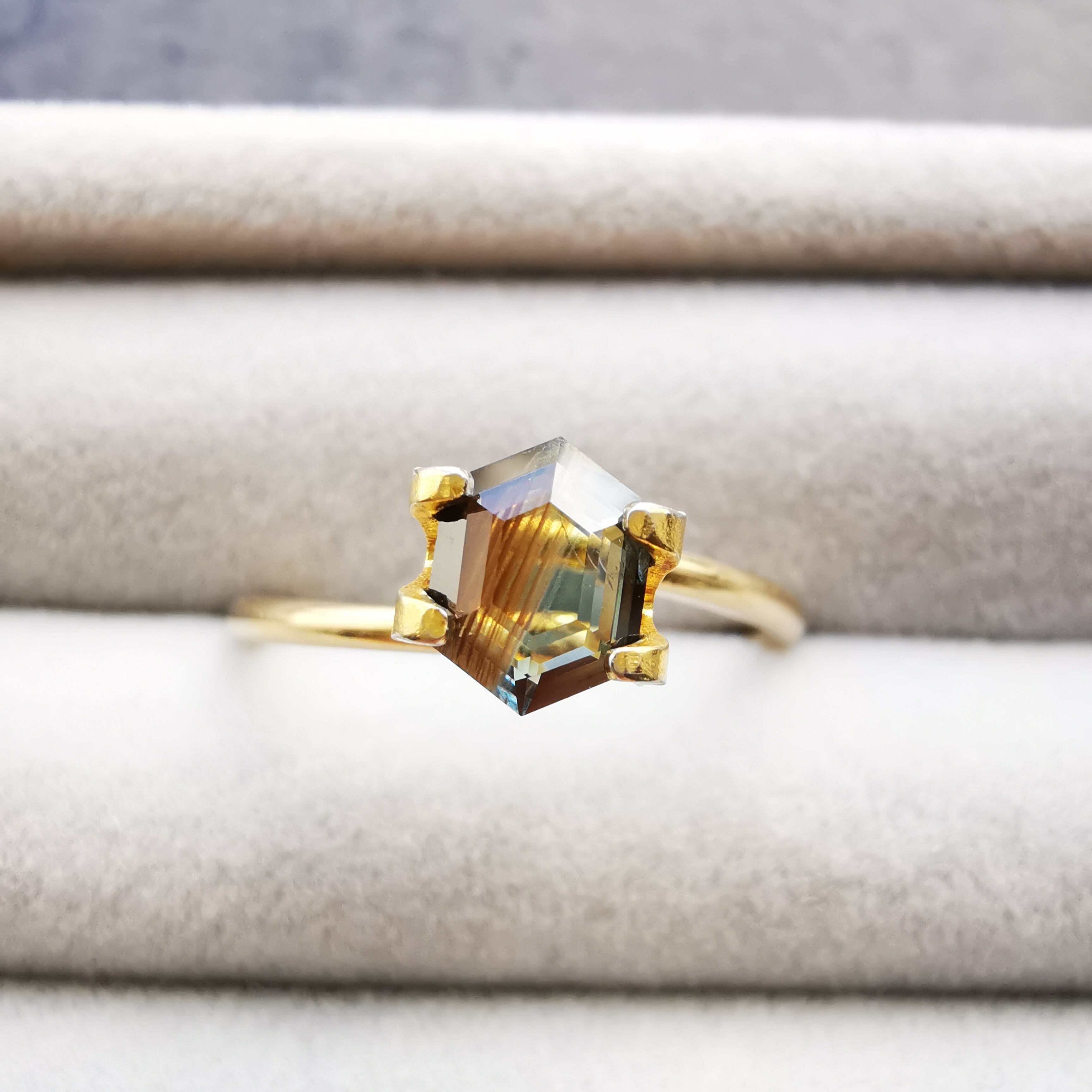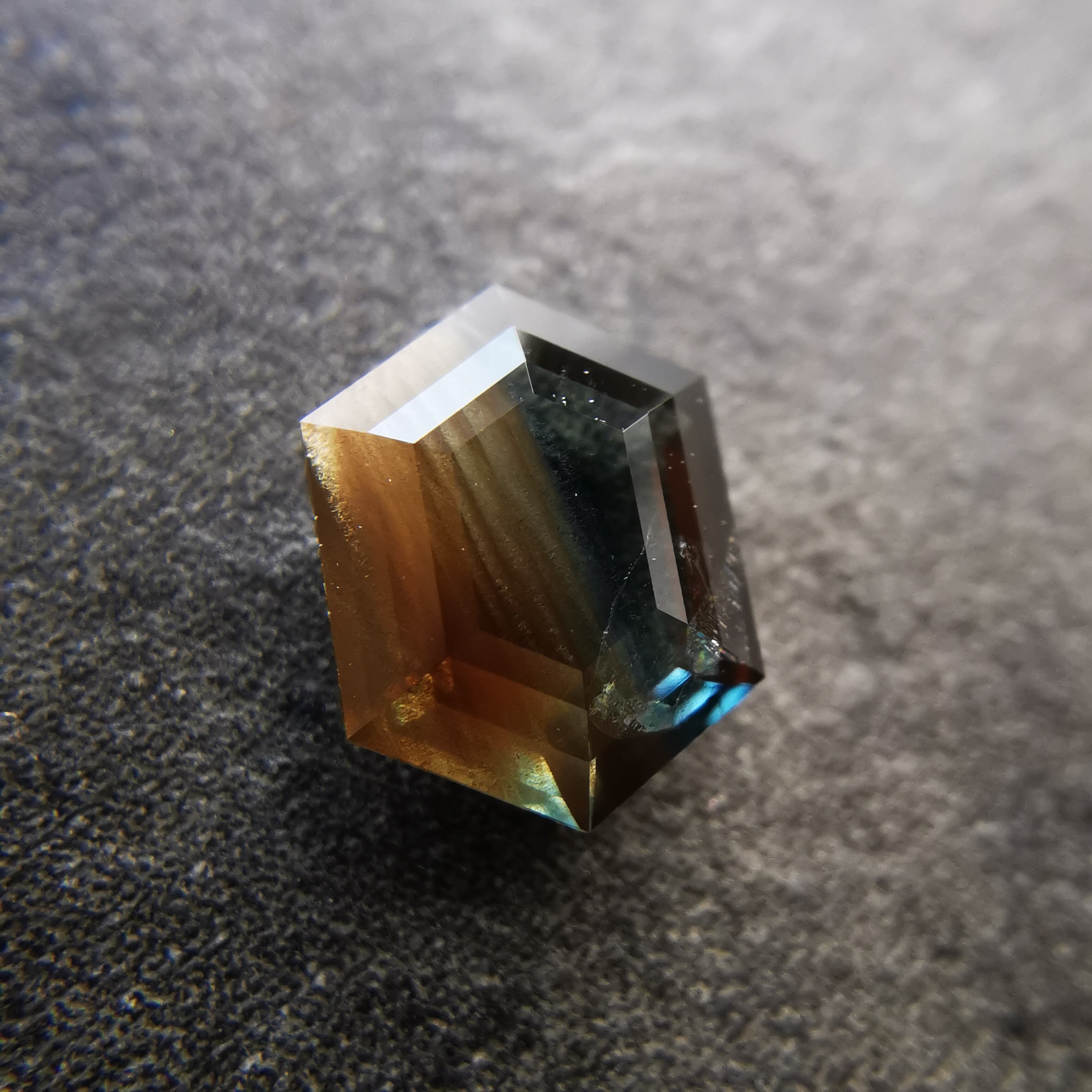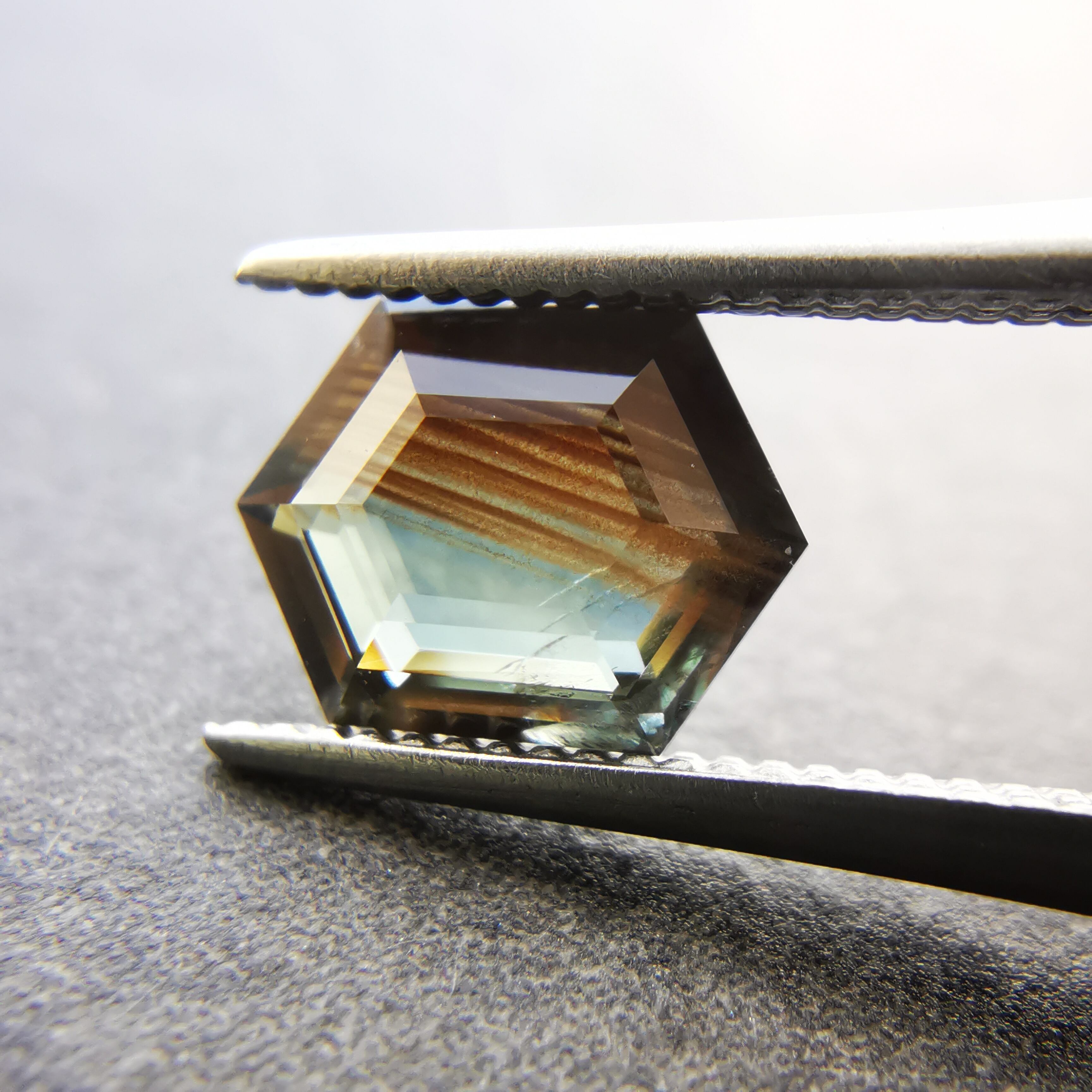 金色のシラーが入った、くすんだ緑みの青/錆納戸色のサファイアです。