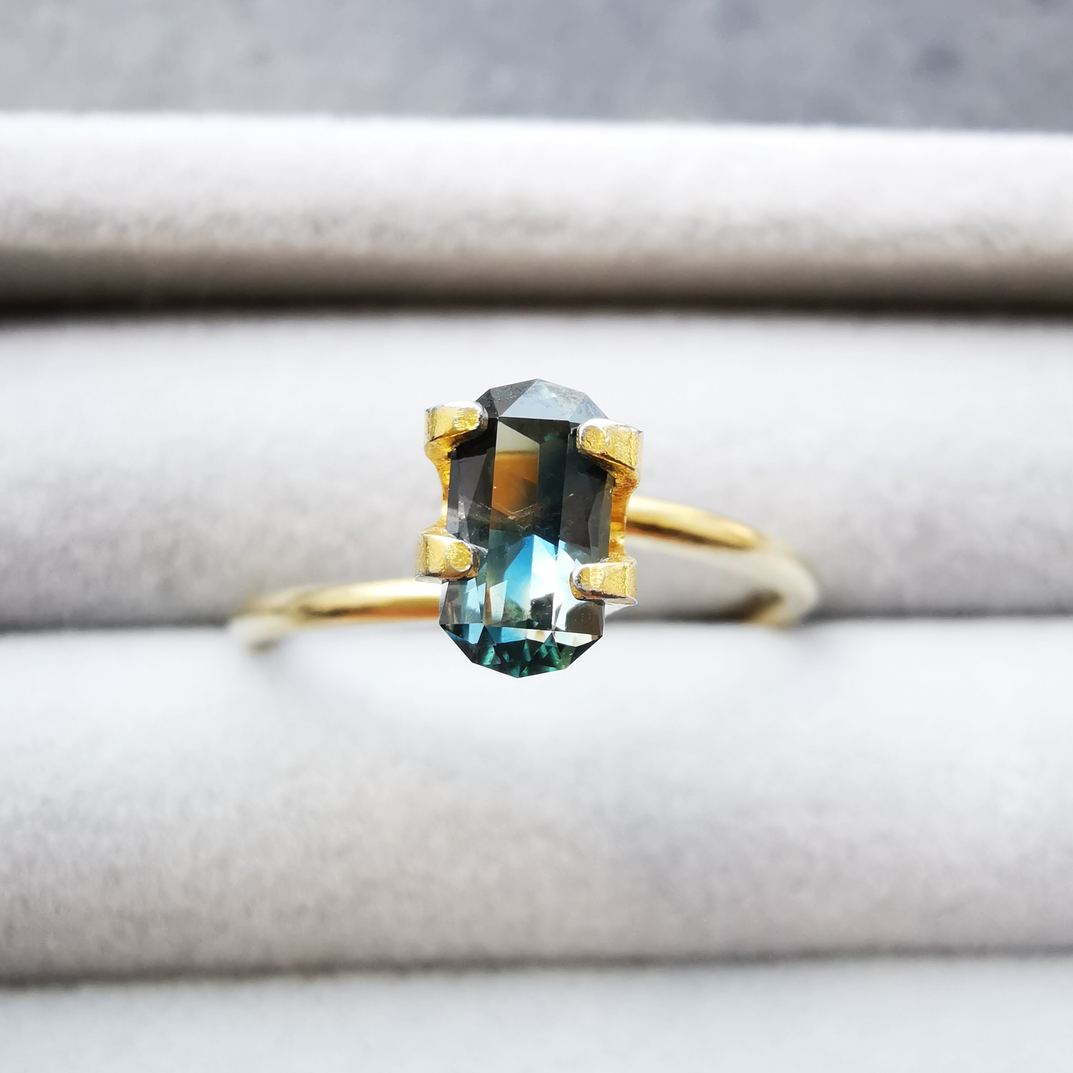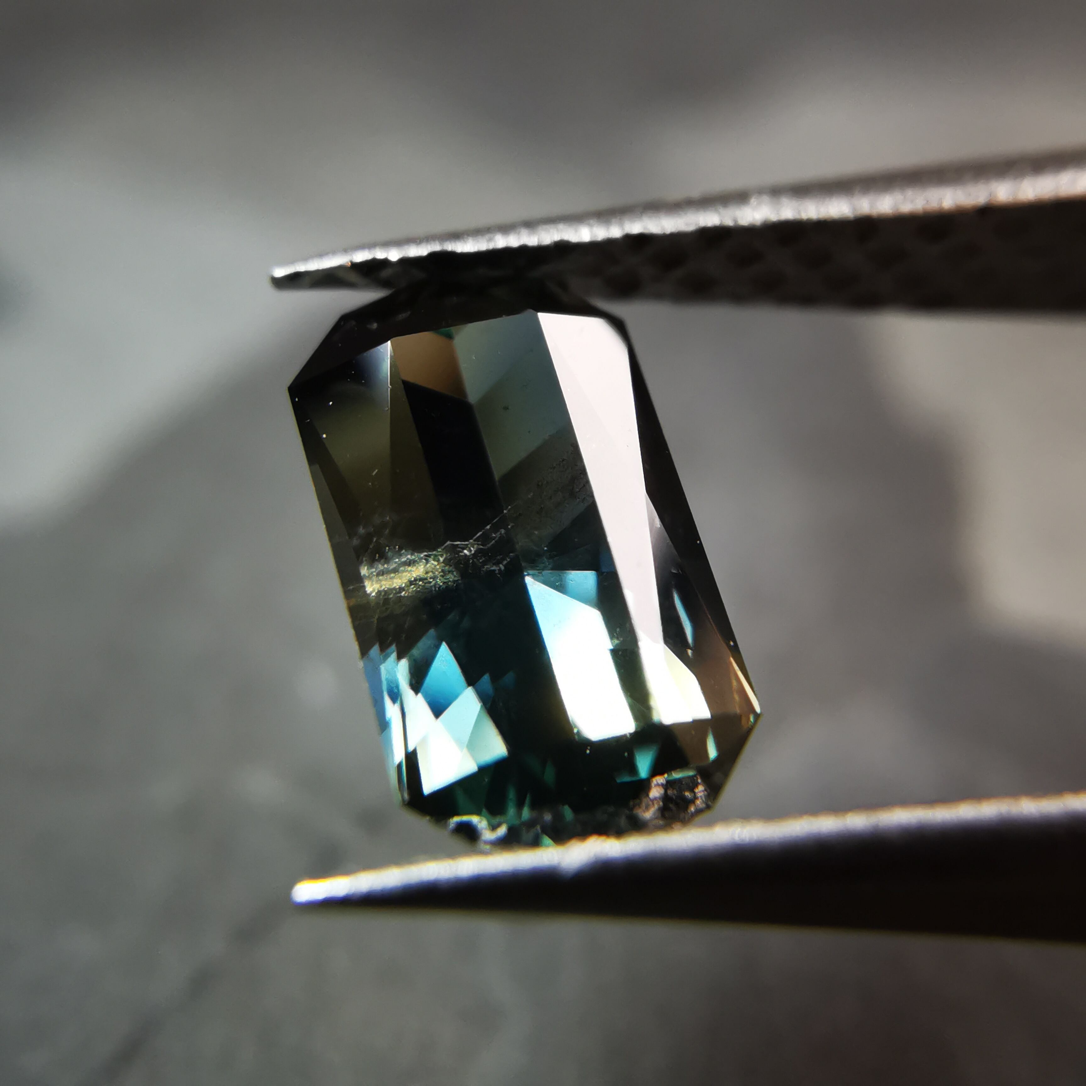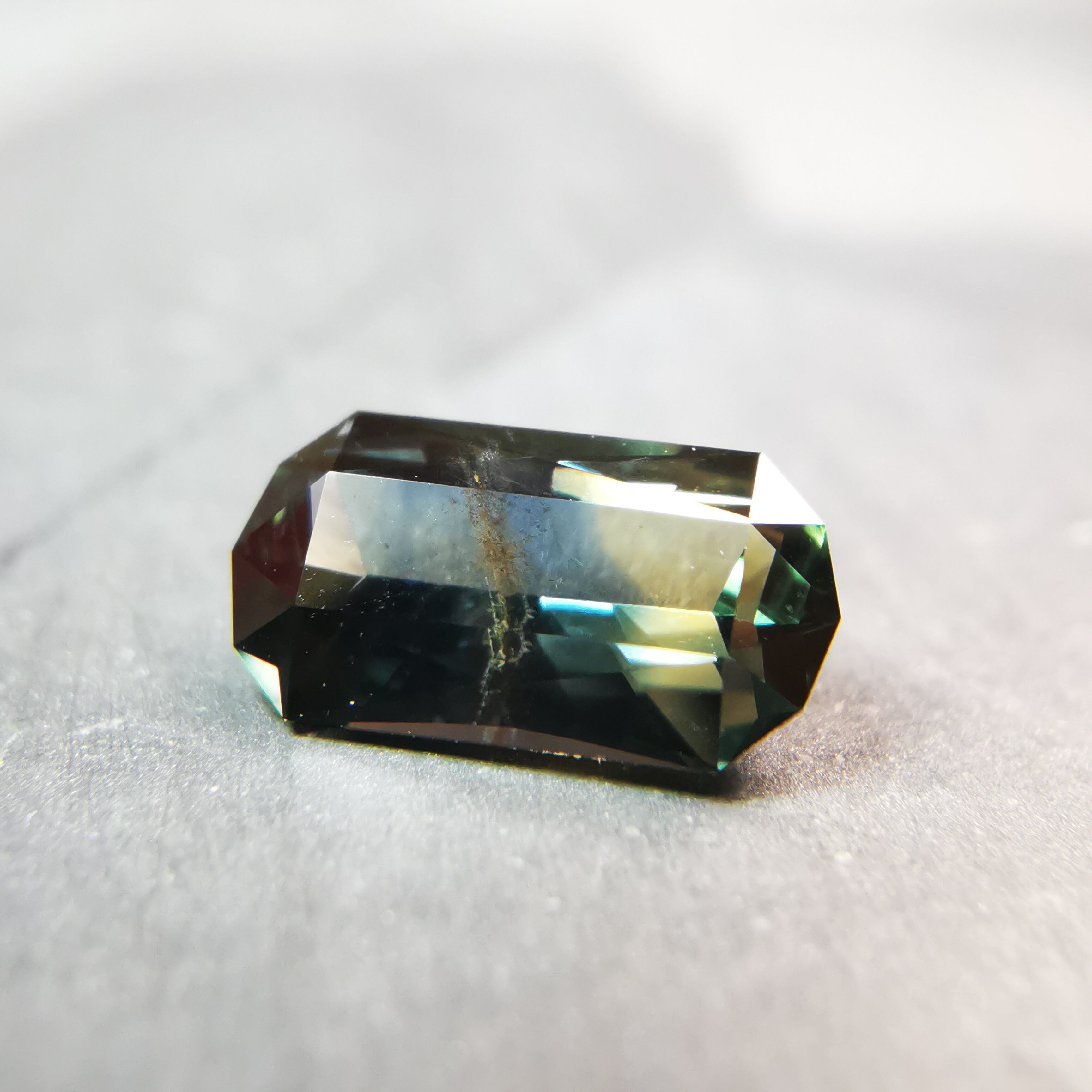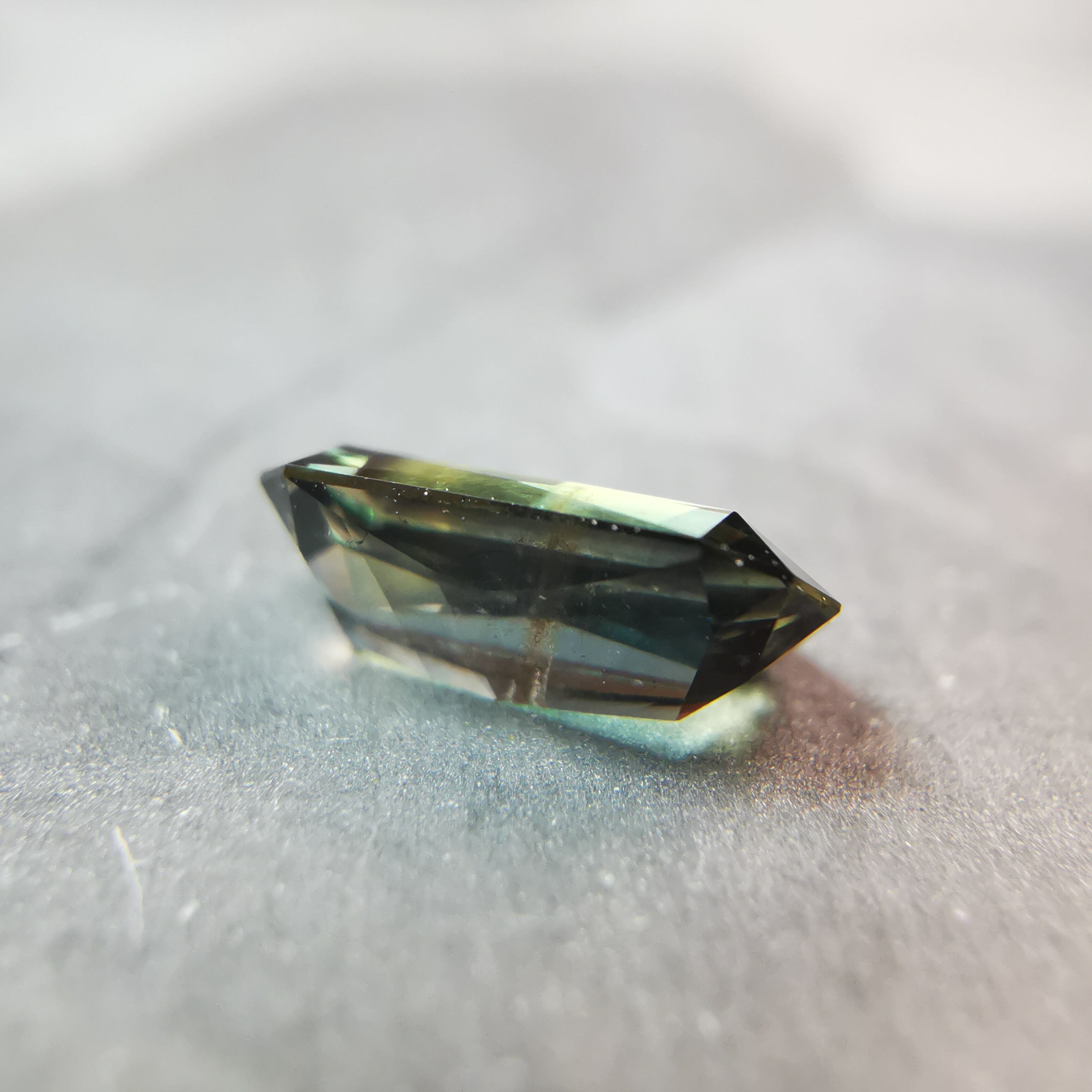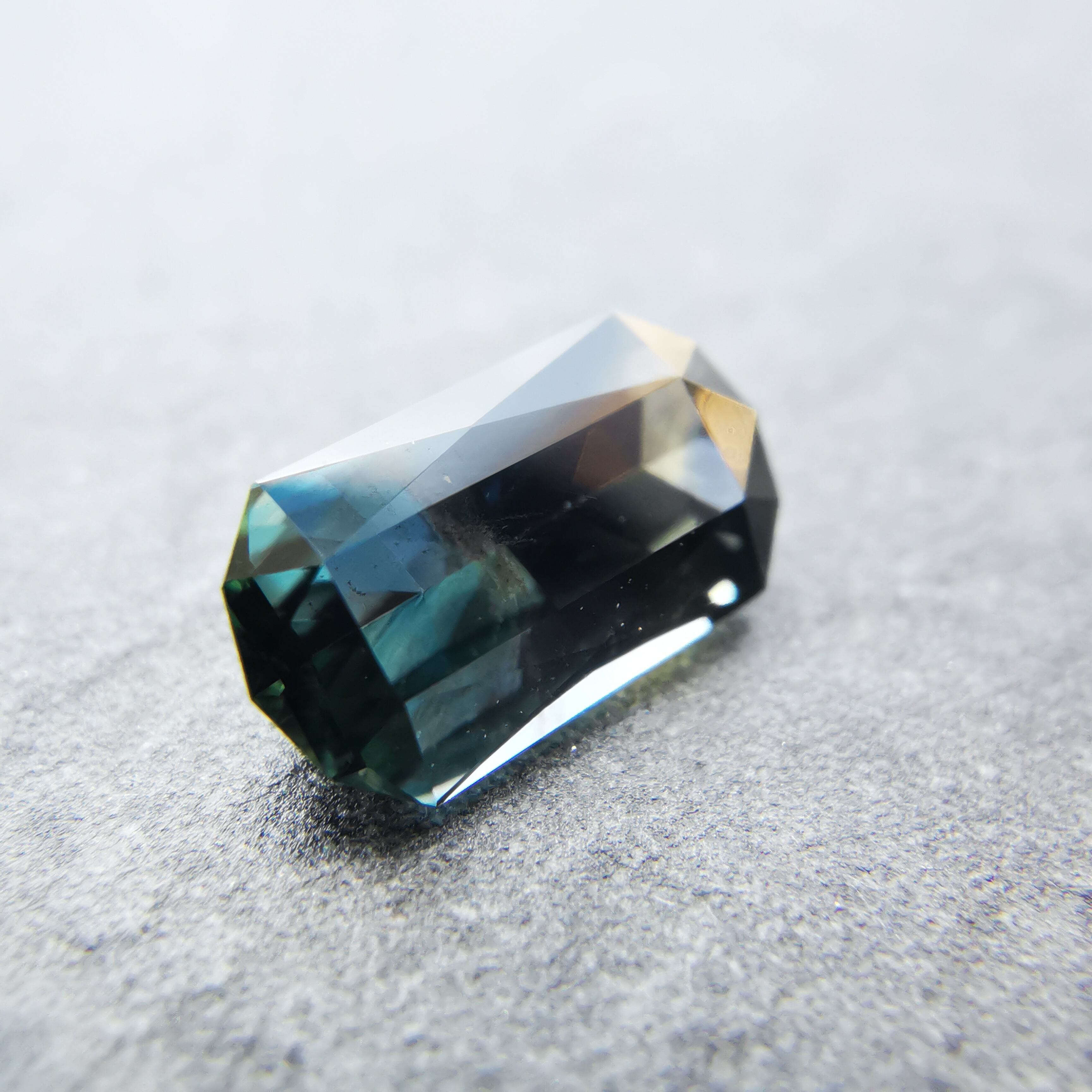 取り出して傾けると、ごく暗い緑みの青/鉄色と淡いイエローのバイカラーであることに気が付きます。