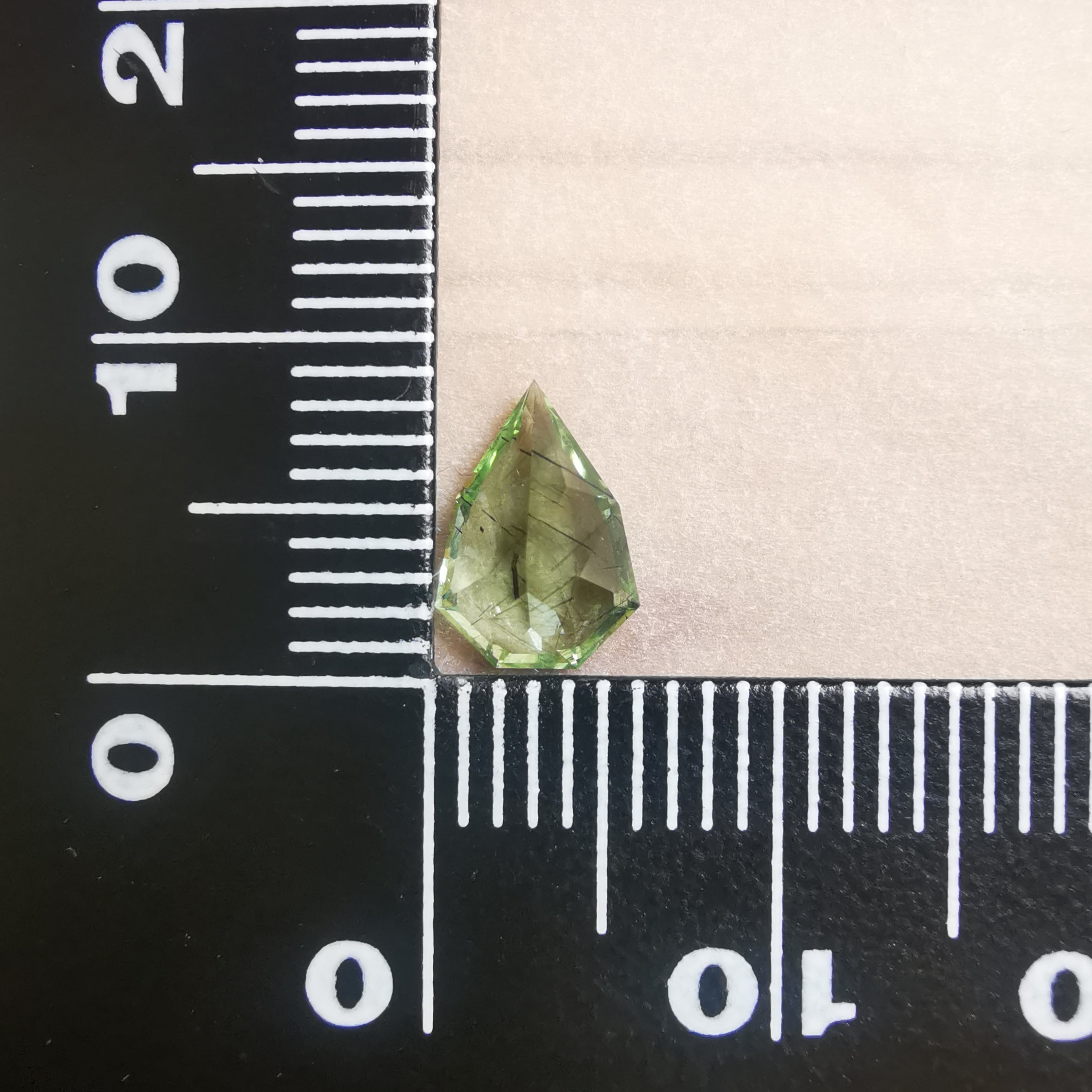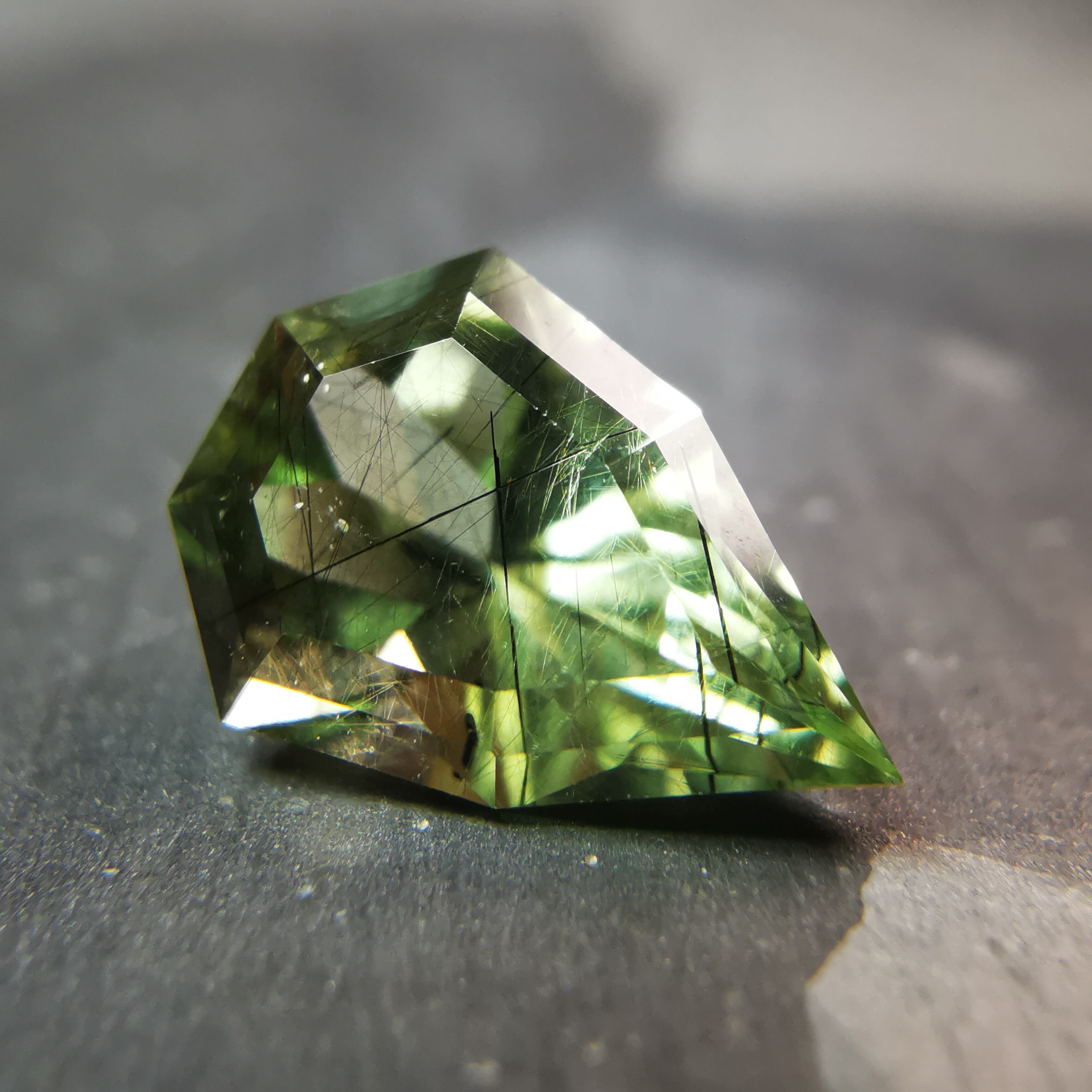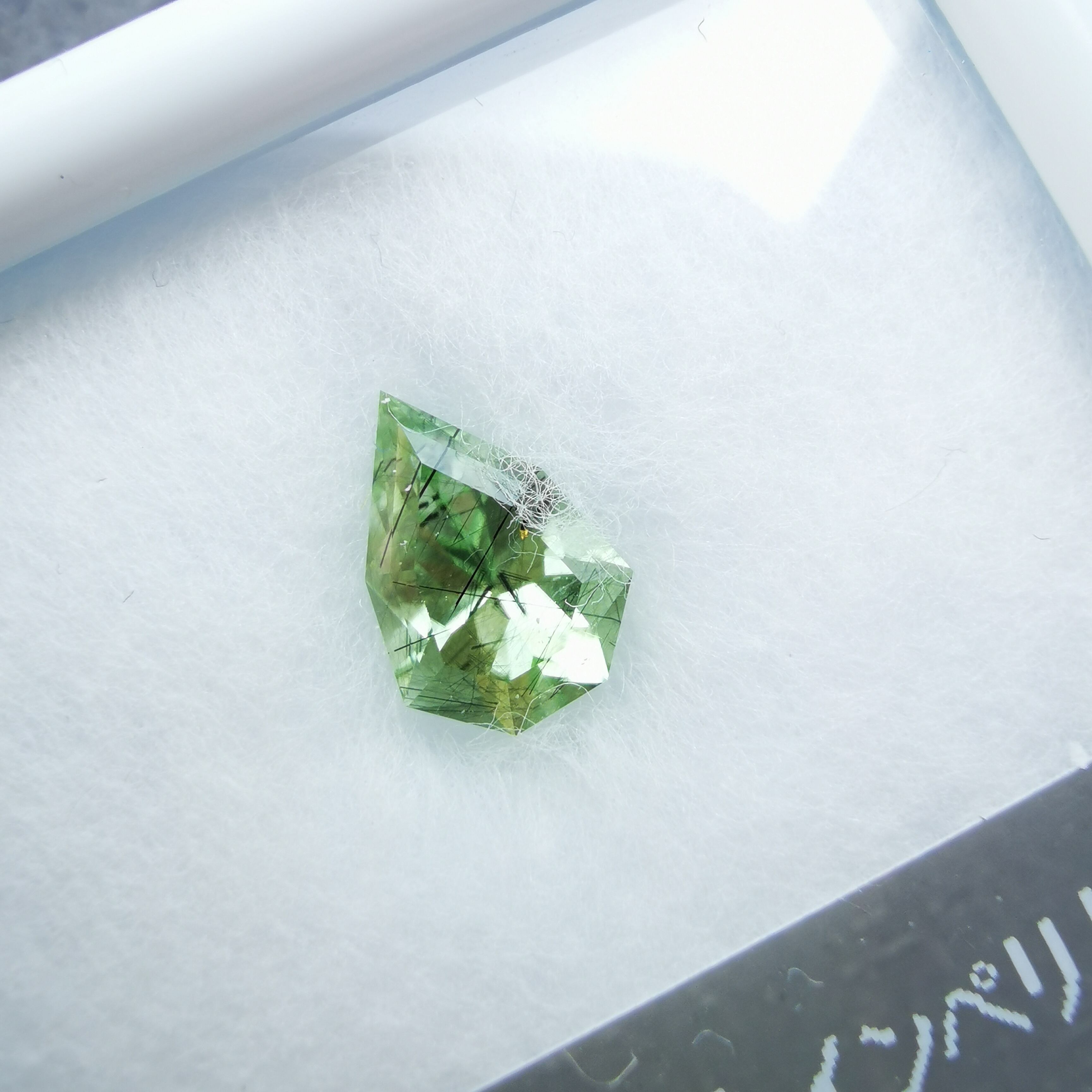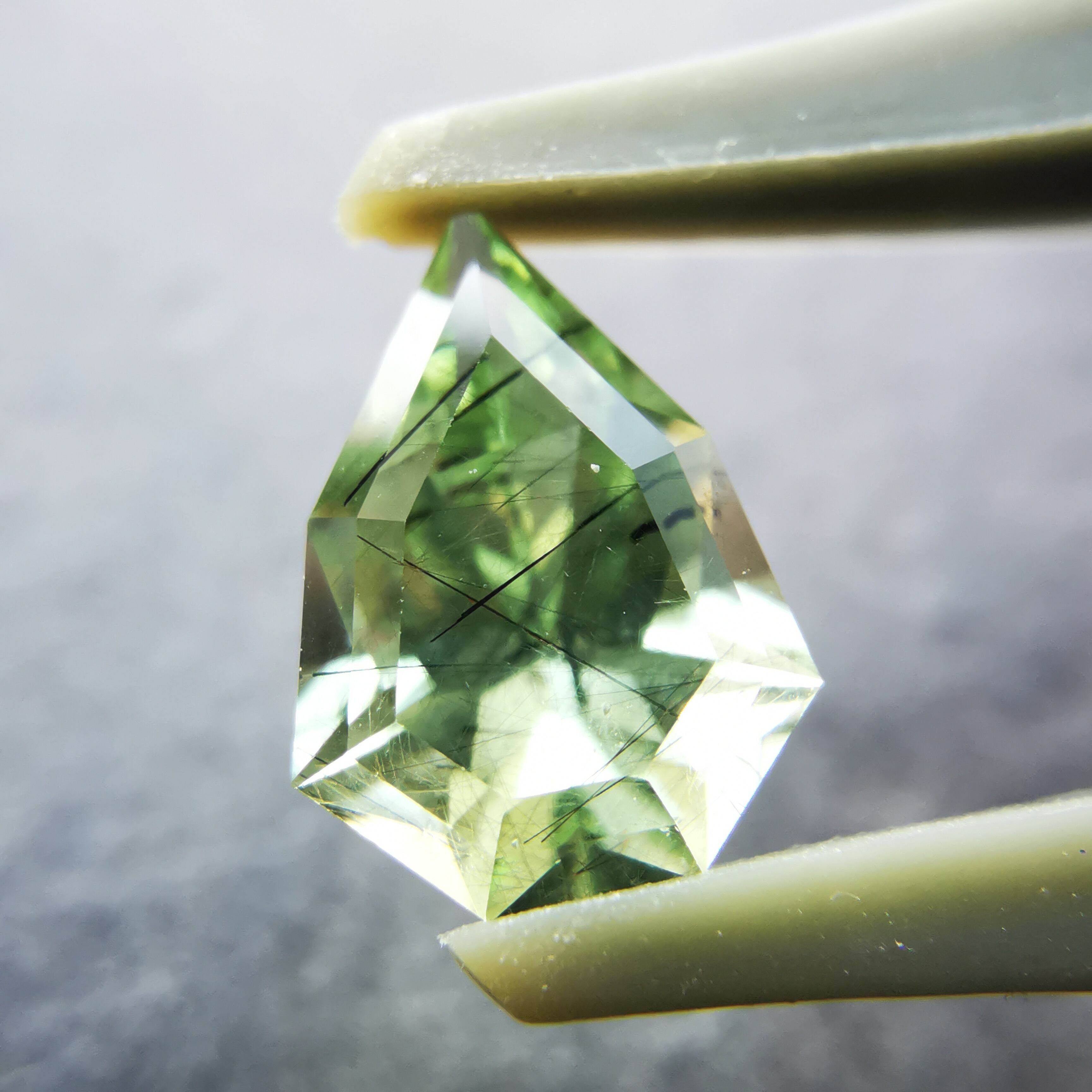 黒い針状のインクルージョン、ルドヴィジャイトが入った強い黄緑/若苗色のペリドットです。