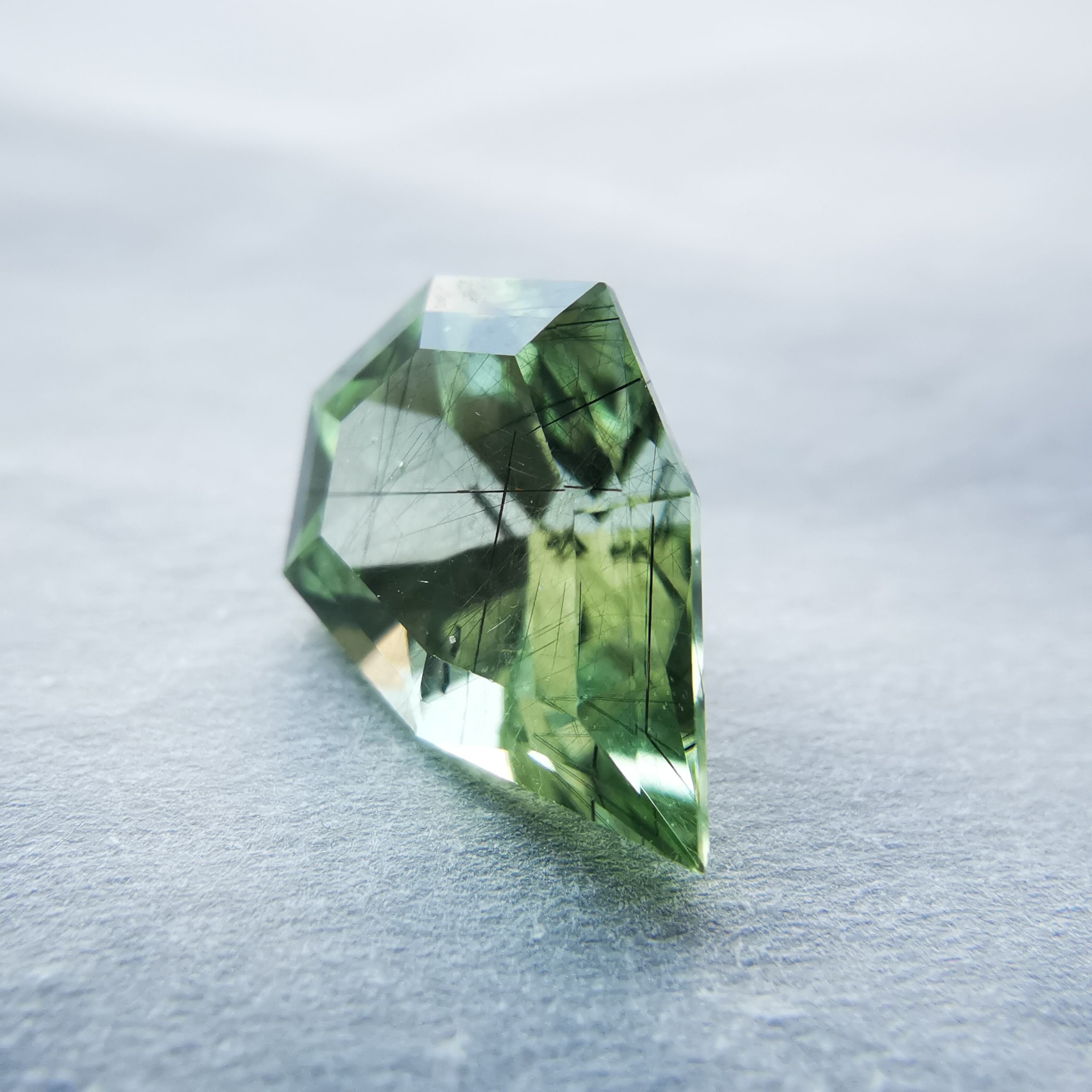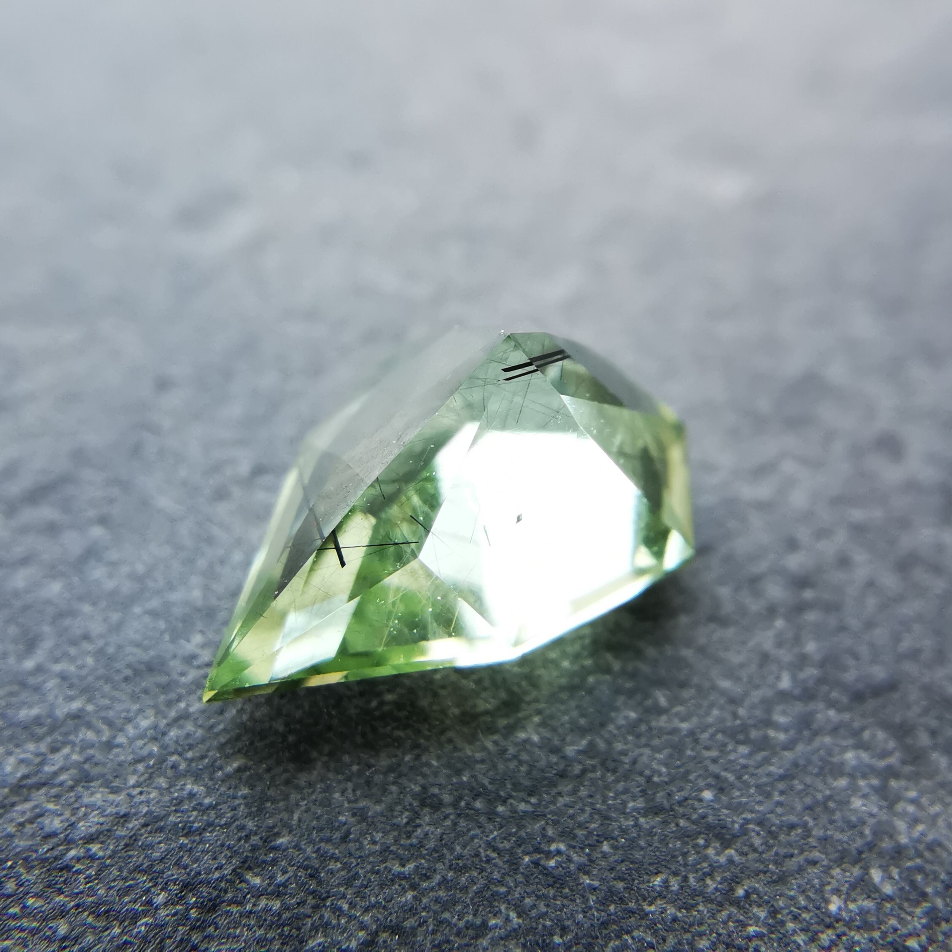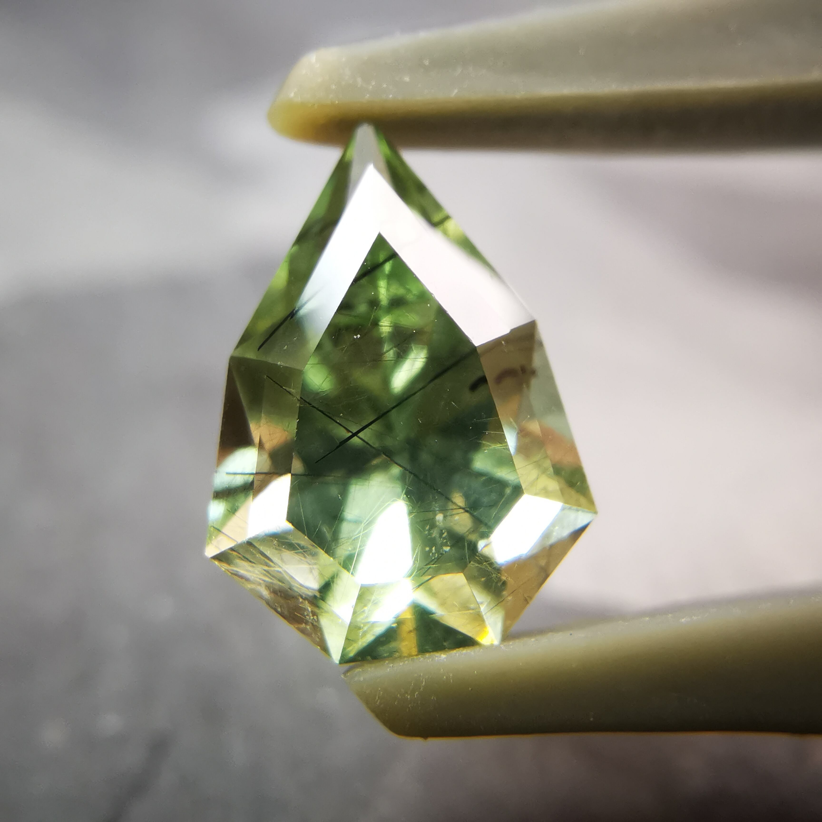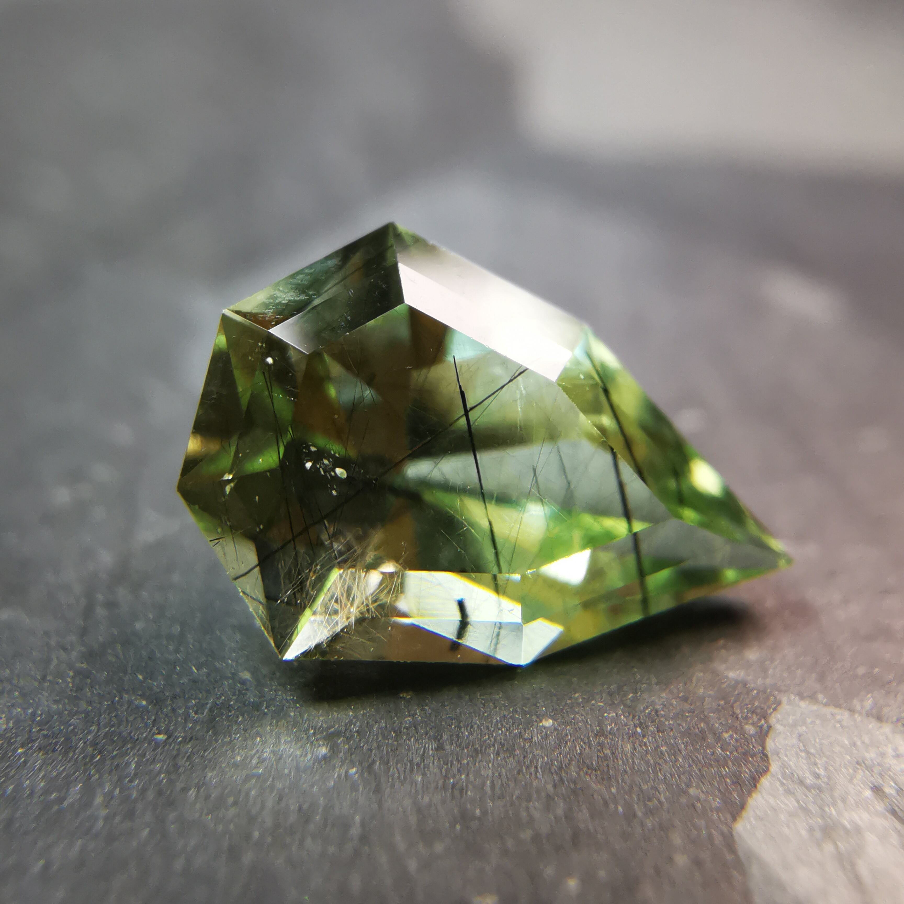 黒い針状のインクルージョン、ルドヴィジャイトが入った強い黄緑/若苗色のペリドットです。