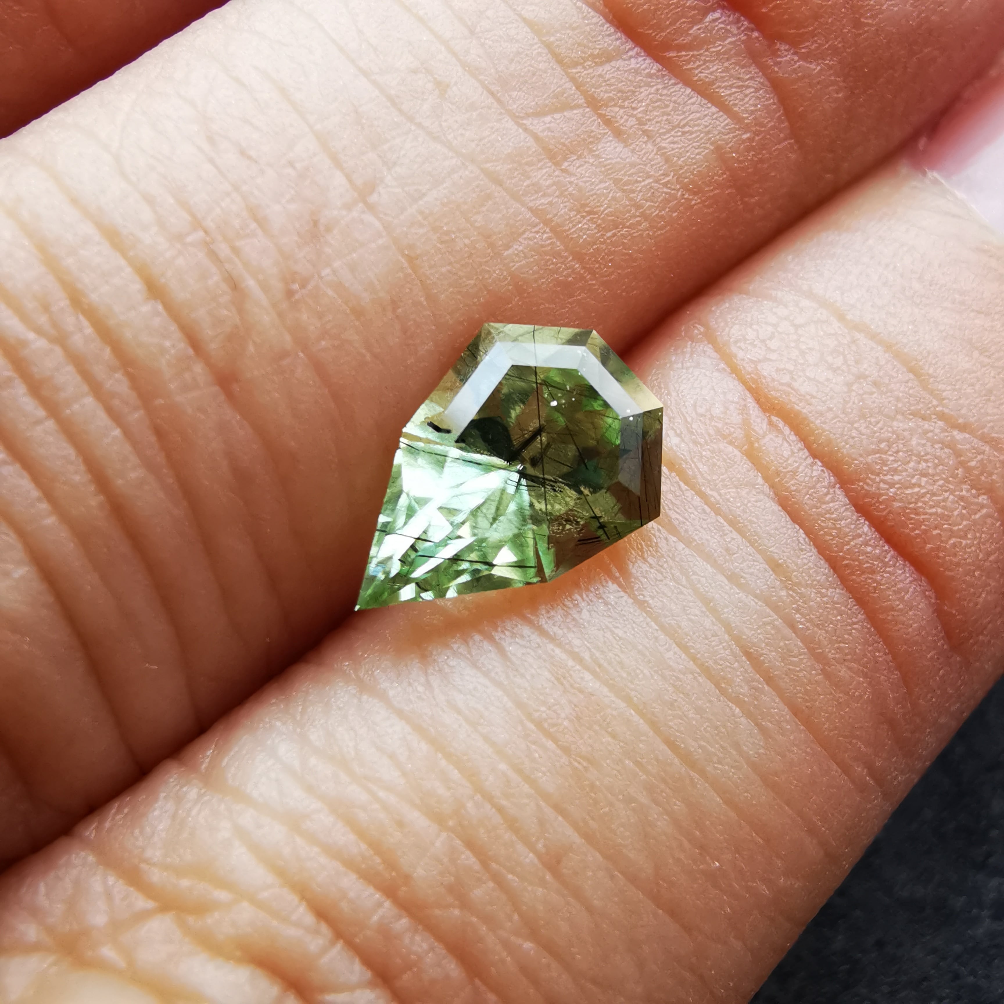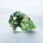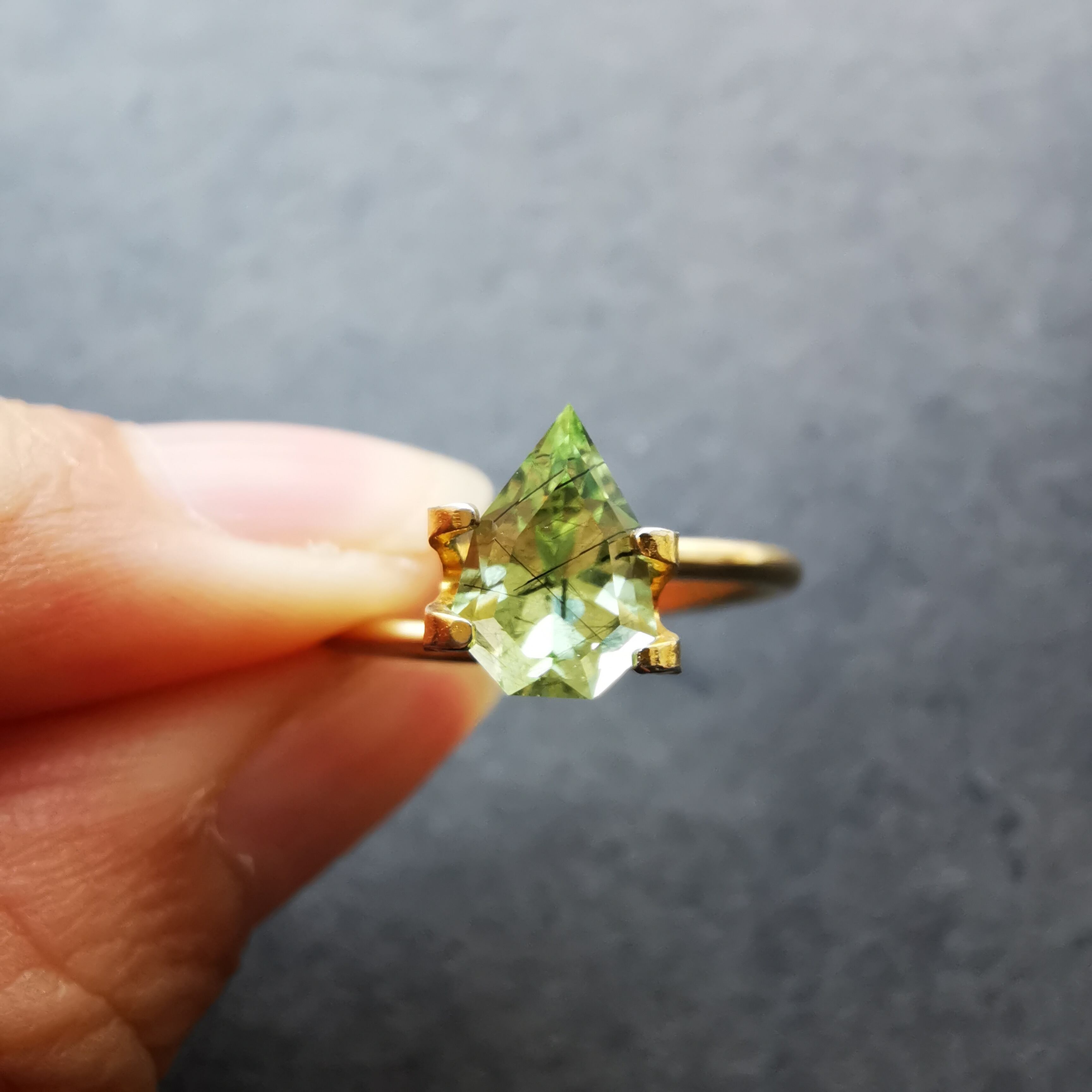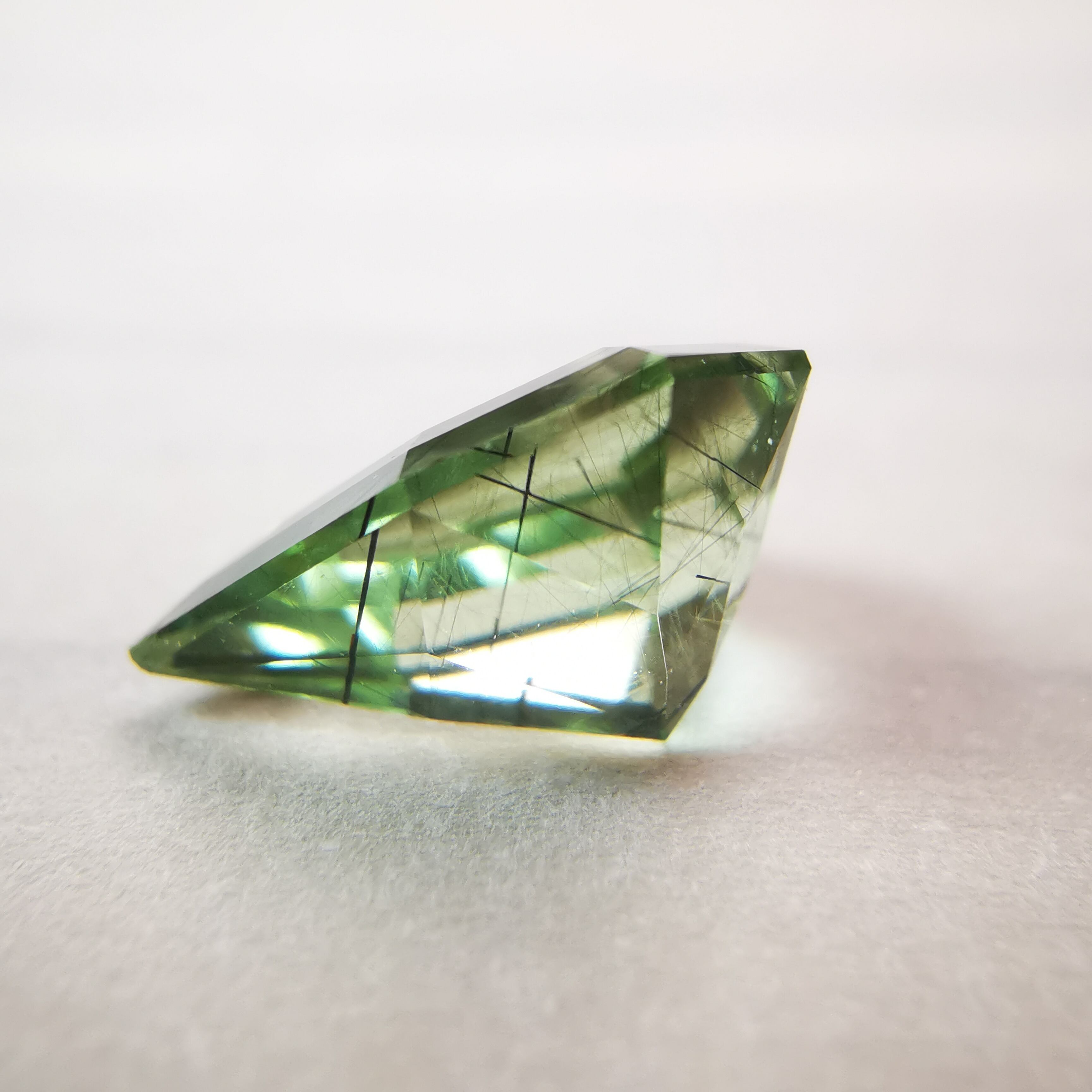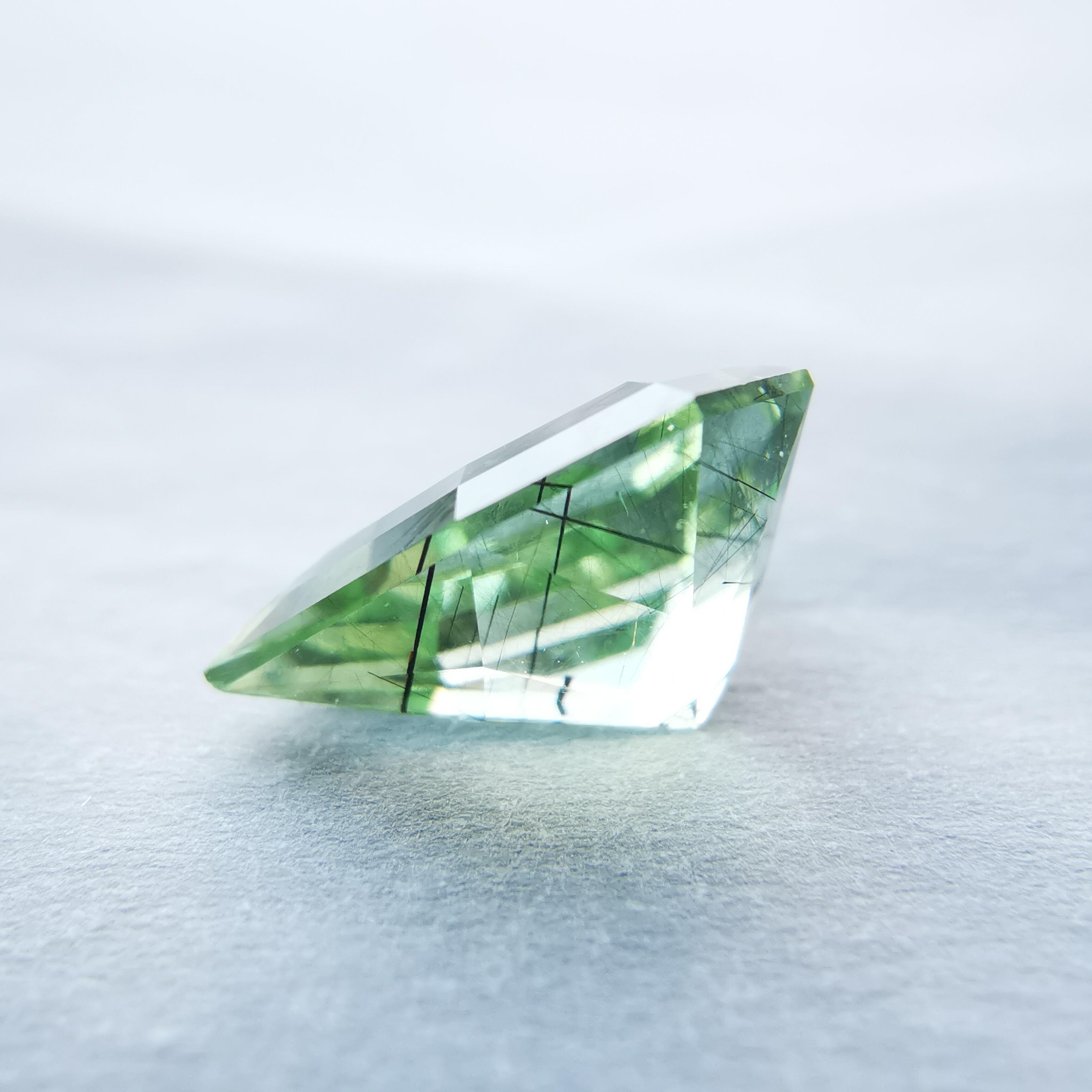 黒い針状のインクルージョン、ルドヴィジャイトが入った強い黄緑/若苗色のペリドットです。
