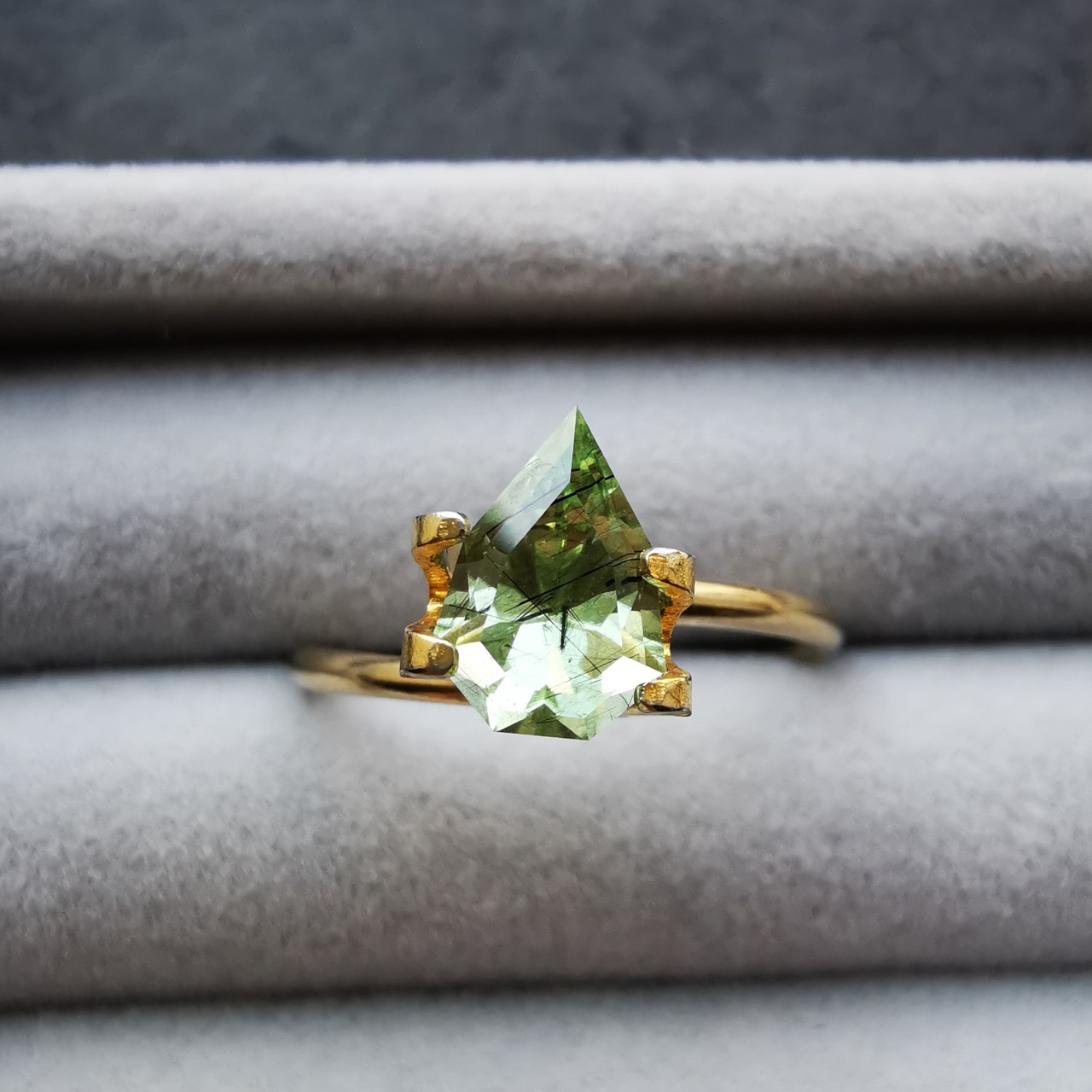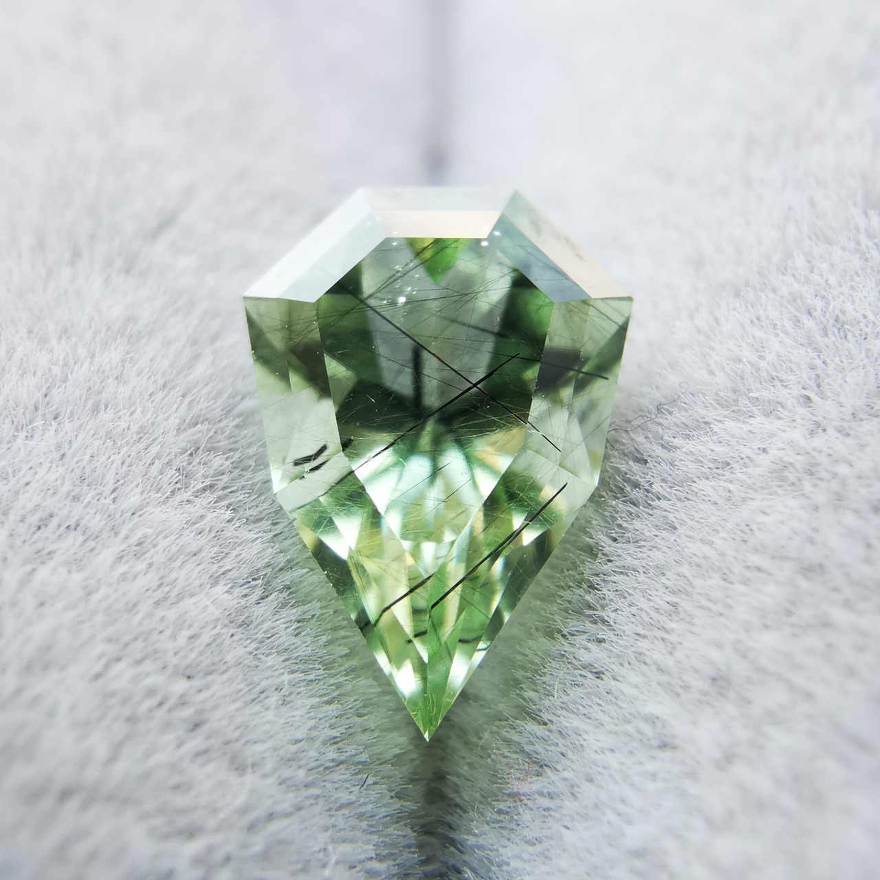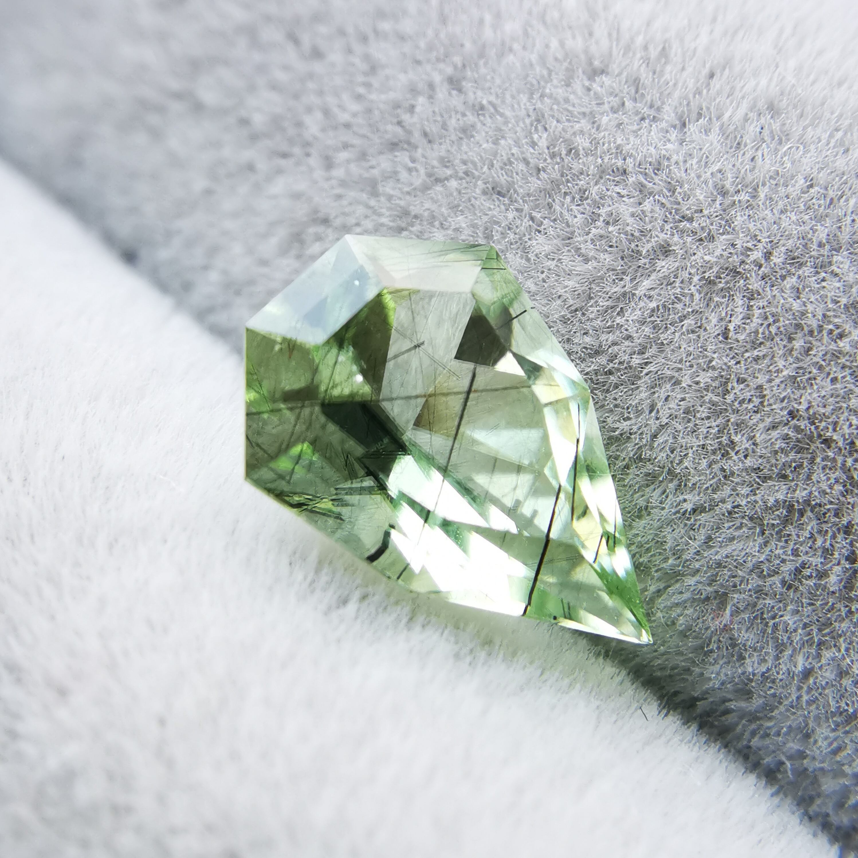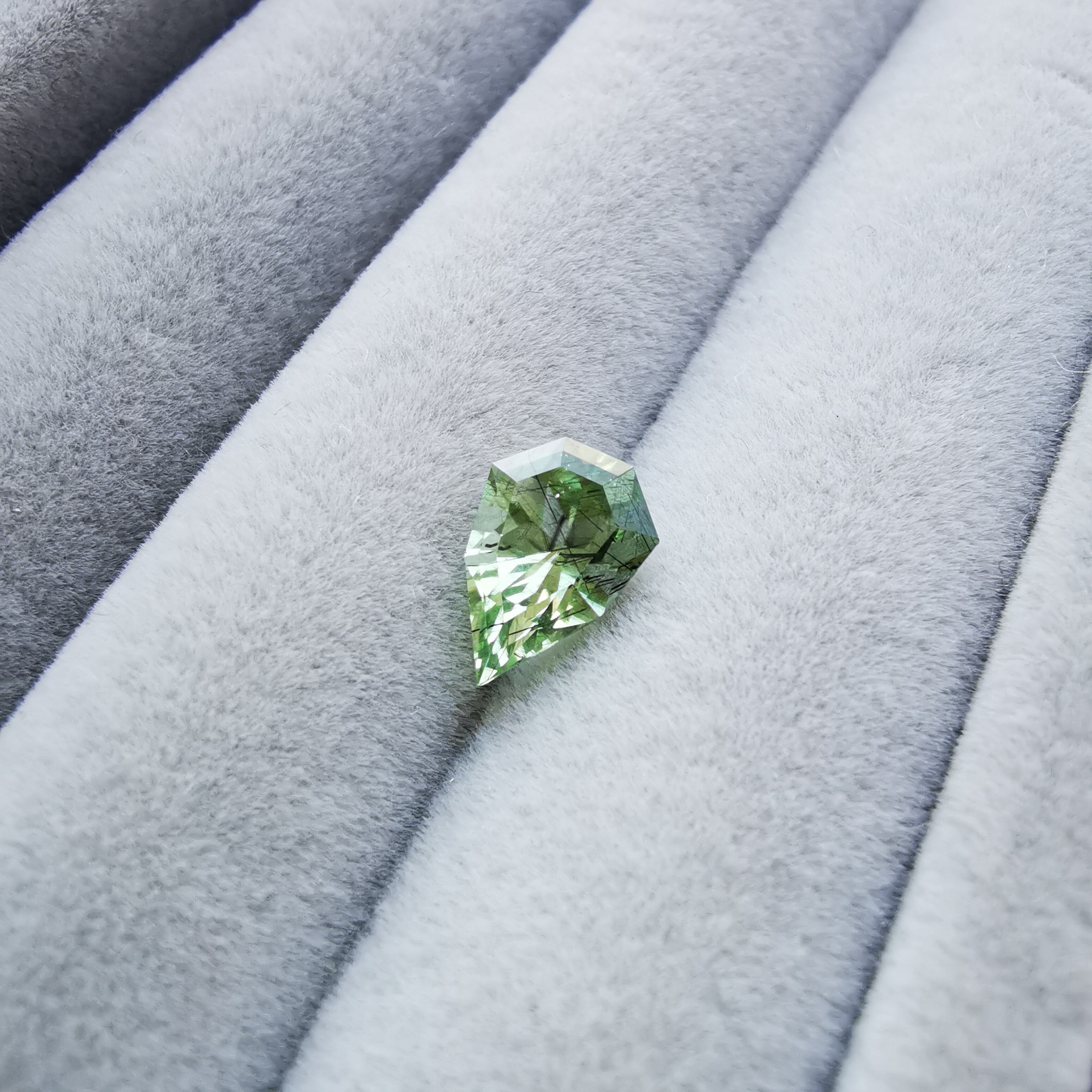 黒い針状のインクルージョン、ルドヴィジャイトが入った強い黄緑/若苗色のペリドットです。