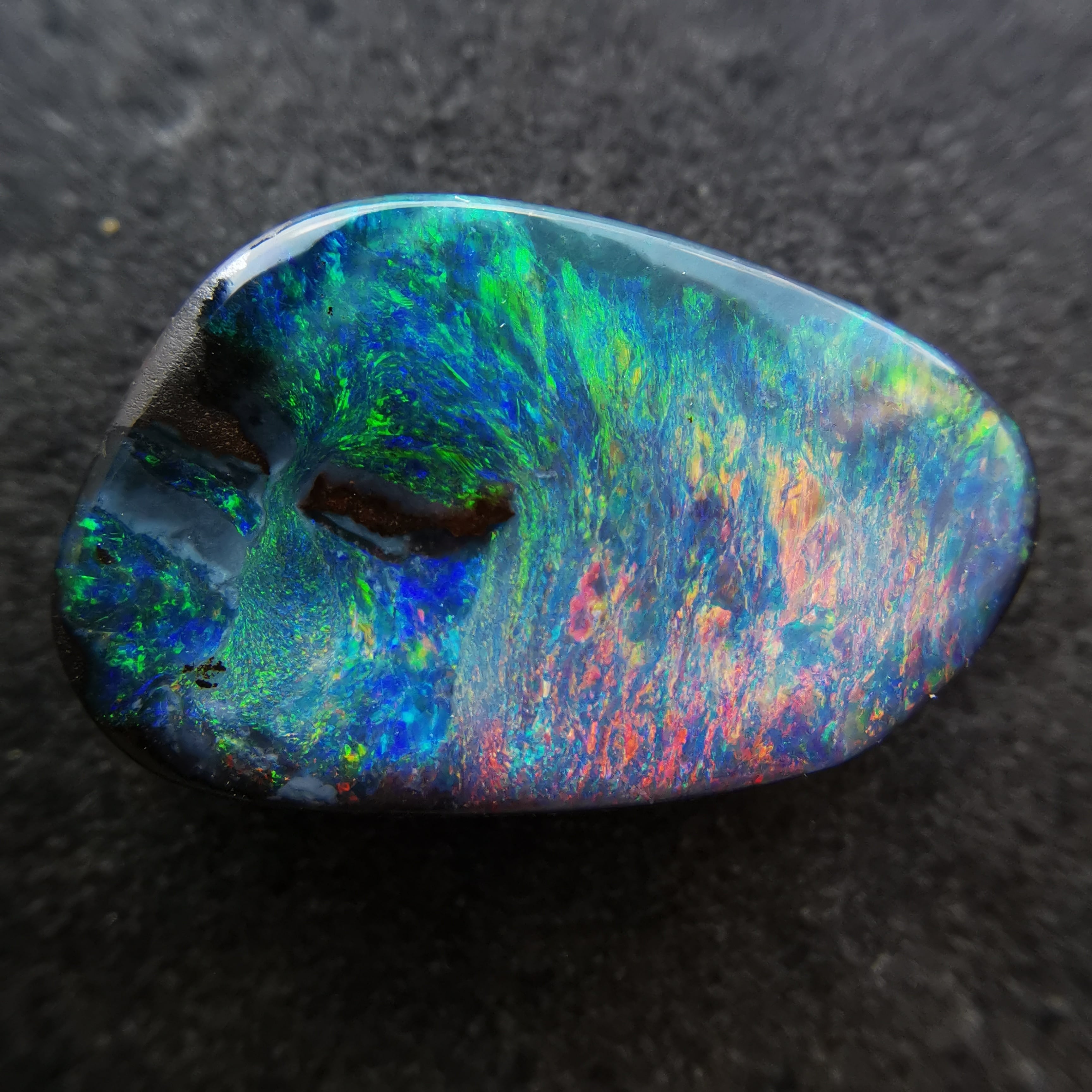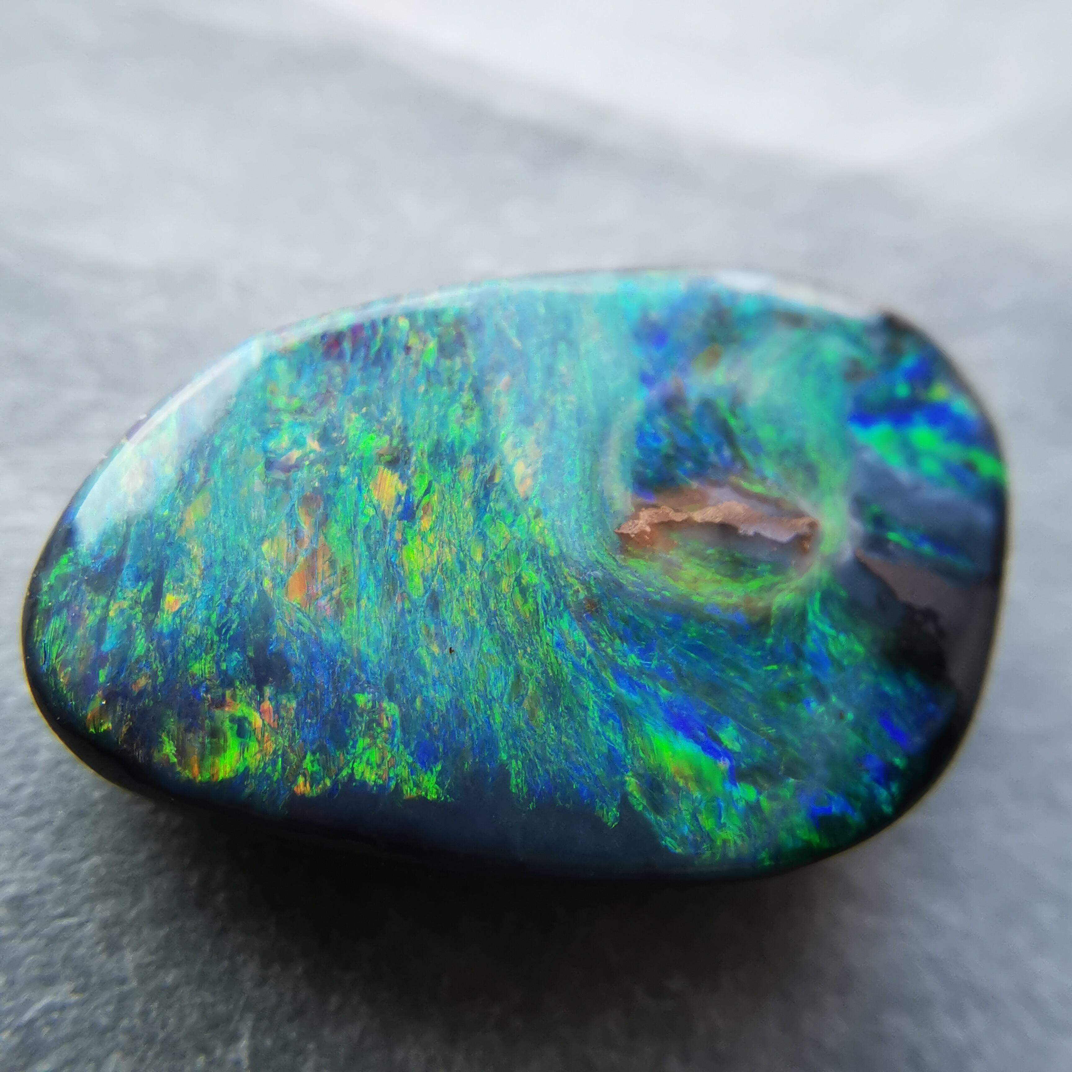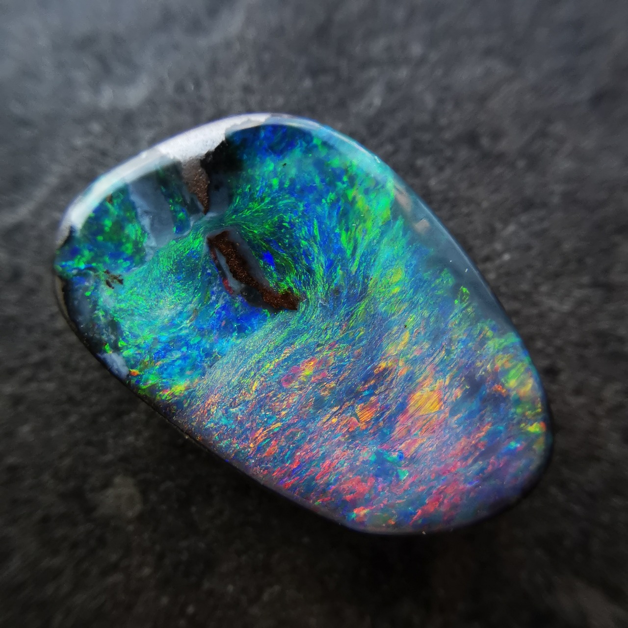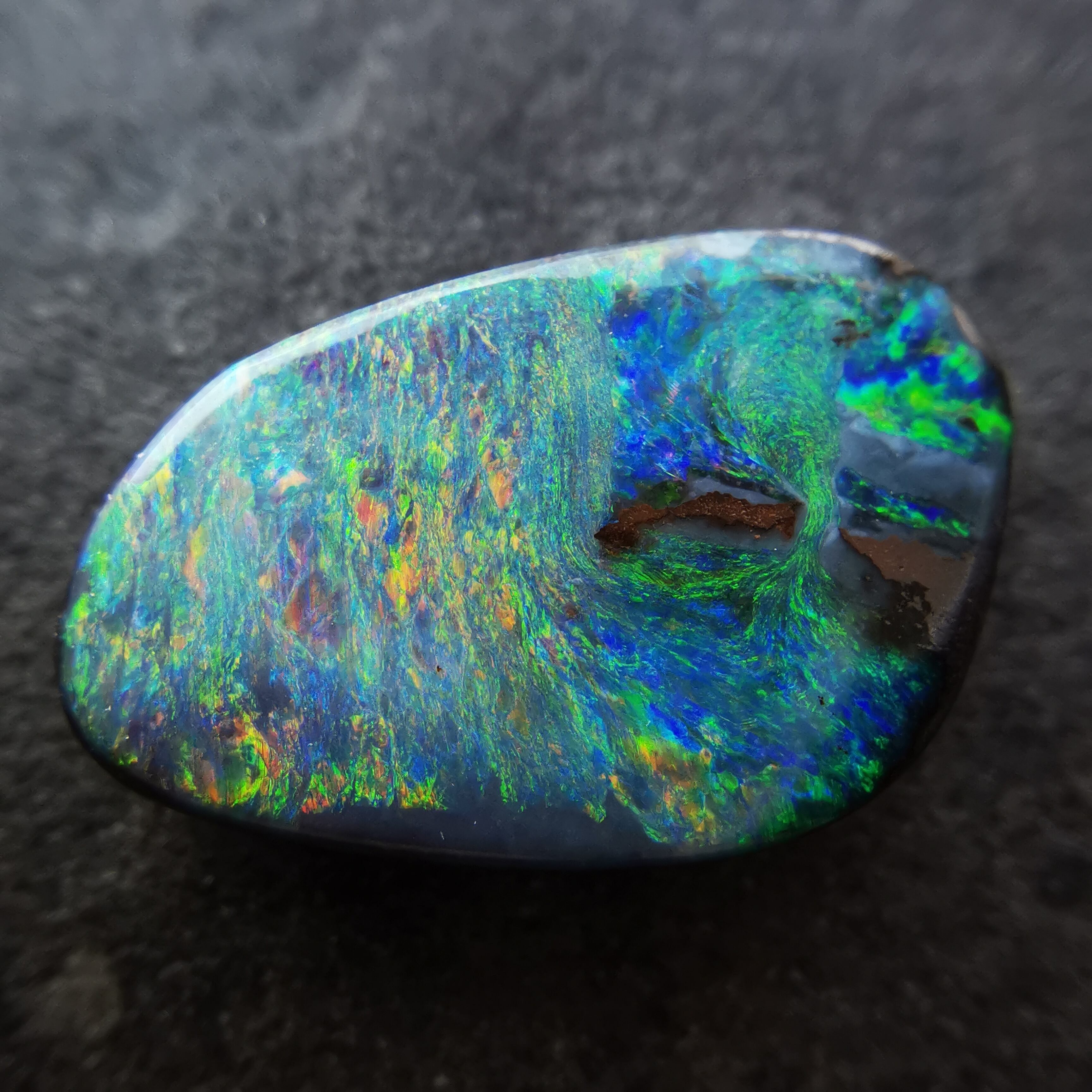 母岩が表出している周りは、濃いグリーン、ブルーやイエローがチラリと覗く極彩色、他の部分は、グリーンやイエローが見えたり、別の角度からは赤や紫みグレーが主張します。