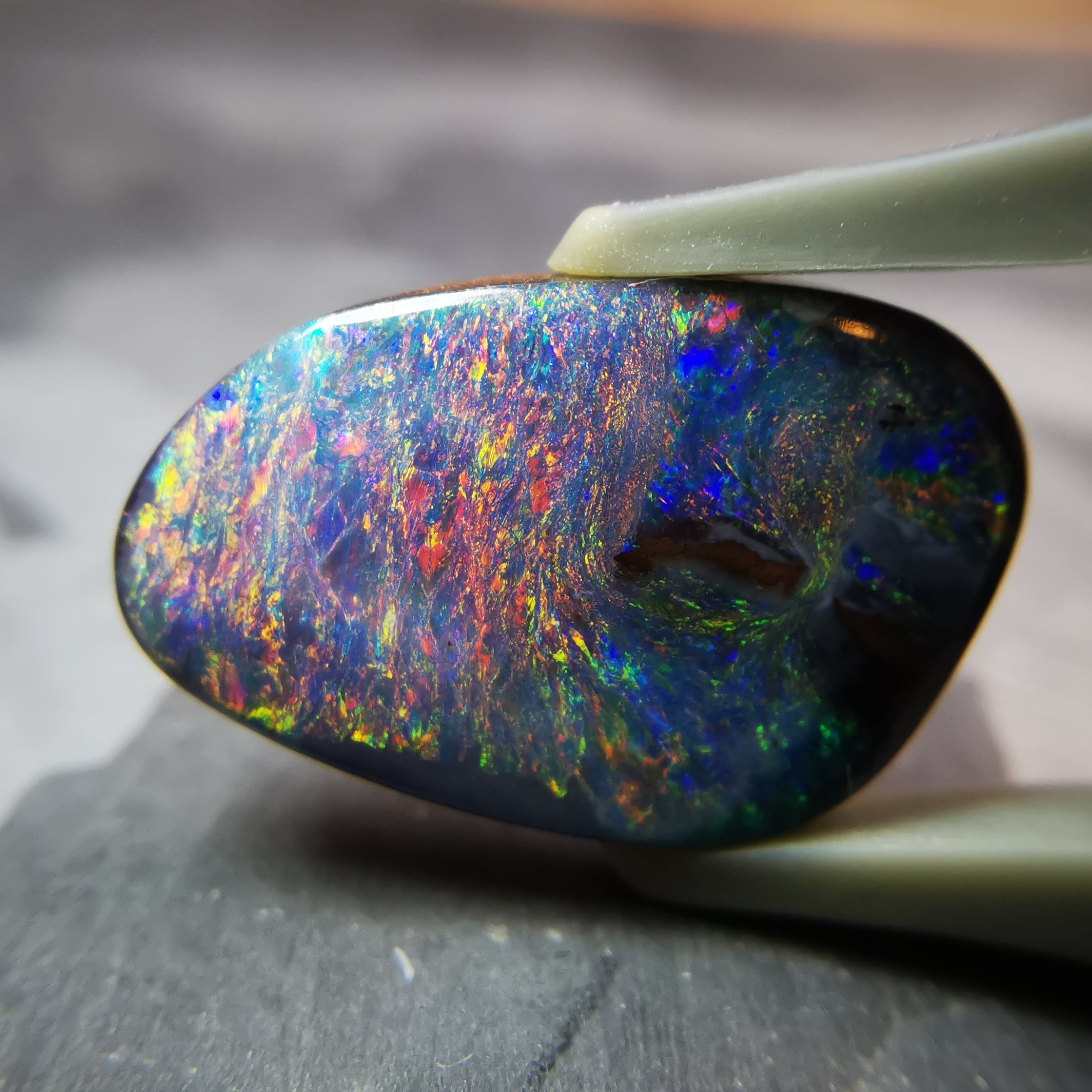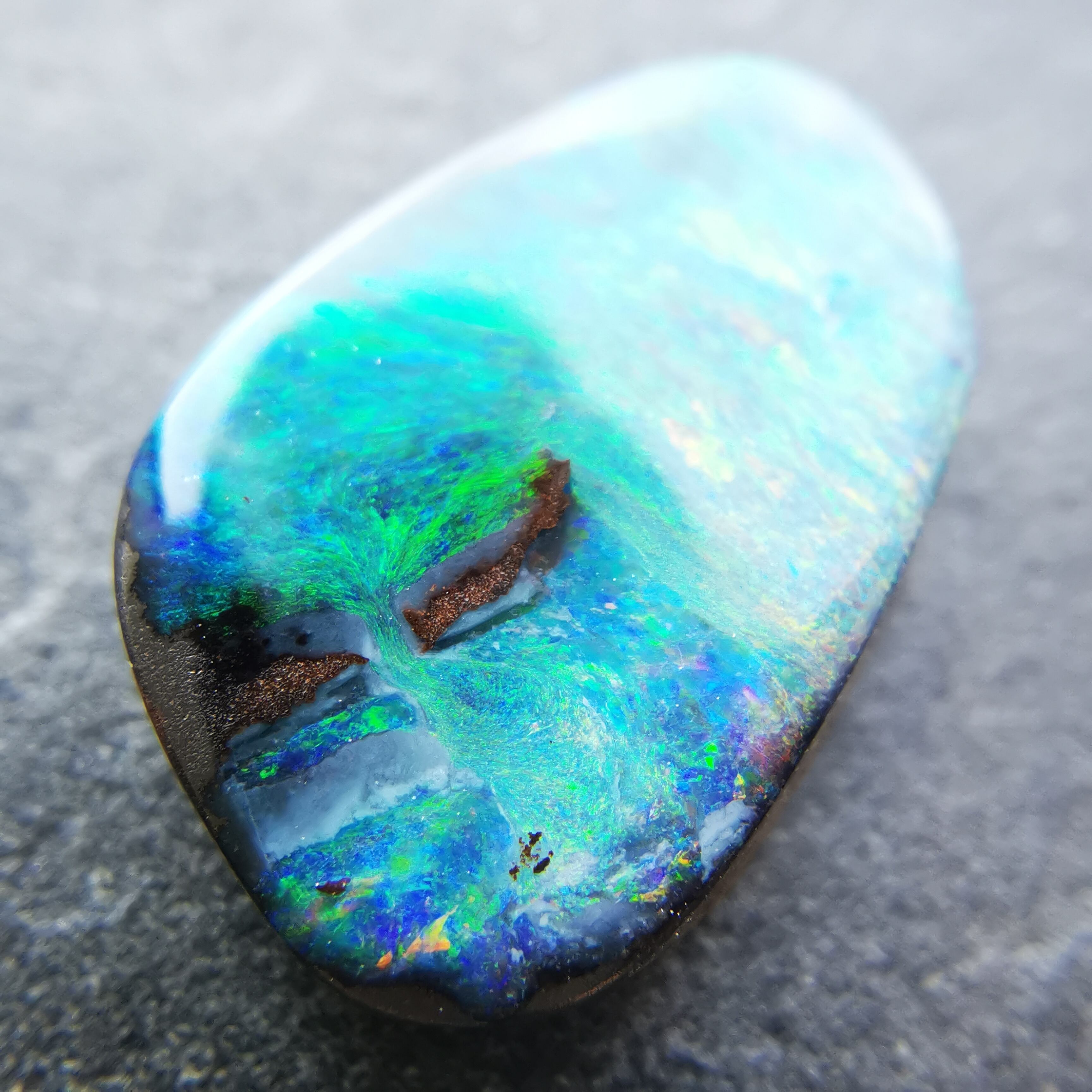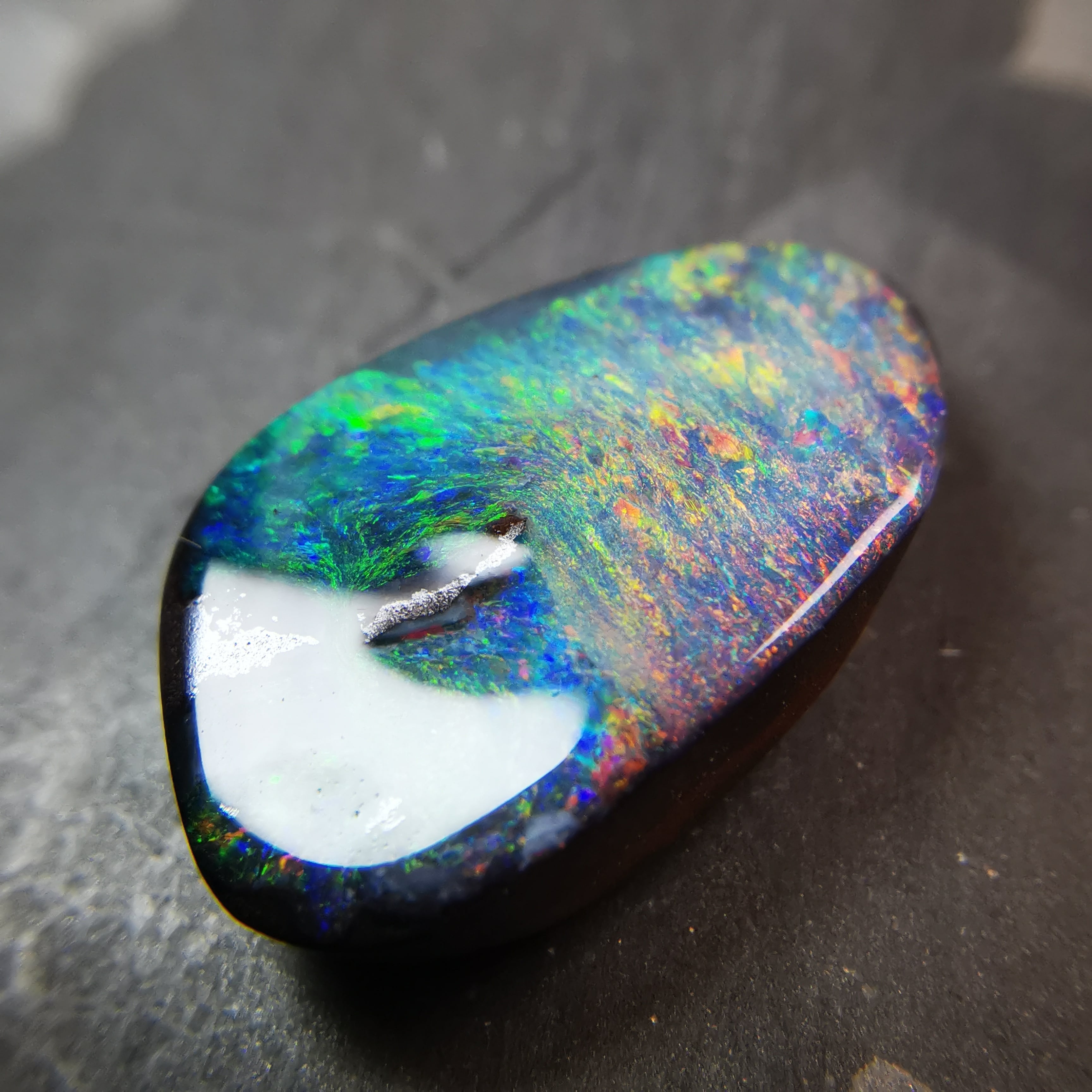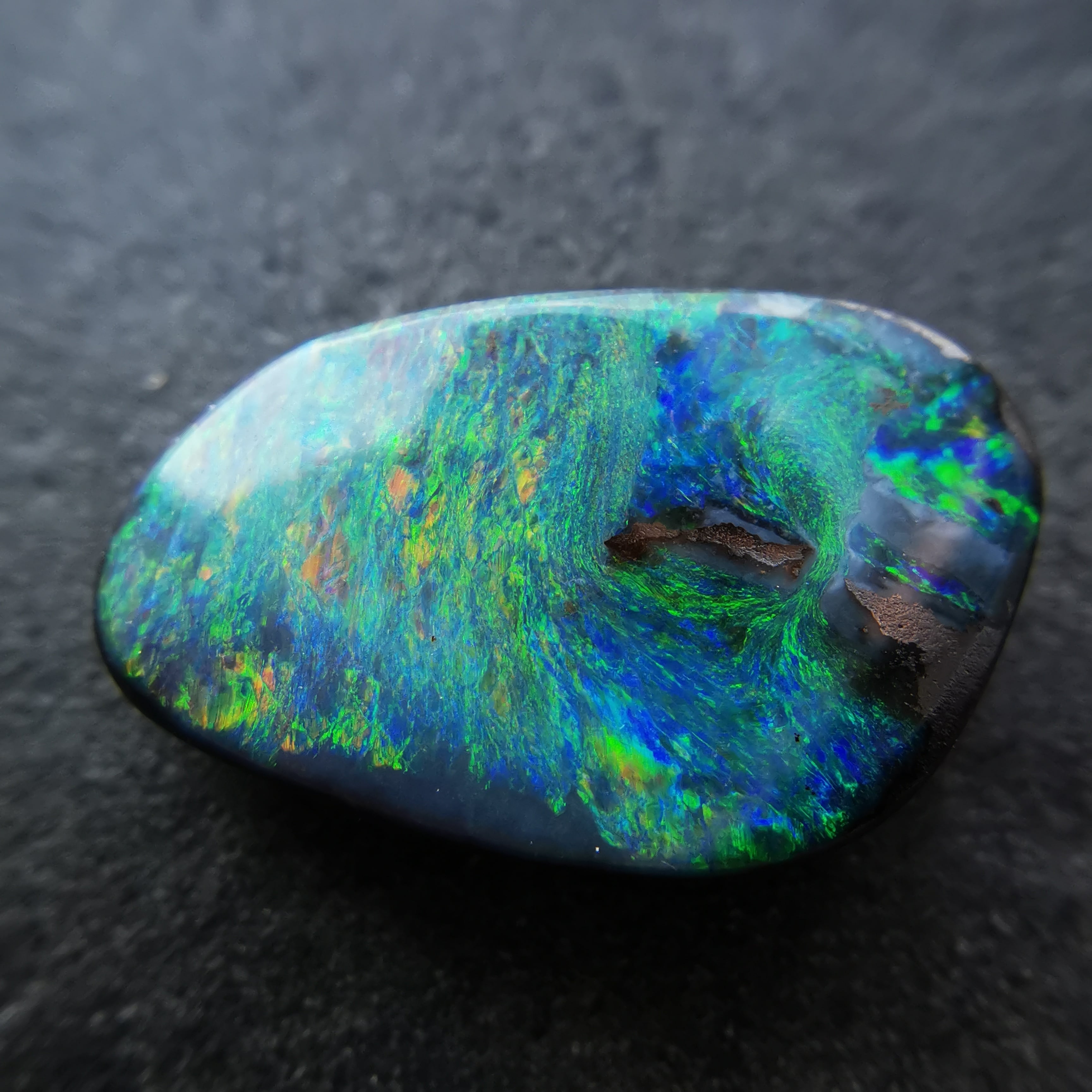 母岩が表出している周りは、濃いグリーン、ブルーやイエローがチラリと覗く極彩色、他の部分は、グリーンやイエローが見えたり、別の角度からは赤や紫みグレーが主張します。