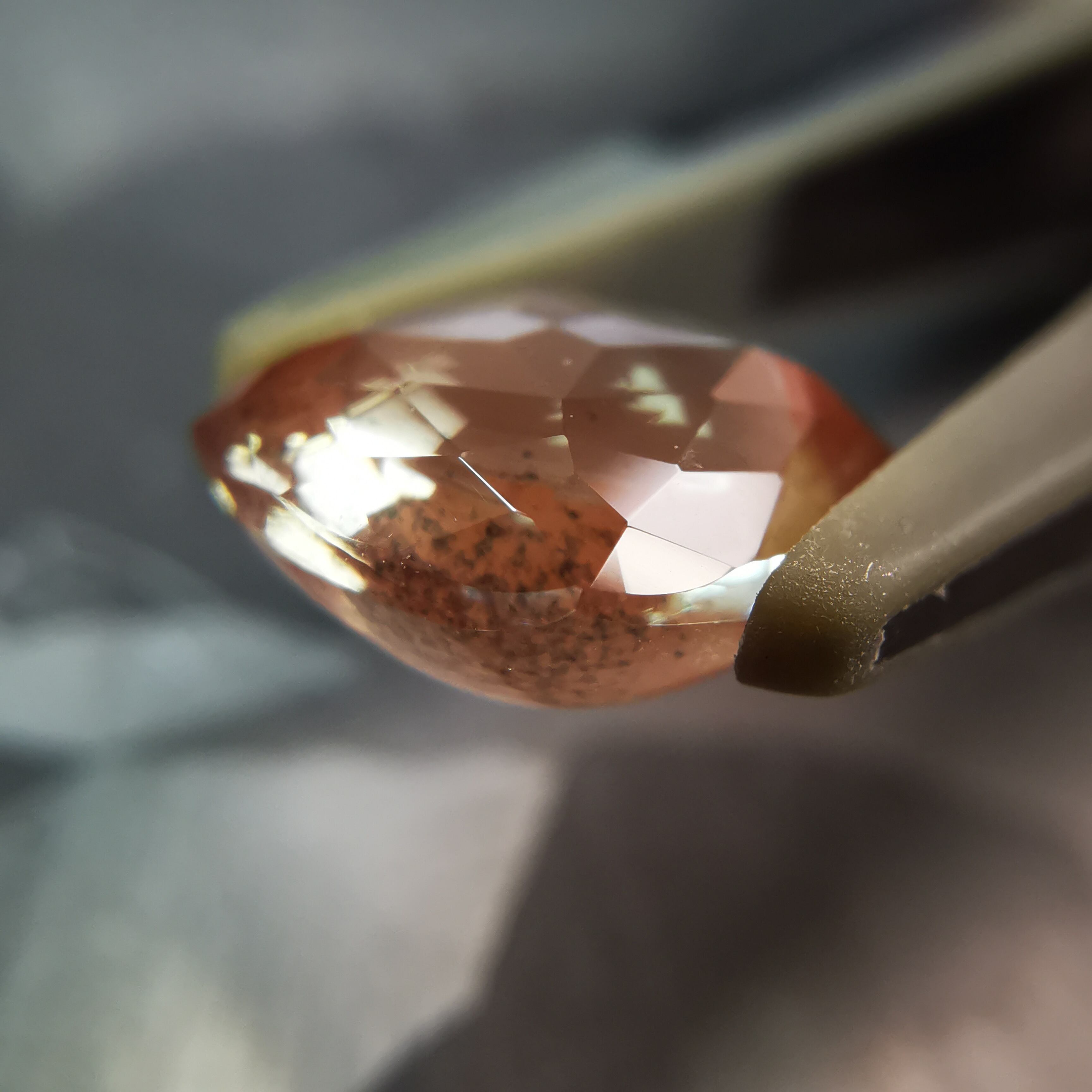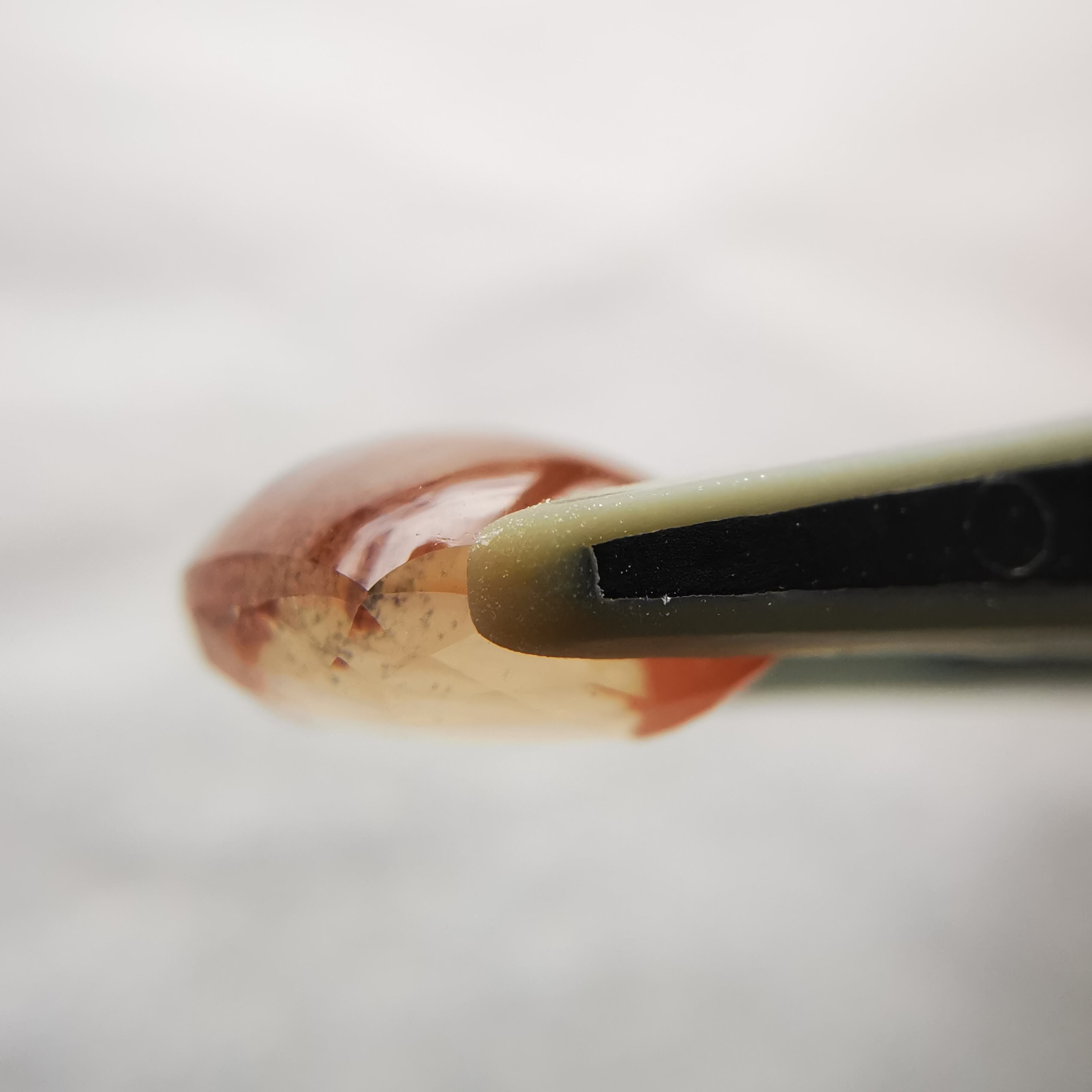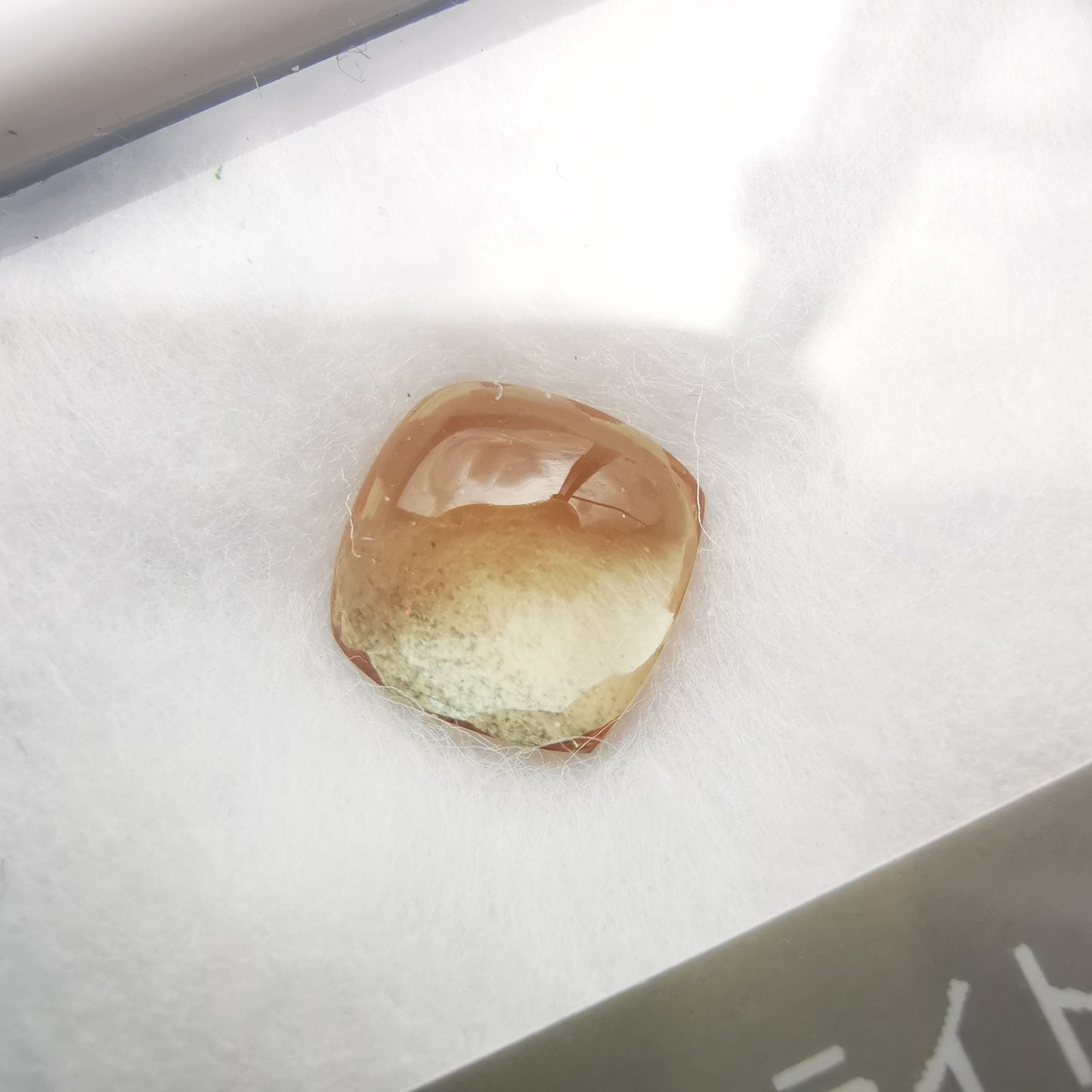 やわらかい黄赤/アプリコット色の端の方に、ダークなグリーンがシュワっとしぶきのように入ったラブラドライトです。