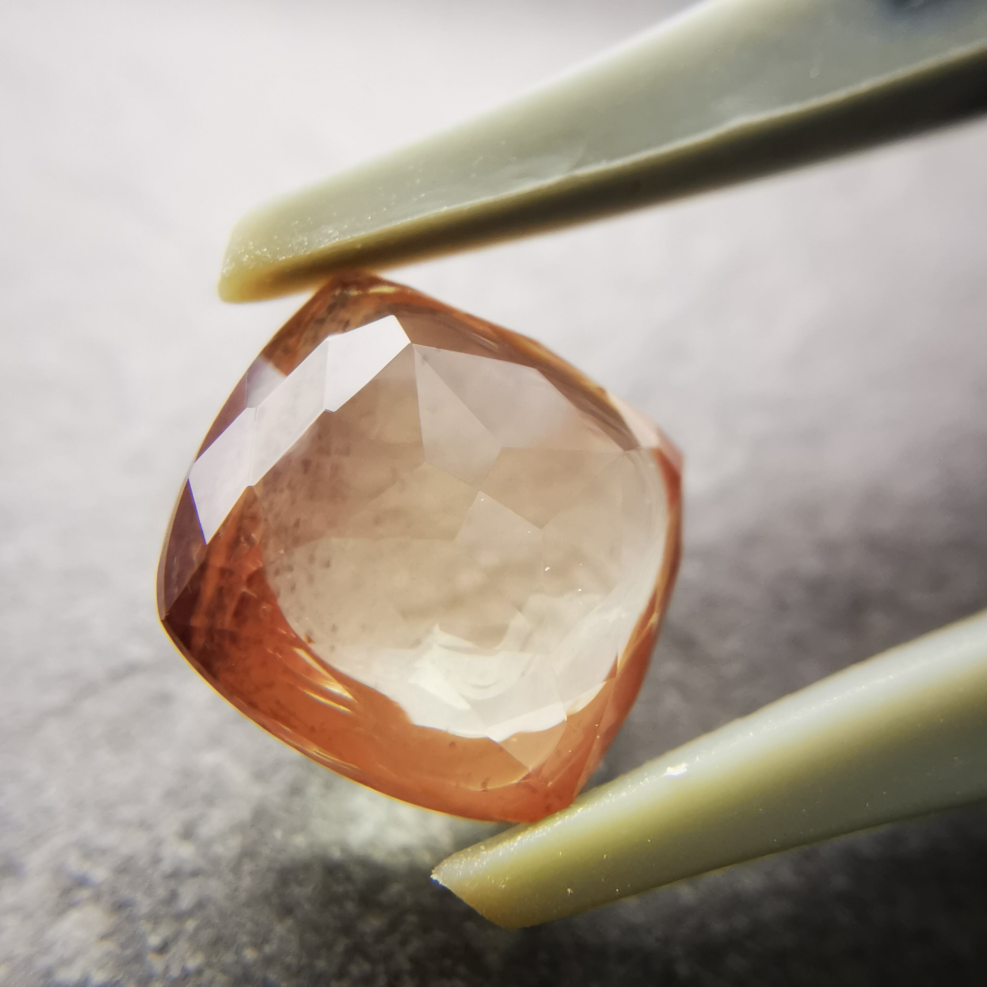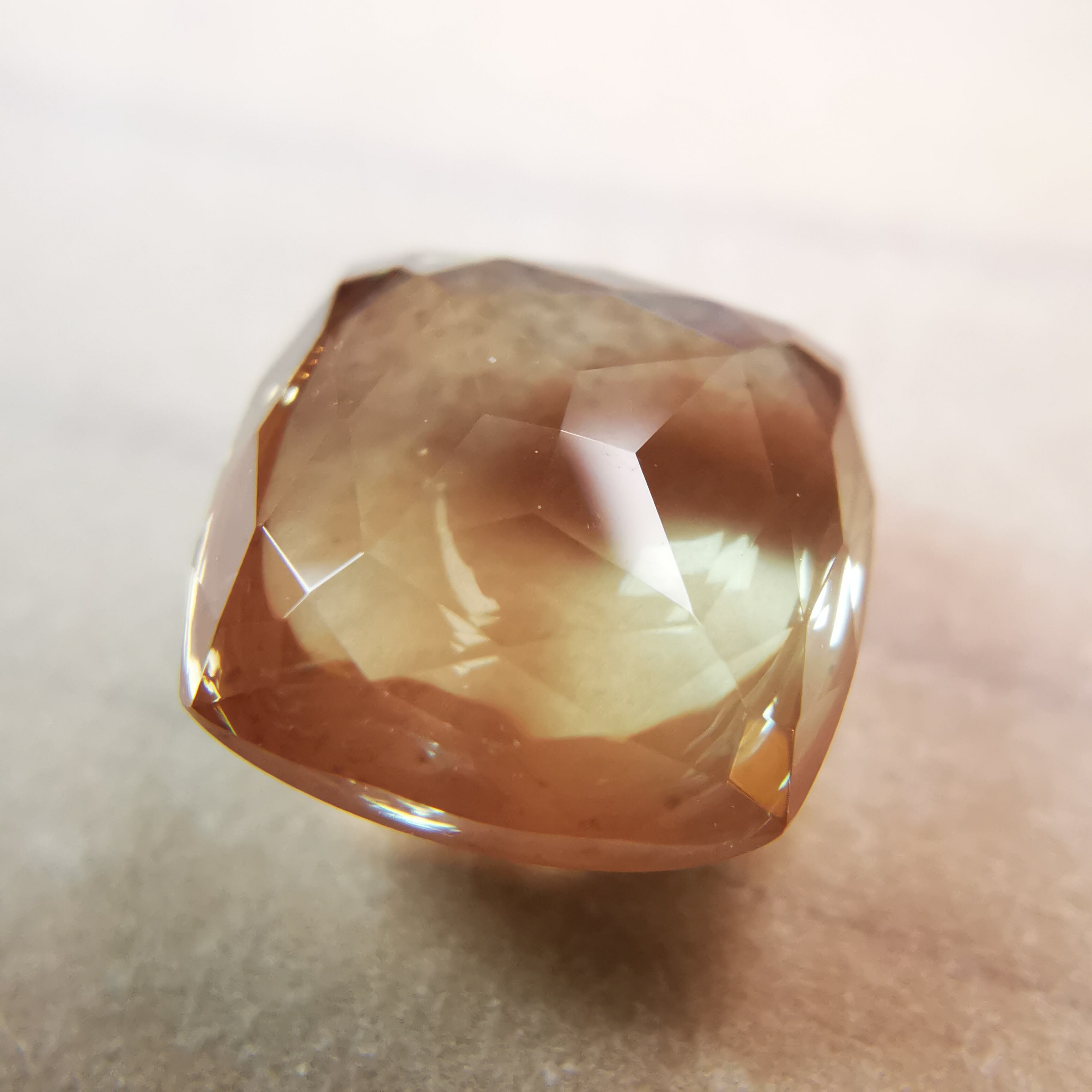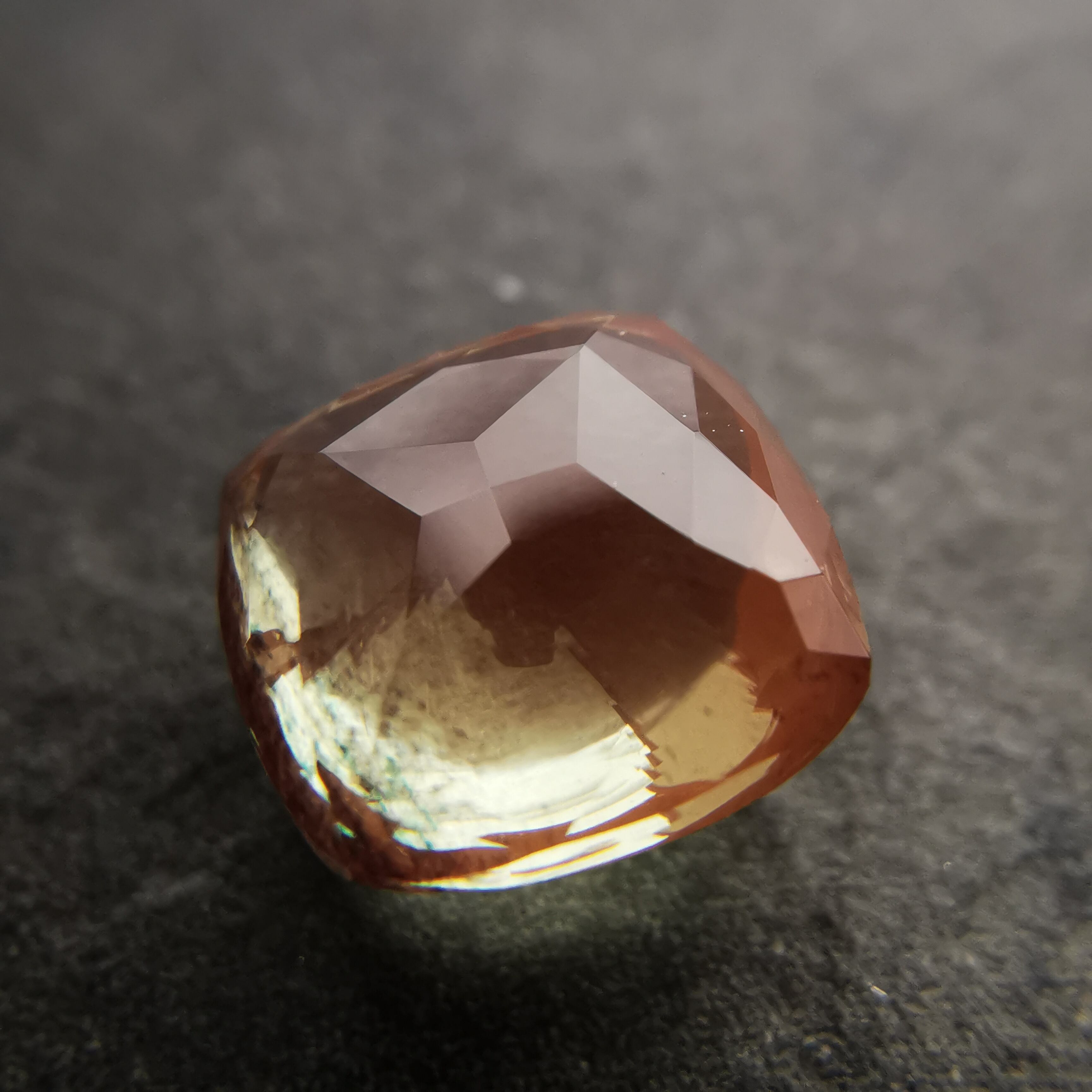 やわらかい黄赤/アプリコット色の端の方に、ダークなグリーンがシュワっとしぶきのように入ったラブラドライトです。