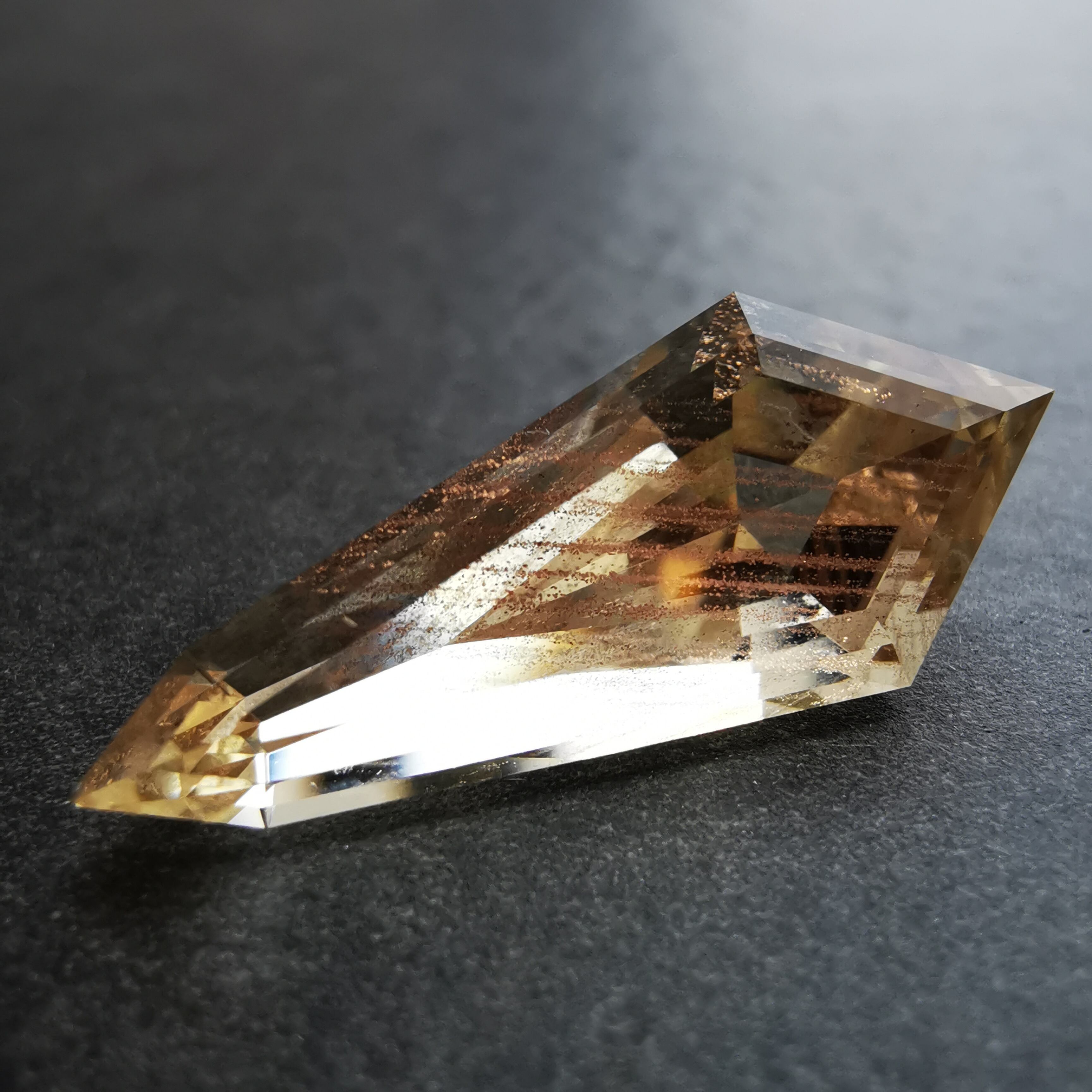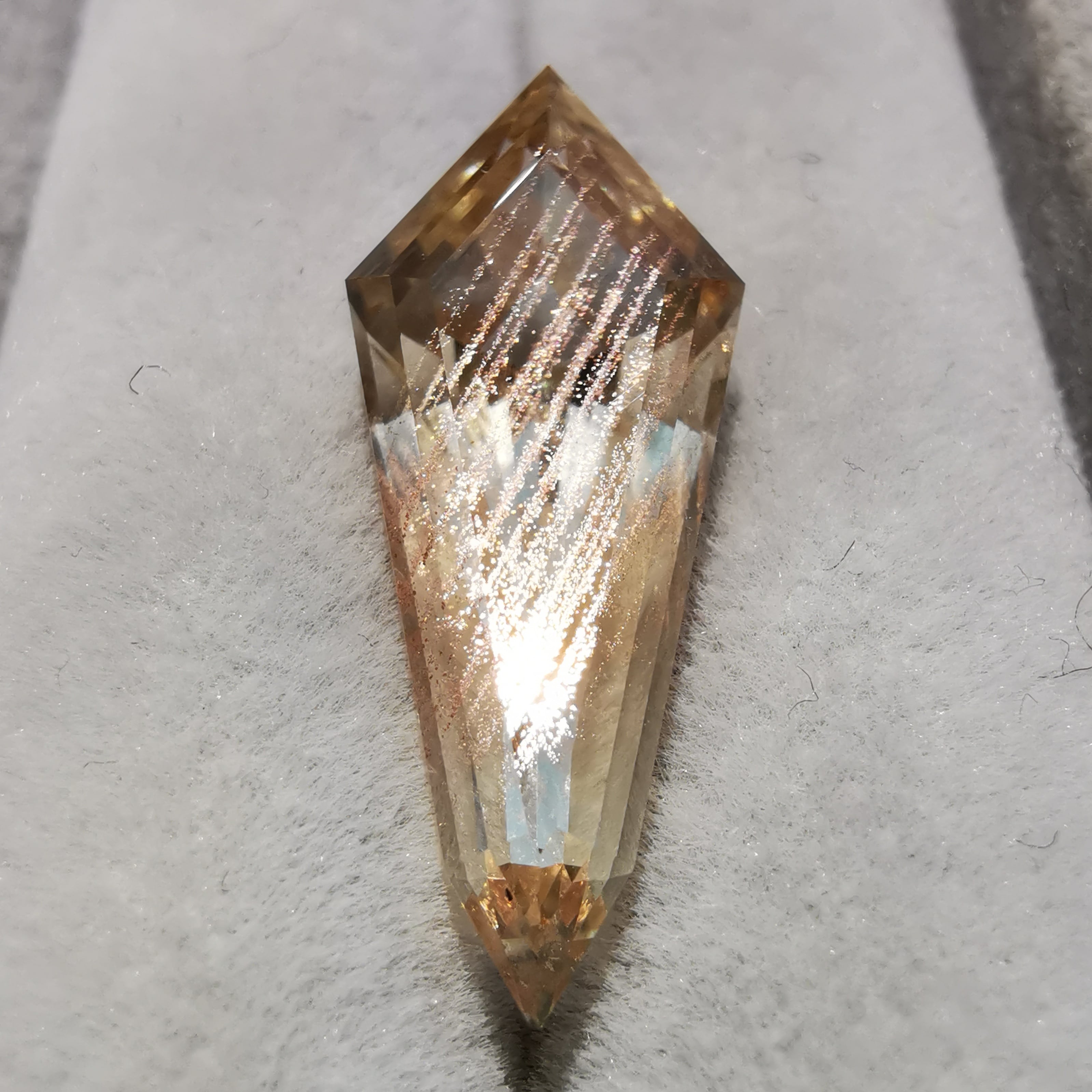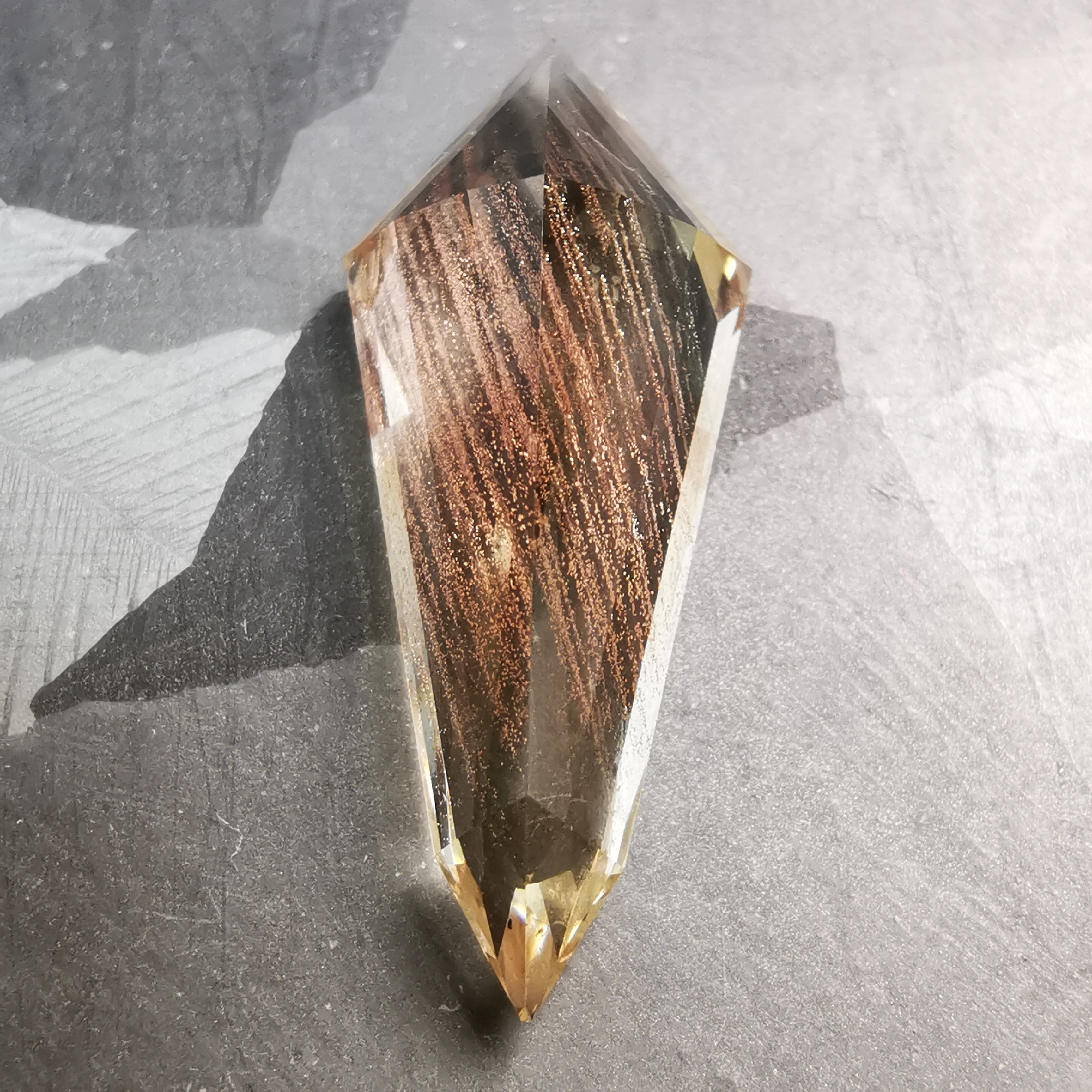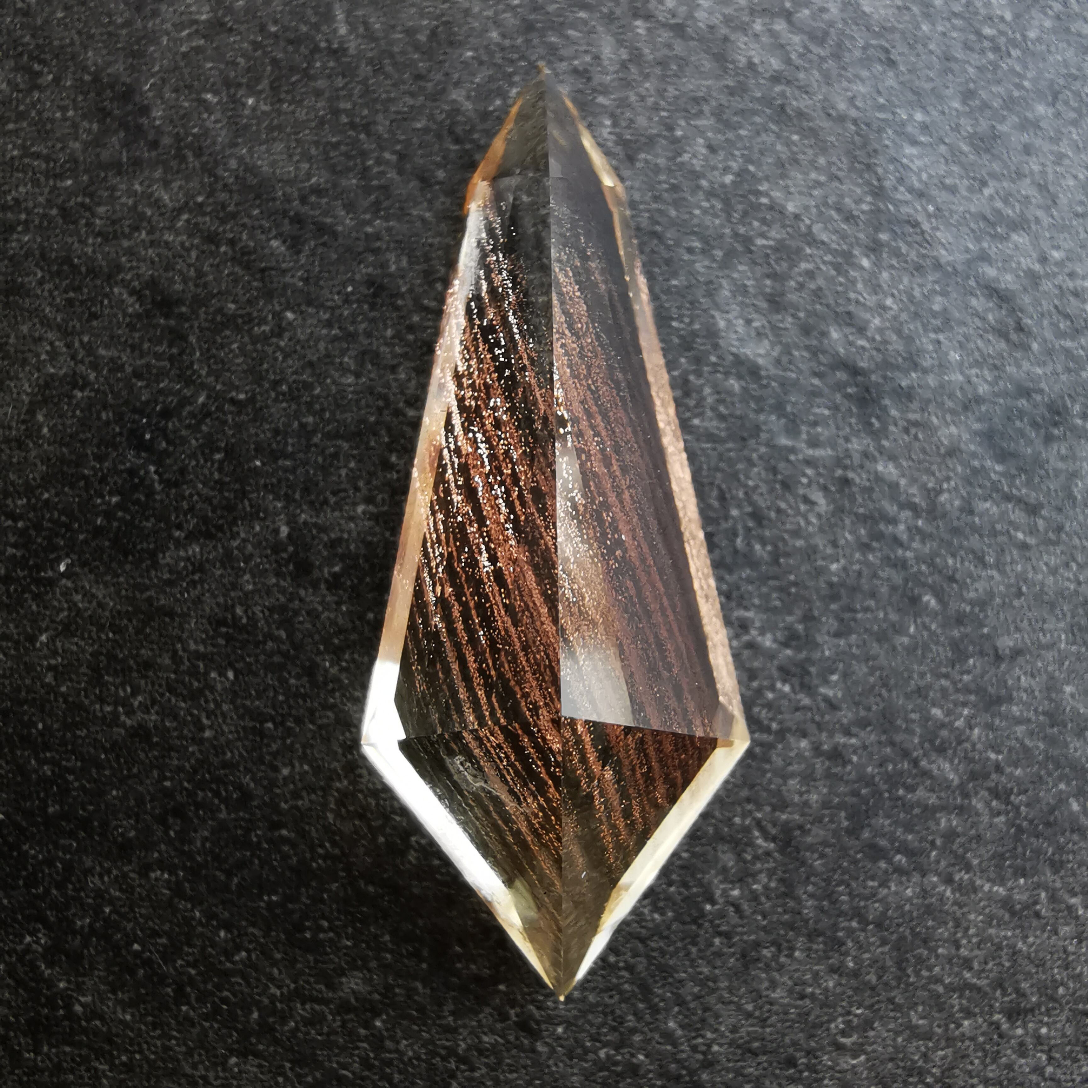 縦長のシールドカットのテーブル面を、流星群のようなアベンチュレッセンスがきらめきながら流れ落ちます。