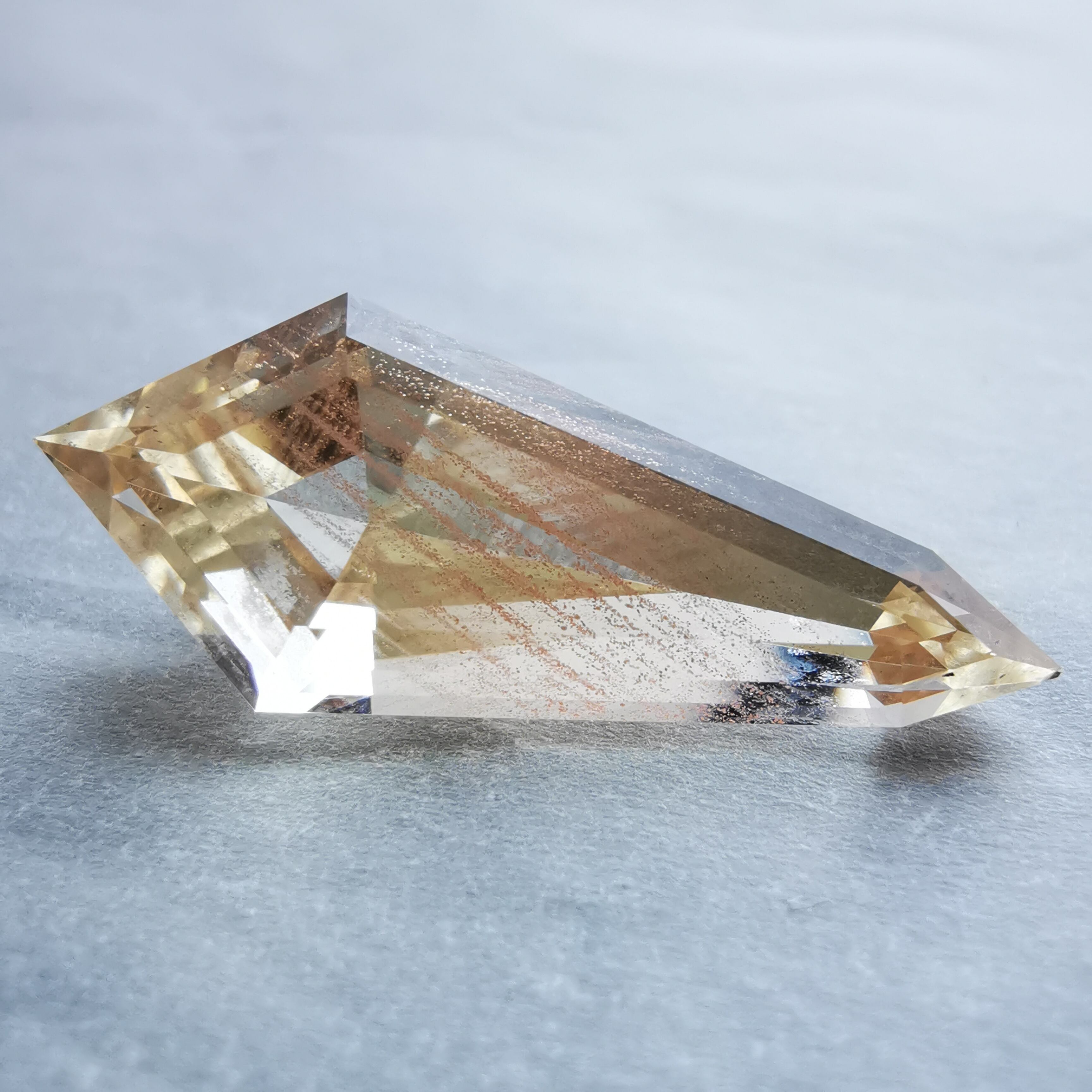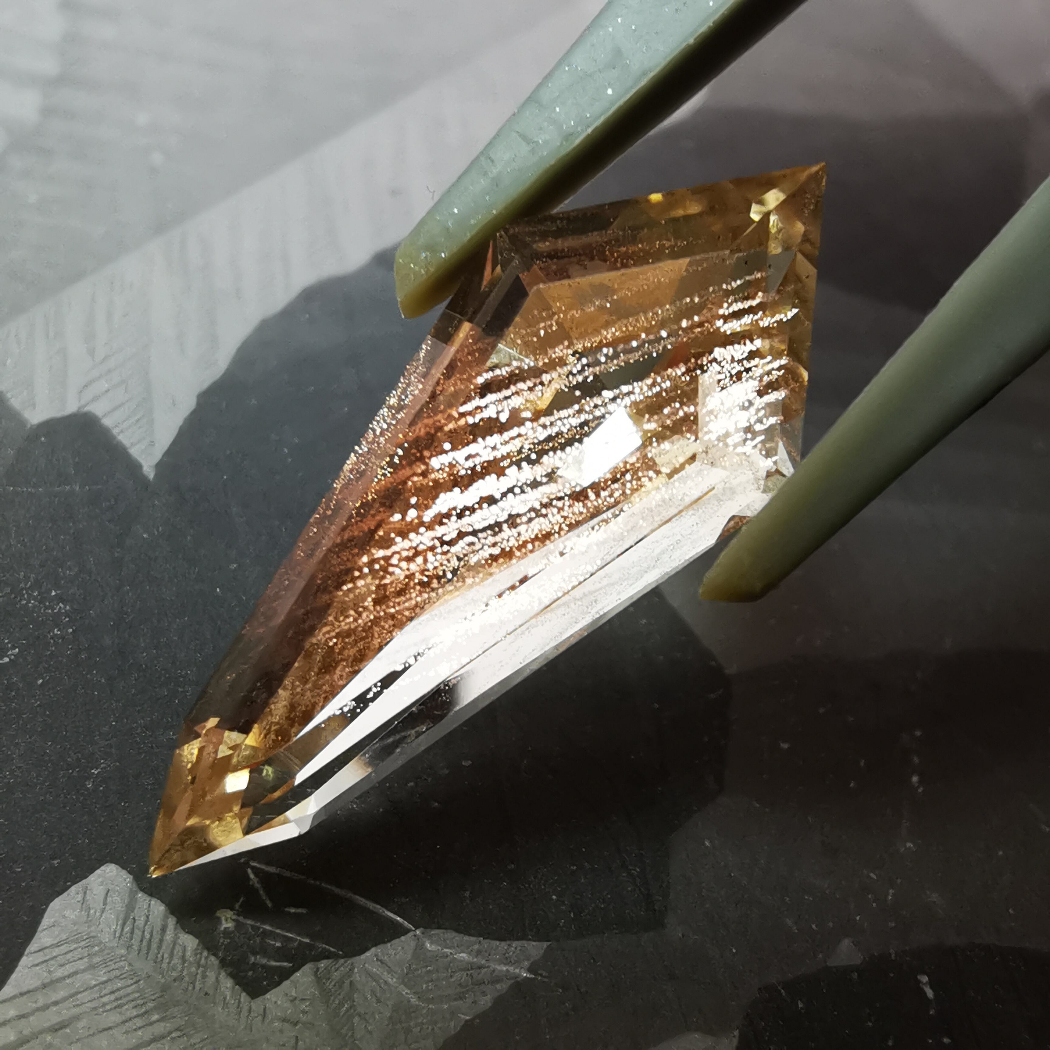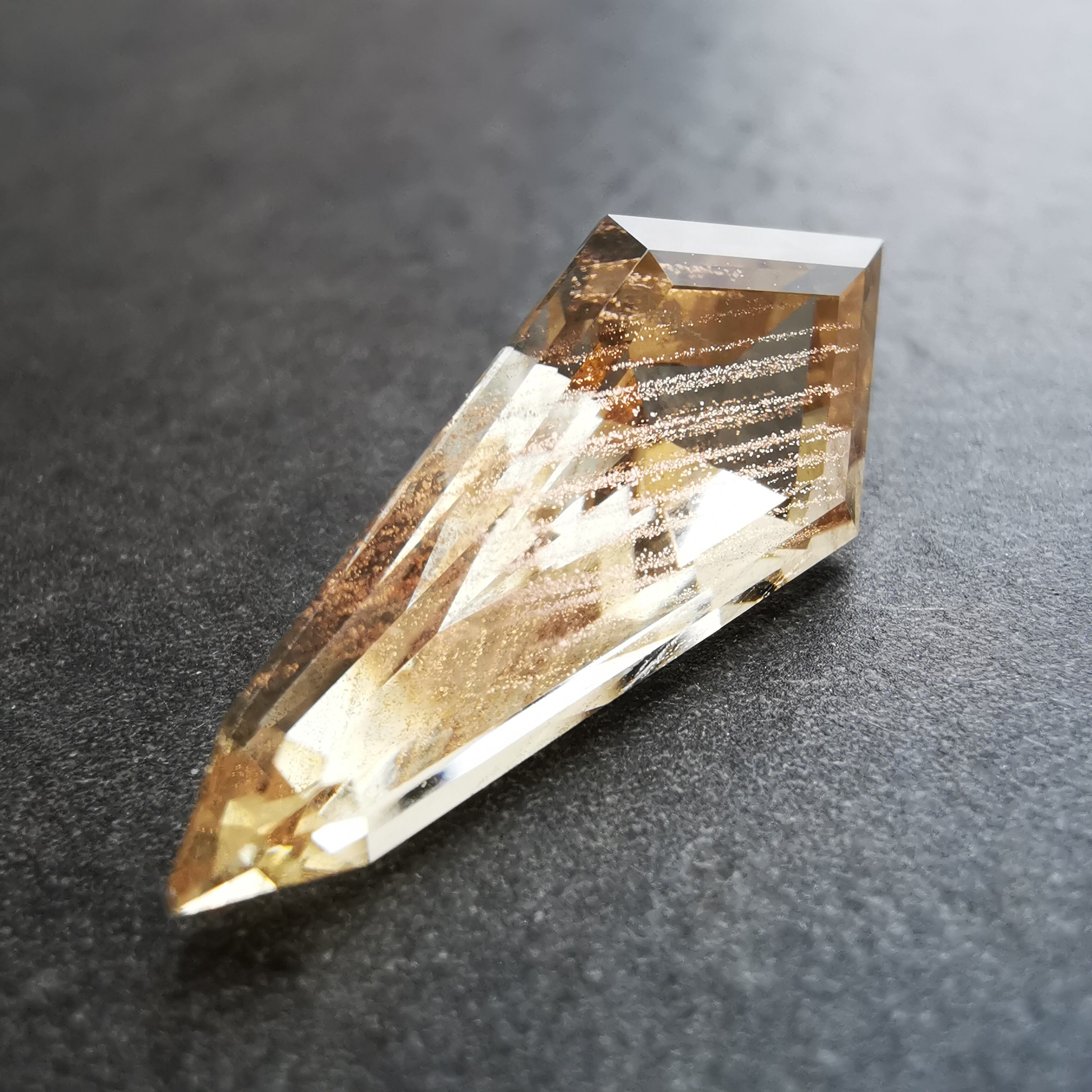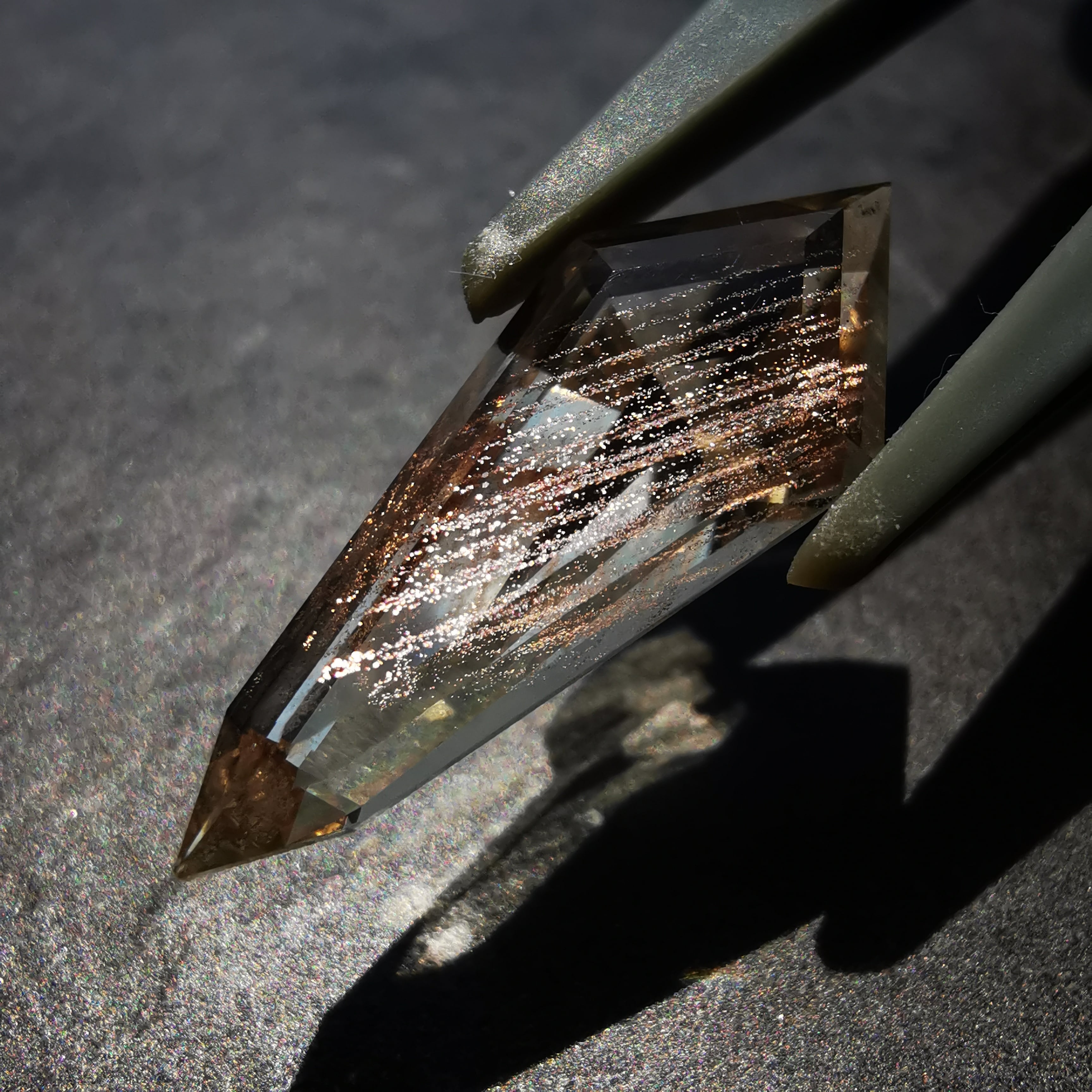 縦長のシールドカットのテーブル面を、流星群のようなアベンチュレッセンスがきらめきながら流れ落ちます。