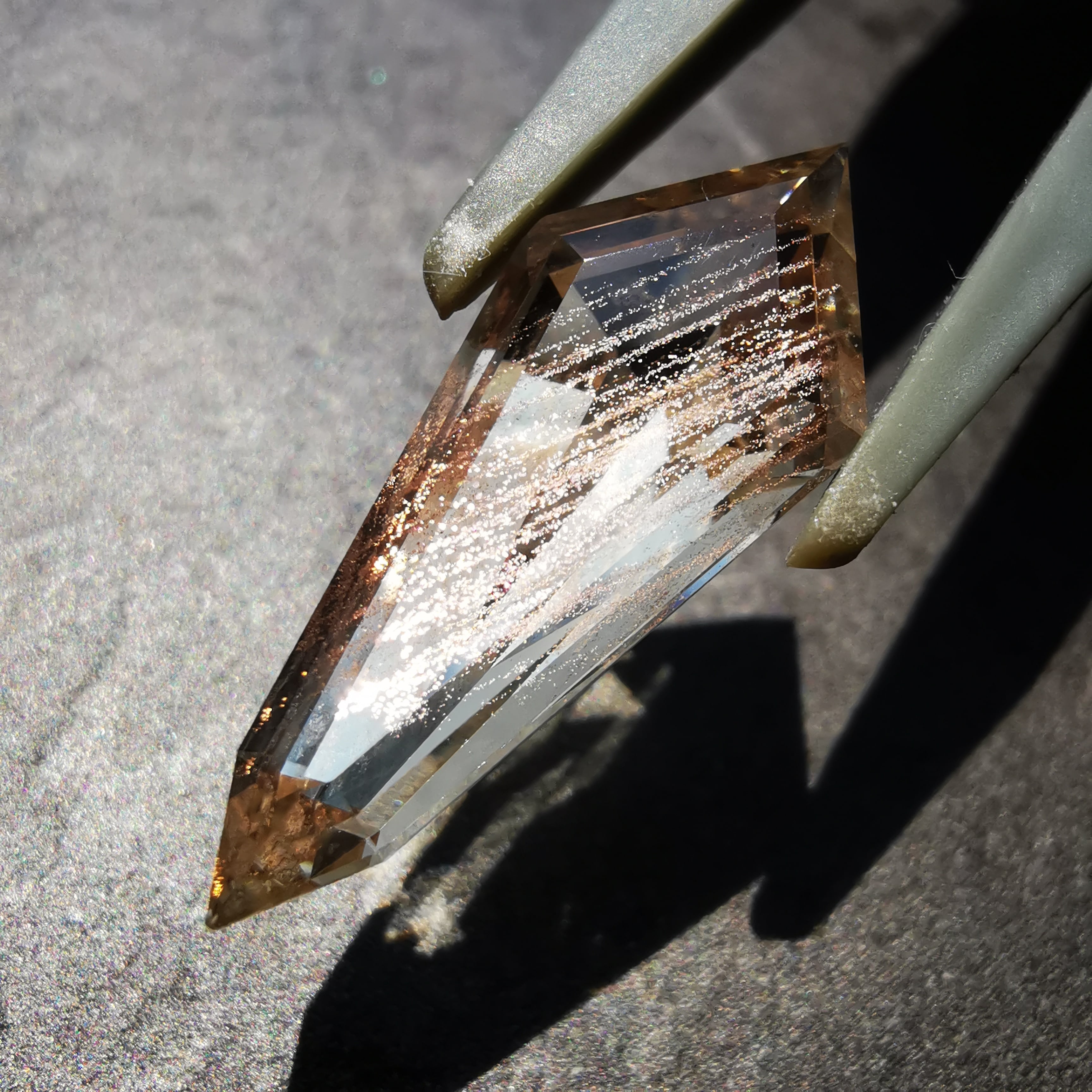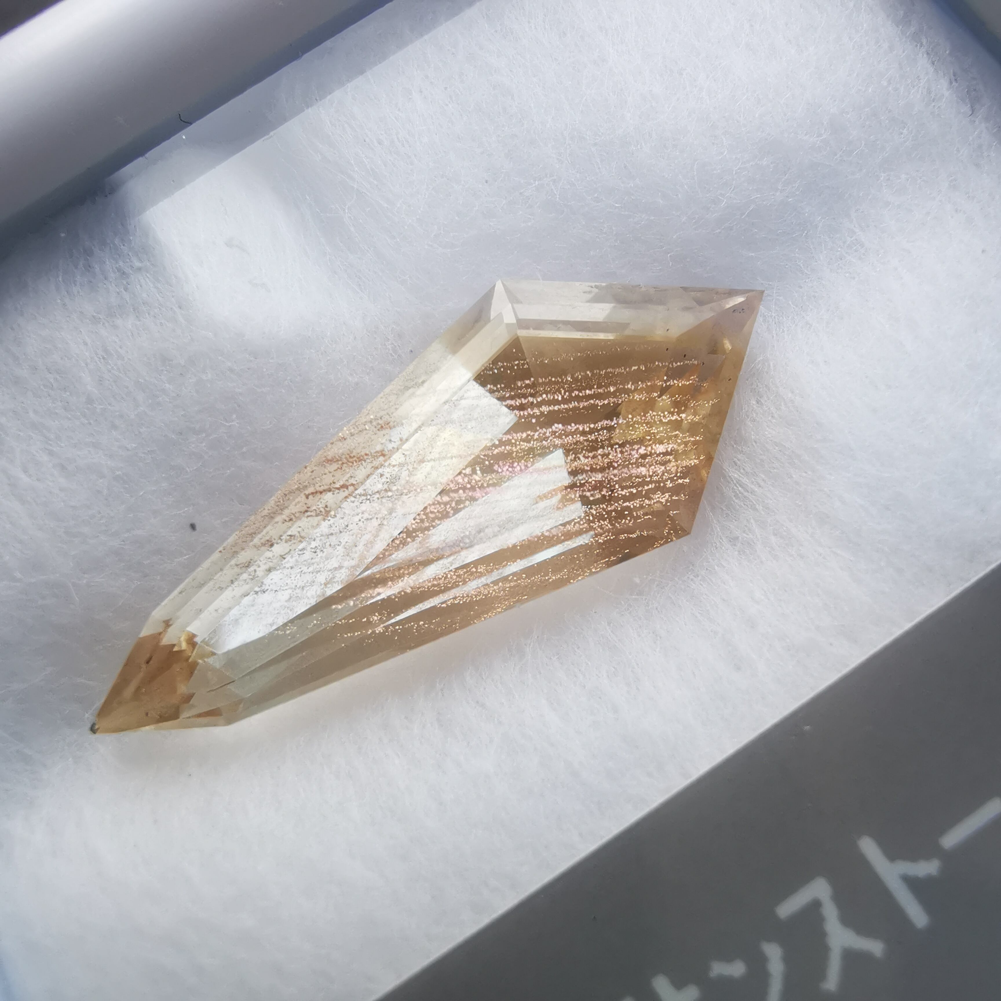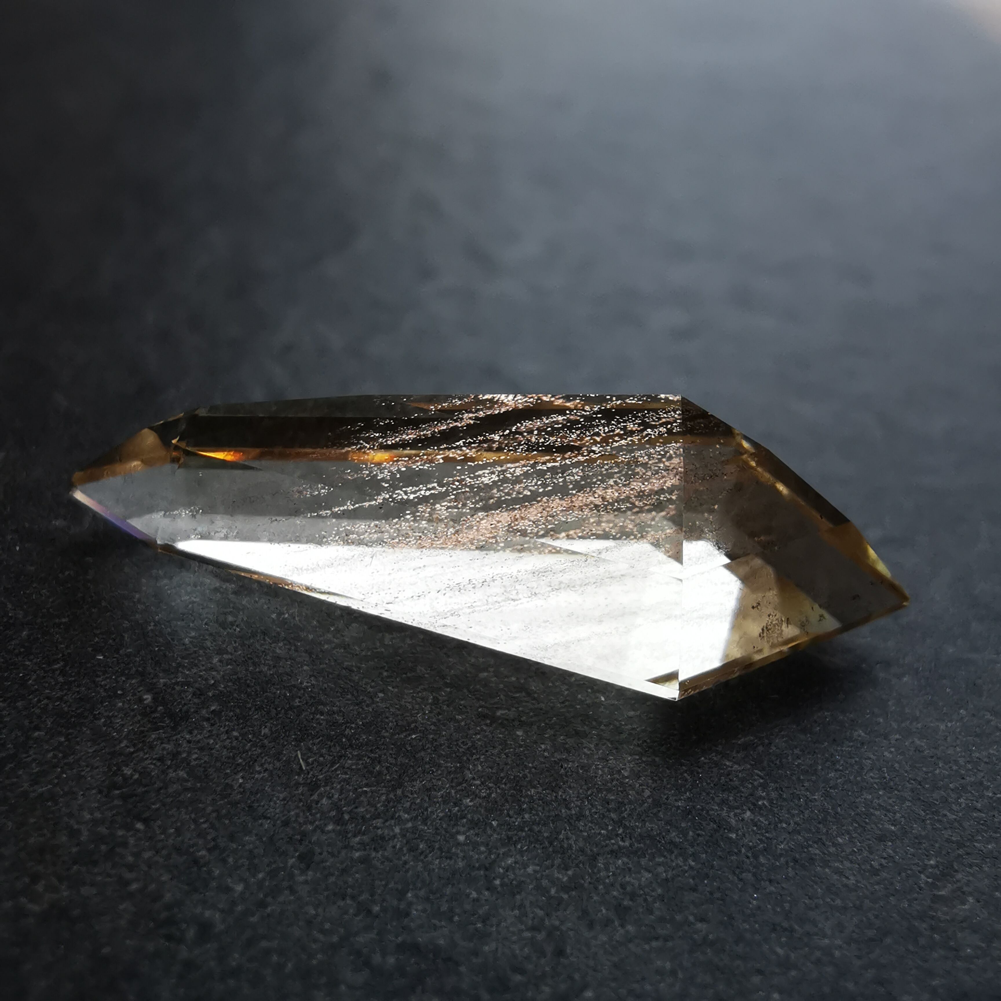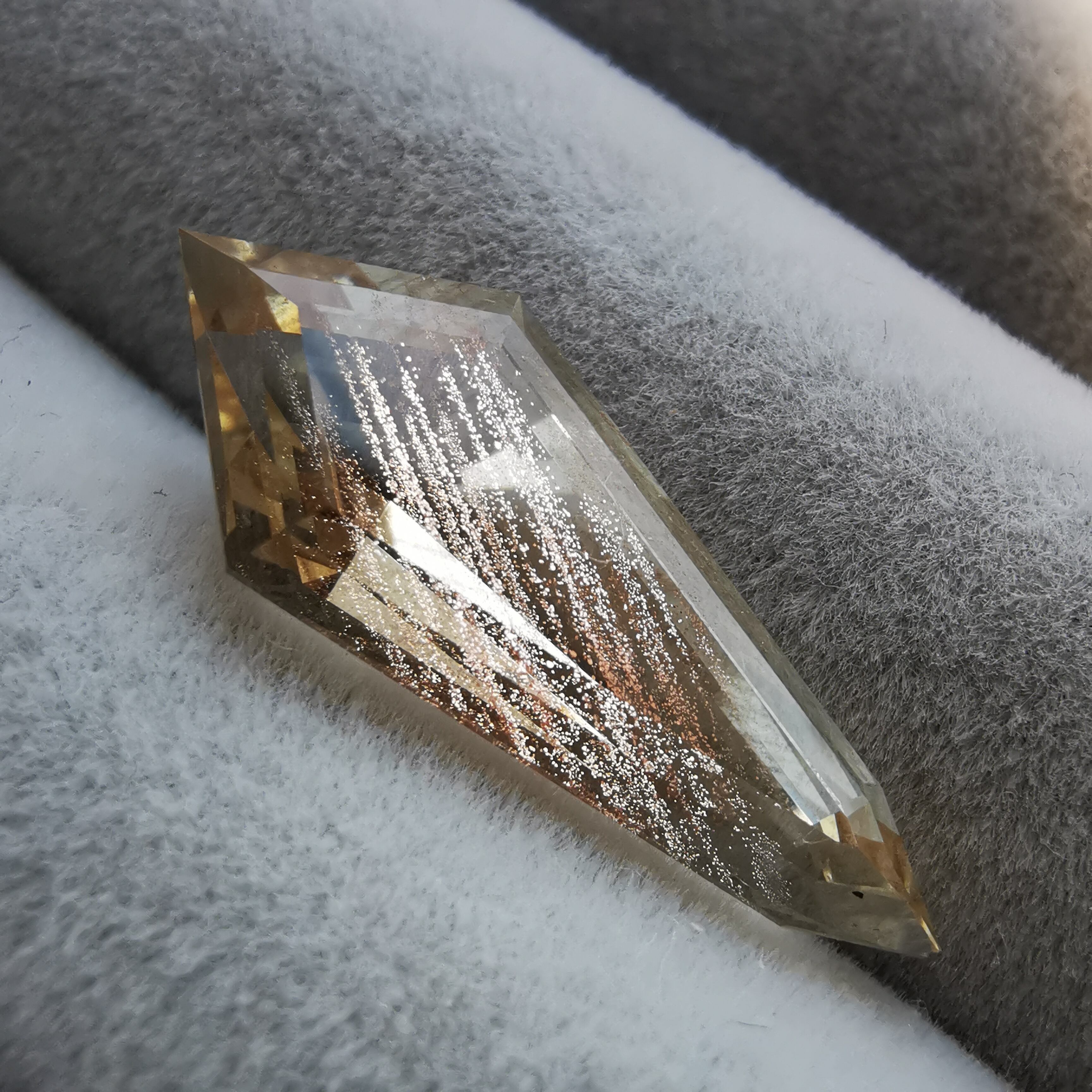 縦長のシールドカットのテーブル面を、流星群のようなアベンチュレッセンスがきらめきながら流れ落ちます。