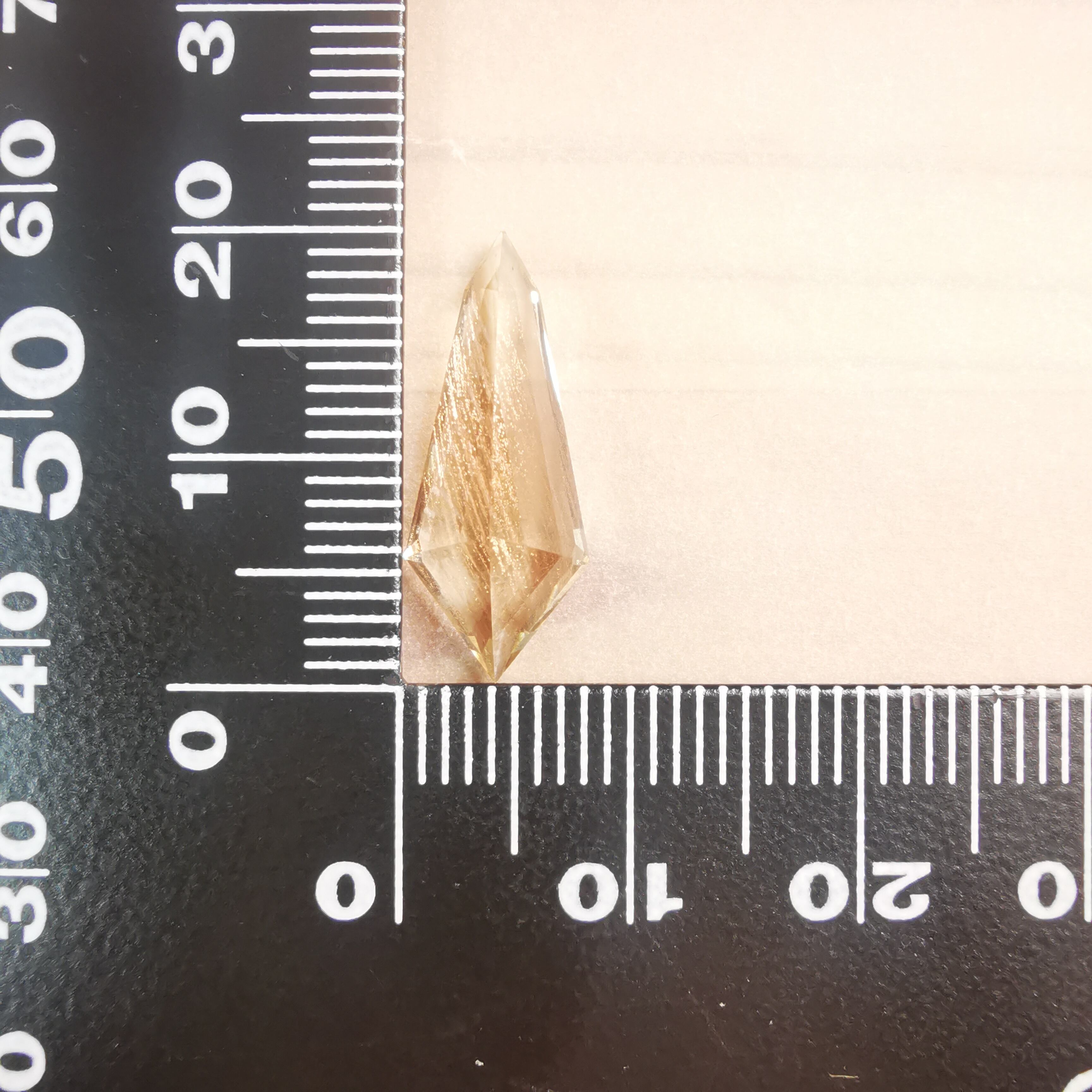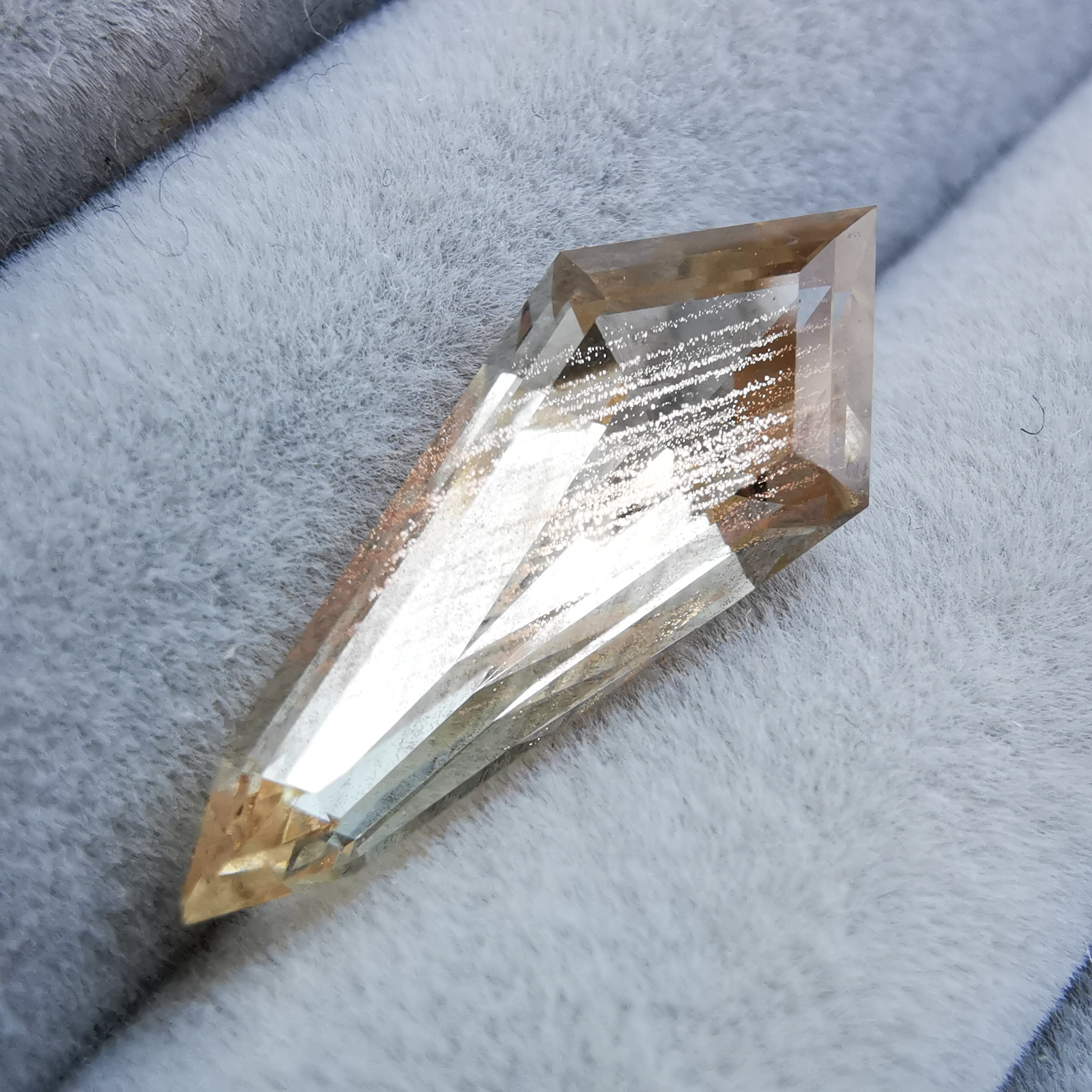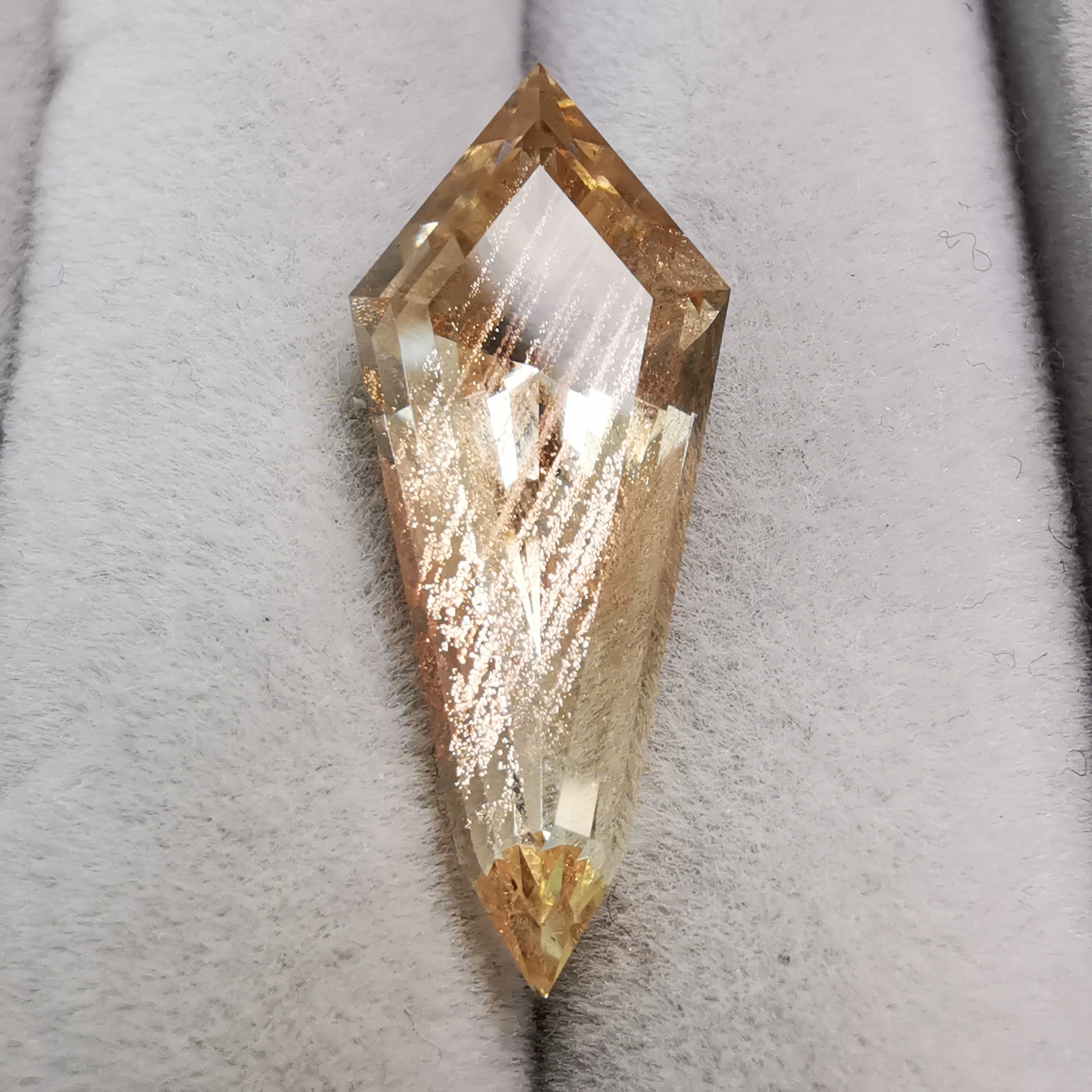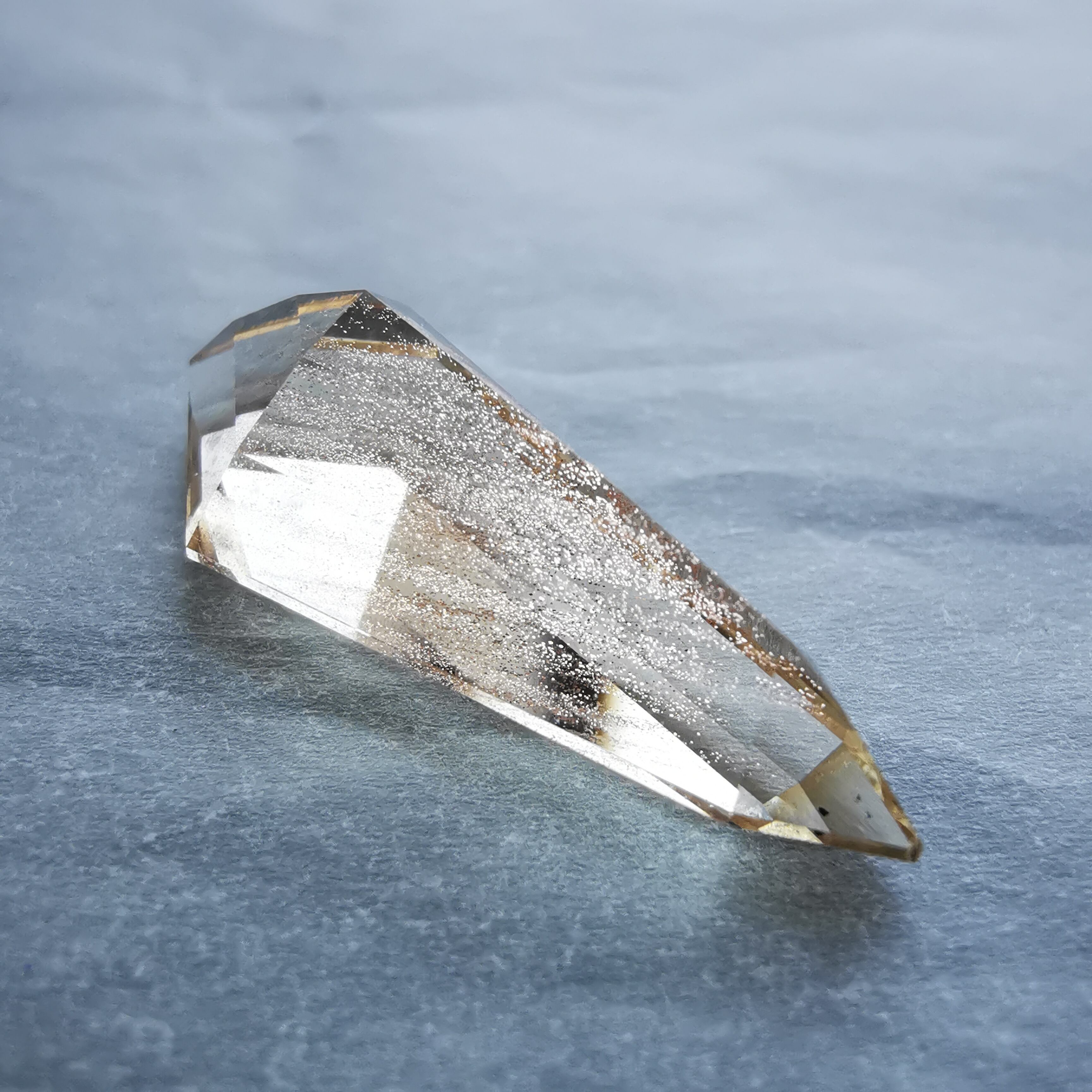 縦長のシールドカットのテーブル面を、流星群のようなアベンチュレッセンスがきらめきながら流れ落ちます。