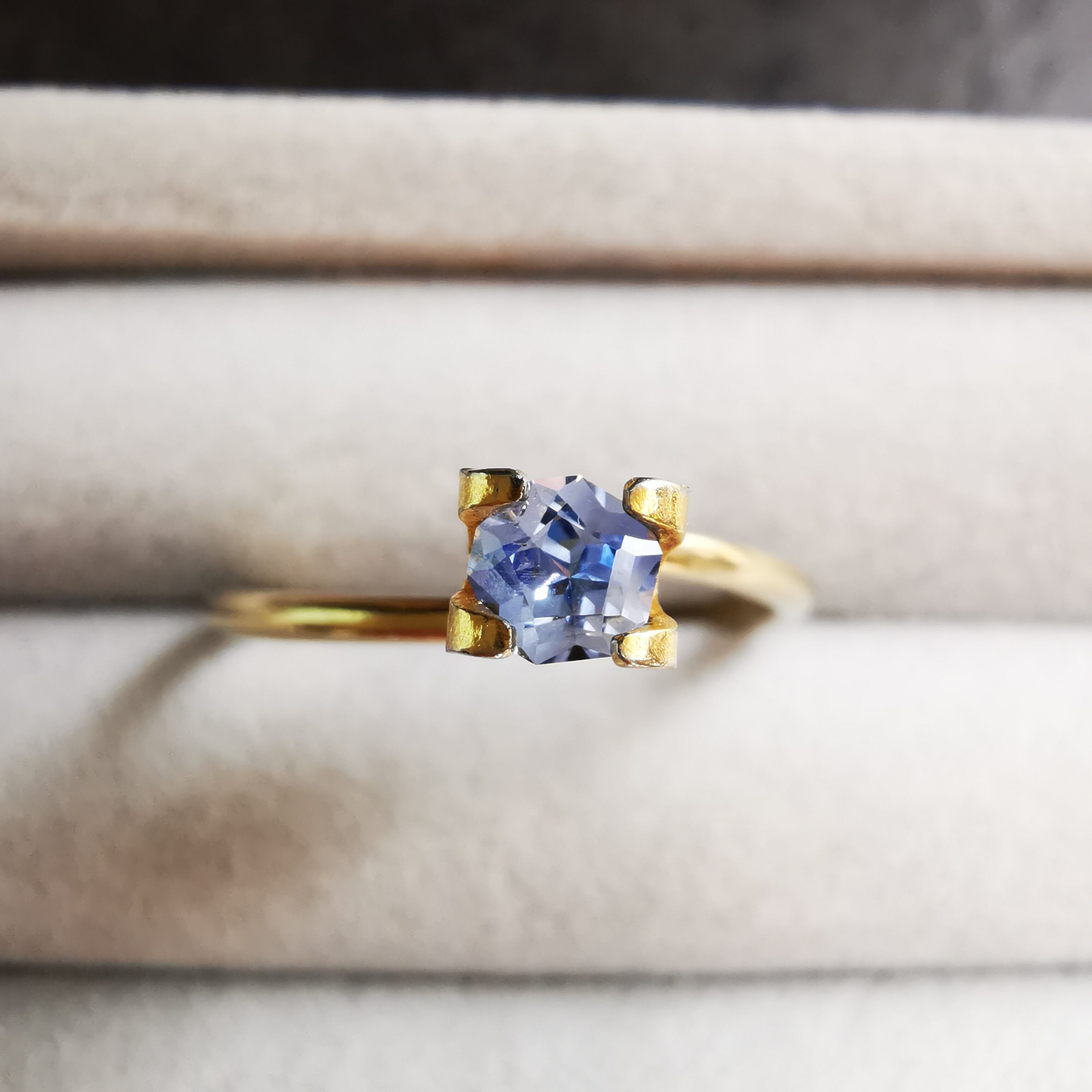 フラワーカットの青いサファイアは、小さくて可憐な勿忘草のような印象です。