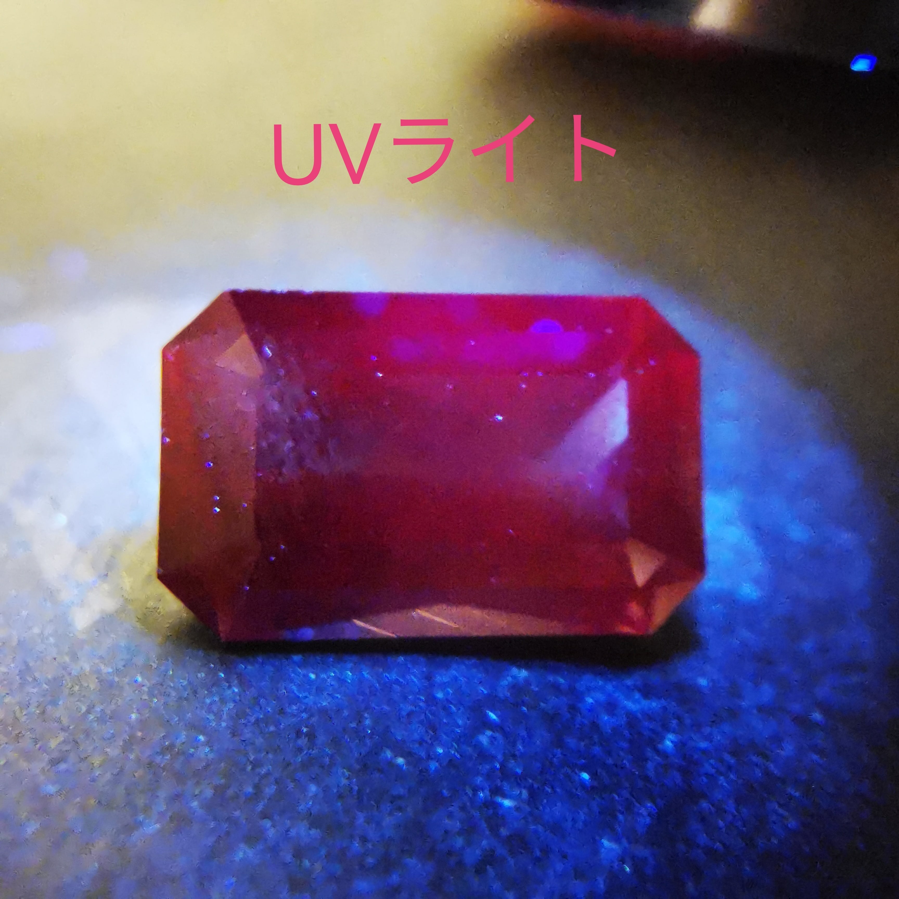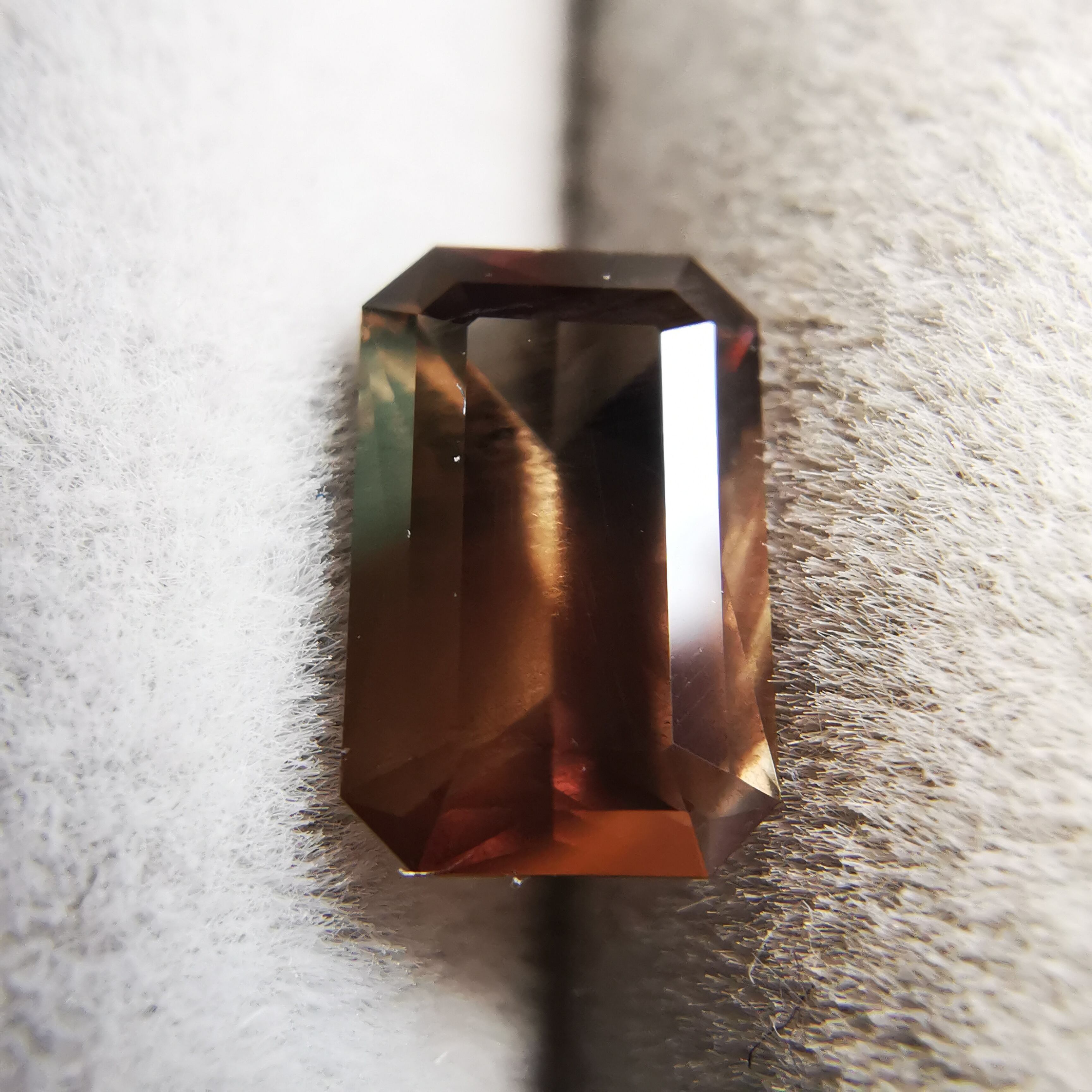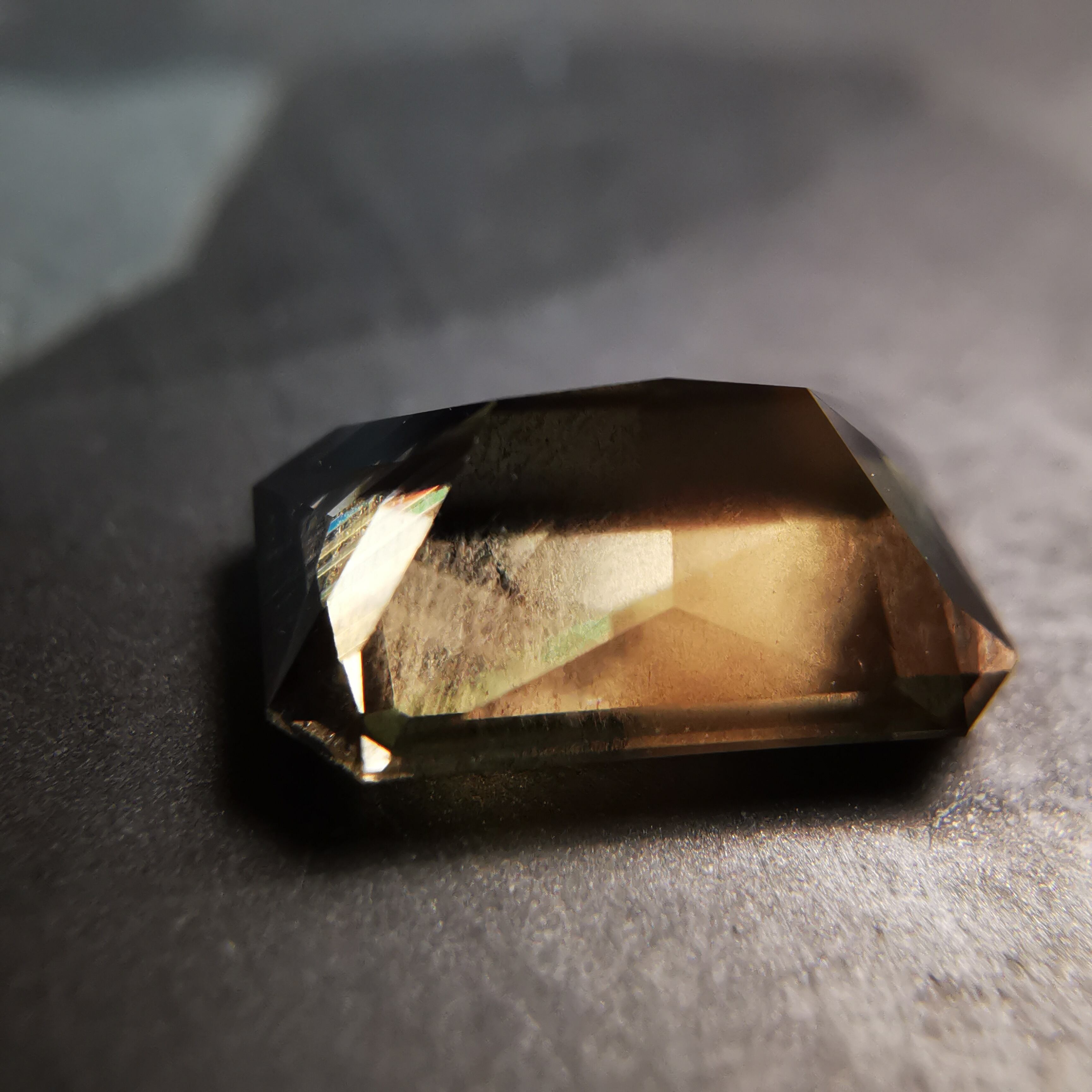 さらに、ある一定の角度から見ると、石の中を斜めに走る色帯のようなものが見え、パビリオンではその色帯がわずかに虹色に光ります。(写真14)
