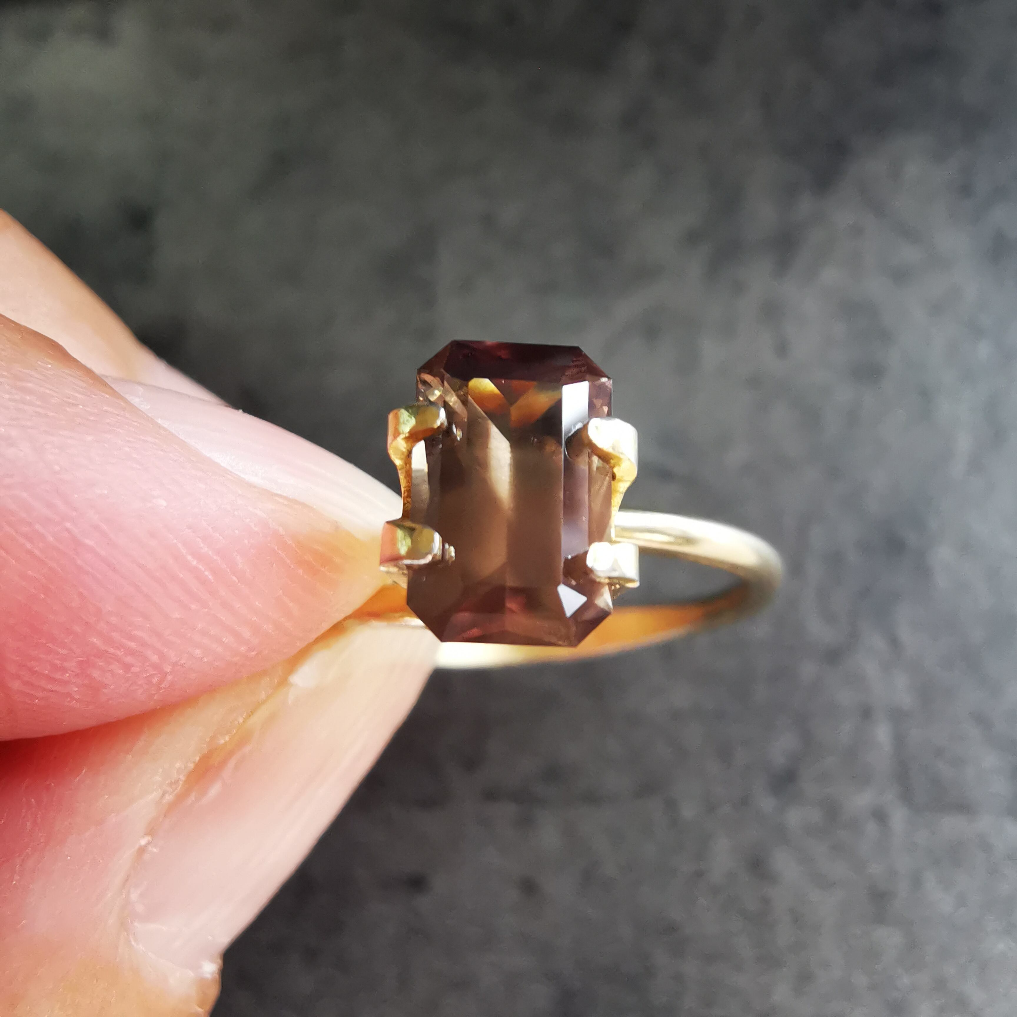 シラーは石の片側にやや偏って入っていて、光が届かない時は赤みを帯びているため赤茶っぽい印象で、強い光が当たるとシュワッと金色にきらめきます。