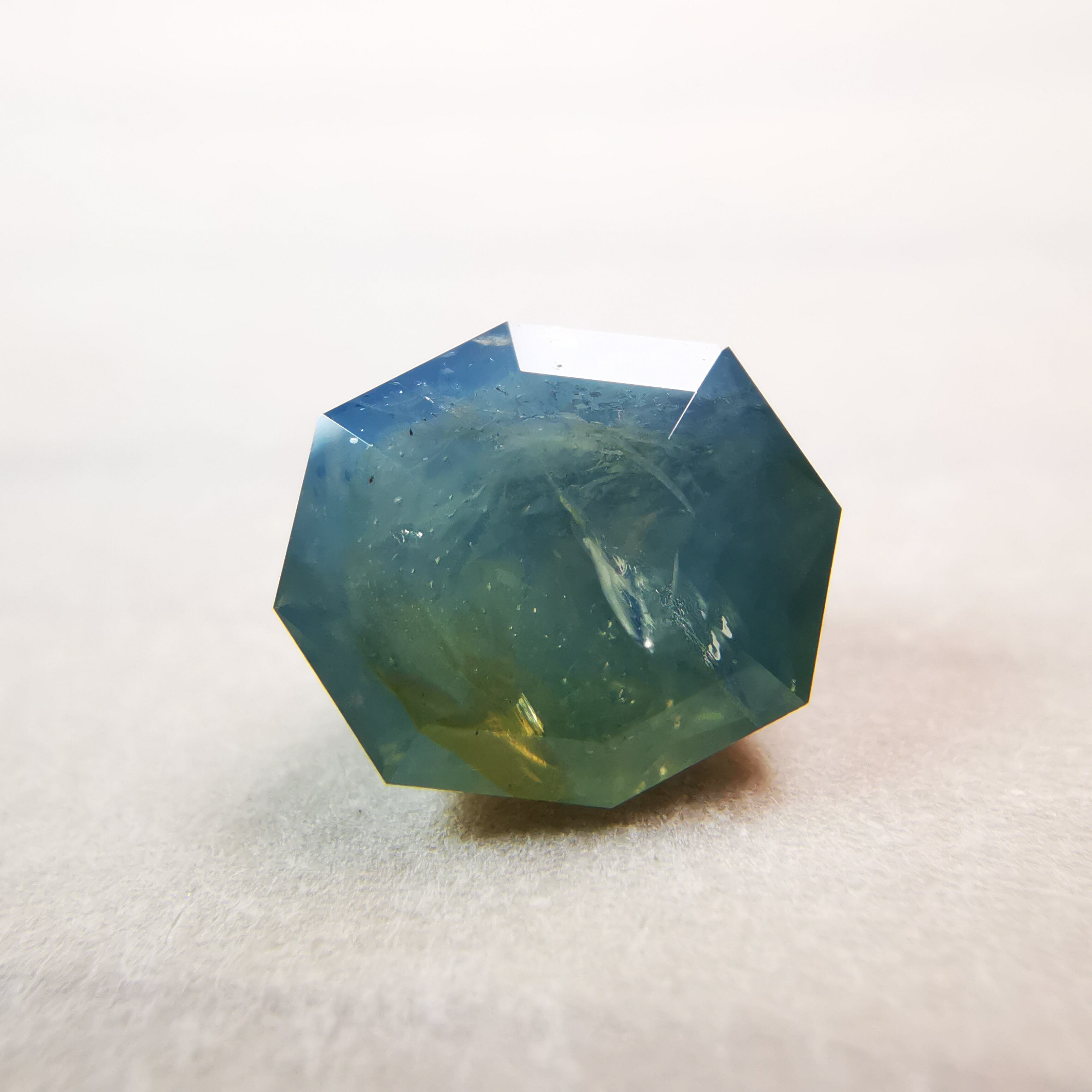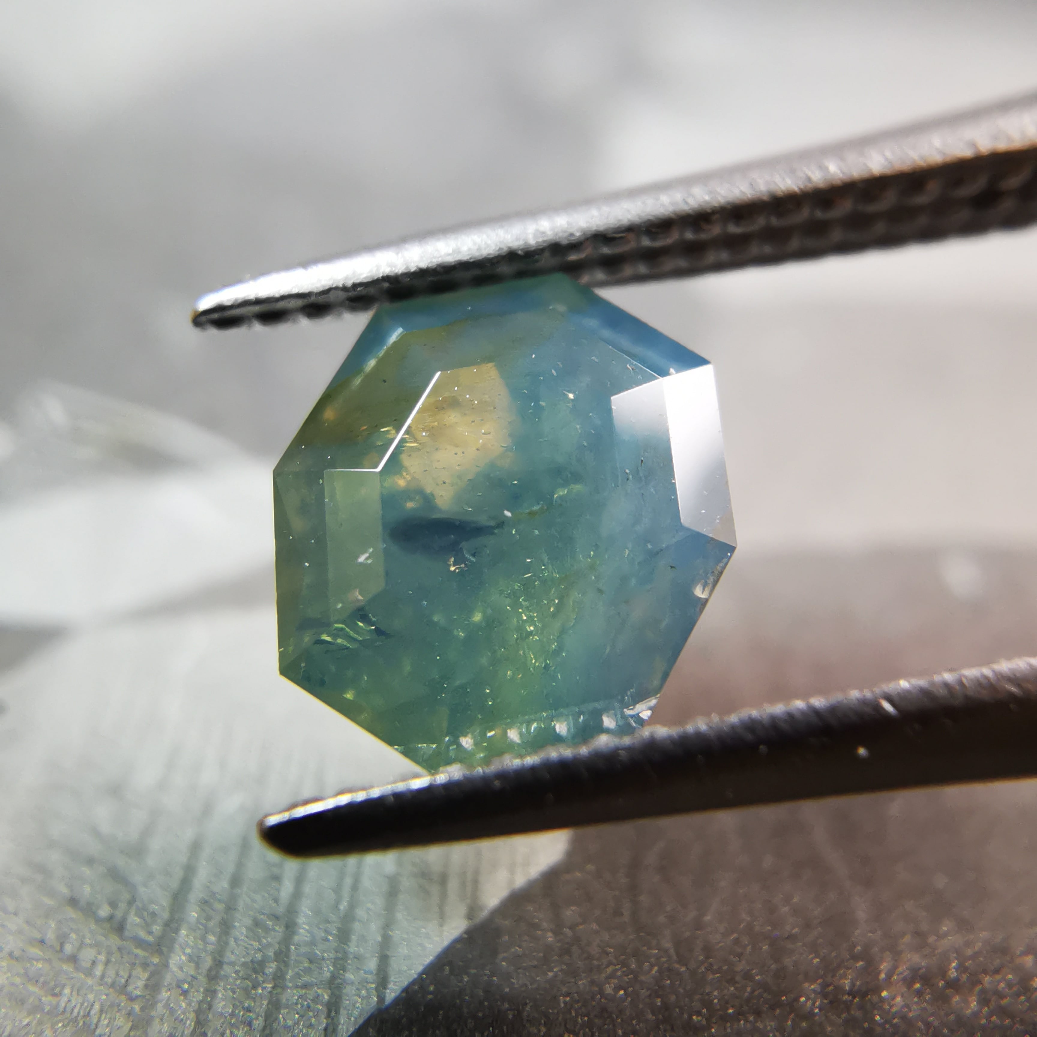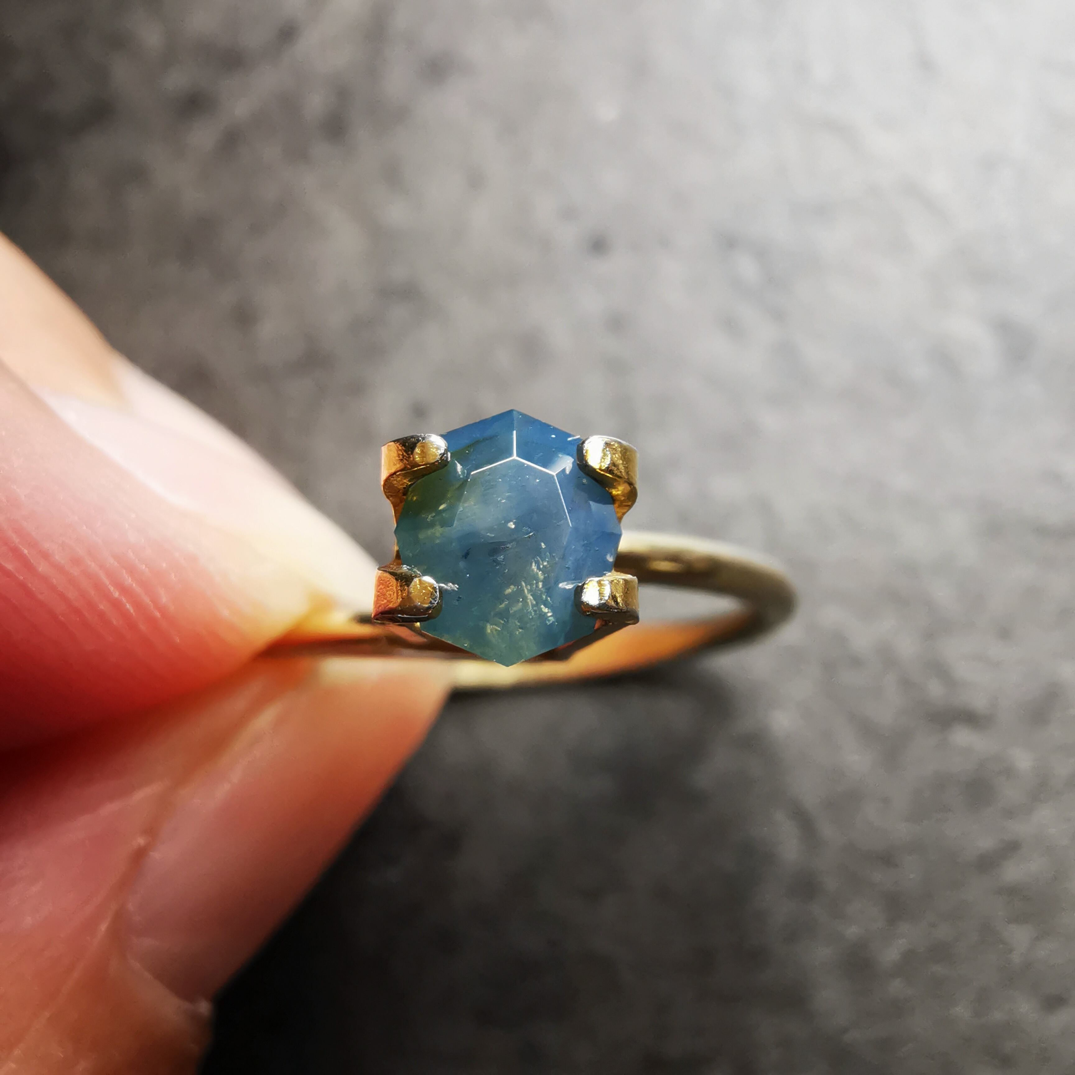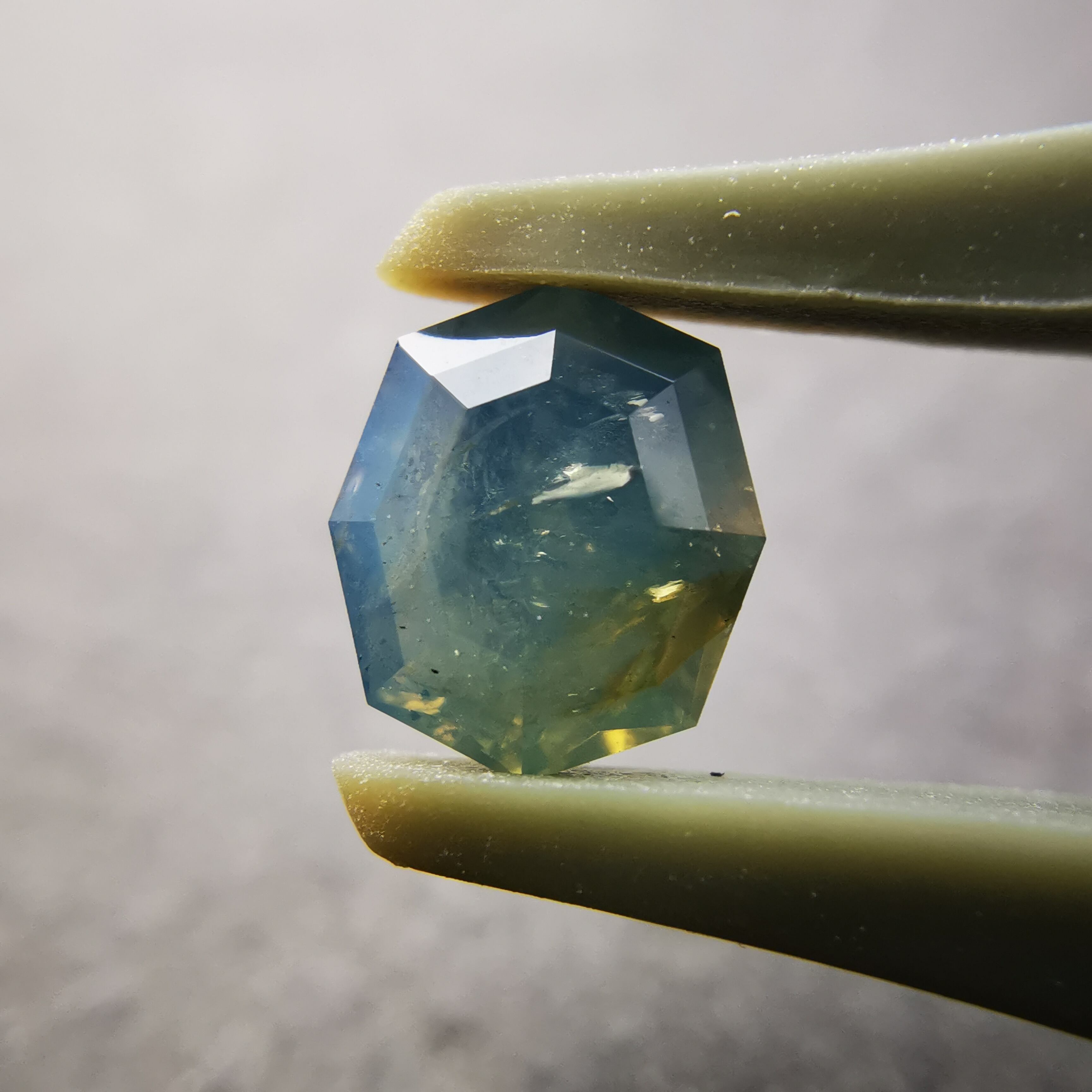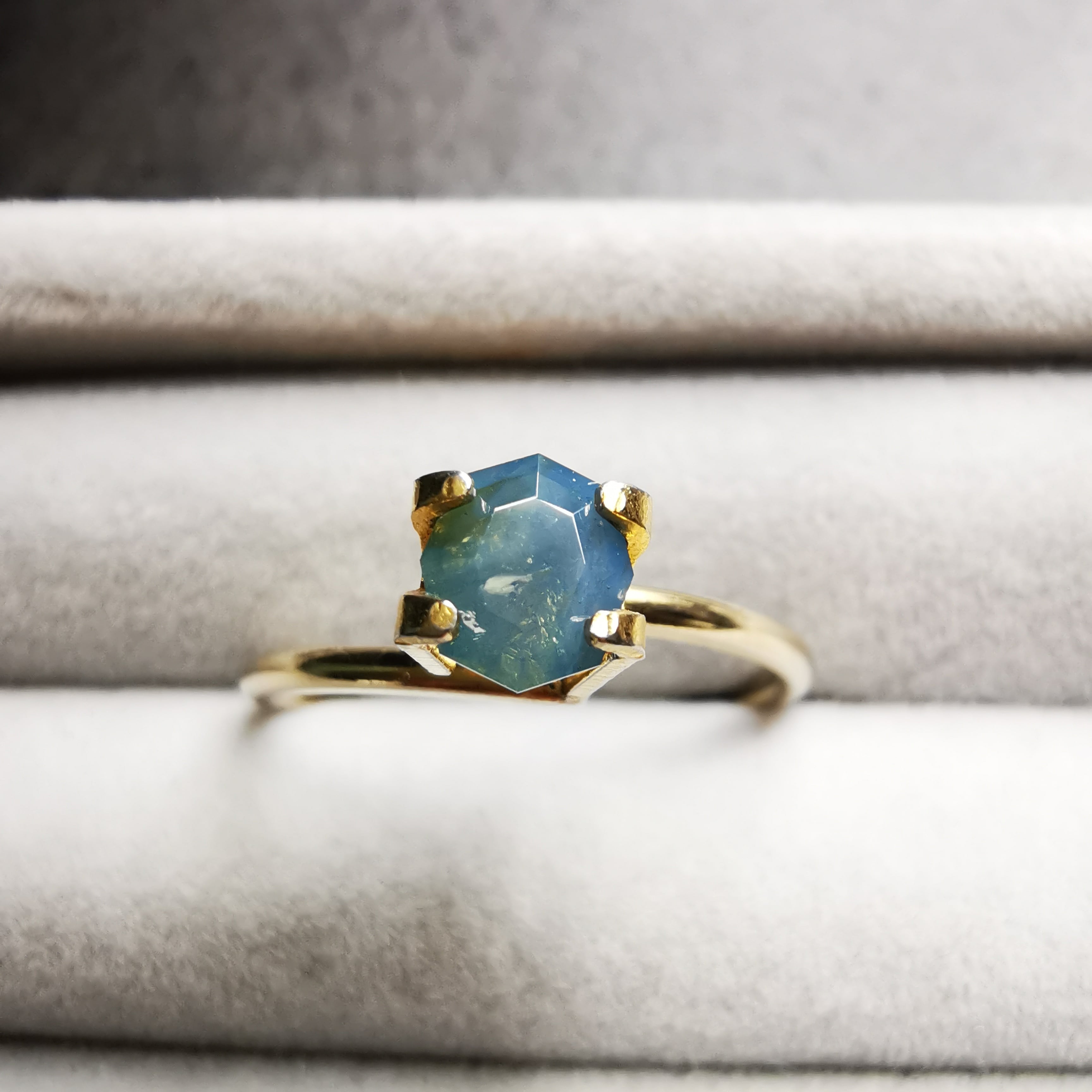 暗くくすんだ青みの緑/とくさ色のサファイアです。
