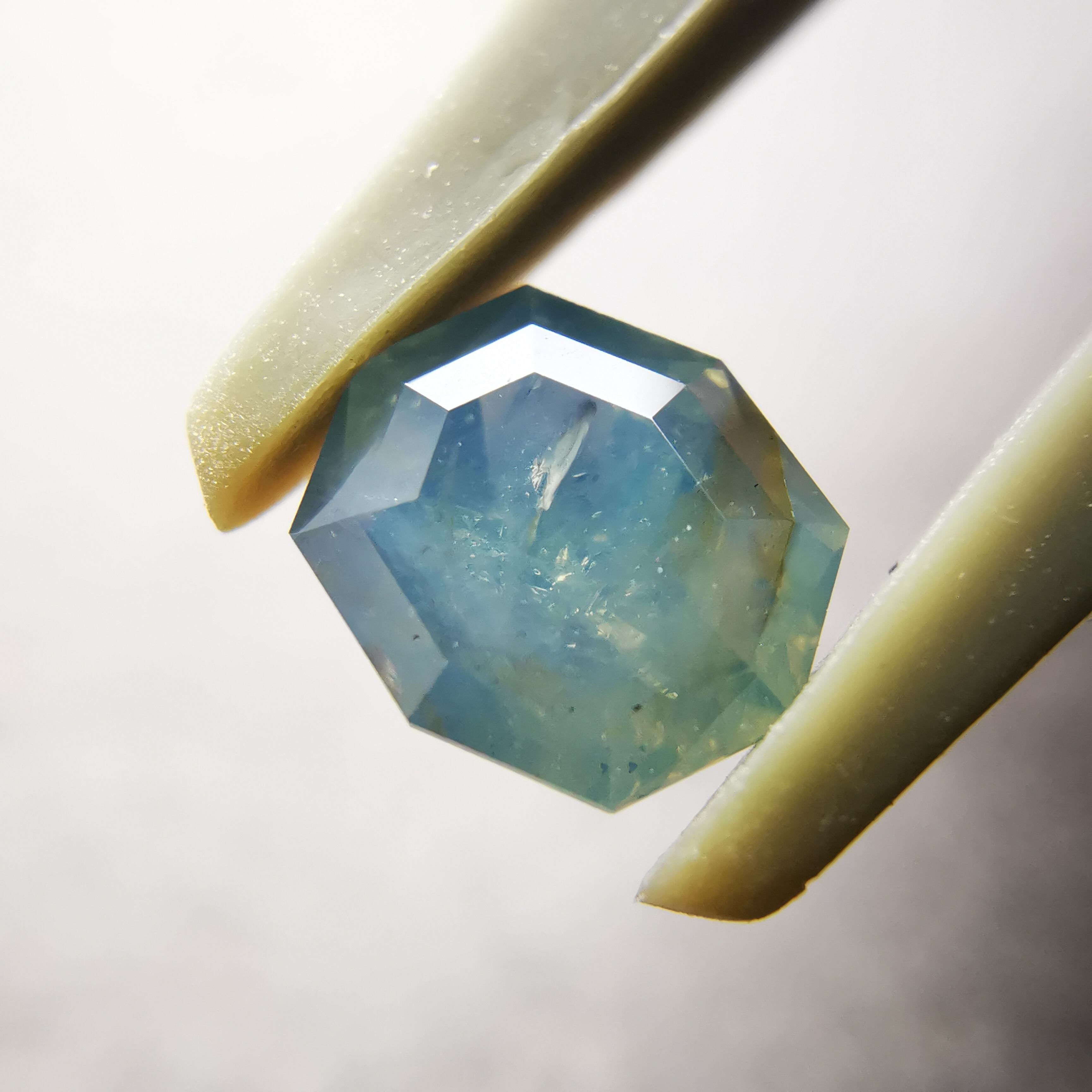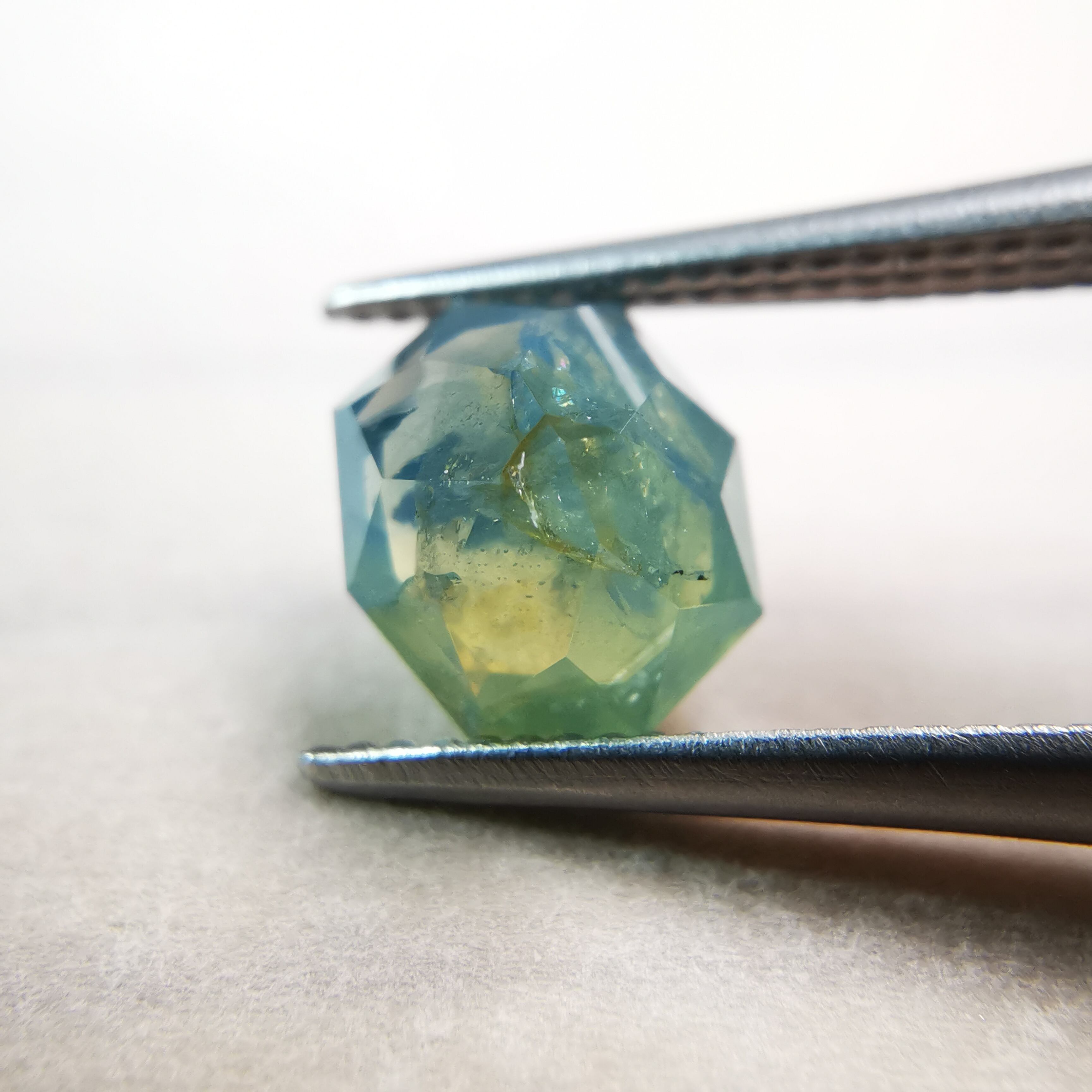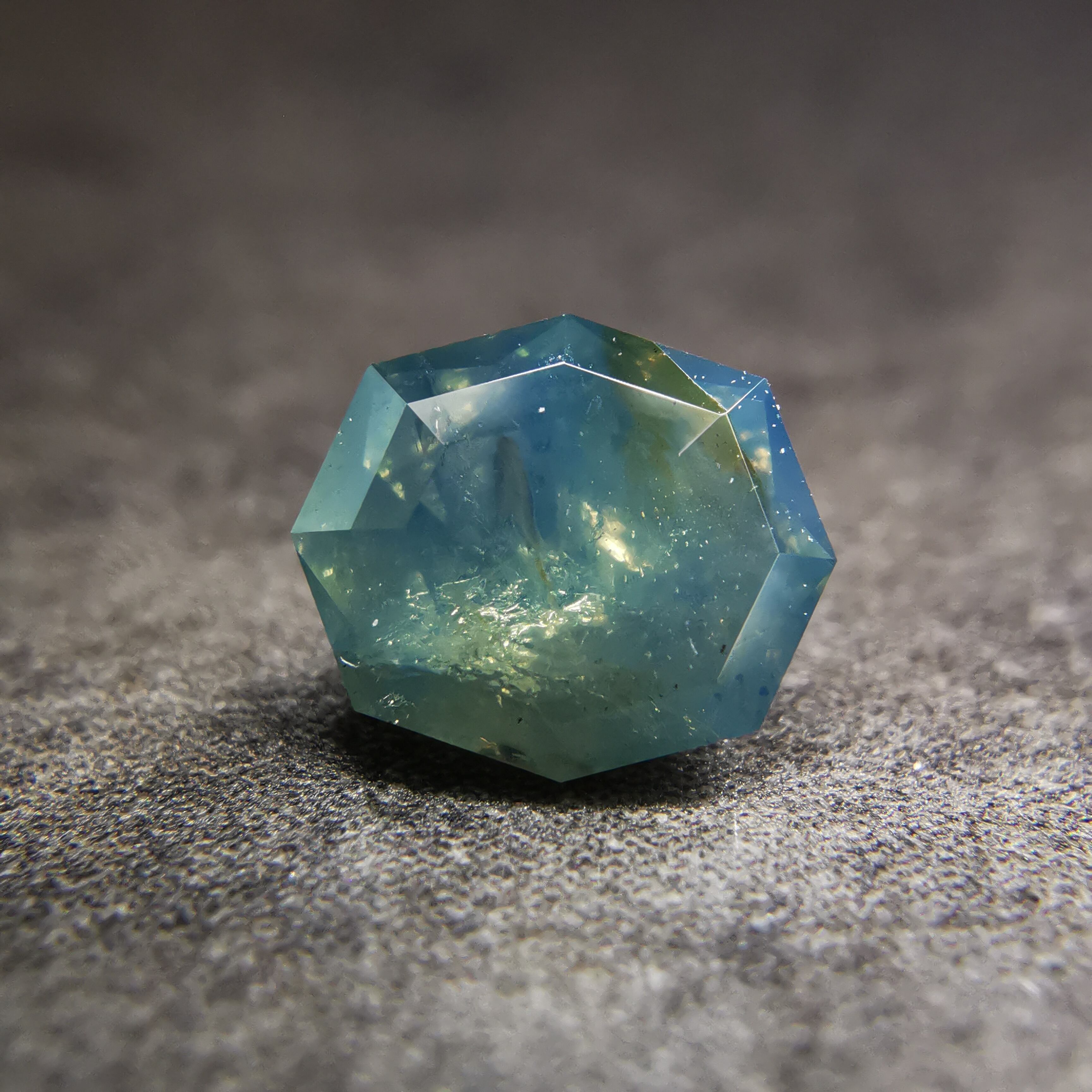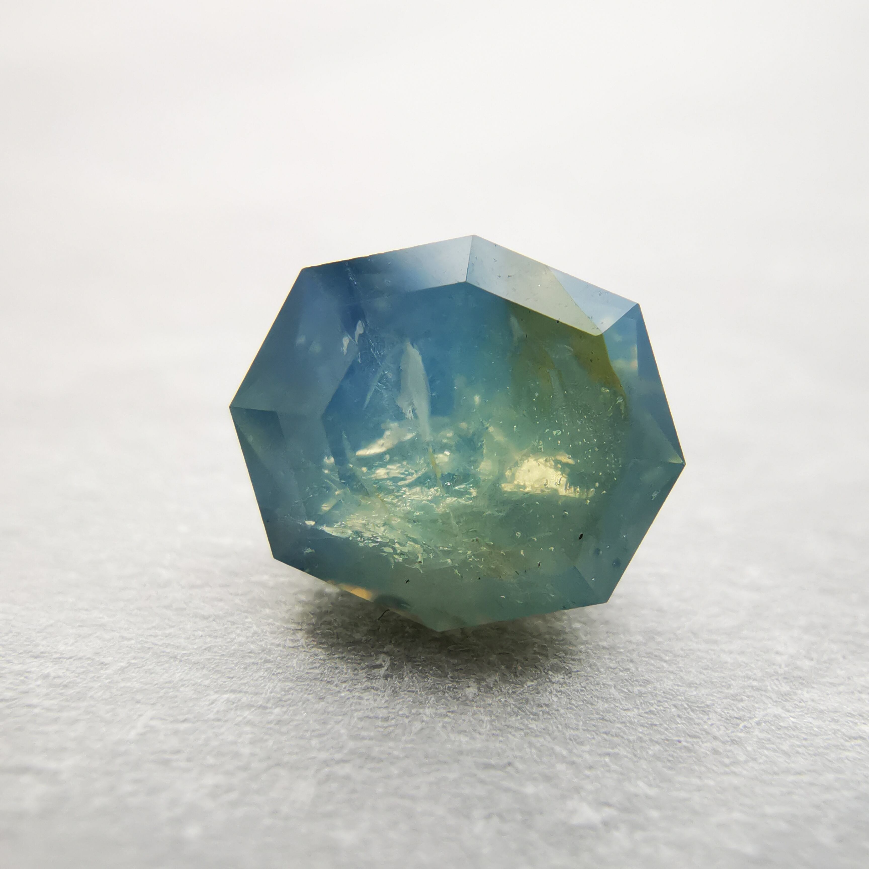 部分的に暗い青みや黄みが混じり、光が当たるとインクルージョンがちらちらと瞬き、複雑さをより増しています。