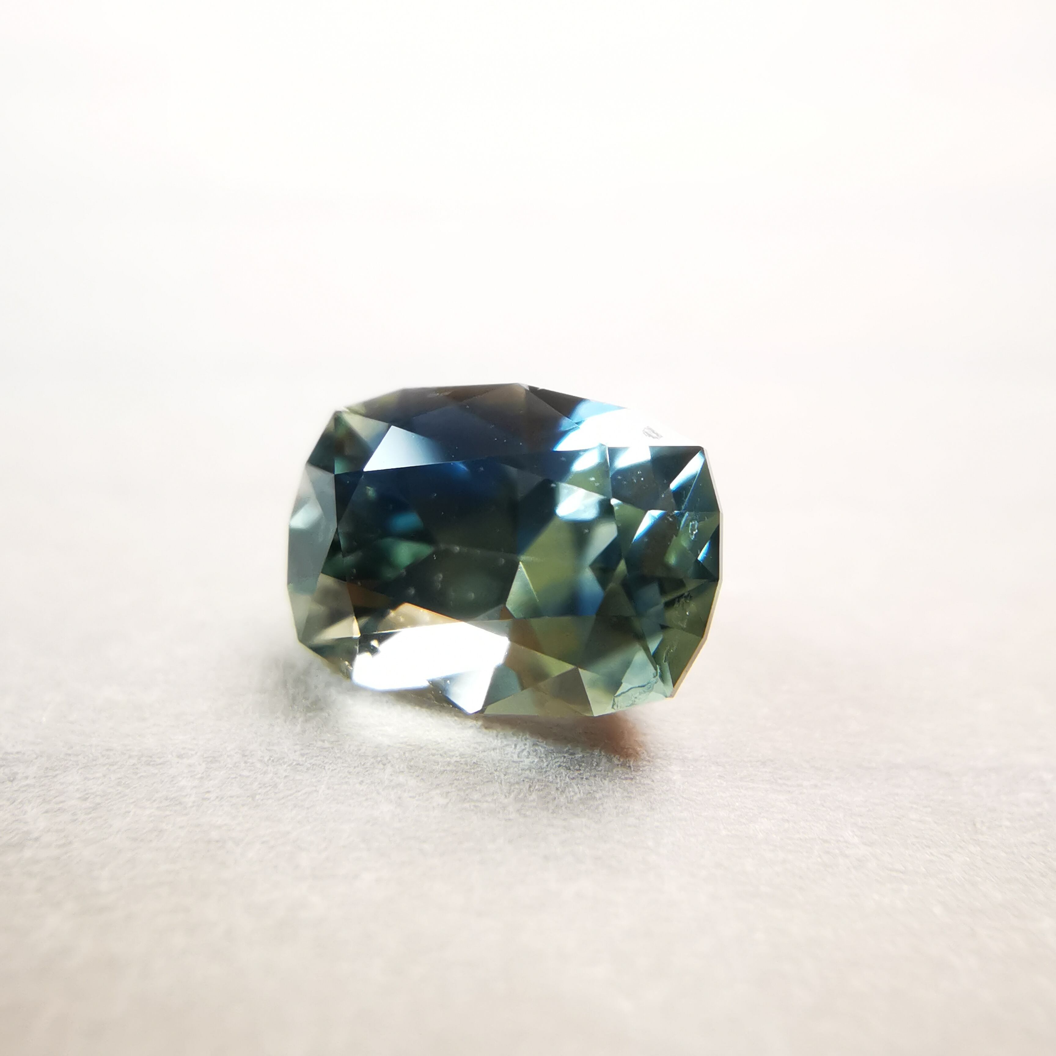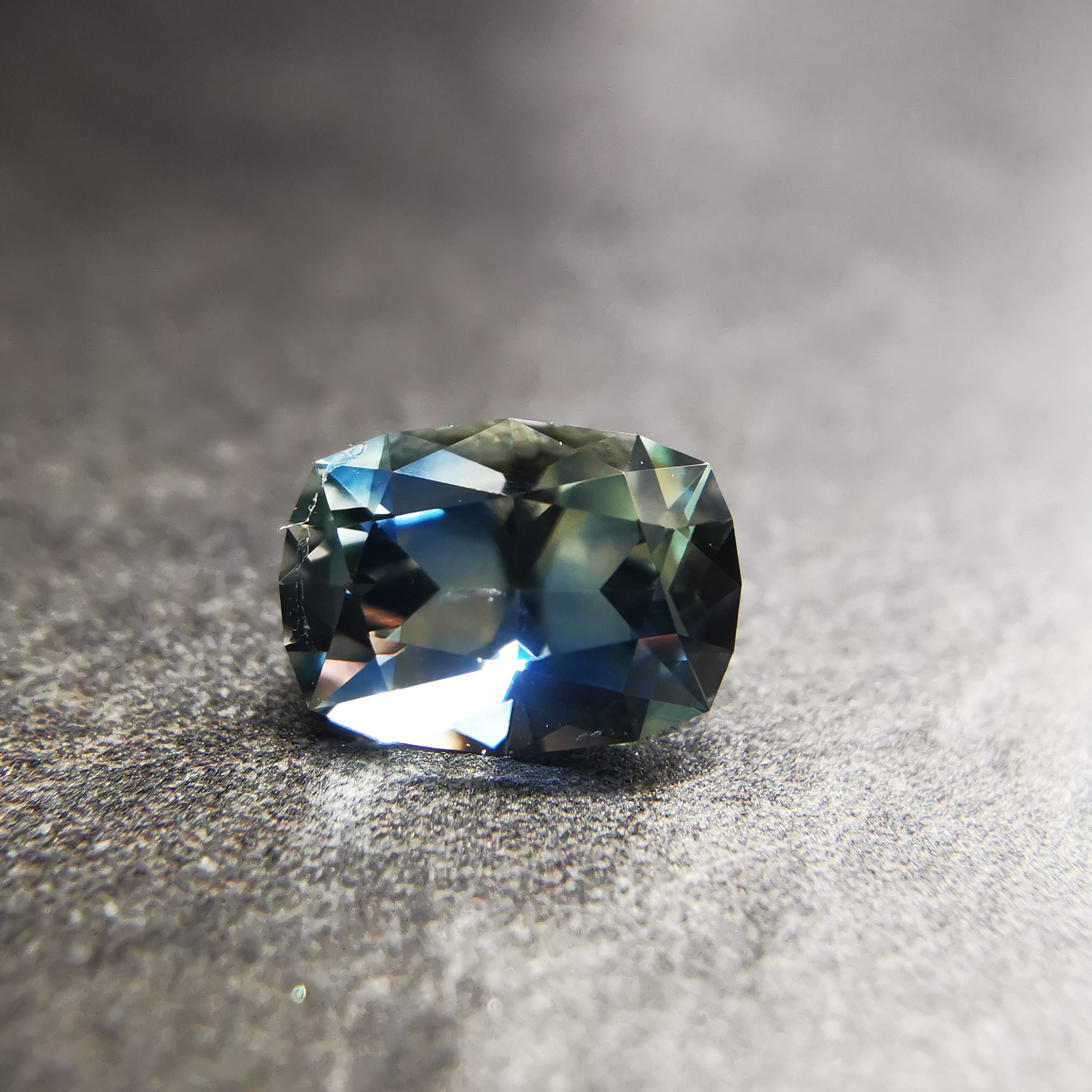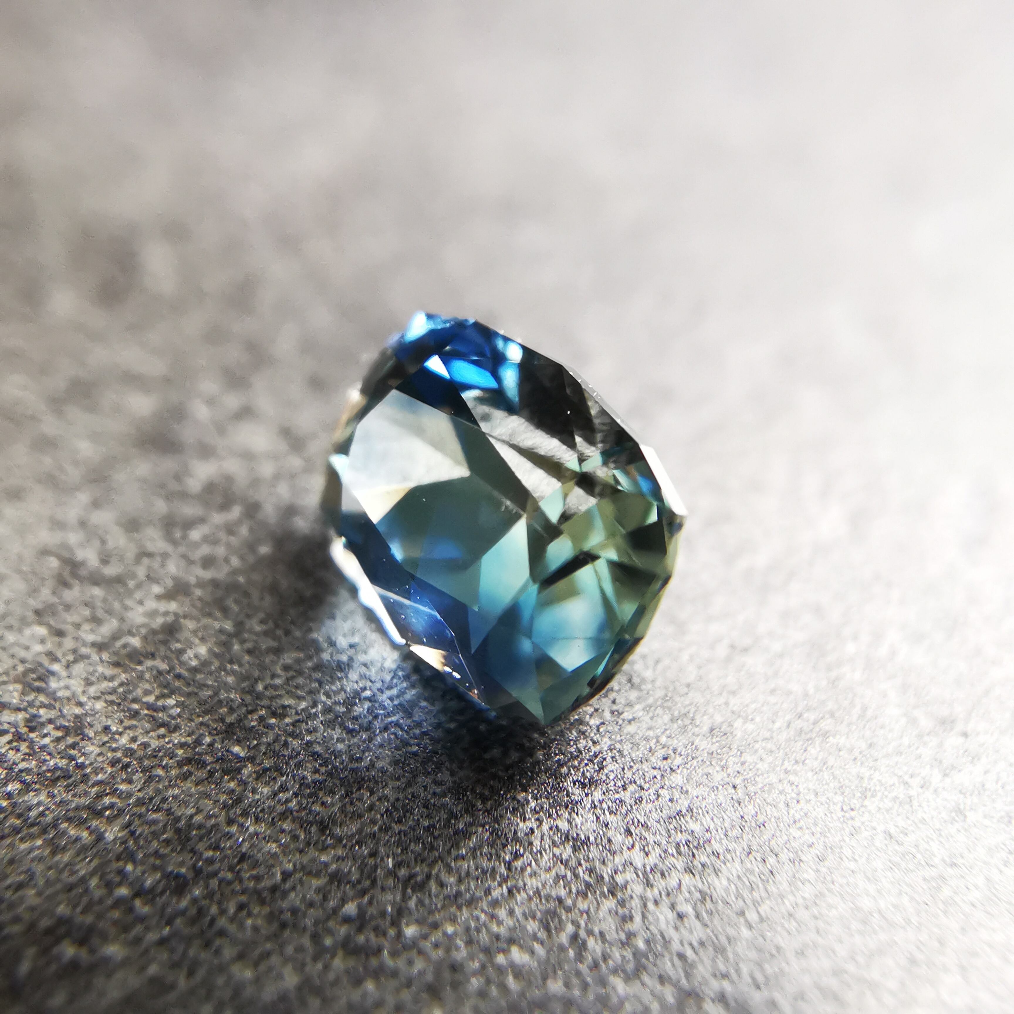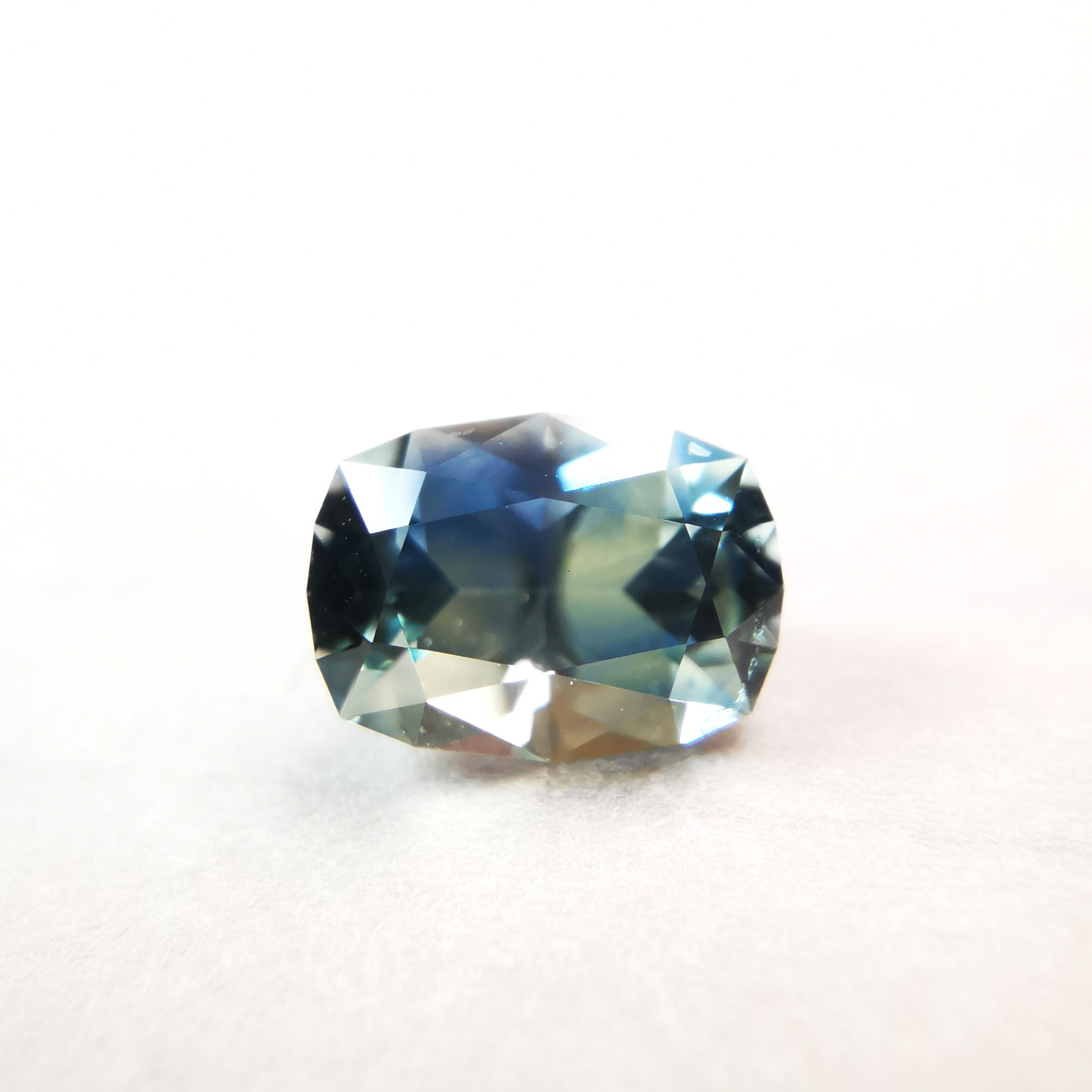 正面からは、片側が青み、もう片側が黄みのバイカラーであることがはっきりとわかりますが、その境界は緩くじわりと交わります。