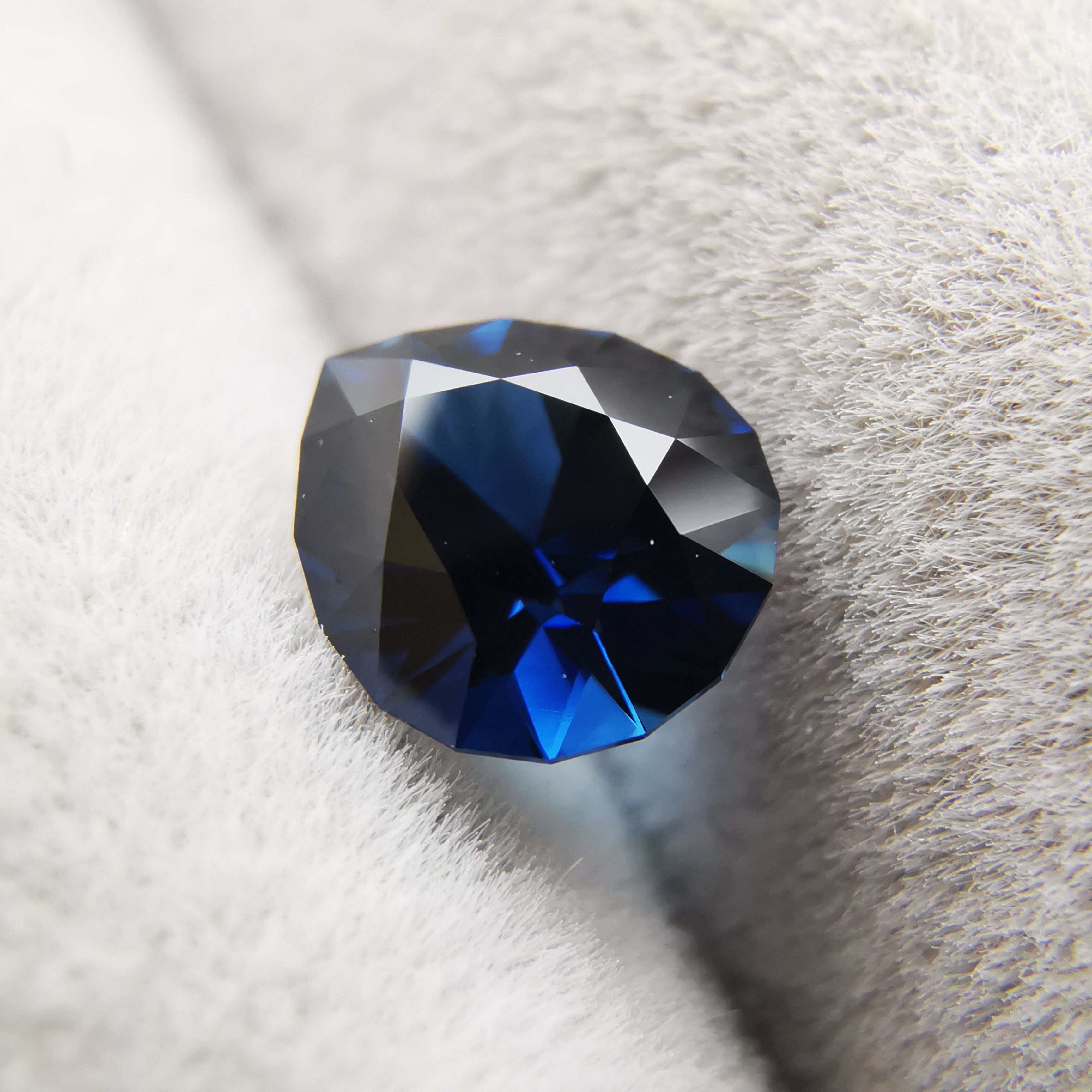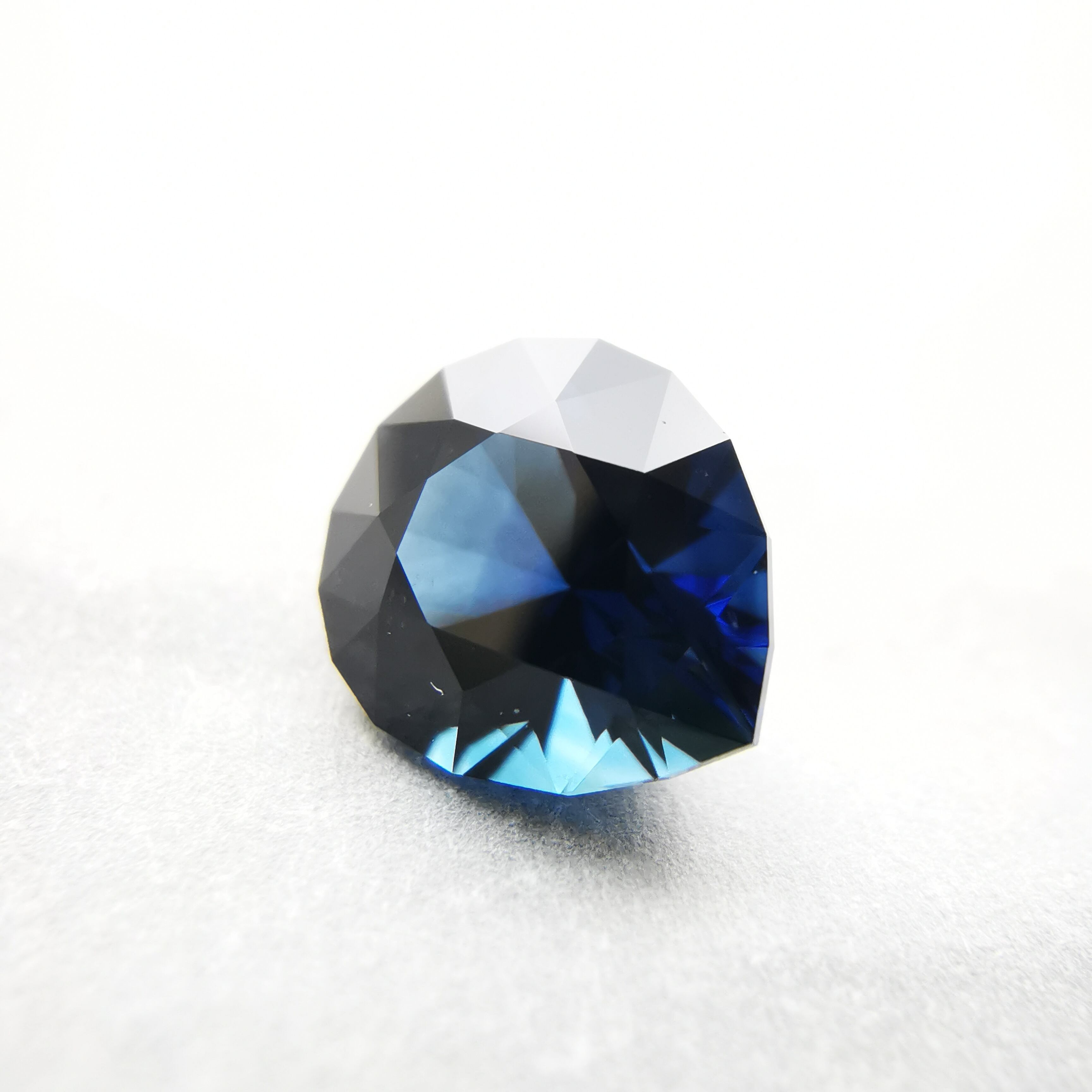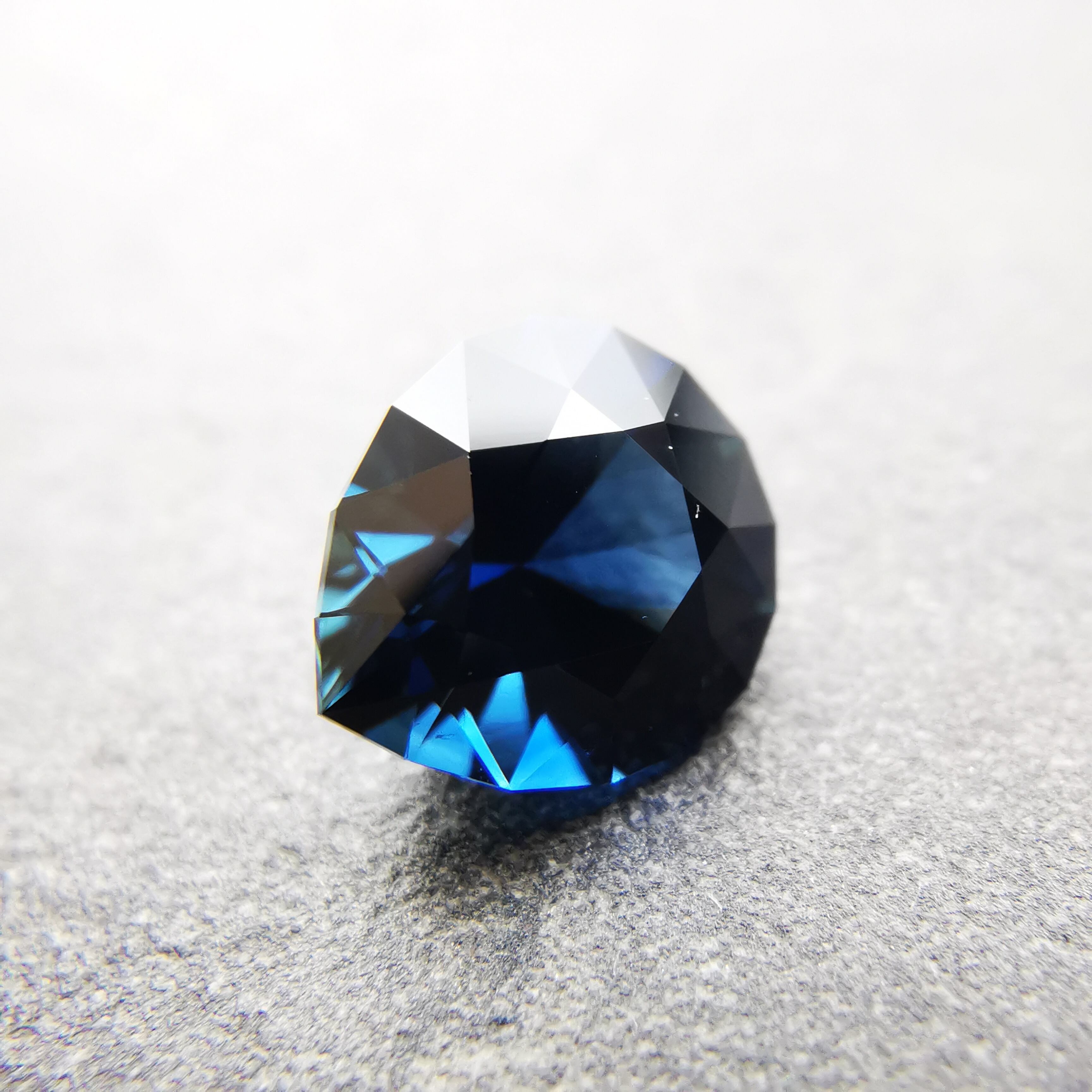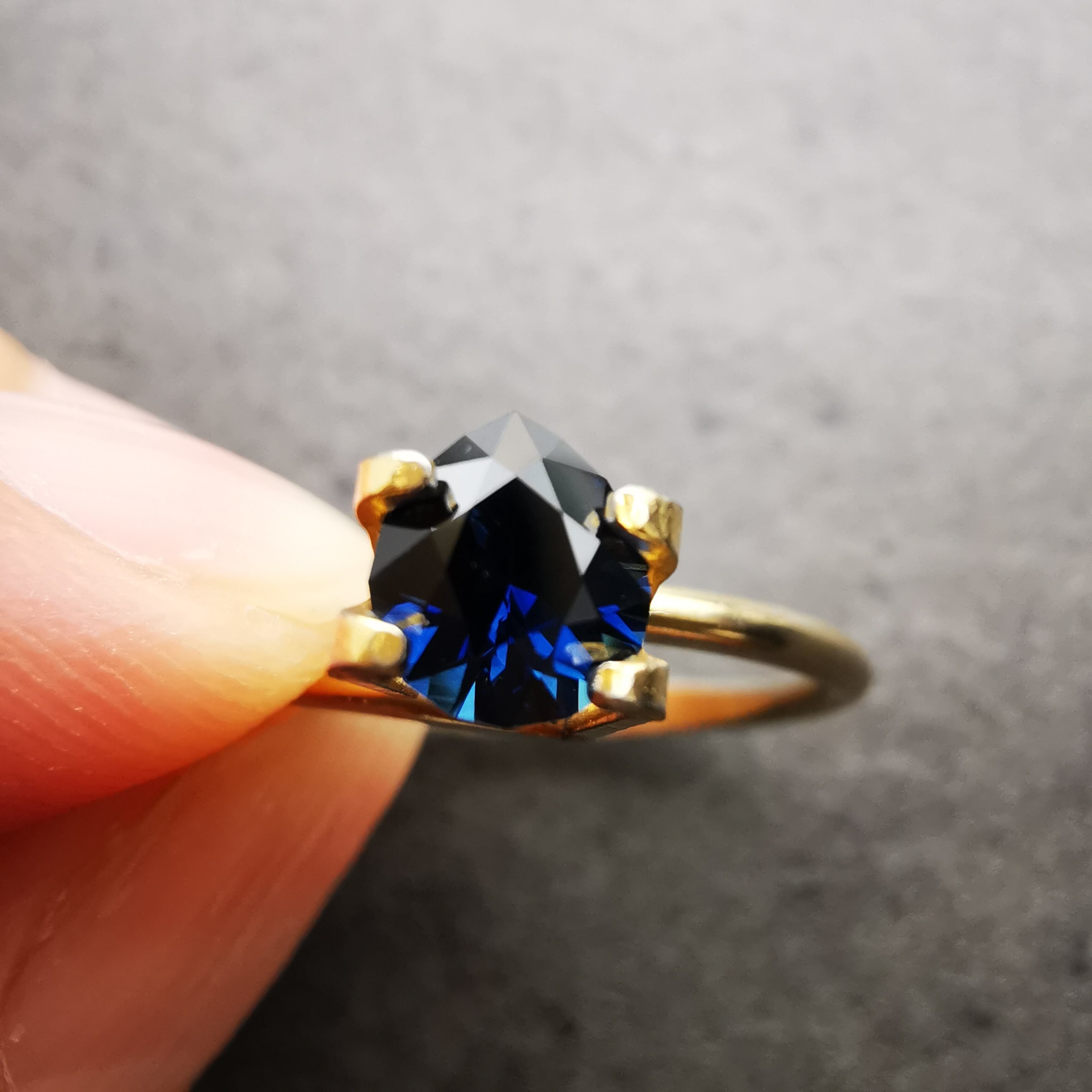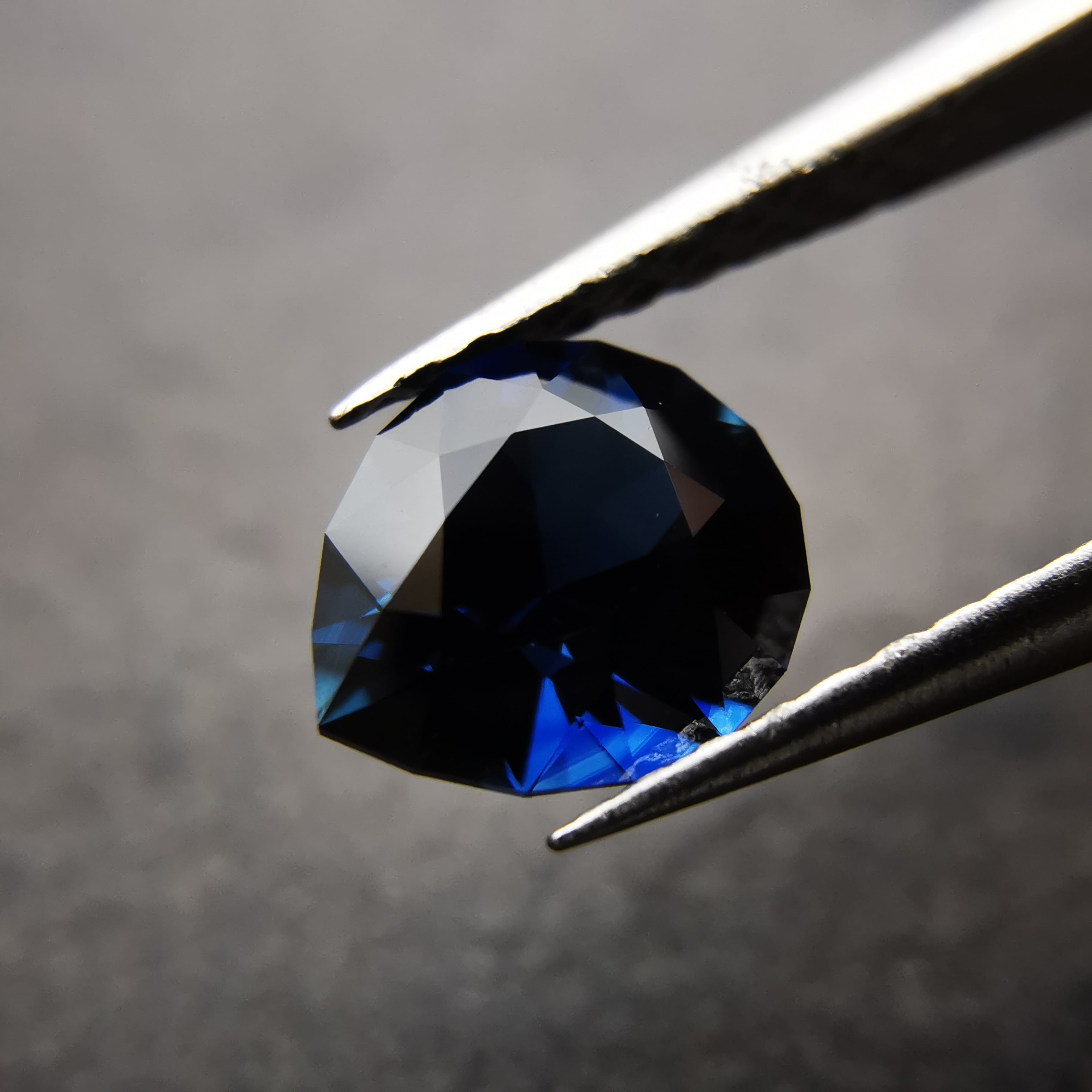 ほぼ黒に近いダークなサファイアから、青が鋭くきらめきます。