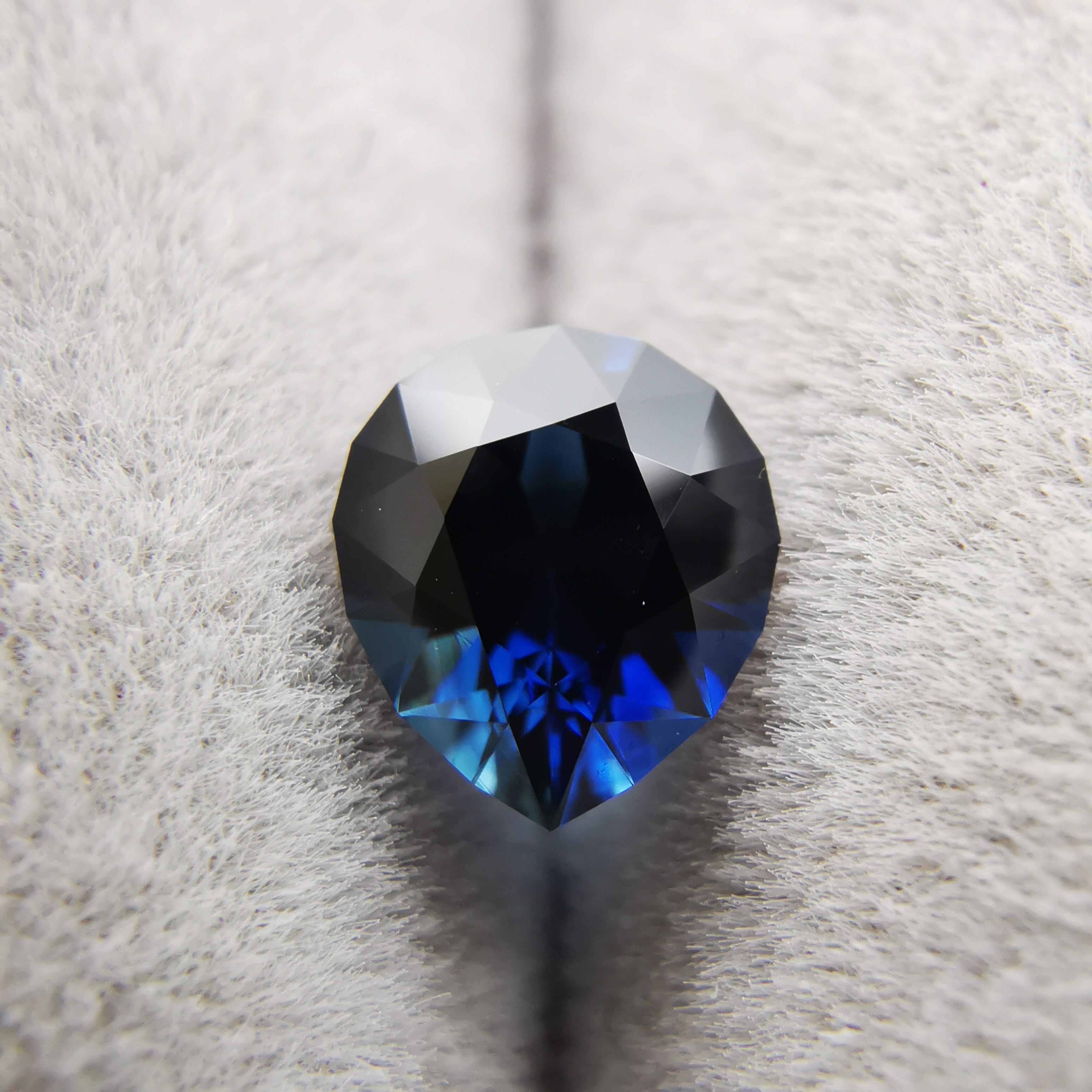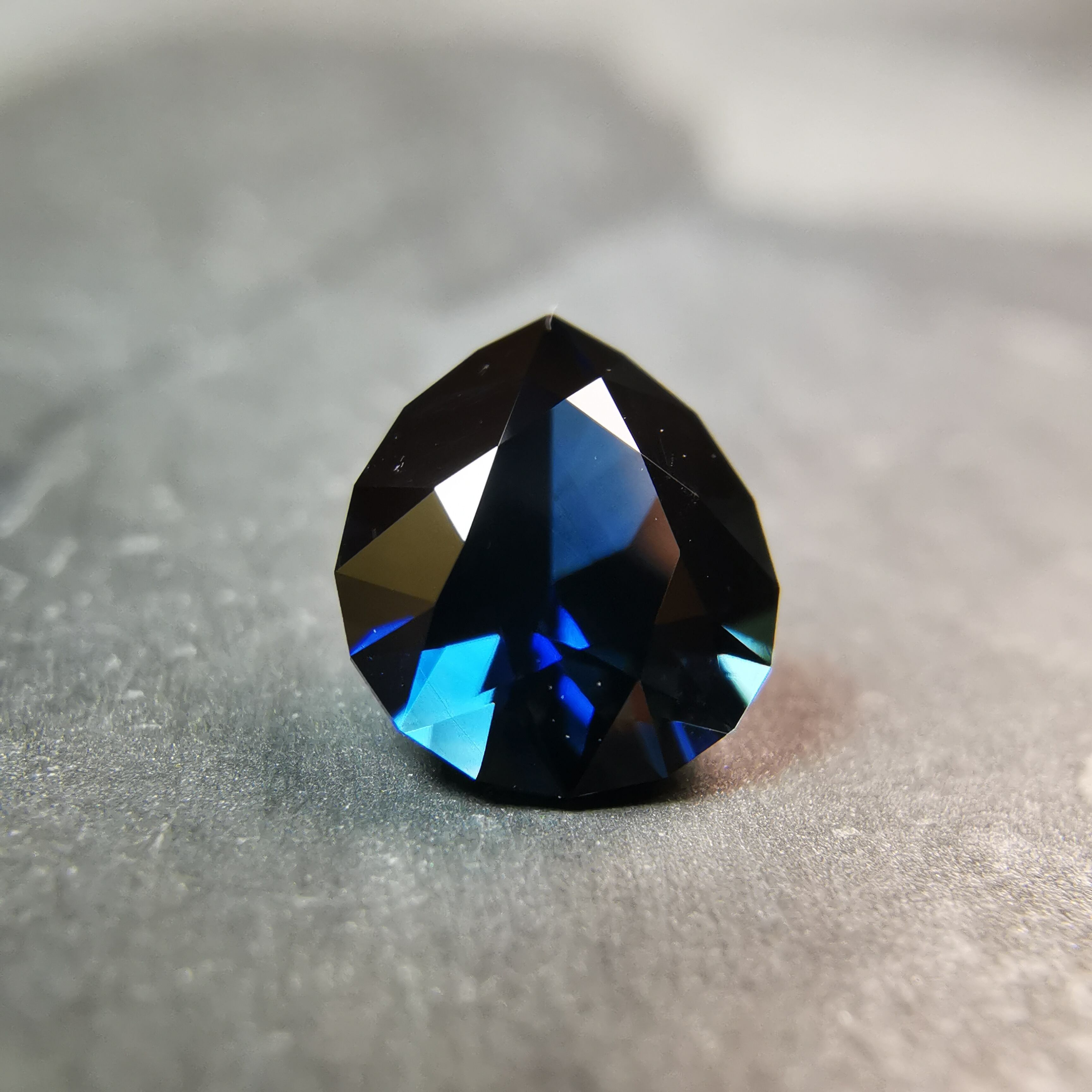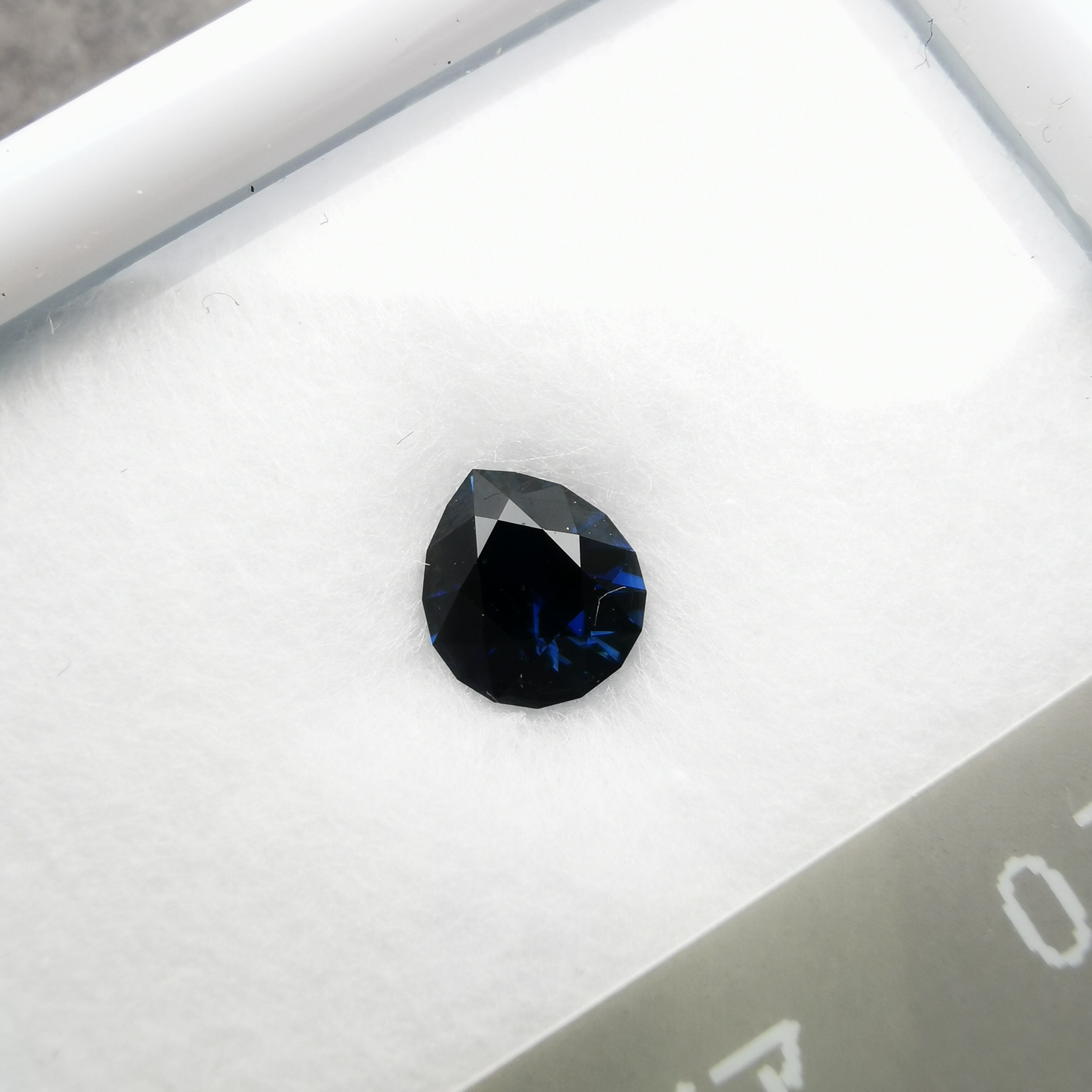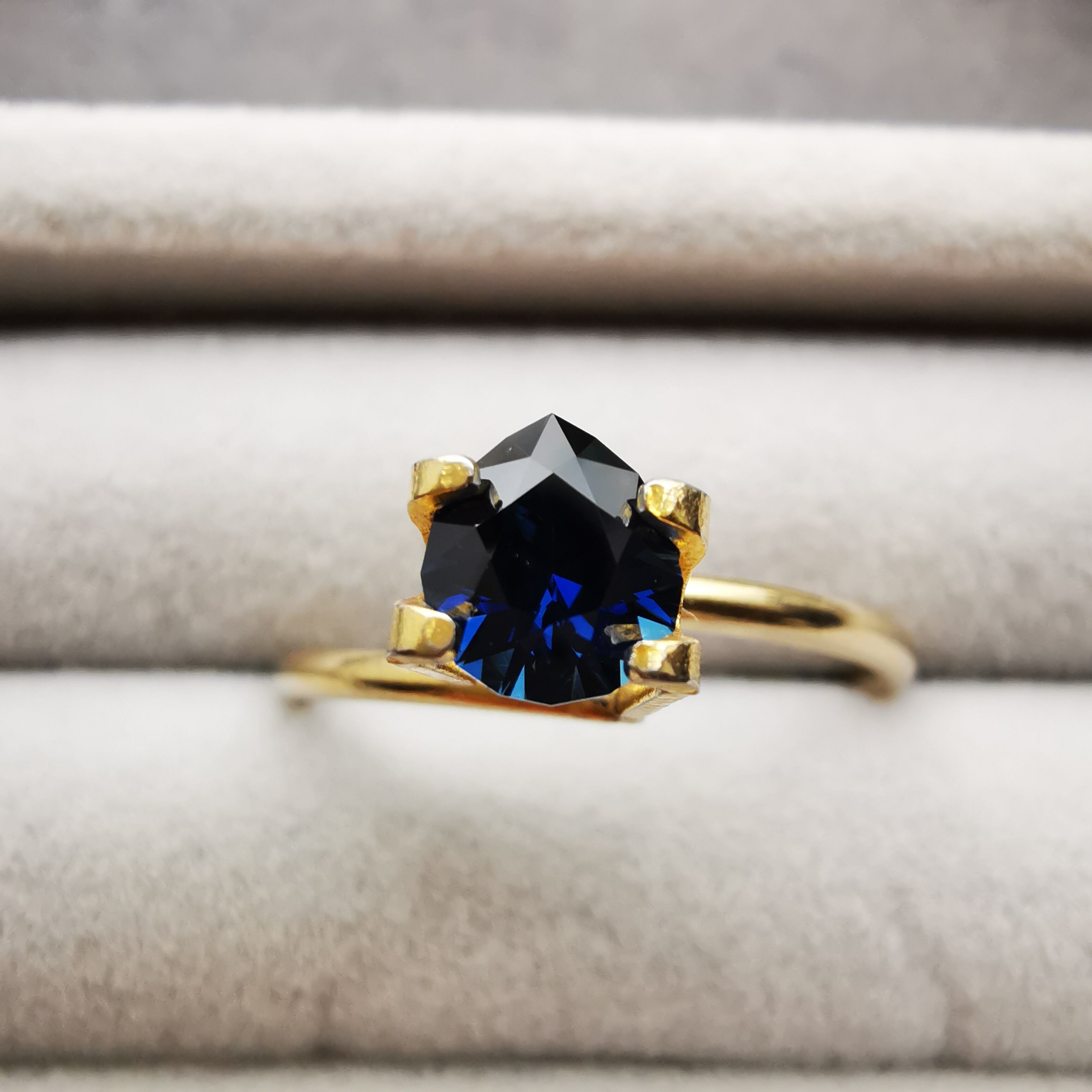 ほぼ黒に近いダークなサファイアから、青が鋭くきらめきます。
