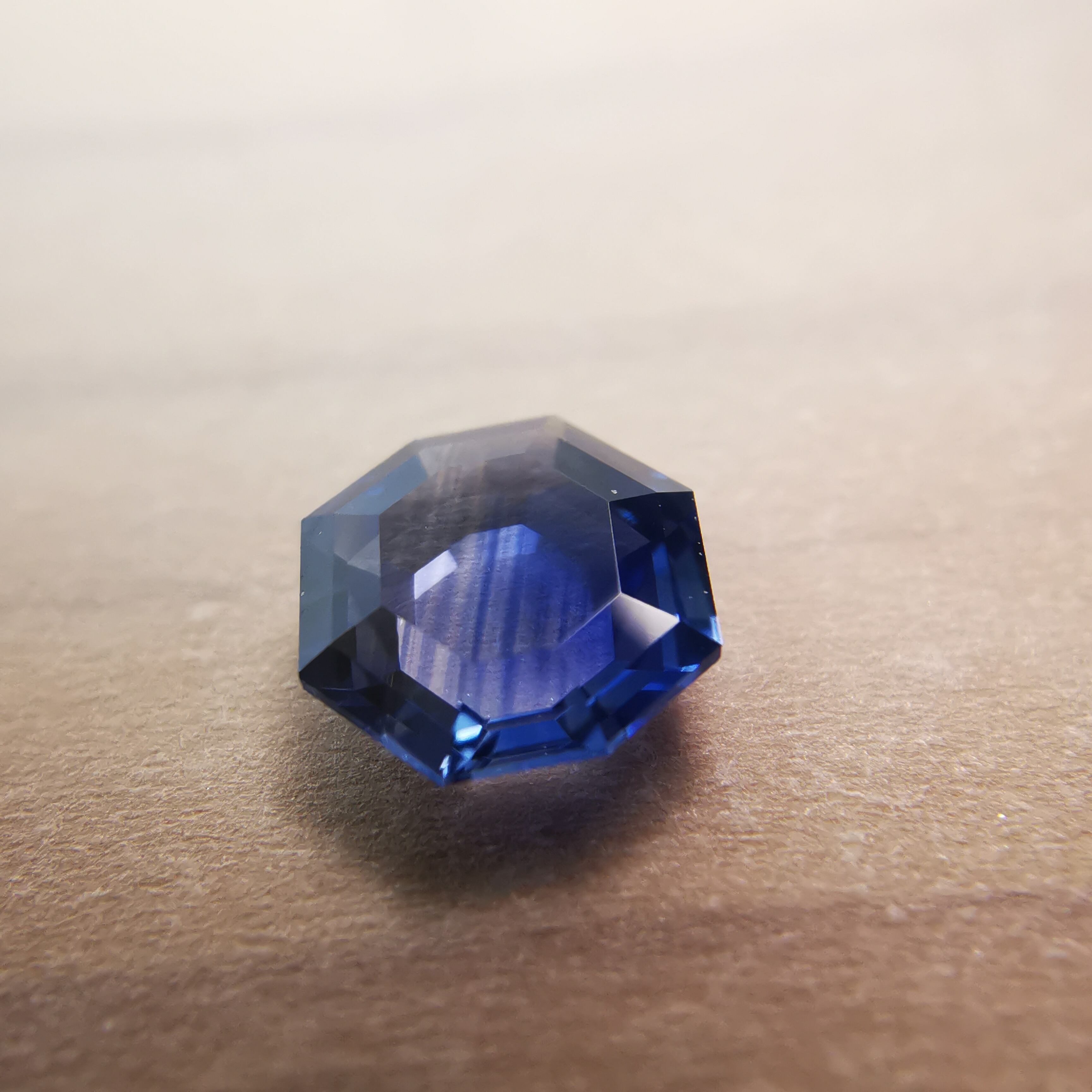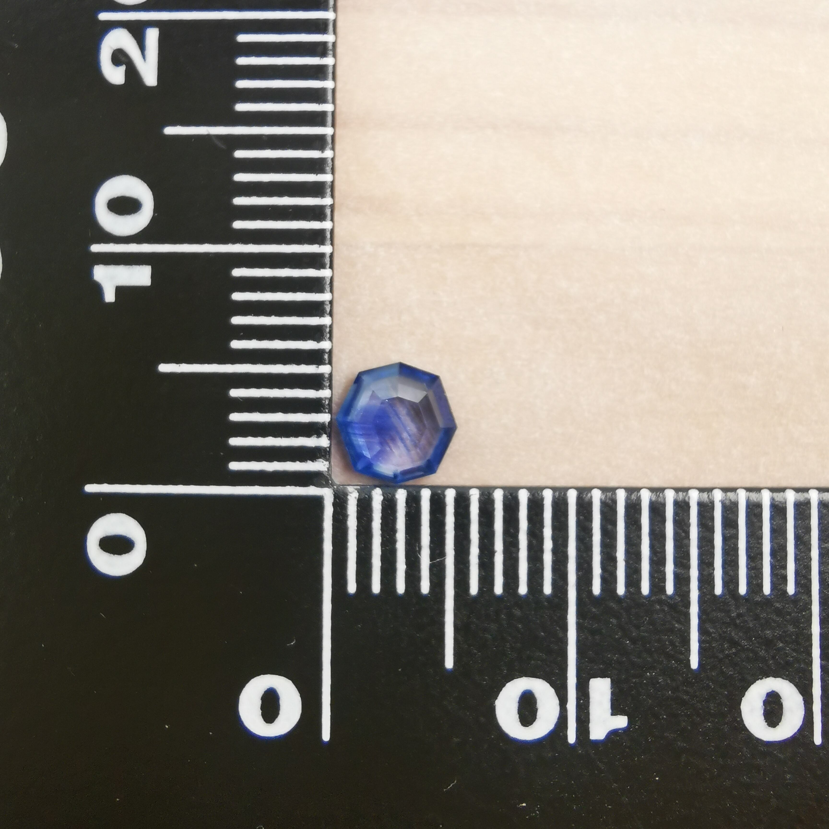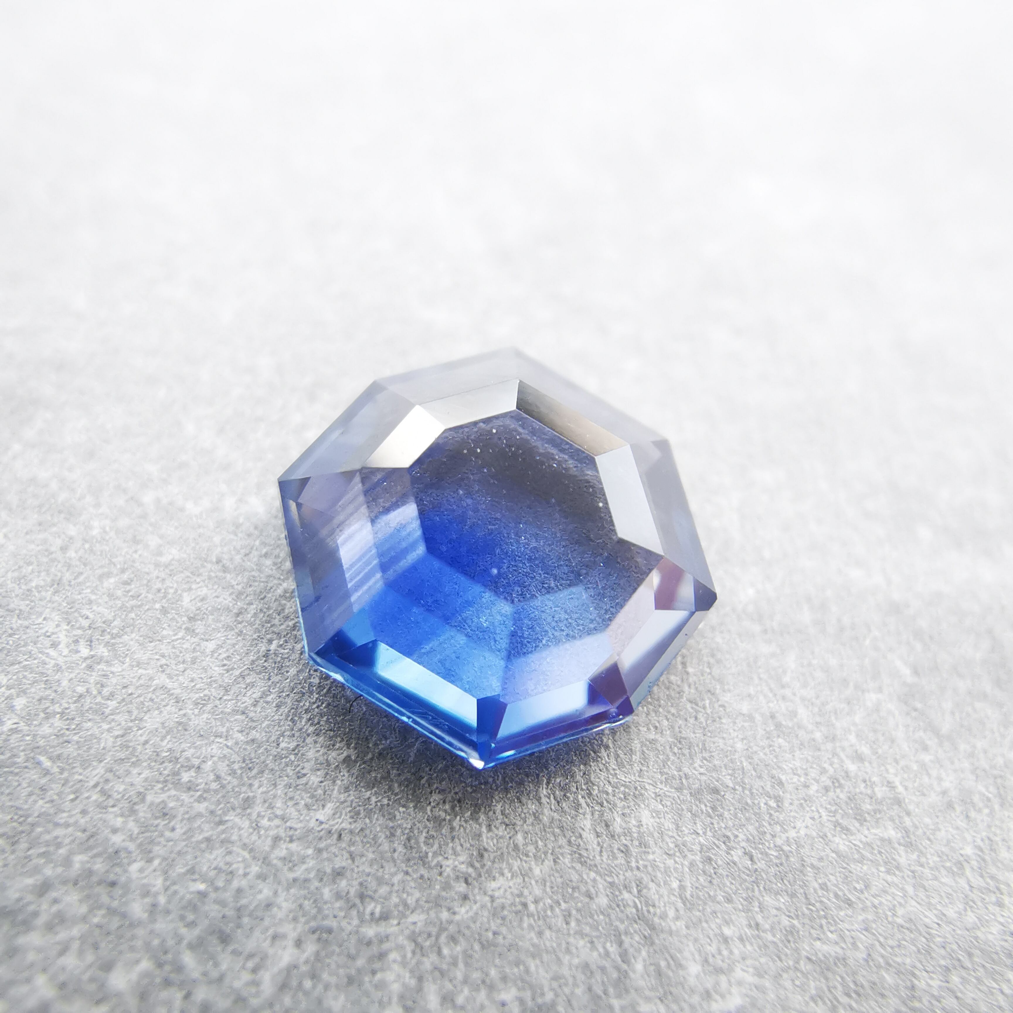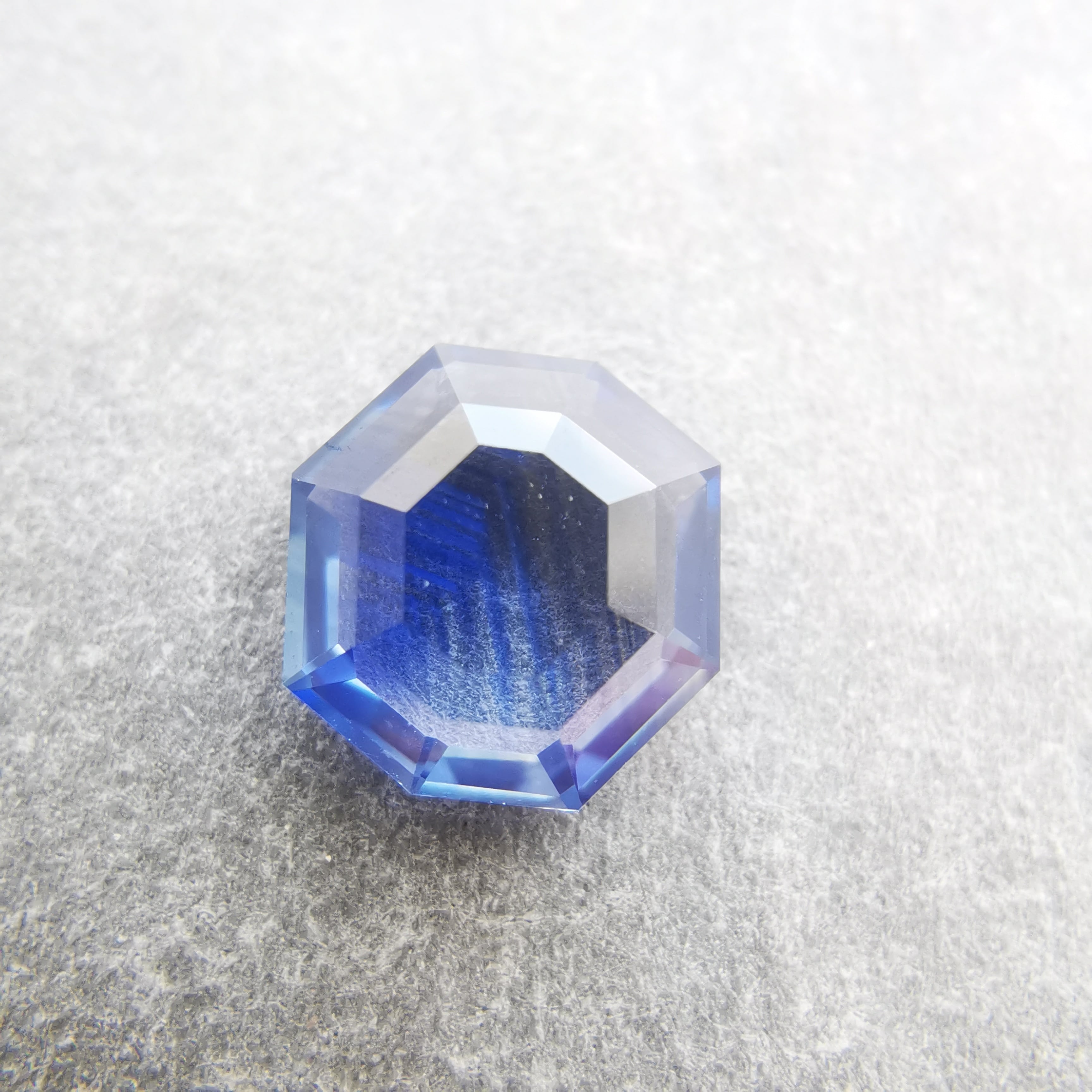 クリアなサファイアに入ったブルーの成長線が、120度で交わりながら広がる様子が見える一石です。