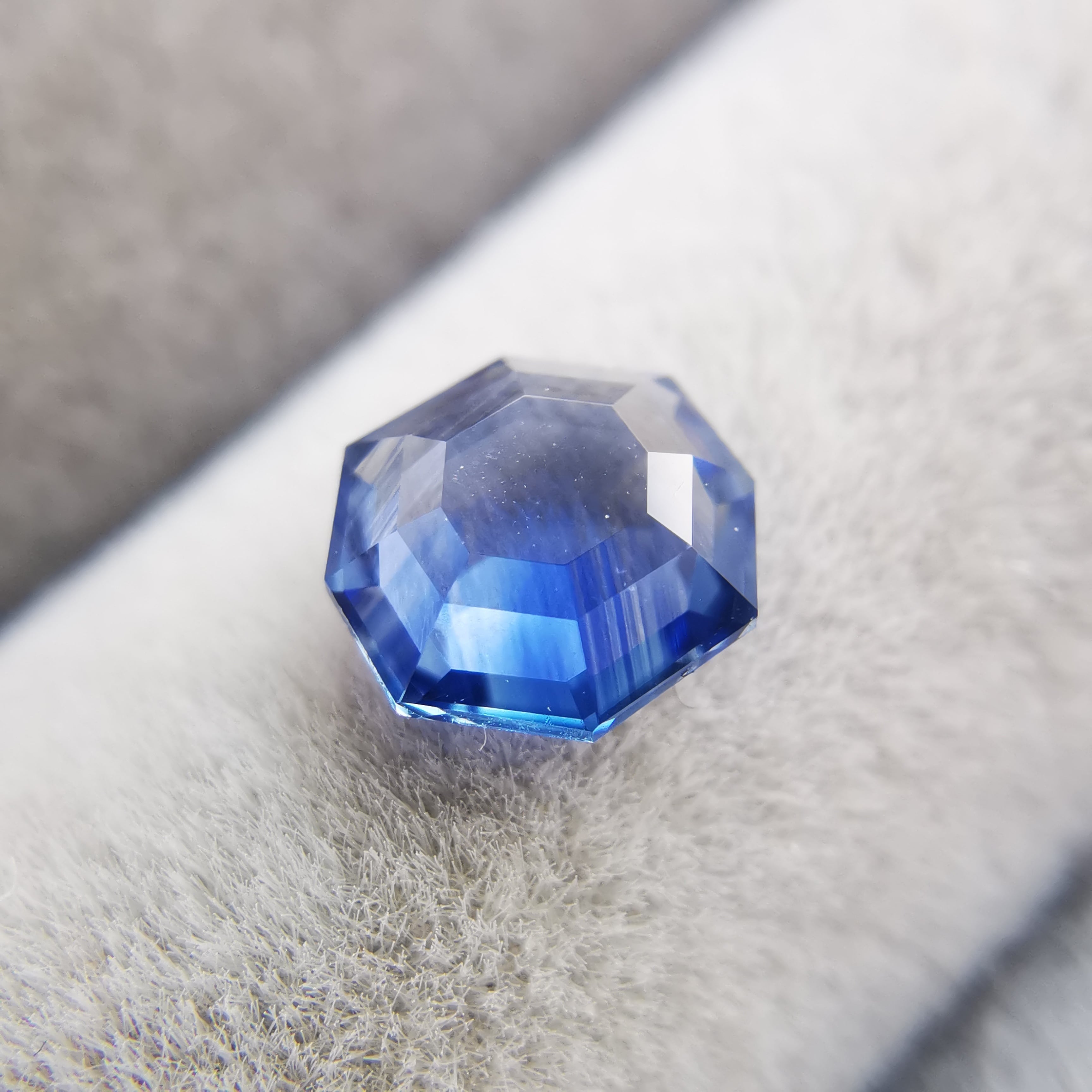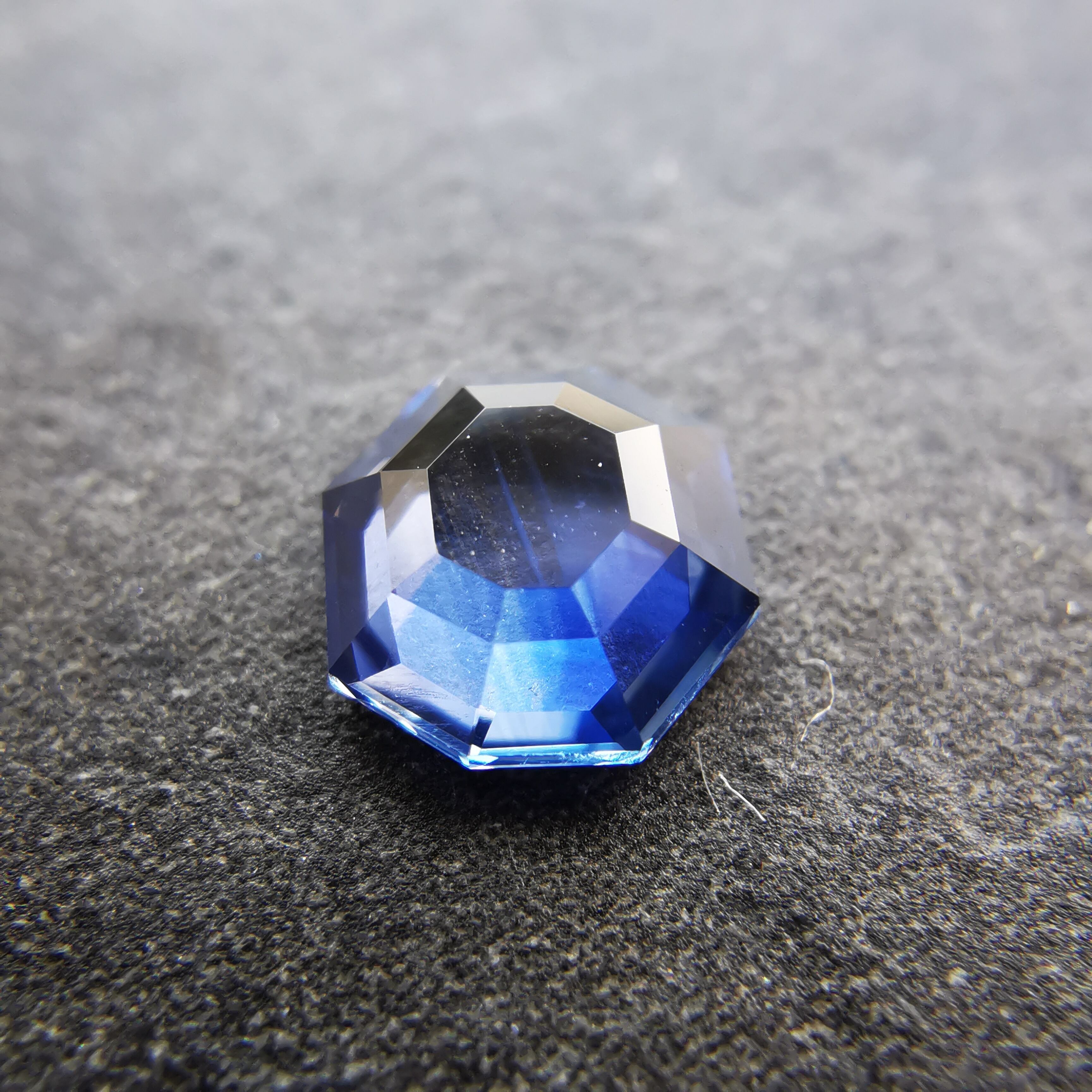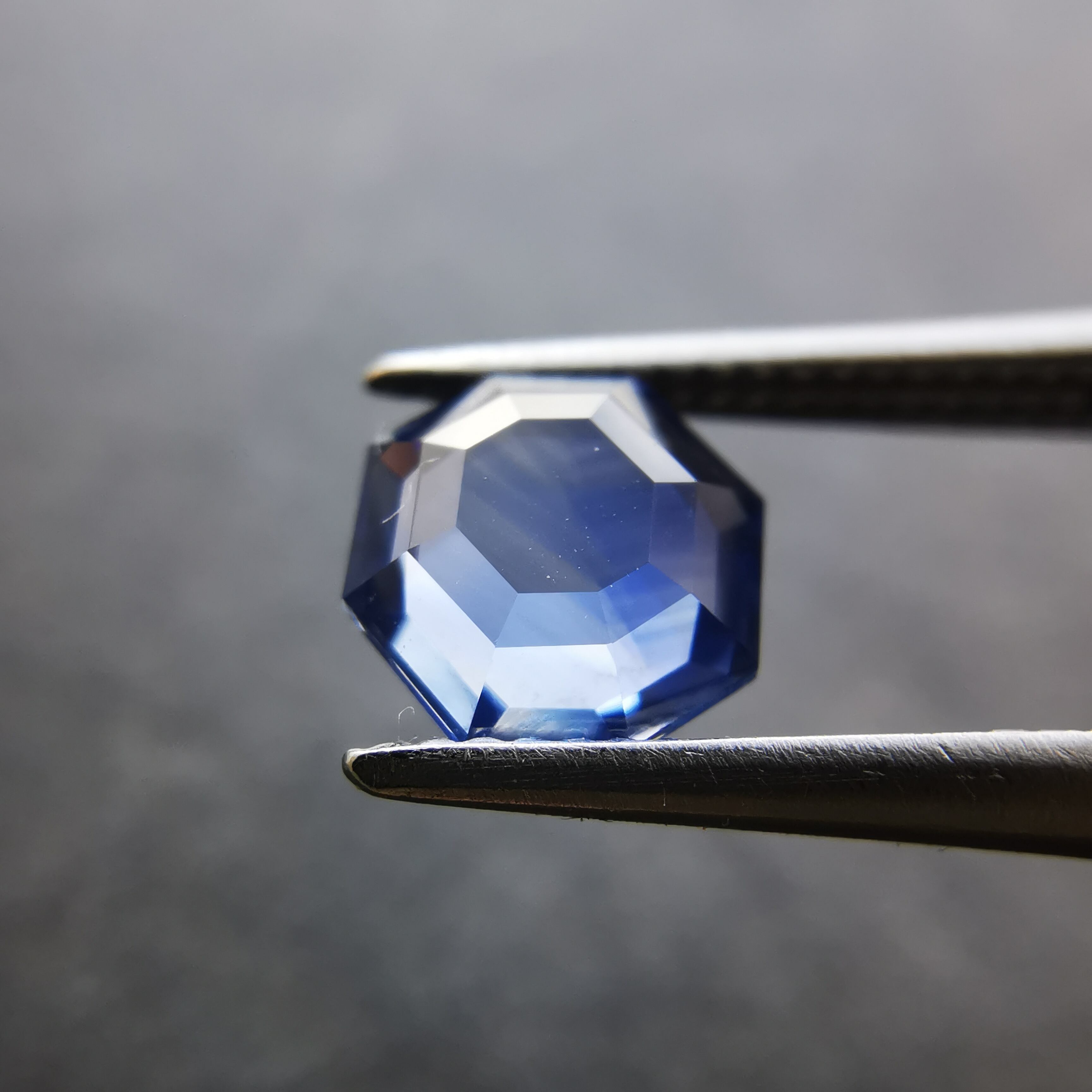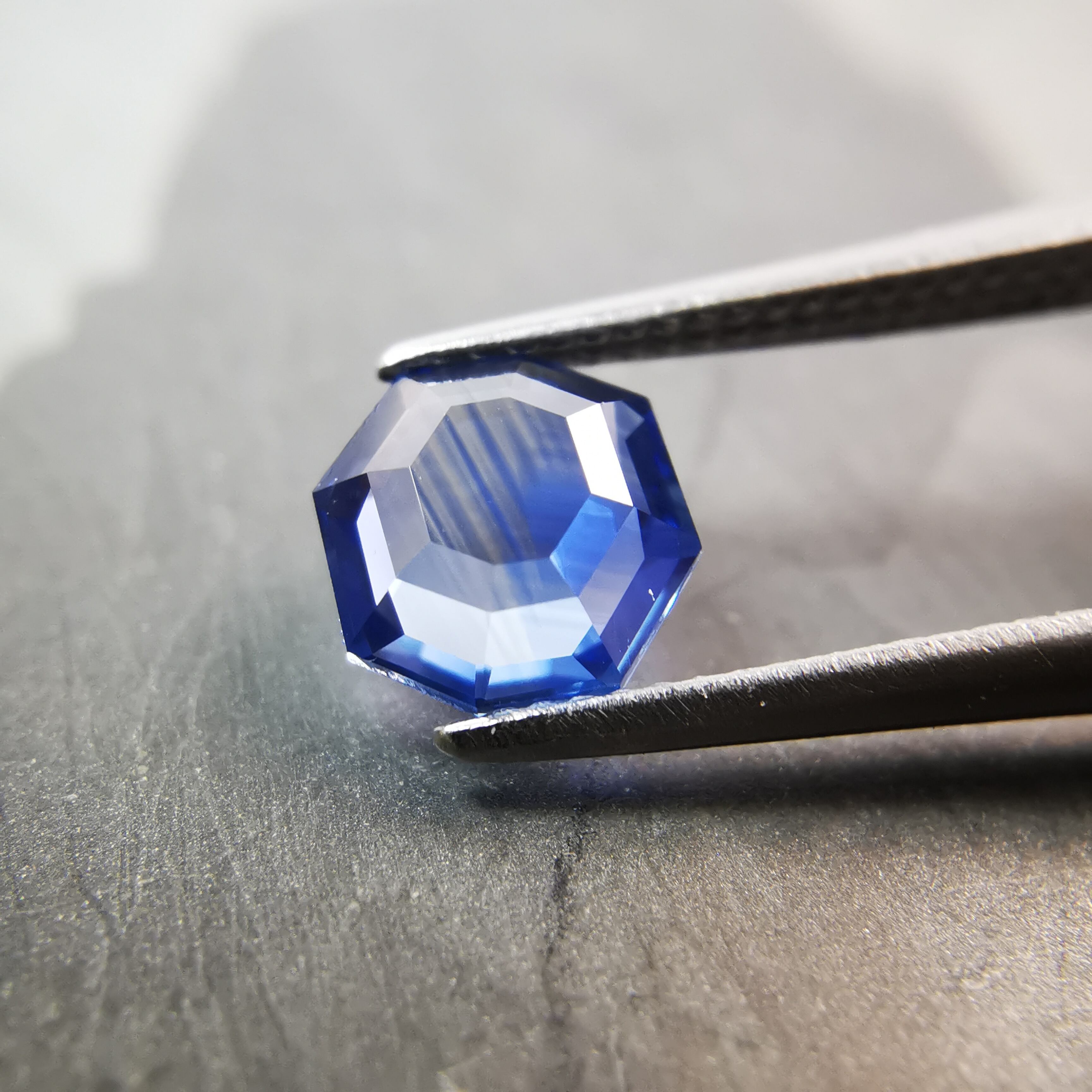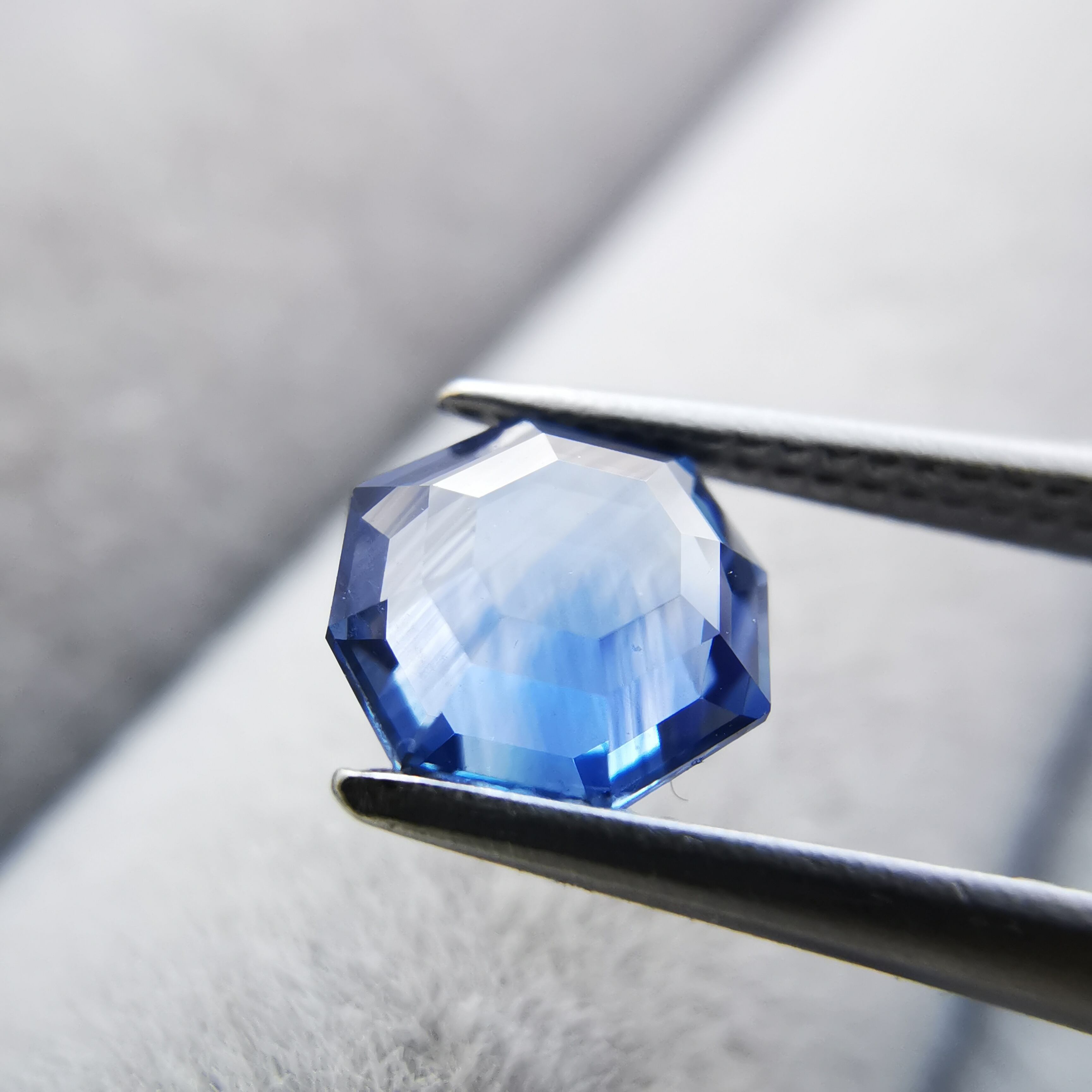 クリアなサファイアに入ったブルーの成長線が、120度で交わりながら広がる様子が見える一石です。