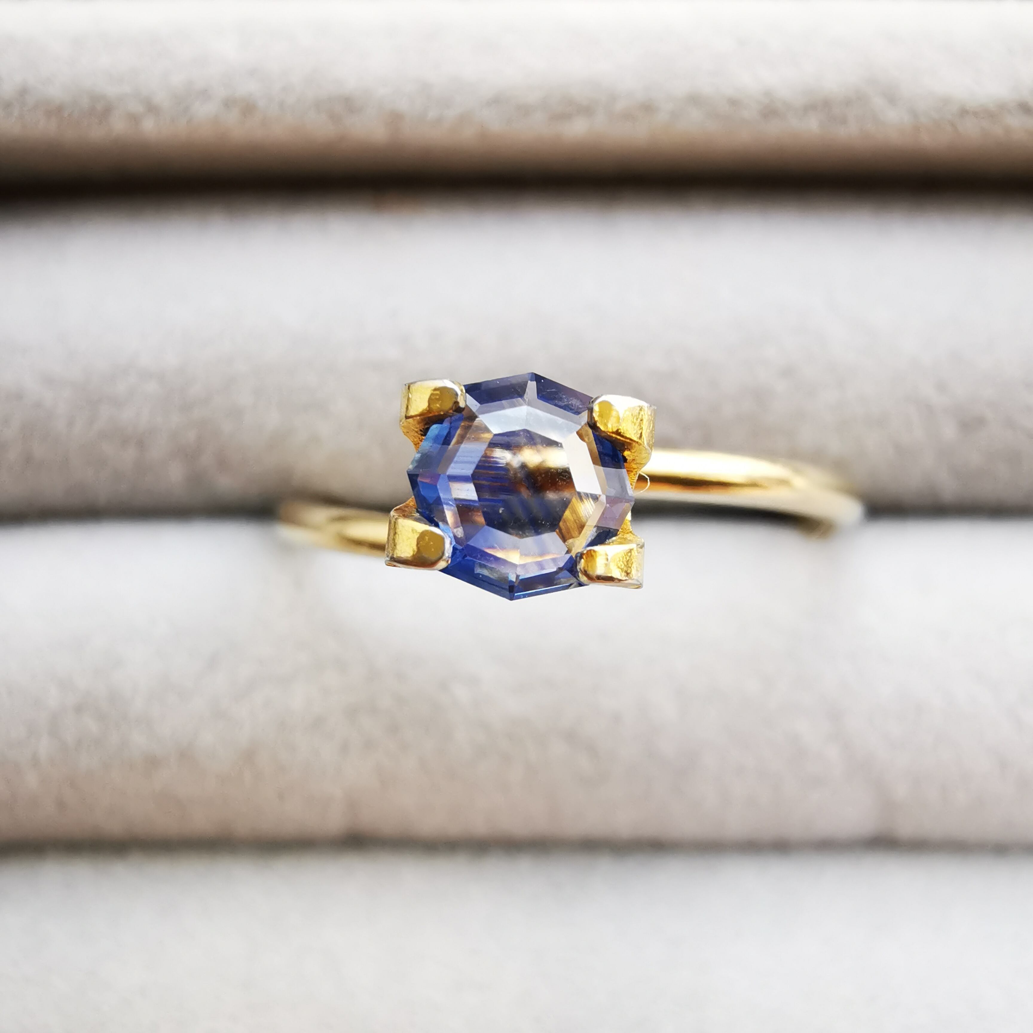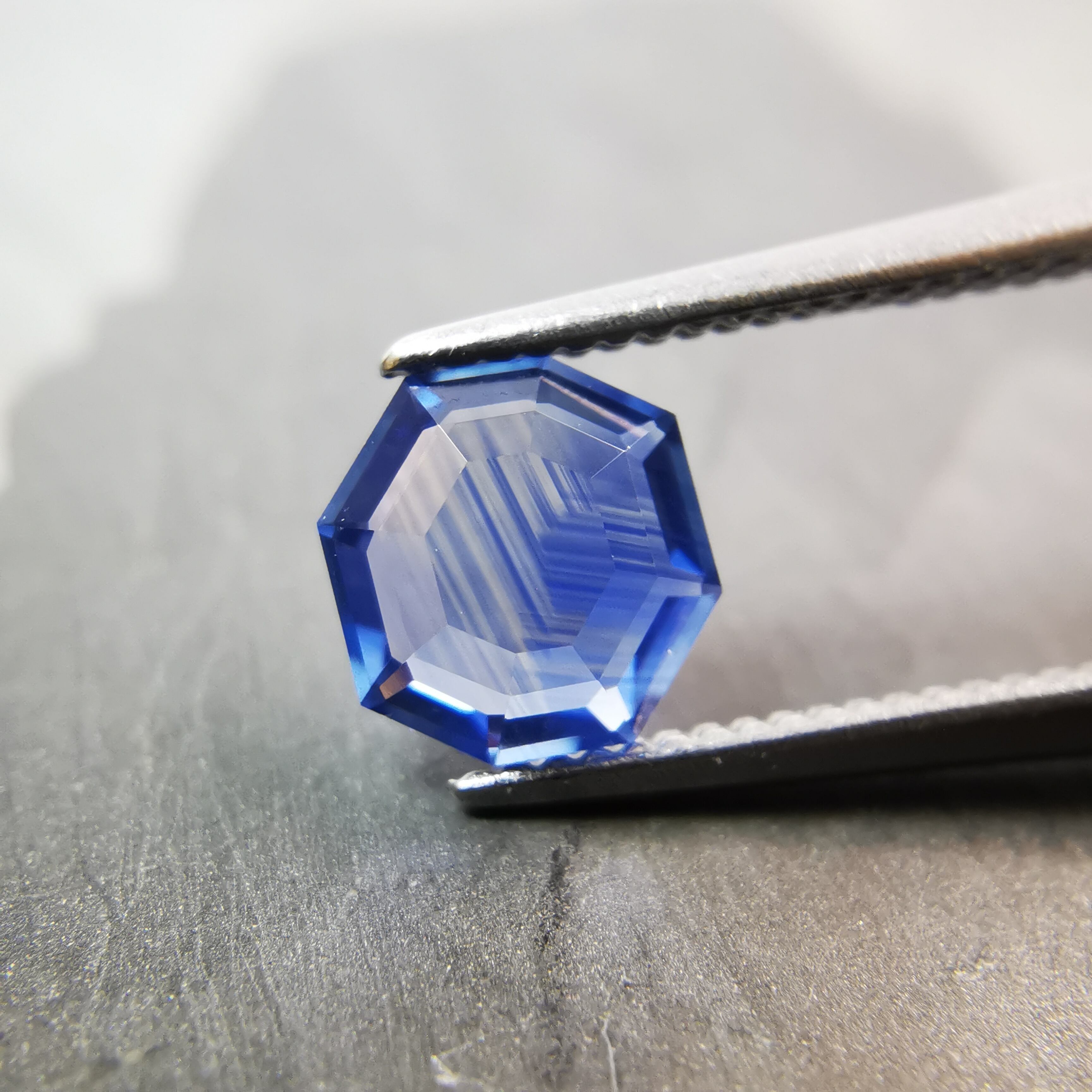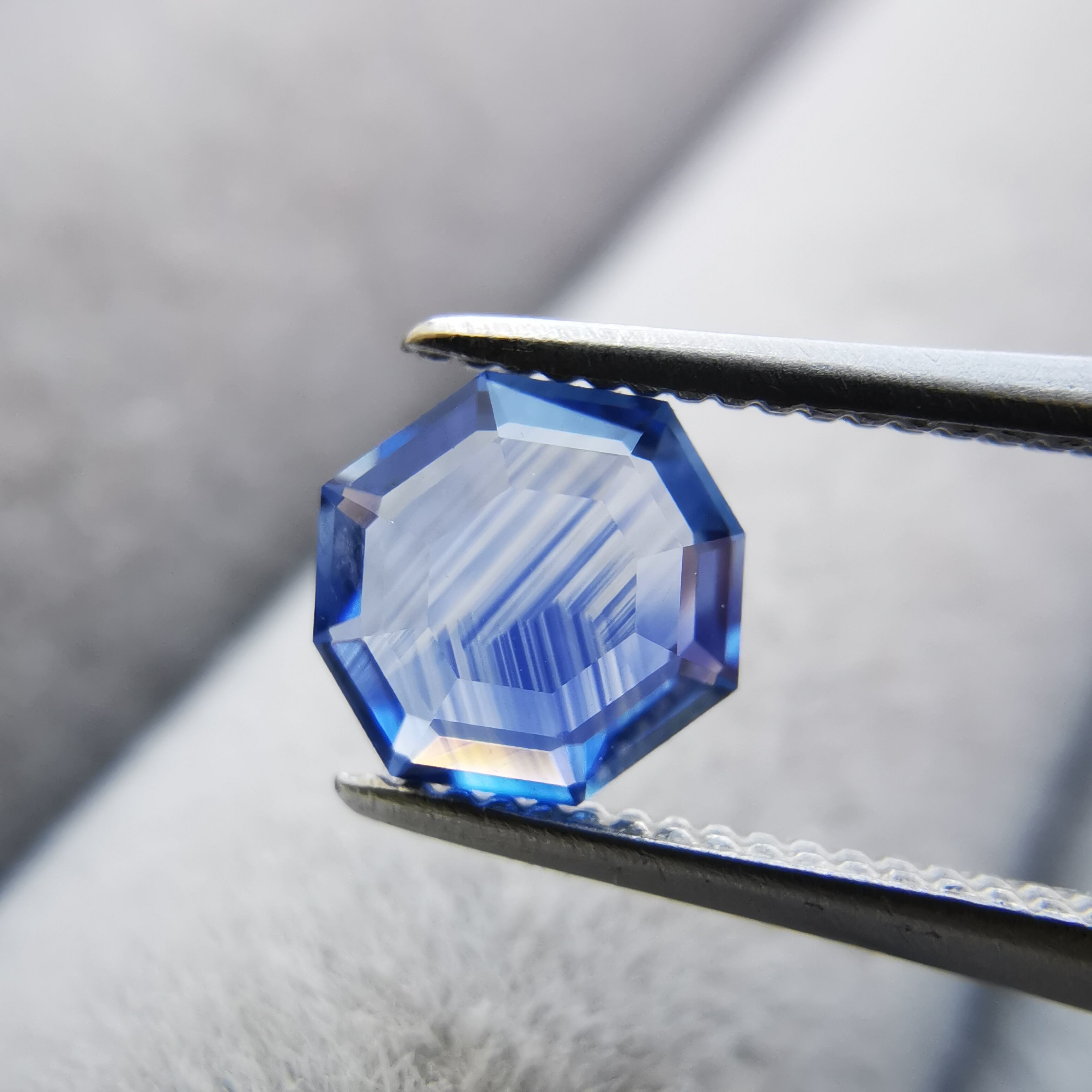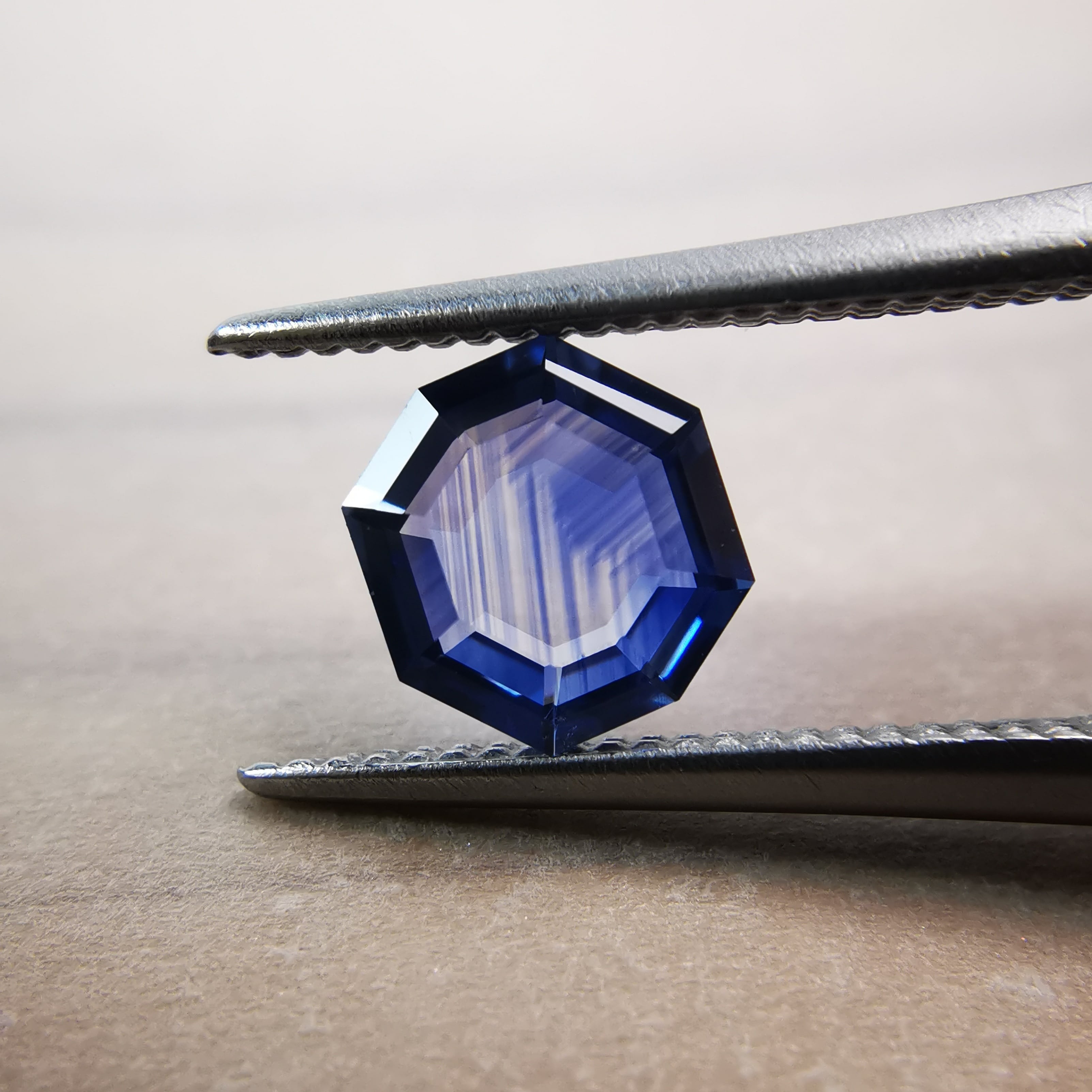 クリアなサファイアに入ったブルーの成長線が、120度で交わりながら広がる様子が見える一石です。