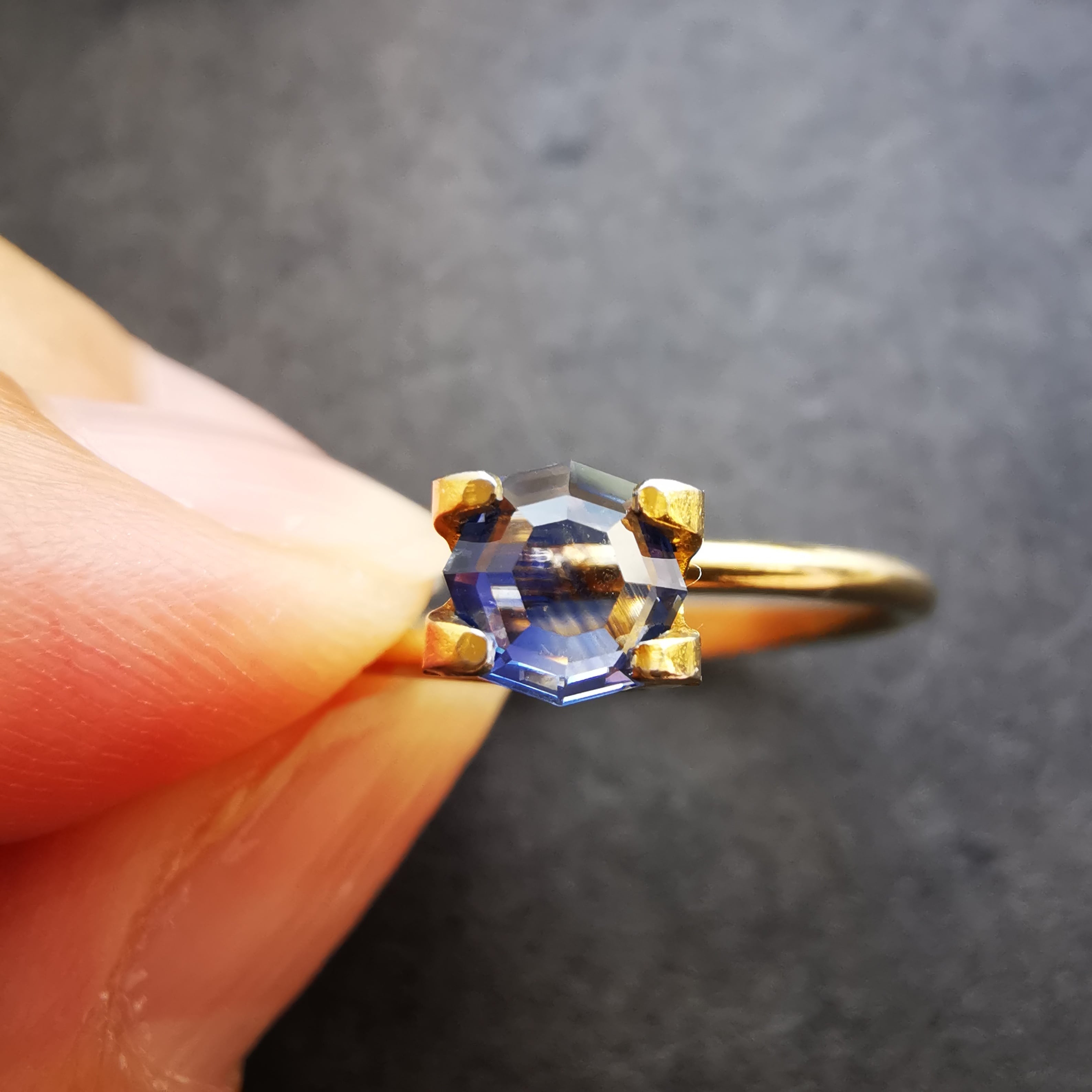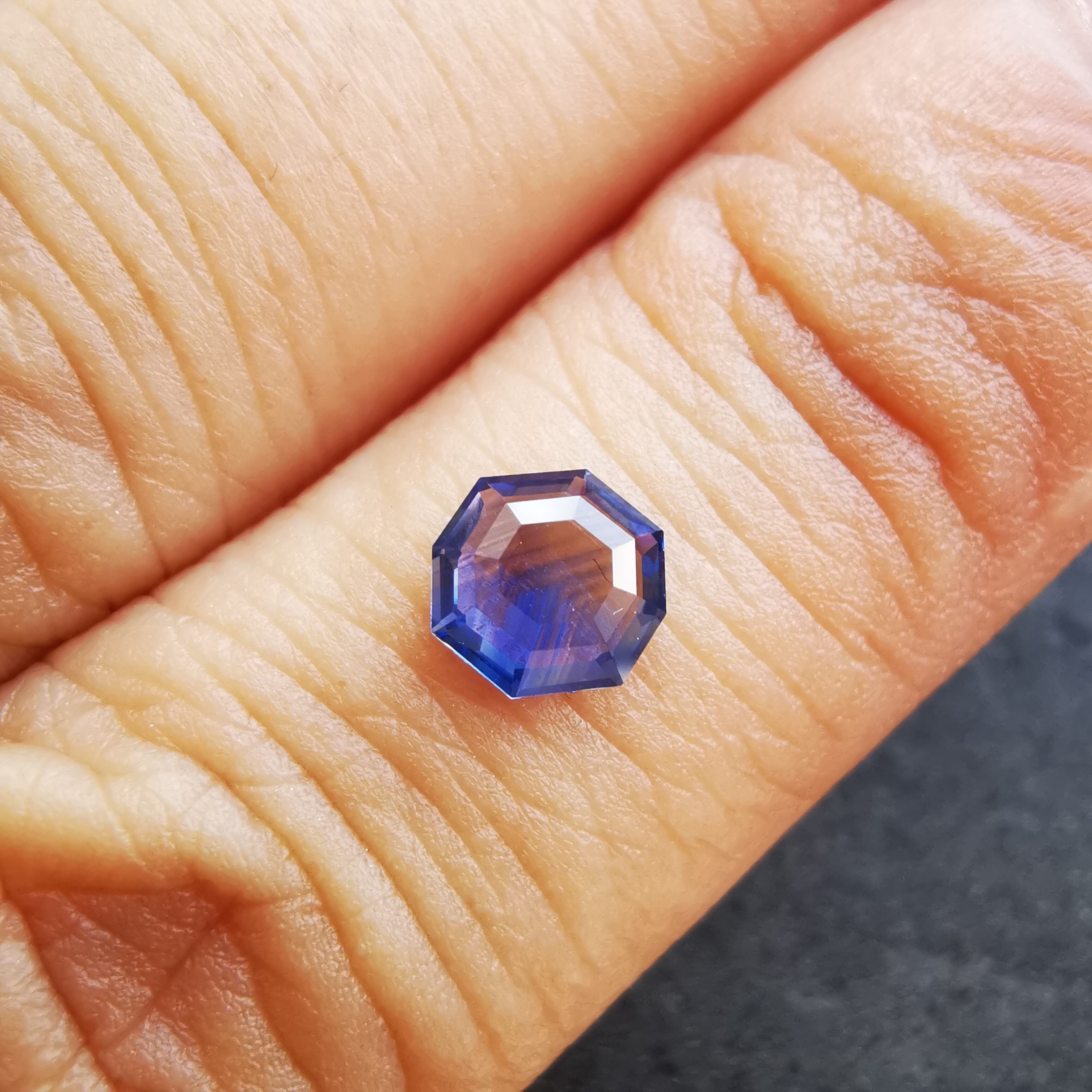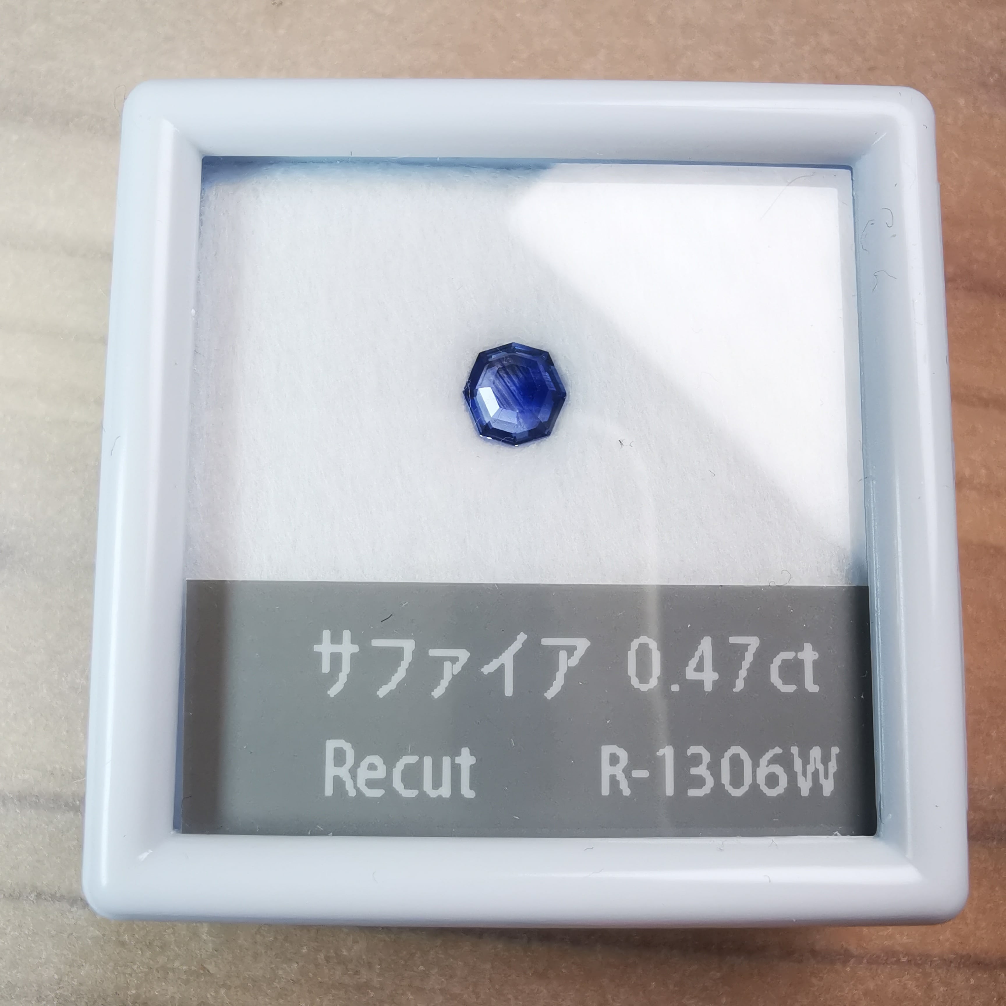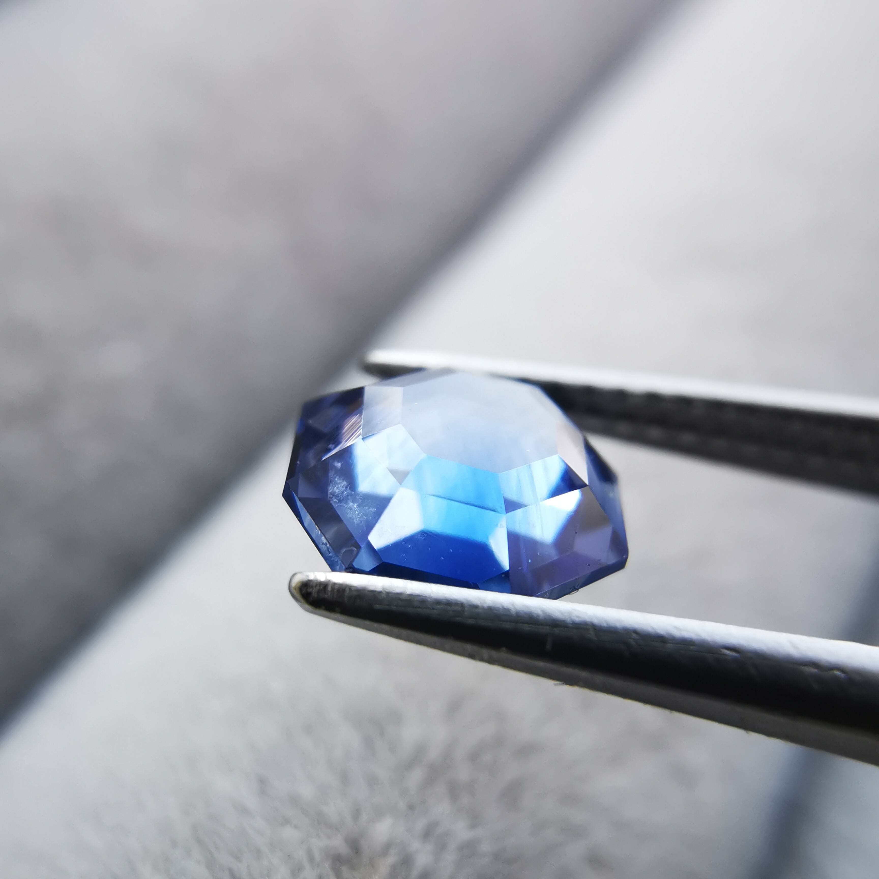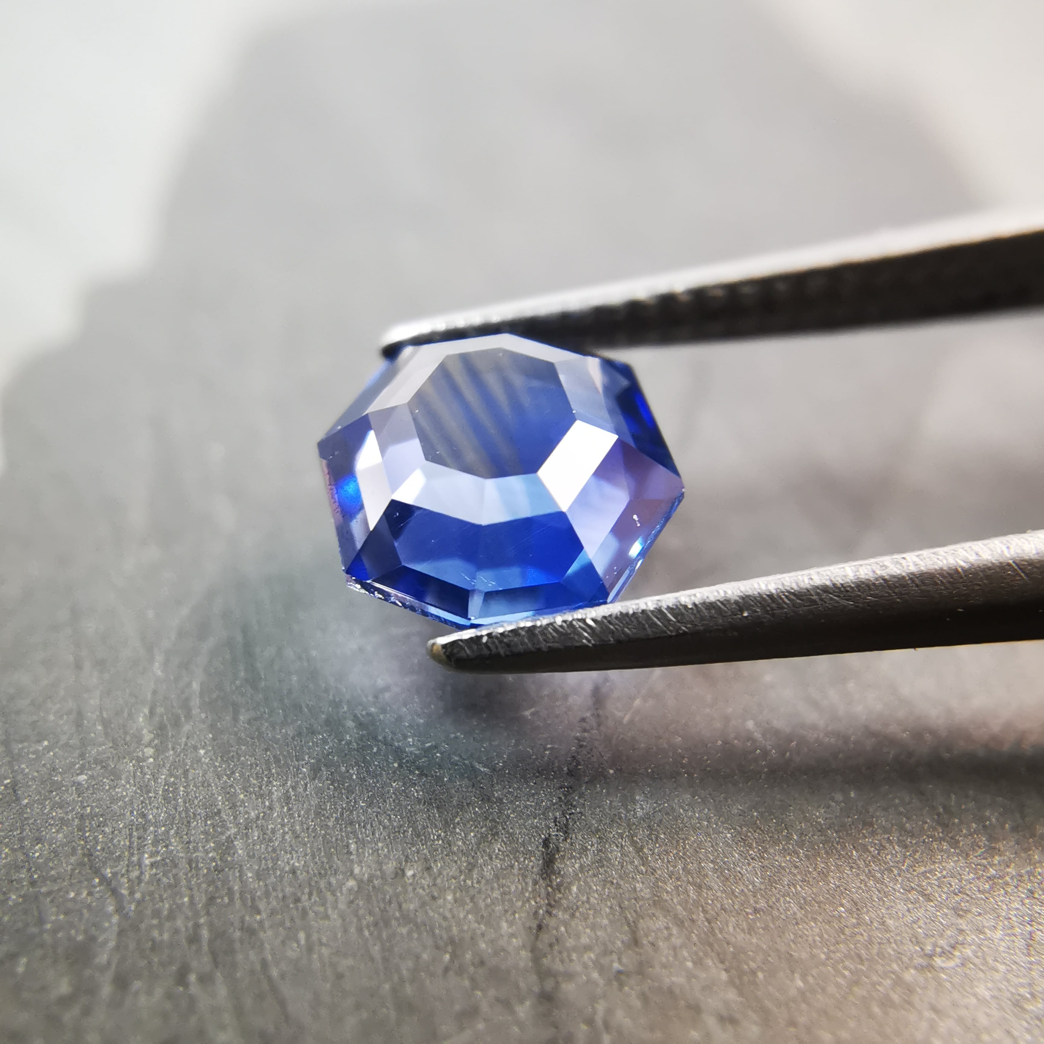 クリアなサファイアに入ったブルーの成長線が、120度で交わりながら広がる様子が見える一石です。