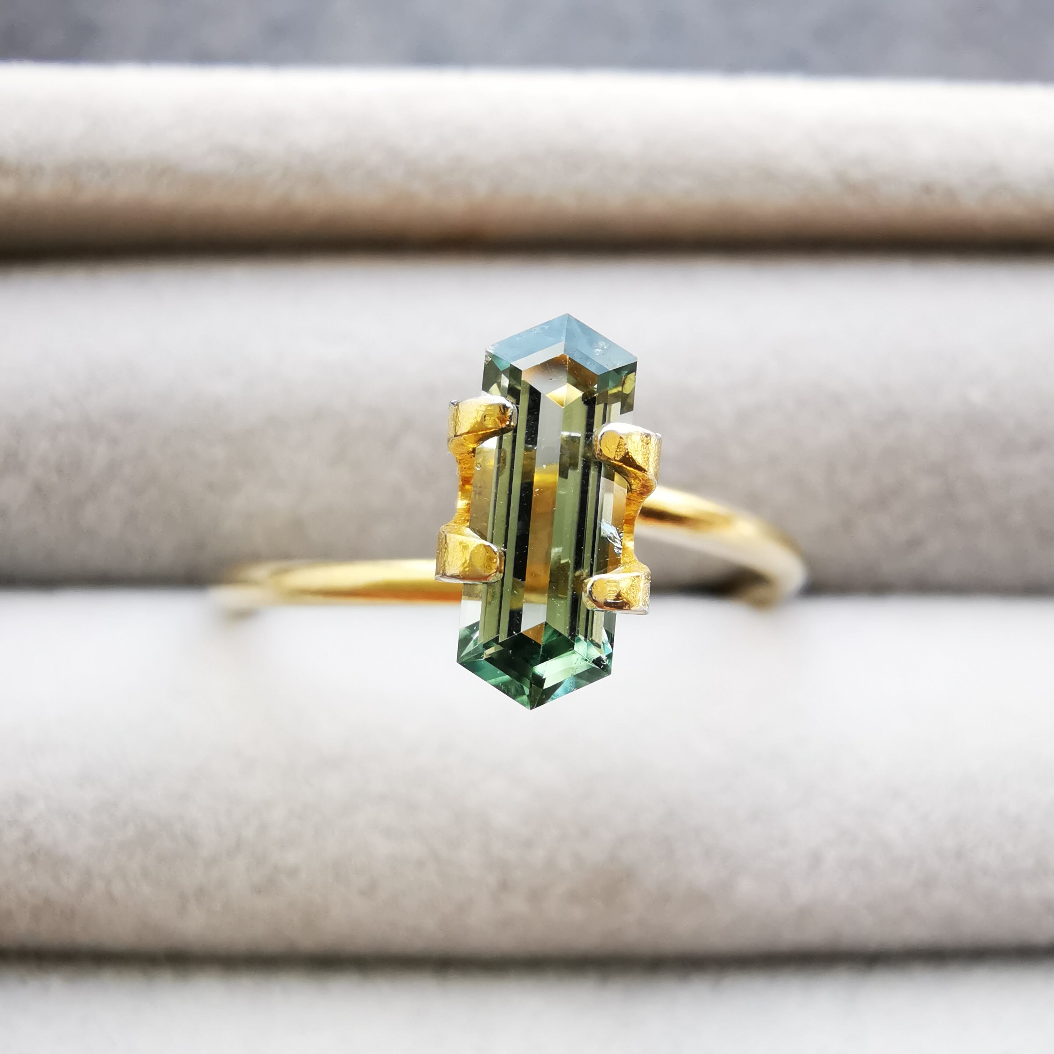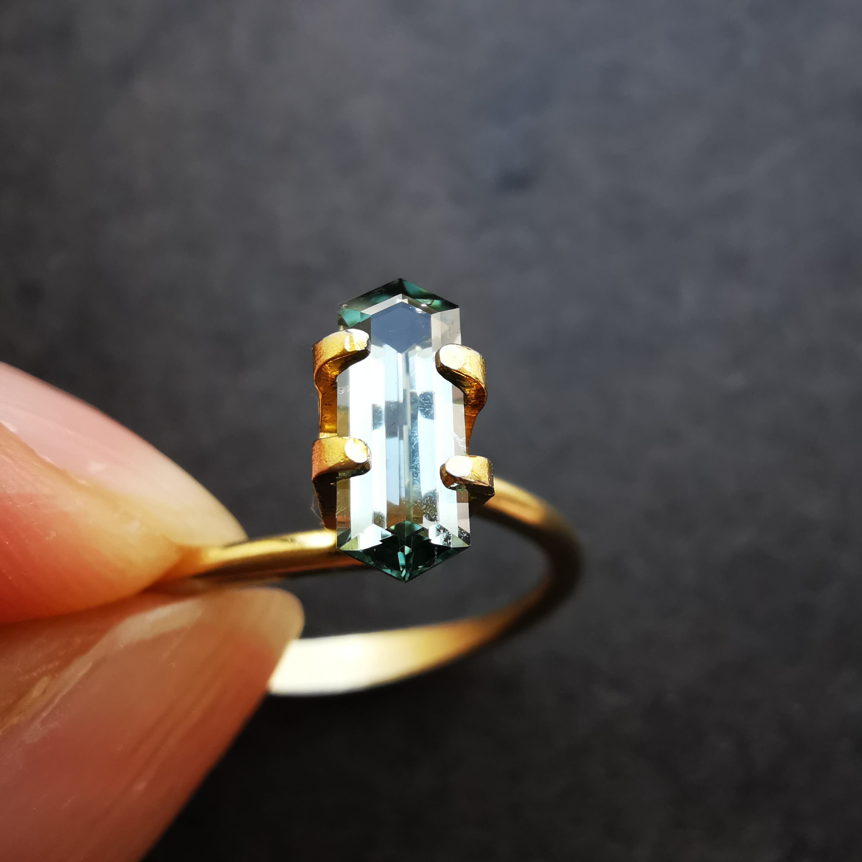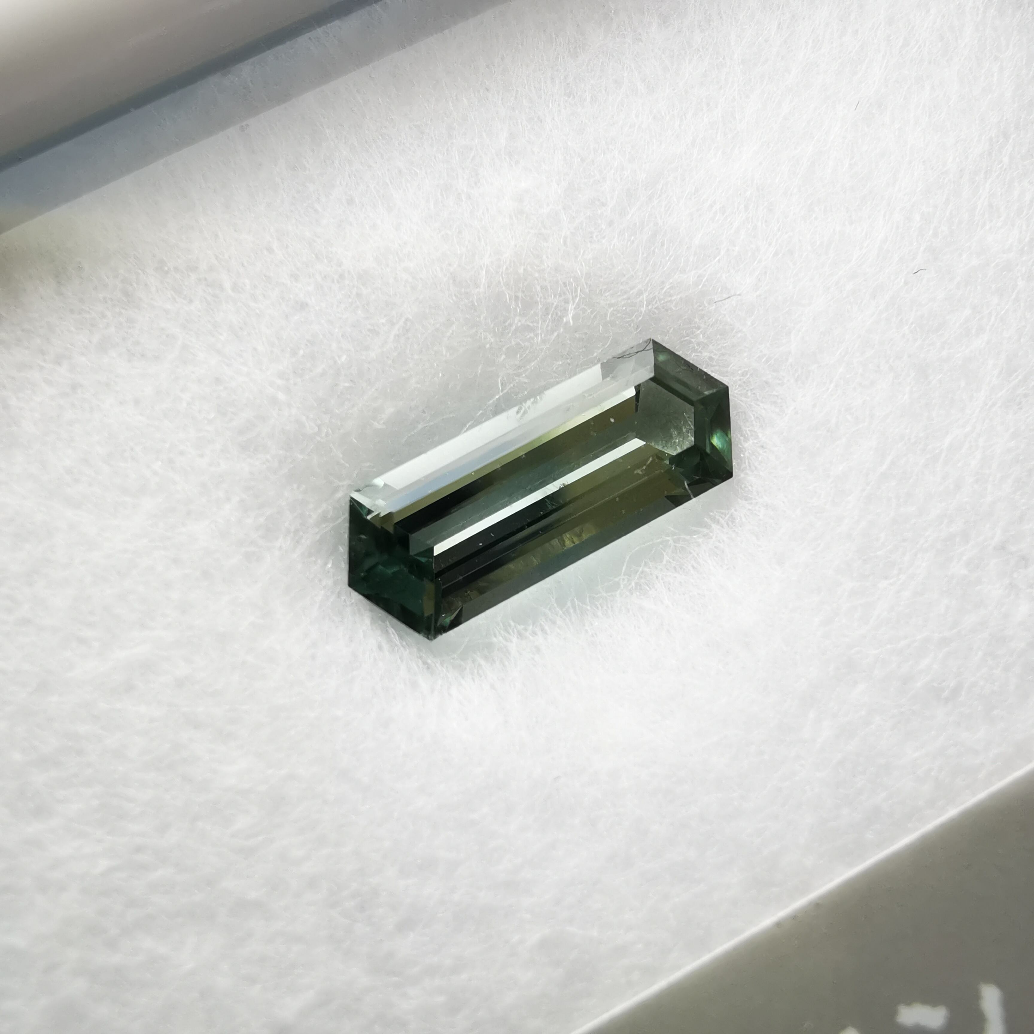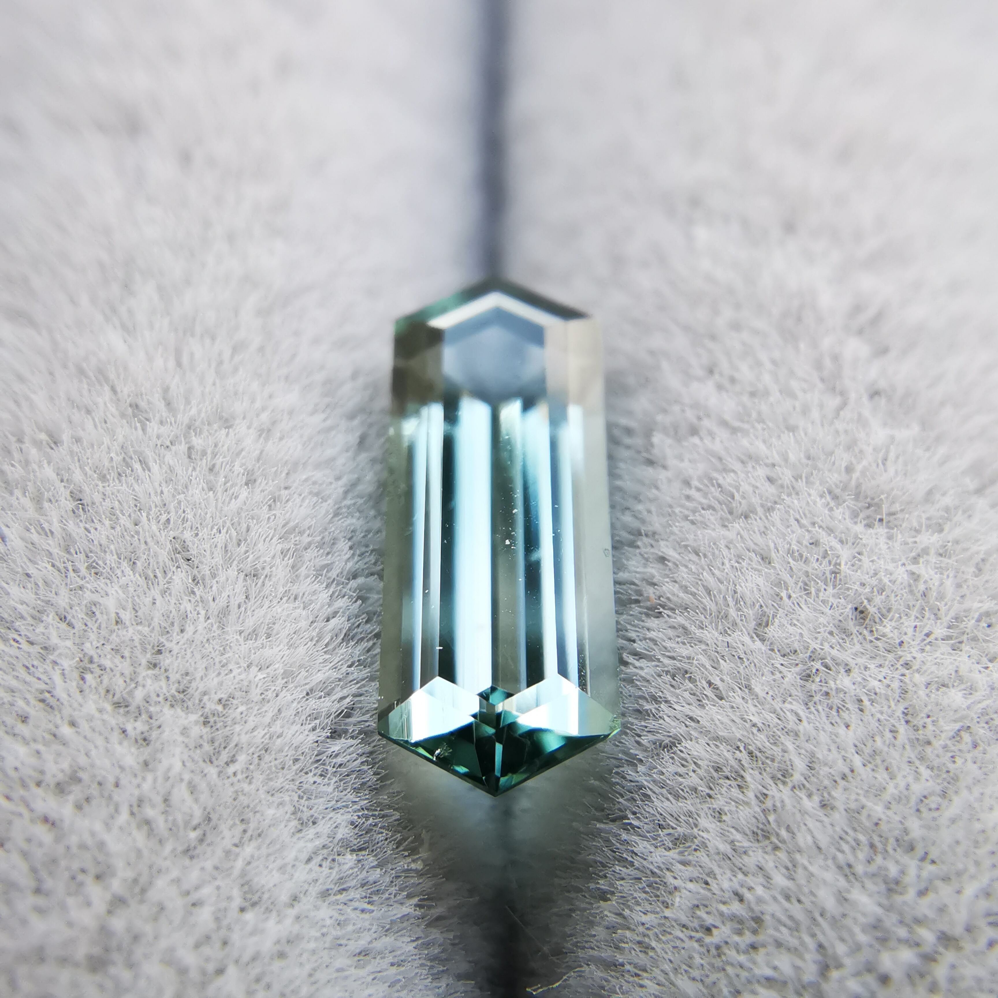 両端の尖った部分は色溜まりとなり、わずかに色を感じることが出来ますが、間のバケットカットの部分は鏡のように光を反射し、メタリックに輝くので、いったい何色と言うべきか、つかみどころがありません。