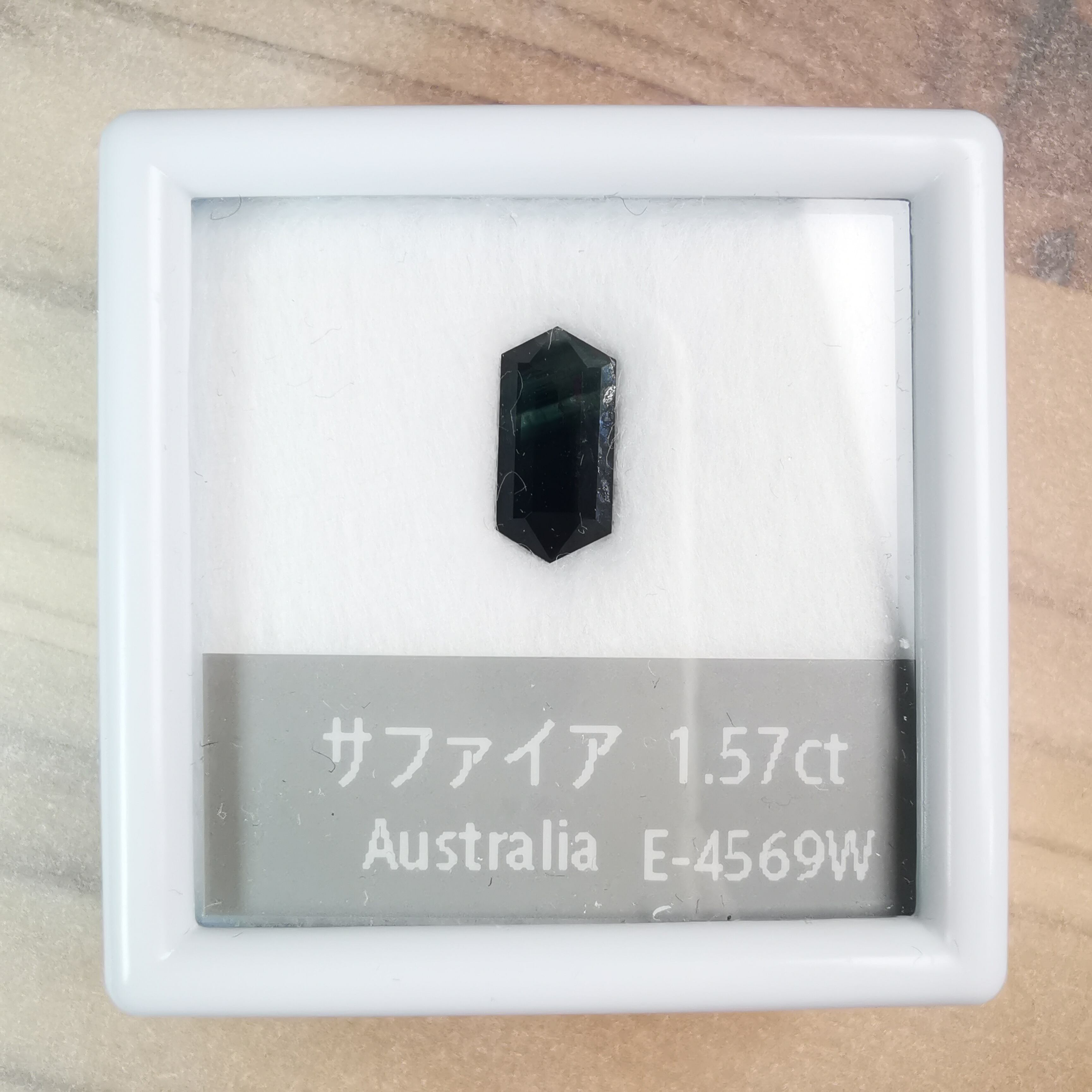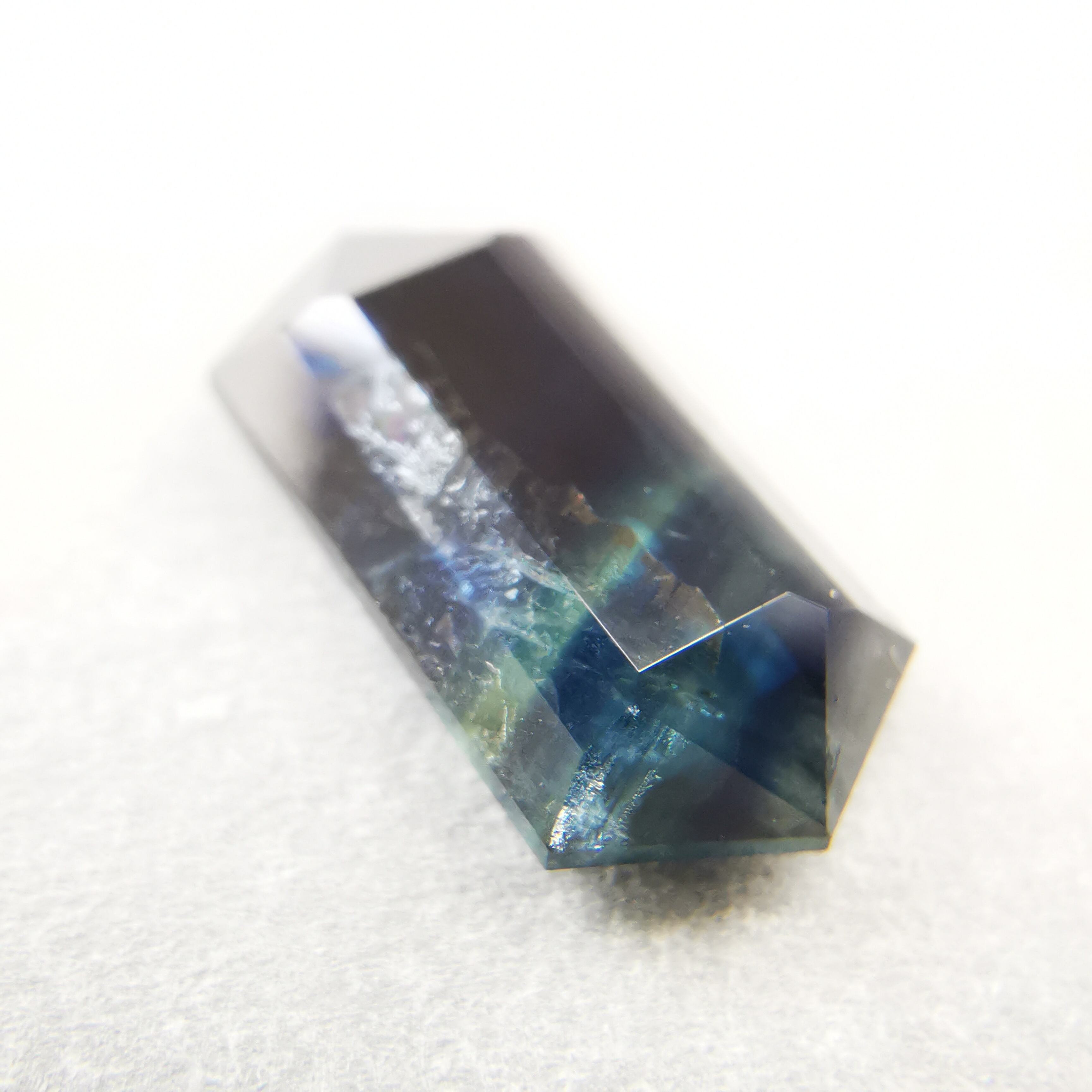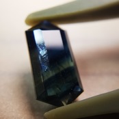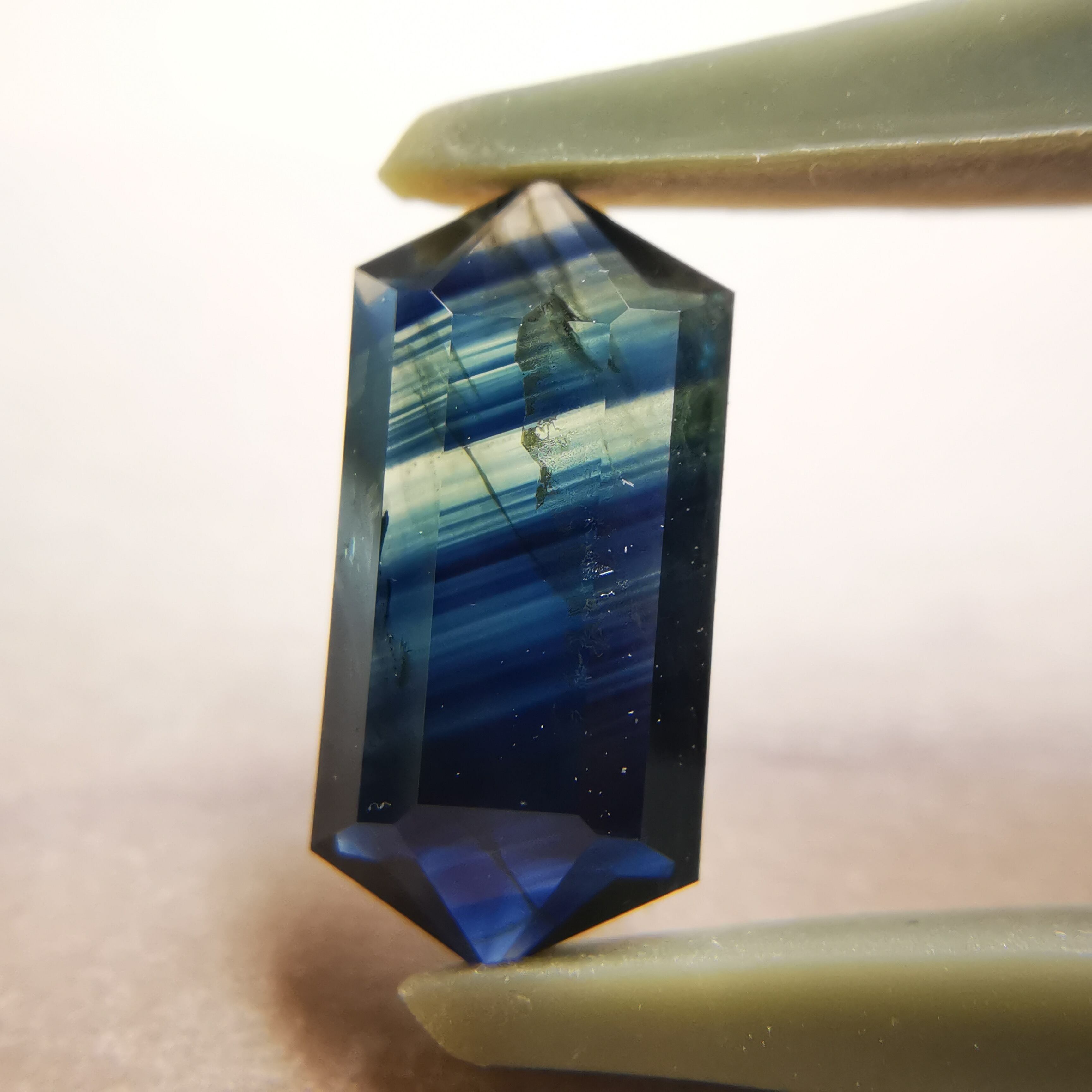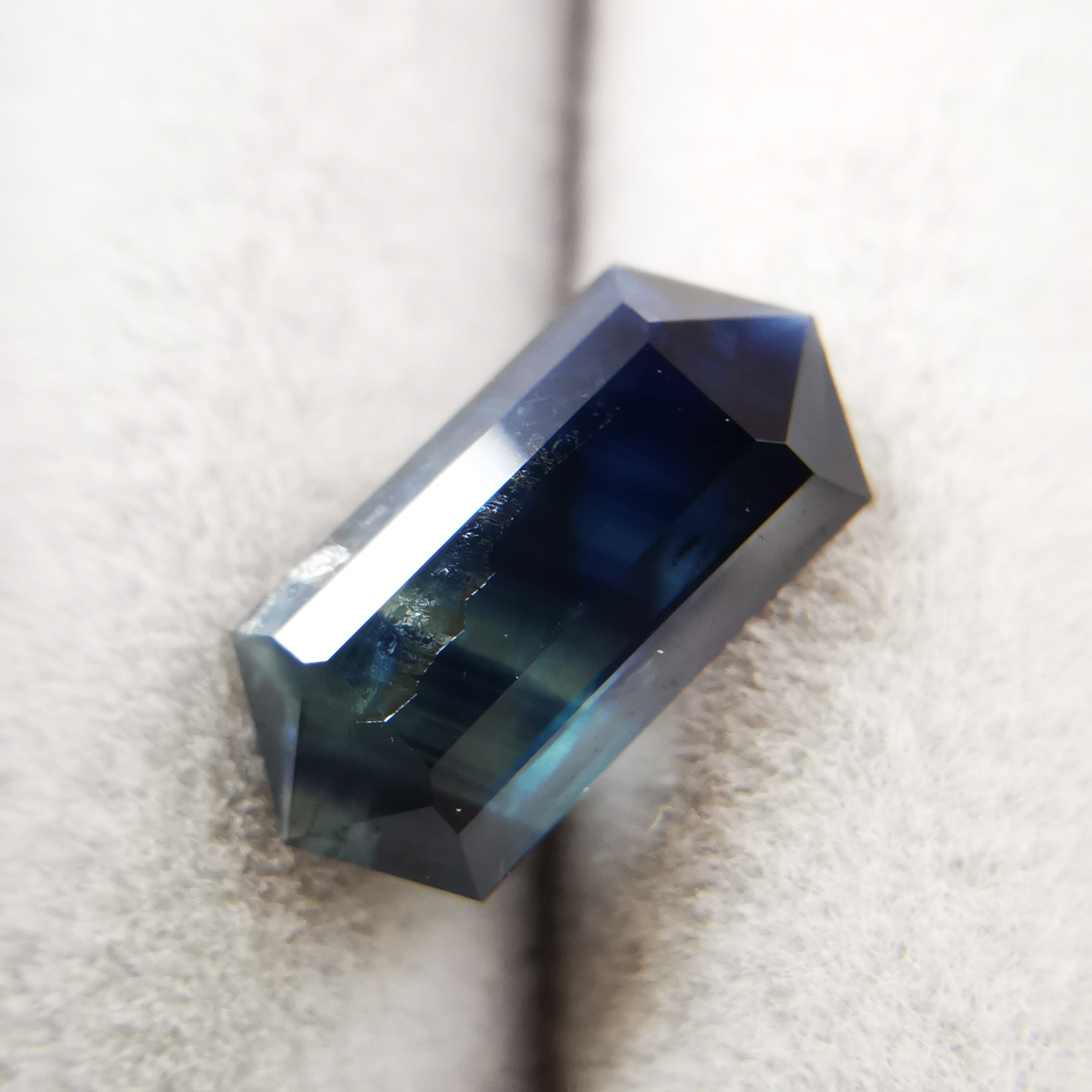 オーストラリア産らしい、暗く硬派な濃藍色が、下に行くにつれて縞模様を描くサファイアです。